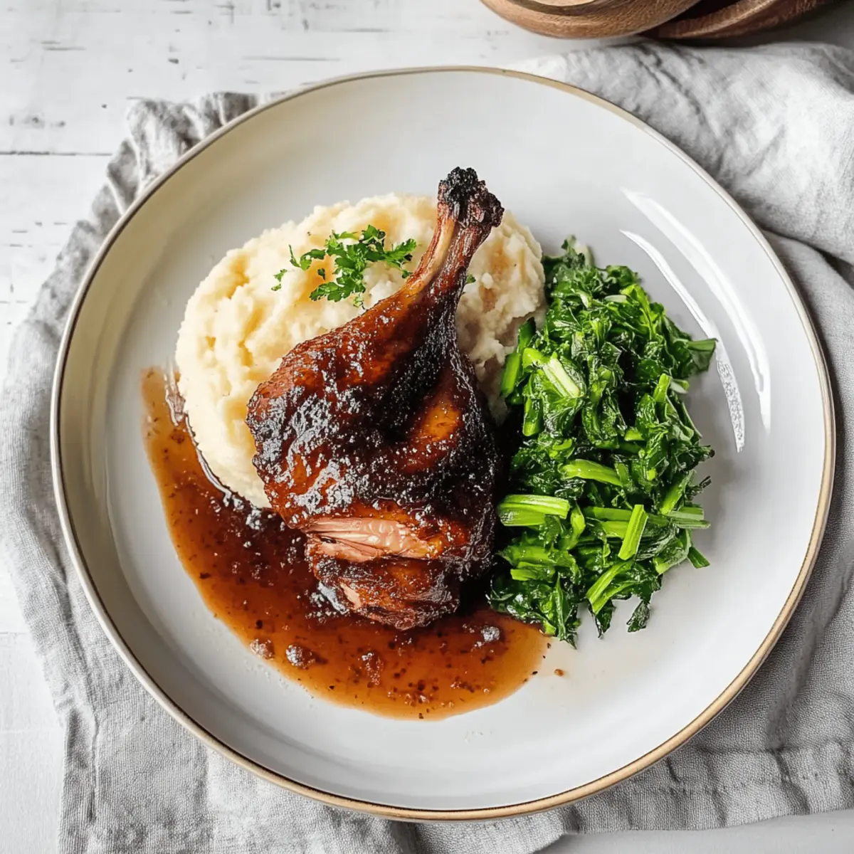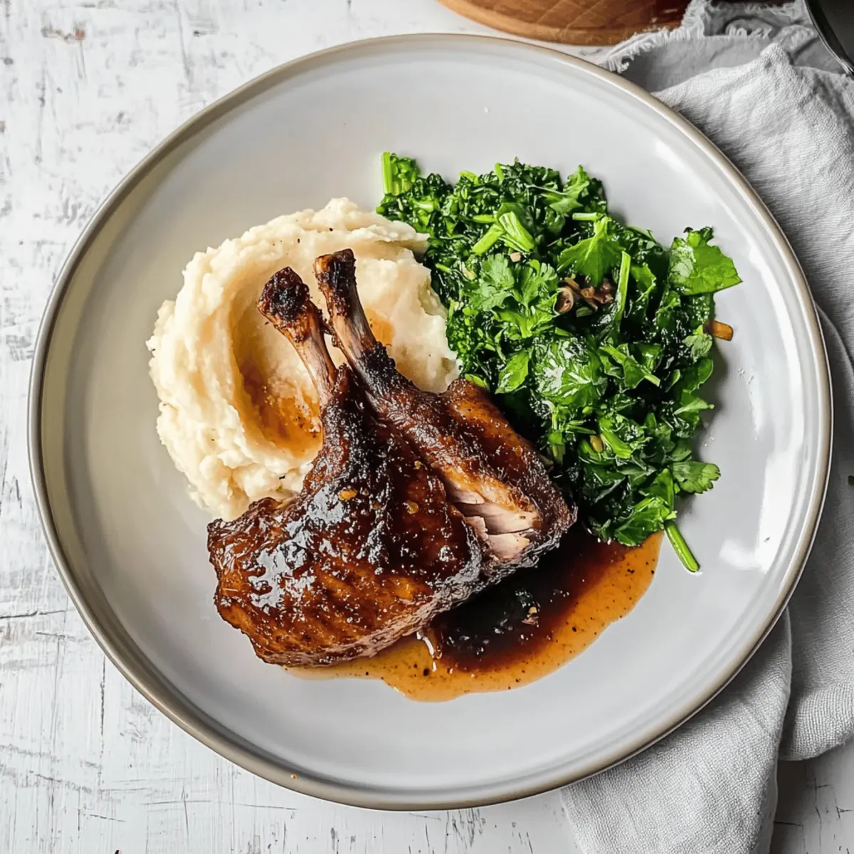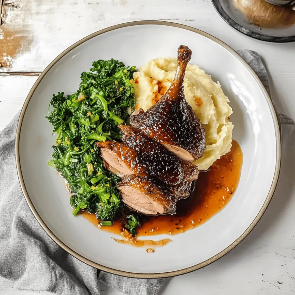 As I stood in my kitchen, the aroma of citrus wafted through the air, transporting me to that cozy little restaurant where I savored the most delicious duck dish. It dawned on me that with just a few ingredients and my trusty air fryer, I could recreate that experience right at home! Today, I’m excited to share my recipe for Air Fried Smokey Citrus Duck, a dish that transforms a simple meal into an unforgettable date-night feast. This recipe not only offers a delightful combination of tangy glaze and tender duck but is also incredibly easy to prepare, making it a stress-free option for your special gatherings. Ready to impress your loved ones and tantalize your taste buds? Let’s dive into this culinary adventure! Why Make Air Fried Smokey Citrus Duck? Unforgettable Flavor: The zesty citrus glaze not only complements the rich duck but adds a unique twist that sets this dish apart. Simplicity: With just a few easy steps, you can create a gourmet meal that feels like dining out—perfect for anyone bored with fast food! Crowd-Pleasing: This dish is sure to wow your guests. Pair it with a fresh salad or a side of sautéed greens for an impressive yet effortless presentation. Versatile Variations: Feeling adventurous? Substitute duck with chicken or switch up the citrus fruits for different flavor profiles to keep it exciting. Time-Saving Cooking: The air fryer cuts down cooking time significantly, allowing you to spend more time enjoying dinner and less time in the kitchen—just like my recipe for Air Fryer Grilled Cheese for a quick lunch option! Air Fried Smokey Citrus Duck Ingredients For the Duck • Duck legs – The star of the dish, rich in flavor and perfect for tender shredding. For the Citrus Glaze • Fresh orange juice – Adds a beautiful sweetness; if unavailable, lemon or lime can be a zesty substitute. • Honey or maple syrup – Provides sweetness to balance the acidity of the citrus. • Soy sauce – Enhances umami flavor; use a gluten-free version to keep it suitable for all diets. For the Celeriac Mash • Celeriac – Gives a smooth and creamy base; feel free to replace it with potatoes or any other preferred mash. • Butter or cream – Ensures the mash is rich and velvety in texture. For the Greens • Sautéed greens – Any variety will do; they offer a pleasant earthiness that pairs beautifully with the duck. Enjoy crafting your own Air Fried Smokey Citrus Duck, a dish that’s both exquisite and easy to prepare, making it an ideal option for date nights and special occasions! Step‑by‑Step Instructions for Air Fried Smokey Citrus Duck Step 1: Prepare the Duck Begin by seasoning the duck legs generously with salt and pepper. For enhanced flavor, consider marinating the duck in a mix of your favorite herbs and spices overnight. This process helps the seasoning penetrate, ensuring a flavorful finish on your Air Fried Smokey Citrus Duck. Step 2: Air Fry the Duck Preheat your air fryer to 375°F (190°C). Place the duck legs skin-side down in the air fryer basket, ensuring they are not overcrowded. Air fry them for about 30–35 minutes until the skin is crispy and golden. Flip the duck halfway through for even cooking, aiming for tender meat that separates easily from the bone. Step 3: Make the Citrus Glaze While the duck is cooking, it’s time to prepare the tangy citrus glaze. In a small saucepan, combine freshly squeezed orange juice with honey and soy sauce. Heat the mixture over medium heat for about 10 minutes until it thickens and becomes syrupy. Stir occasionally to prevent burning, and set aside once done. Step 4: Mash the Celeriac As the glaze cools, peel and chop the celeriac into chunks. Boil in salted water for about 15–20 minutes or until fork-tender. Drain, then mash with butter or cream for a rich, creamy texture to accompany your Air Fried Smokey Citrus Duck. Step 5: Plate and Serve Once the duck is perfectly cooked, remove it from the air fryer and drizzle the luscious citrus glaze over the top. Serve your beautifully glazed duck alongside the creamy celeriac mash and sautéed greens for a complete and impressive meal. Enjoy the delightful combination of flavors! Expert Tips for Air Fried Smokey Citrus Duck Marination Matters: Allow the duck to marinate overnight for ultimate flavor depth. Skipping this step can result in a less intense taste. Avoid Overcrowding: When air frying, ensure the duck legs are placed in a single layer. Overcrowding can lead to uneven cooking and less crispy skin. Check for Doneness: Use a meat thermometer to ensure the duck reaches an internal temperature of 165°F (74°C). This ensures safety and optimum tenderness. Citrus Fruit Variety: Experiment with different citrus fruits like grapefruit or blood oranges for a unique twist on your Air Fried Smokey Citrus Duck. Save the Fat: Don’t discard the rendered duck fat; it’s excellent for sautéing vegetables or adding flavor to other dishes! What to Serve with Air Fried Smokey Citrus Duck? Elevate your dining experience with a delightful array of sides that perfectly complement the rich, tangy flavors of this special dish. Creamy Celeriac Mash: This smooth, buttery side mirrors the duck’s richness while offering a subtle earthy flavor that ties the meal together. Sautéed Greens: Adding a vibrant pop of color, greens like kale or spinach bring freshness and earthy notes, balancing the richness of the duck beautifully. Zesty Citrus Salad: A light salad with mixed greens, thinly sliced oranges, and a citrus vinaigrette brightens the plate and provides a refreshing contrast. Roasted Root Vegetables: These caramelized veggies offer a sweet, comforting crunch that pairs perfectly with the smoky undertones of the duck. Garlic Herb Quinoa: A fluffy, nutty base adds a textural component to your meal. Its herbaceous flavors enhance the overall experience without overpowering the star of the show. Aromatic Rice Pilaf: Infused with citrus zest and herbs, this fragrant