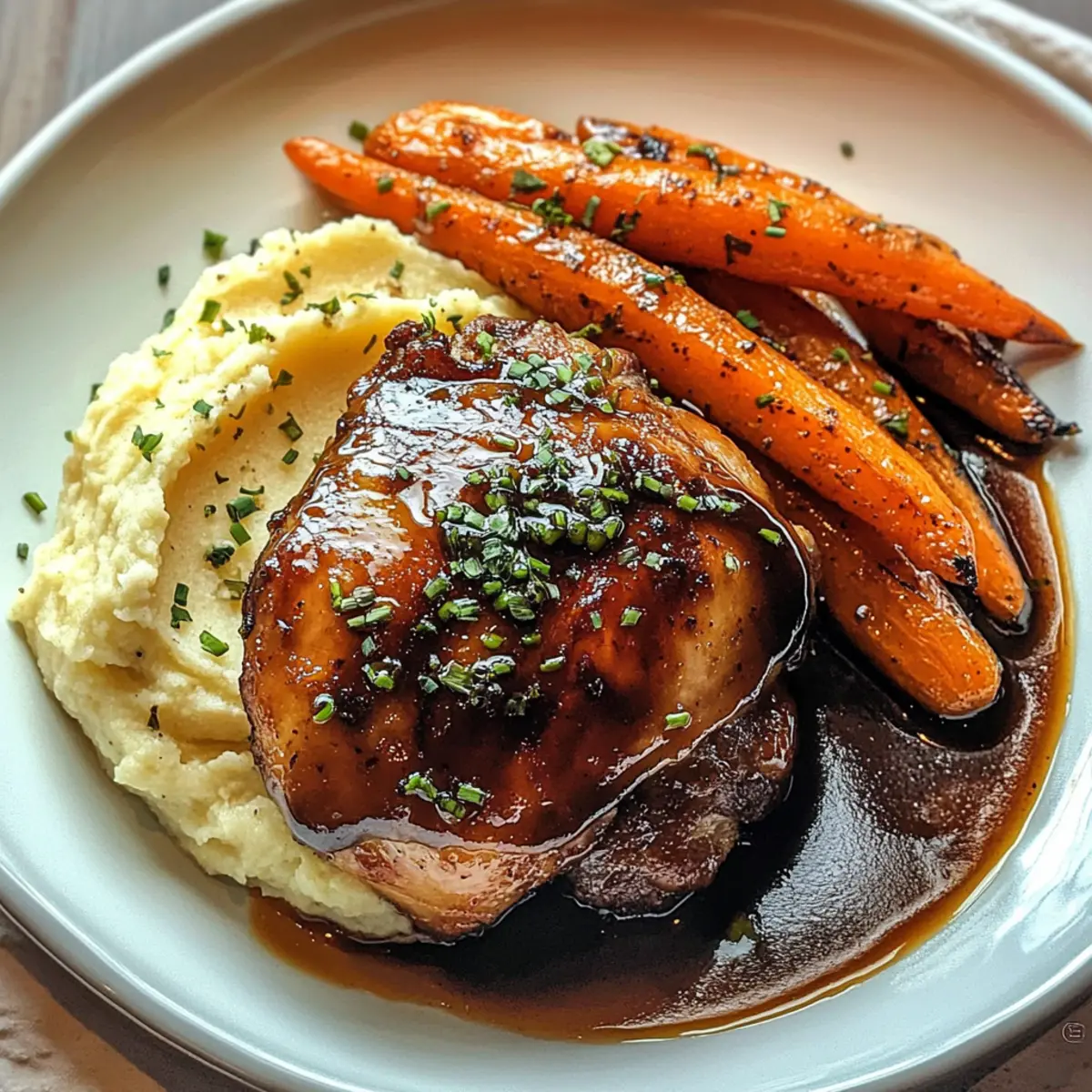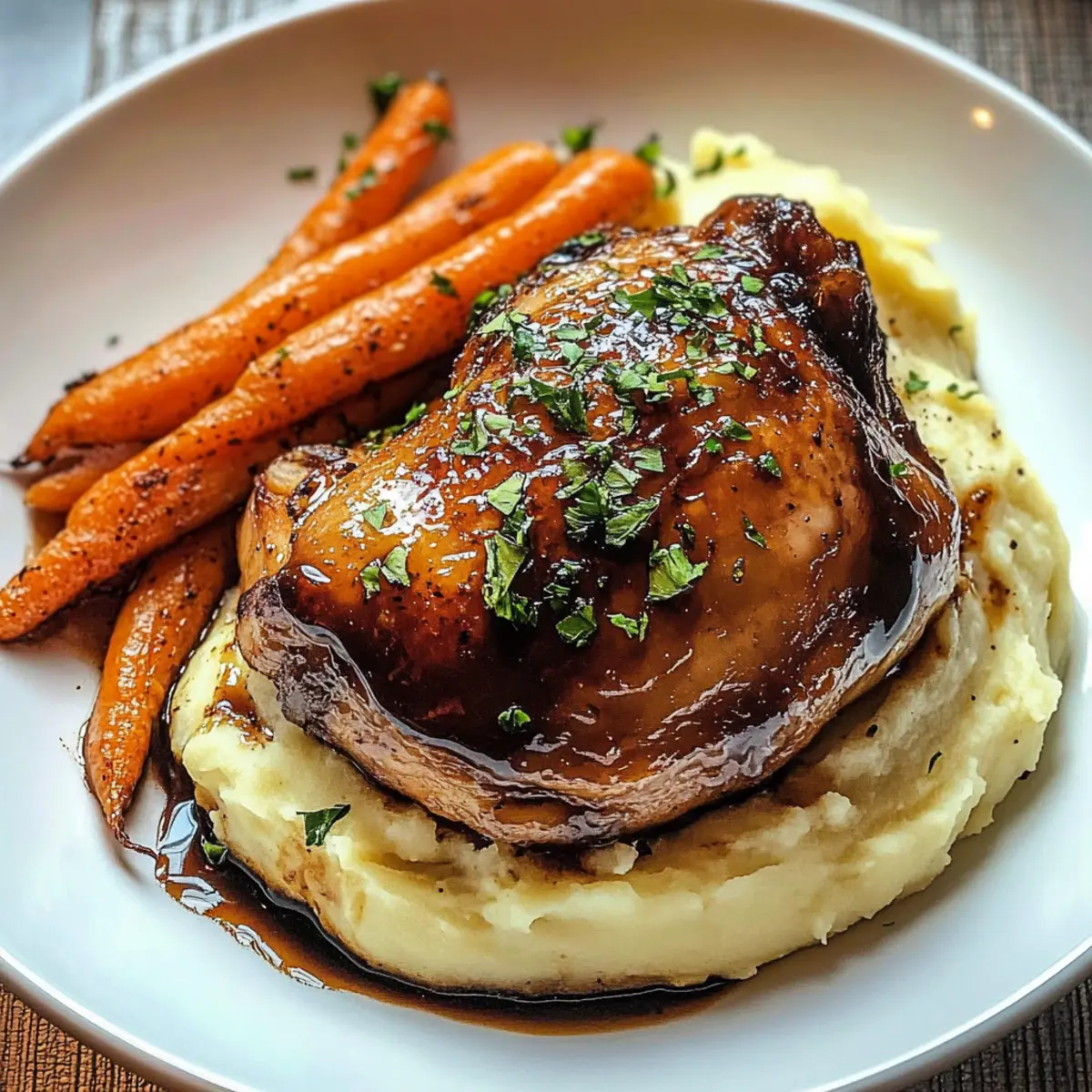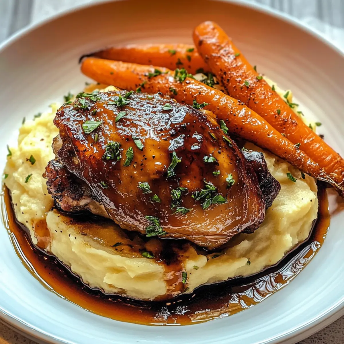 As the aroma of Honey Balsamic Chicken Thighs wafts through the kitchen, I can’t help but feel a sense of nostalgia wash over me. This dish has a way of bringing the family together—whether it’s for a cozy weeknight or an inviting weekend feast. With tender chicken thighs smothered in a tangy-honey glaze, each bite is a perfect balance of sweet and savory. Paired with creamy goat cheese mashed potatoes and vibrant roasted carrots, it’s not just a meal; it’s a celebration of flavors and textures that will make any dinner feel special. Best of all, this recipe is family-friendly and comforting, making it an ideal choice for those seeking a delicious alternative to fast food. So, are you ready to bring this delightful harmony of flavors to your table? Let’s get cooking! Why Are Roasted Carrots a Must-Add? Vibrant Color: The roasted carrots not only enhance the visual appeal of your dish but add a lovely splash of color that makes your plate pop! Subtle Sweetness: Their natural sweetness beautifully complements the tangy honey balsamic glaze on the chicken, creating a delightful flavor synergy. Nutritious Choice: Packed with vitamins and antioxidants, these carrots provide a healthy side that keeps your family fueled and feeling good. Easy Preparation: Simply chop, toss, and roast while your chicken cooks; it’s a hassle-free way to get veggies on the table. Family-Friendly: Kids love their slightly sweet, tender texture—perfect for encouraging little ones to enjoy their veggies! By incorporating these roasted carrots into your meal, you’ll elevate your dining experience while keeping it wholesome. For an extra flavor boost, serve alongside some Creamy Lemon Chicken Orzo or Bang Bang Chicken Bowl. Amazing Carrots Ingredients For the Roasted Carrots • Carrots – Fresh, vibrant veggies that add sweetness and crunch to your dish. • Olive Oil – A light drizzle will help with caramelization and enhance the flavor. • Salt – Essential for bringing out the natural flavors in your carrots. • Pepper – A dash to add a subtle kick that complements the sweetness. • Honey – For a touch more sweetness, drizzle lightly before serving, echoing the honey balsamic chicken glaze. Feel free to experiment with your carrots while you whip up these Amazing Honey Balsamic Chicken Thighs; they’ll truly become the star of your meal! Step‑by‑Step Instructions for Amazing Honey Balsamic Chicken Thighs Step 1: Preheat the Oven Start by preheating your oven to 400°F (200°C), ensuring a perfect temperature for roasting. This crispy finish will elevate the flavors of the Honey Balsamic Chicken Thighs. While the oven heats, gather your ingredients and utensils, including a baking sheet and mixing bowls, to streamline the process and keep things organized. Step 2: Prepare Carrots Wash and peel your carrots, then chop them into bite-sized pieces for even roasting. In a mixing bowl, toss the carrots with a drizzle of olive oil, salt, and pepper to enhance their natural sweetness. Spread the seasoned carrots evenly on a baking sheet, ensuring they have room to caramelize beautifully while roasting alongside the chicken. Step 3: Marinate Chicken In a bowl, combine honey, balsamic vinegar, minced garlic, Dijon mustard, salt, and pepper to create a flavorful marinade. Place the chicken thighs in a baking dish and pour half of the marinade over them, ensuring every piece is well-coated. Let the chicken sit for about 10 minutes so it absorbs those delicious flavors before heading to the oven. Step 4: Roast Chicken and Carrots Once your oven is ready, place the baking dish with the chicken thighs and the sheet of carrots inside. Roast everything for 25-30 minutes, or until the chicken reaches an internal temperature of 165°F (75°C) and is golden brown. The carrots should be tender and slightly caramelized, showcasing their vibrant colors and delicious sweetness. Step 5: Make Goat Cheese Mashed Potatoes While the chicken and carrots roast, bring a pot of water to a boil and add your peeled and chopped potatoes. Cook for about 15 minutes or until fork-tender. Drain the potatoes and mash them in a mixing bowl, combining with goat cheese for a creamy texture. This luscious pairing with the Amazing Honey Balsamic Chicken Thighs is sure to impress your family. Step 6: Finish & Serve After the chicken and carrots are done, remove them from the oven and drizzle the remaining marinade over the crispy chicken thighs. Plate your creamy goat cheese mashed potatoes alongside the roasted carrots for a stunning presentation. This delicious combination of flavors and textures will make your dining experience one to remember! Amazing Honey Balsamic Chicken Thighs Variations Feel free to get creative with this recipe! Each variation brings a unique twist to the comforting flavors. Gluten-Free: Substitute balsamic vinegar with gluten-free soy sauce or tamari to adapt the glaze without compromising taste. Spicy Kick: Add crushed red pepper flakes to the marinade for a touch of heat that enhances the honey’s sweetness. Vegetable Medley: Roast additional veggies like bell peppers or zucchini alongside the carrots for an explosion of colors and flavors. They’ll absorb the glaze beautifully! Honey-Free: Sweeten with agave nectar or a stevia blend for a lower-calorie option that still brings charm to the dish. Crispy Chicken: For extra crispiness, broil the chicken on high for the last few minutes of cooking after roasting. This gives a delightful crunch! Flavor Infusion: Marinate the chicken overnight. The longer it sits, the deeper the flavor—perfect for a meal prepped in advance. Cheesy Variation: Swap goat cheese for sharp cheddar in the mashed potatoes for a different taste and creamy texture that everyone will adore! Smoky Flavor: Add a dash of smoked paprika to the dry seasoning for a rich, smoky note that harmonizes beautifully with the sweetness of the honey. Let your imagination soar and customize 