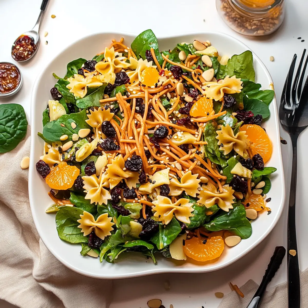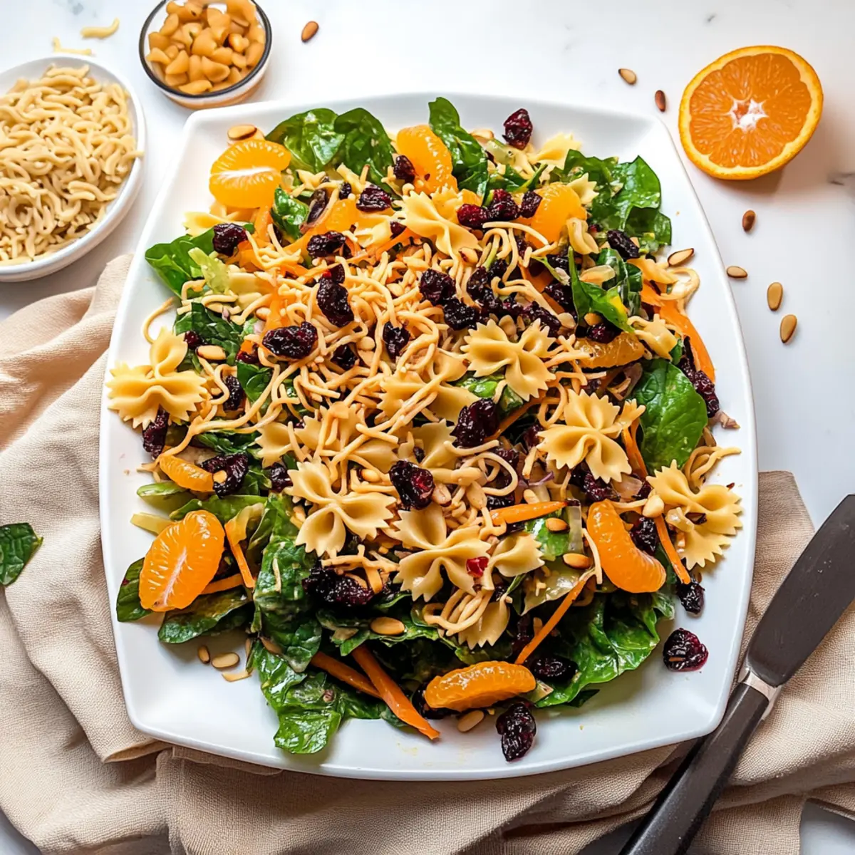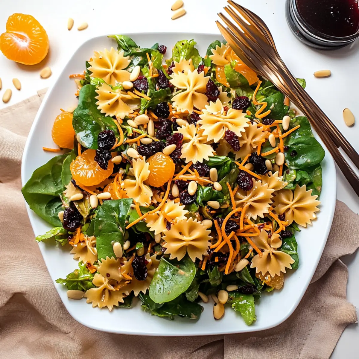 As I tossed together the vibrant mix of colors and textures, the aroma of teriyaki sauce wafted through my kitchen, instantly brightening my mood. This Asian Bowtie Pasta Salad is a refreshing twist on the classic salad that’s both easy to prepare and quick, making it an ideal choice for those busy weeknights or sunny summer gatherings. The sweet mandarin oranges and tart cranberries create a delightful contrast, while the crispy toppings add an irresistible crunch. Plus, it’s fully customizable—whether you’re looking to keep it vegetarian or add protein, this dish has you covered. Are you ready to elevate your salad game? Let’s dive in! Why Is This Salad a Must-Try? Vibrant flavors come together in this refreshing dish, making it a showstopper at any gathering. Quick and easy to whip up, you can have it ready in just 35 minutes! Perfectly customizable, it caters to various dietary needs—try adding grilled shrimp or tofu for protein. Enjoy the crunchy textures from chow mein noodles and pine nuts, making each bite exciting. Finally, it’s a beautiful blend of cultures, combining classic pasta salad elements with Asian flair, sure to impress every palate! For more delicious and vibrant dishes, check out my Garlic Butter Pasta or explore the refreshing Crab Salad Refreshing. Asian Bowtie Pasta Salad Ingredients For the Salad • Bowtie Pasta (8 ounces) – Provides the base structure of the salad; use gluten-free pasta if needed. • Baby Spring Mix (4 cups) – Adds fresh greens for texture and nutrition; spinach or mixed salad greens work well too. • Shredded Carrots (⅓ cup) – For crunch and sweetness; julienne bell peppers can be used as an alternative. • Dried Cranberries (½ cup) – For a burst of sweetness and tartness; raisins or chopped dried apricots can replace cranberries. • Pine Nuts (⅓ cup) – Add nutty flavor and crunch; substitute with toasted sunflower seeds or almond slices for a nut-free option. • Mandarin Oranges (10.5 ounces, canned) – Brings sweetness and a juicy element; fresh orange segments can be used if preferred. • Chow Mein Noodles (⅓ cup) – For added crunch on top; crispy wonton strips can be an alternative. For the Dressing • Teriyaki Sauce (⅓ cup) – Main seasoning for the salad; soy sauce or a homemade Asian dressing can be used instead. • Apple Cider Vinegar (⅓ cup) – Adds acidity to balance flavors; rice vinegar can be a milder alternative. • Olive Oil (½ cup) – For richness in the dressing; any neutral oil like canola works here. • Garlic Powder (½ teaspoon) – Enhances depth of flavor; fresh minced garlic (1 clove) can be used for a fresh twist. • Onion Powder (½ teaspoon) – Provides aromatic flavor; fresh onion can be adjusted to taste. • Salt (¼ teaspoon) & Pepper (¼ teaspoon) – Basic seasonings to taste. Step‑by‑Step Instructions for Asian Bowtie Pasta Salad Step 1: Cook the Bowtie Pasta In a large pot, bring salted water to a boil over high heat. Add 8 ounces of bowtie pasta and cook according to the package instructions for 8-10 minutes until al dente. Drain the pasta, then rinse it under cold water to cool it down quickly, preventing it from sticking together. Step 2: Prepare the Dressing While the pasta is cooking, grab a mason jar and combine ⅓ cup teriyaki sauce, ⅓ cup apple cider vinegar, ½ cup olive oil, ½ teaspoon garlic powder, ½ teaspoon onion powder, and a pinch of salt and pepper. Secure the lid tightly and shake vigorously for about 30 seconds until the ingredients are emulsified. Refrigerate the dressing until ready to use. Step 3: Mix the Salad Ingredients In a large mixing bowl, combine 4 cups of baby spring mix, ⅓ cup shredded carrots, ½ cup dried cranberries, ⅓ cup pine nuts, and the entire can of mandarin oranges, drained. Gently toss the ingredients together until evenly distributed, creating a colorful base for your Asian Bowtie Pasta Salad. Step 4: Combine Pasta and Vegetables Once the bowtie pasta has cooled completely, add it to the bowl of salad ingredients. Carefully toss everything together using tongs or a large serving spoon, ensuring that the pasta is well integrated with the colorful veggies and fruits. Step 5: Add Crunchy Toppings and Serve Before serving, sprinkle ⅓ cup of chow mein noodles on top for an added crunch. Serve the salad chilled with the teriyaki dressing on the side, allowing everyone to customize their salad just before enjoying this vibrant Asian Bowtie Pasta Salad. What to Serve with Asian Bowtie Pasta Salad Dive into a culinary adventure by creating a complete meal that highlights freshness and flavor. Grilled Chicken Skewers: Juicy and lightly seasoned, these skewers provide protein that pairs beautifully with the salad’s vibrant textures. Crispy Spring Rolls: These crunchy bites filled with fresh veggies offer a delightful contrast to the salad, adding an extra layer of freshness and crunch. Tangy Cucumber Salad: A refreshing mix of cucumbers, rice vinegar, and sesame oil complements the sweet notes of the Asian Bowtie Pasta Salad. Fruit-Infused Iced Tea: This chilled beverage adds a sweet and fruity vibe, making it a perfect refreshment alongside the salad. Teriyaki-Glazed Salmon: The rich flavor complements the teriyaki dressing, enhancing the entire meal with a delicious harmony of tastes. Lemon Sorbet: As a light dessert, its citrusy coolness cleanses the palate wonderfully after a savory meal, leaving you feeling refreshed. Sesame Noodles: Continue the Asian theme with these tangy and nutty noodles, providing a delicious and hearty side option that pairs well with the salad. Baked Tofu Bites: For a vegetarian boost, these crispy bites offer a satisfying protein option that brings a heartiness to your meal. How to Store and Freeze Asian Bowtie Pasta Salad Fridge: Store the salad in an airtight container in the refrigerator for up to 3 days. Keep the dressing separate until ready to serve to maintain freshnes