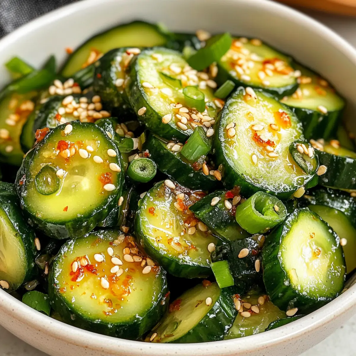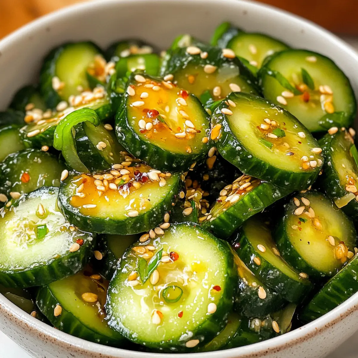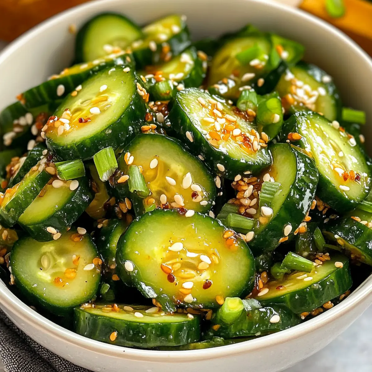 As I peeled back the layers of summer flavors in my kitchen, I stumbled upon the perfect remedy to those sweltering days: Asian cucumber salad. This light and refreshing dish not only speaks to my heart but pairs beautifully with just about any meal. With its quick prep time, I can whip it up in under 30 minutes, making it an ideal solution for impromptu barbecues or busy evenings. The crunch of fresh persian cucumbers mingling with a flavorful dressing of soy sauce, rice vinegar, and a hint of heat brings a delightful twist to the table. Plus, it’s both a crowd-pleaser and a nutritious choice! Ready to dive into a bowl of vibrant crunch and tangy goodness? Let’s go! Why is this salad a must-try? Versatile and adaptable, this Asian cucumber salad is perfect for any occasion, from casual weeknight dinners to festive summer barbecues. Effortless to prepare, you can make it in under 30 minutes with ingredients you likely have on hand! Crisp and refreshing, the flavors meld beautifully, making it a great complement to grilled meats or even a light main dish with added protein. Low-calorie yet satisfying, this salad brings joy without compromising on health. Plus, it’s a fantastic option for those seeking a break from heavy fast food! Consider pairing it with other refreshing dishes like a Cucumber Caesar Salad or a Quinoa Crunch Salad for a fabulous spread! Asian Cucumber Salad Ingredients • Refreshing flavors await you! For the Salad Persian Cucumbers – Crunchy and hydrating; feel free to use any cucumber variety you have on hand. Kosher Salt – Enhances flavor and helps draw out moisture; sea salt works as a great substitute. Sliced Green Onions – Adds a fresh, mild onion flavor; can be omitted if not available. For the Dressing Soy Sauce – Provides savory umami; use low-sodium soy sauce for a lighter taste. Rice Vinegar – Delivers that tangy acidity; apple cider or white vinegar are good alternatives. Honey – Balances the flavors with sweetness; maple syrup is a perfect vegan swap. Sesame Oil – Adds a nutty depth; omit if you’re allergic to nuts. Finely Minced Garlic – Boosts the dressing’s aroma; fresh is best, though powdered can work in a pinch. Grated Ginger (optional) – Infuses warmth and freshness; substitute with ground ginger if needed. Chili Oil or Garlic Chili Sauce – Adds the desired kick; adjust based on your spice preference. For Garnish Sesame Seeds – Brings crunch and visual flair; can replace with poppy seeds if preferred. Step‑by‑Step Instructions for Asian Cucumber Salad Step 1: Prepare Cucumbers Start by rinsing and drying your Persian cucumbers thoroughly. Using a sharp knife, slice them into 1/4-inch thick rounds on a bias; this allows for optimal flavor absorption. As you slice, you’ll see the vibrant green color and the crunchy texture that will make your Asian cucumber salad delightful and fresh. Step 2: Salt Cucumbers In a mixing bowl, combine the sliced cucumbers with kosher salt, ensuring that all slices are well coated. Allow the cucumbers to sit for 20 minutes to draw out excess moisture and enhance their flavor. During this time, you’ll notice the cucumbers wilting slightly as they release liquid, preparing them beautifully for the salad. Step 3: Rinse Cucumbers Once the cucumbers have rested, transfer them to a colander and rinse briefly under cold running water. This step will remove excess salt and moisture, keeping your salad crisp and refreshing. After rinsing, drain well and use paper towels to pat them dry, ensuring they retain their delightful crunch for the Asian cucumber salad. Step 4: Make Dressing In a separate bowl, whisk together soy sauce, rice vinegar, honey, sesame oil, minced garlic, and grated ginger, if using. Stir until the honey dissolves completely and the mixture is well combined. This dressing will bring a savory and tangy sweetness to your Asian cucumber salad, enhancing the overall flavor profile. Step 5: Dress Salad Drizzle the prepared dressing evenly over the well-dried cucumbers. Using tongs or a large spoon, gently toss the cucumbers to ensure they are evenly coated in the flavorful dressing. The mixture should glisten with the savory notes of the soy sauce and honey, making it an irresistible addition to your meal. Step 6: Serve Finally, garnish your salad with sliced green onions and a sprinkle of sesame seeds for added crunch and visual appeal. For the best texture, serve the Asian cucumber salad immediately, or refrigerate until it’s time to enjoy. If preparing ahead of time, keep the cucumbers and dressing separate to maintain freshness. Expert Tips for Asian Cucumber Salad Perfect Cucumber Choice: Use Persian or English cucumbers for optimal crunch. Their fewer seeds make for a crisper salad compared to larger varieties. Salting Technique: Salting cucumbers helps avoid a watery salad. Always remember to rinse thoroughly to remove excess salt and retain crispness. Dressing Adjustments: Feel free to customize the dressing by adding more chili oil for heat or honey for sweetness based on your taste preferences. Freshness Matters: For the best results, prepare the salad just before serving. If made ahead, store cucumbers and dressing separately. Creative Additions: Experiment by tossing in other fresh veggies or proteins. This keeps the Asian cucumber salad exciting and turns it into a light main dish! How to Store and Freeze Asian Cucumber Salad Fridge: Store the salad in an airtight container in the refrigerator for up to 1 day to maintain its crispness and flavor. Separate Ingredients: If made ahead of time, keep the cucumbers and dressing stored separately to prevent sogginess. Reheating: This salad is best served cold; simply toss it again before serving for freshness. Freezer: Freezing is not recommended for Asian cucumber salad, as the texture of the cucumbers will become mushy upon thawing. What to Serve with Asian Cucumber Salad Looking to create a delightful meal that beaut