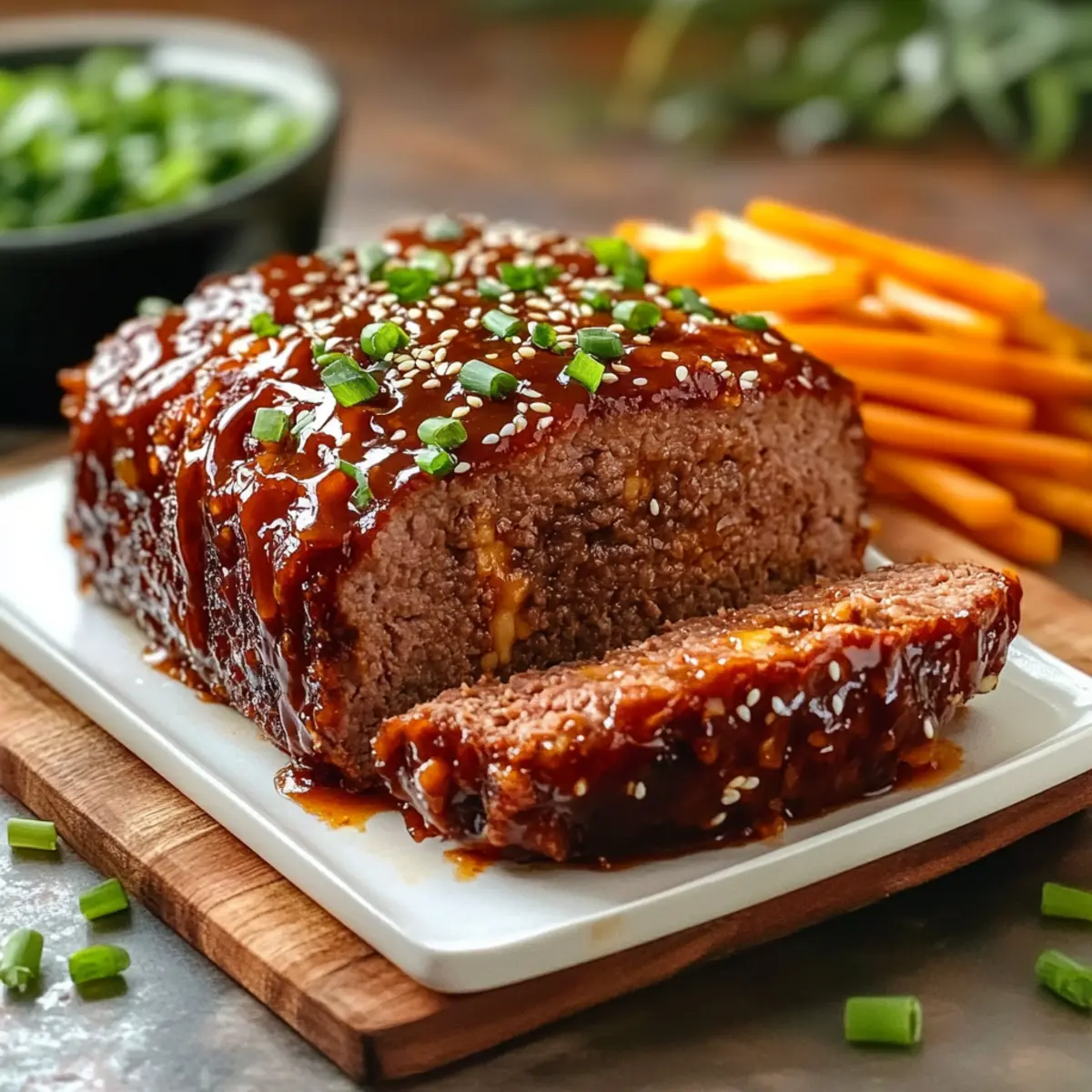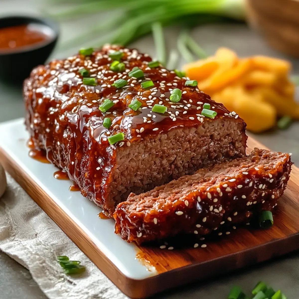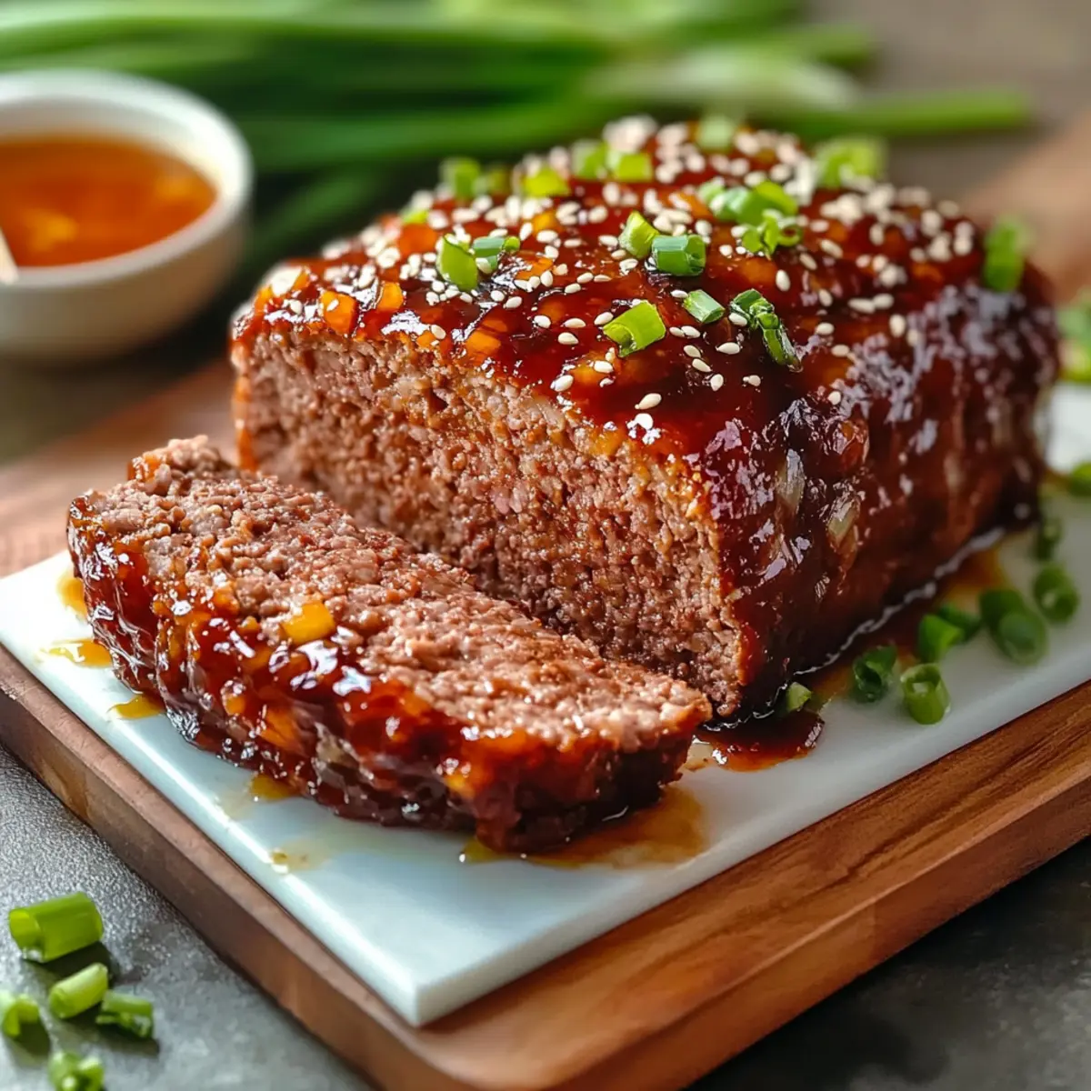 Stepping into my kitchen recently, I found myself craving comfort food but wanted to switch things up from the usual burgers and casseroles. That’s when the idea of crafting an Asian-Inspired Korean Meatloaf hit me—one that beautifully marries the comforting essence of American meatloaf with the bold flavors of Korean cuisine. With savory gochujang and a sweet apricot glaze, this dish is not only a delightful twist on a classic but also a meal prep-friendly option that promises to become a weeknight favorite. Simple to make and incredibly versatile, it can also accommodate various dietary preferences without losing its delicious identity. Curious to see how this savory masterpiece comes together? Let’s dive into the magic of the kitchen! Why is This Meatloaf So Unique? Innovative Twist: This meatloaf takes the classic recipe to new heights with the rich, spicy flavor of gochujang, setting it apart from your typical version. Versatile Options: Easily switch ground pork for turkey or beef, and try different preserves in the glaze! There’s something for everyone, whether you’re meal prepping or entertaining guests. Crowd-Pleasing Appeal: The enchanting combination of savory and sweet flavors ensures this dish will satisfy even the pickiest eaters at your table. Quick and Easy: With simple steps outlined in the instructions, you’ll have this delightful meatloaf ready in no time, making weeknight cooking a breeze. Comforting Yet Unique: Enjoy the comforting nostalgia of meatloaf with a bold Asian twist that will make your taste buds dance! Asian-Inspired Korean Meatloaf Ingredients For the Meatloaf • Ground Pork – Provides the meat base and juiciness for the meatloaf; substitute with ground beef or turkey for a leaner option. • Panko Breadcrumbs – Supplies texture and structure; can switch with crushed nuts for a nutty crunch. • Gochujang – Adds a spicy and savory flavor, the star ingredient; substitute with a mixture of sriracha and miso (2 tbsp sriracha + 1 tbsp miso) for similar effects. • Garlic (minced) – Enhances flavor depth; fresh garlic is preferred, avoid garlic powder for this step. • Onion (finely diced) – Adds sweetness and moisture; shallots can be used for a milder flavor. • Eggs (room temperature) – Binds the mixture together; ensure they reach room temperature before using. • Green Onions – Imparts fresh flavor and color; both the white and green parts are used for different cooking stages. For the Glaze • Apricot Jam – Provides sweetness for the glaze; can swap with peach or mango preserves for a fruity twist. • Honey – Enhances sweetness in the glaze; brown sugar can be used as a substitute. • Sesame Oil – Adds a distinct nutty flavor; can replace with an equal quantity of vegetable oil in a pinch. • Soy Sauce – Brings saltiness and umami depth; use tamari for a gluten-free version. • Rice Wine Vinegar – Offers acidity to balance flavors; apple cider vinegar can serve as a substitute. • Sesame Seeds – Garnish for presentation and flavor; omit if desired, though they add crunch. Step‑by‑Step Instructions for Asian-Inspired Korean Meatloaf Step 1: Preheat the Oven and Prepare the Pan Begin by preheating your oven to 350°F (175°C). While it warms up, take a 9.5×5 inch loaf pan and lightly grease it with cooking spray or a drizzle of oil to prevent sticking. This preparation sets the stage for your comforting Asian-Inspired Korean Meatloaf to turn out perfectly! Step 2: Sauté the Aromatics In a medium-sized skillet, heat a tablespoon of sesame oil over medium heat. Add the finely diced onion and sauté for about 10 minutes until it becomes translucent and fragrant. Next, incorporate the minced garlic for an additional 2 minutes, stirring frequently to avoid burning. Once done, remove from heat and allow the mixture to cool before mixing it in with the meatloaf ingredients. Step 3: Mix the Meatloaf Base In a large mixing bowl, combine the cooled onion and garlic blend with the white parts of the green onions, gochujang, room-temperature eggs, and a pinch of salt. Use a sturdy spatula or your hands to mix everything together until well incorporated. This flavorful mix will give your Asian-Inspired Korean Meatloaf its distinctive savory character. Step 4: Combine with Ground Pork In another large bowl, place your ground pork and add the panko breadcrumbs. Pour the cooled onion mixture over the pork and gently fold the mixture together with your hands. Be careful not to overmix; just ensure everything is evenly combined. Finally, fold in the reserved green onion greens, enhancing the flavor before transferring the mixture into the prepared loaf pan. Step 5: Bake the Meatloaf Now, it’s time to bake your creation! Place the filled loaf pan in the preheated oven and bake for 40 minutes. You’ll know it’s doing well when the meatloaf reaches an internal temperature of 140°F (60°C). Use a food thermometer for accuracy—this ensures that your Asian-Inspired Korean Meatloaf stays moist and tender. Step 6: Prepare the Glaze While the meatloaf bakes, prepare the sweet apricot glaze. In a small bowl, whisk together the apricot jam, honey, soy sauce, and rice wine vinegar until smooth. This delightful mixture will caramelize beautifully on your meatloaf, adding a wonderful glaze that balances the savory flavors with sweetness. Step 7: Glaze and Finish Baking Once the meatloaf reaches 140°F (60°C), take it out of the oven and carefully frost the top with the apricot glaze. Return the loaf to the oven and continue baking for an additional 10 to 15 minutes or until the internal temperature reaches 160°F (71°C). Keep an eye on it; the glaze should become beautifully caramelized. Step 8: Rest and Serve After removing from the oven, let the Asian-Inspired Korean Meatloaf rest for 5 minutes. This resting phase allows the juices to redistribute, resulting in a tender slice. Once rested, slice the meatloaf and garnish 