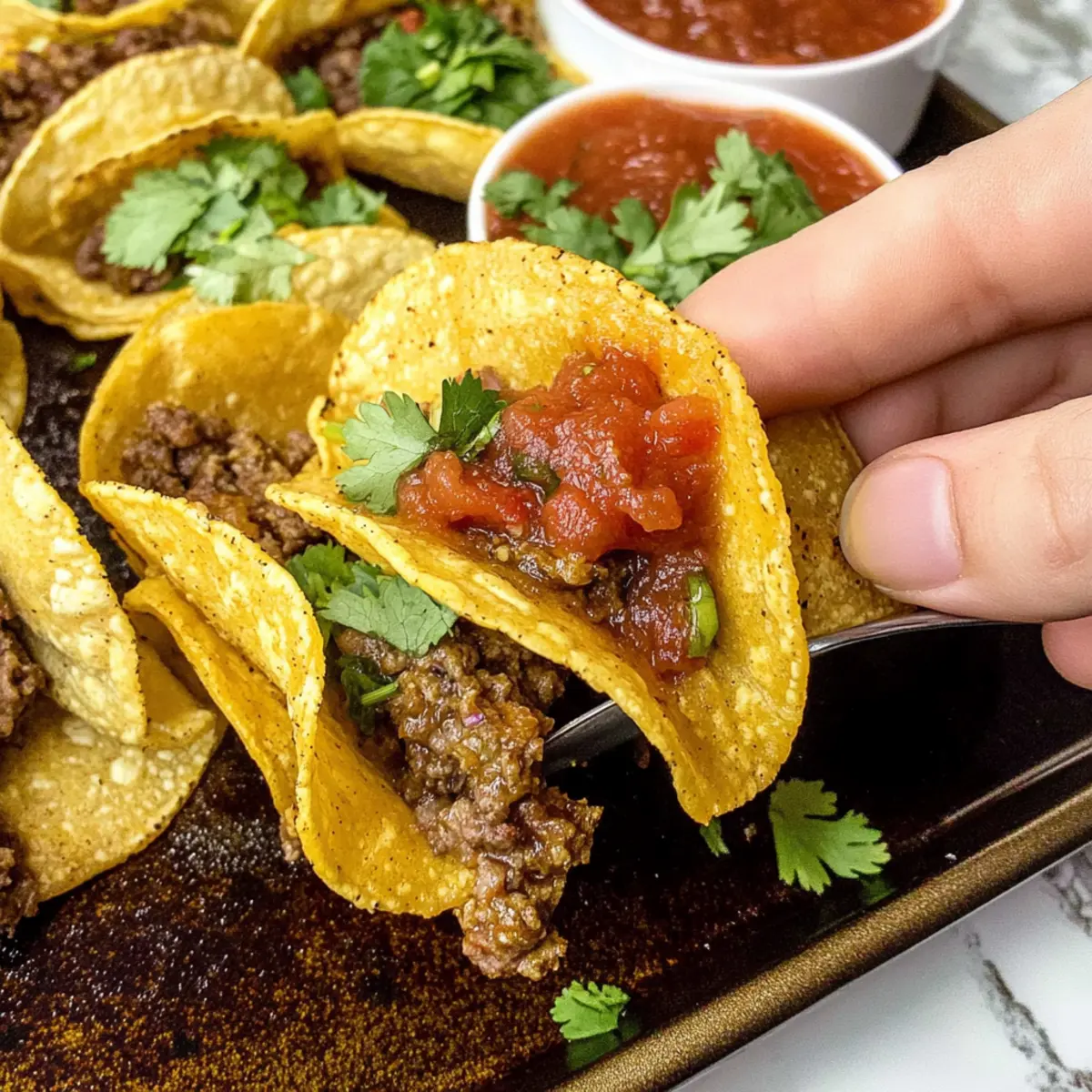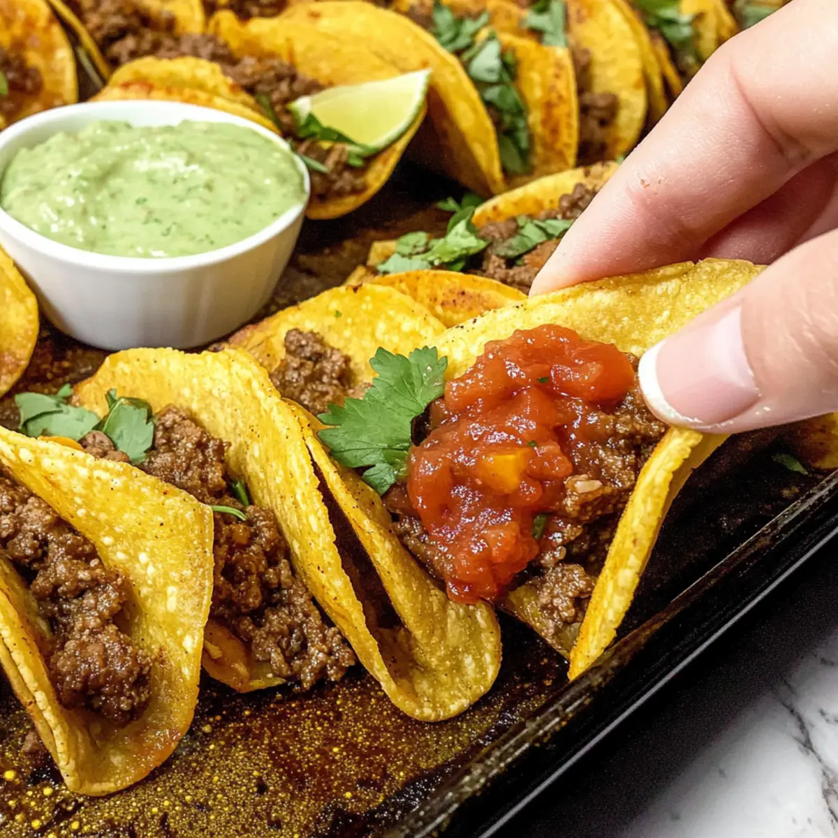 The rich aroma of Tex-Mex spices wafting from the oven always brings a smile to my face. If you’re anything like me, the thought of Crispy Baked Beef Tacos singing their siren song is simply irresistible. This easy weeknight dinner, packed with flavor and ready in just 35 minutes, cradles a hearty filling of lean ground beef and melted cheese, ensuring everyone goes back for seconds. Not only do these tacos satisfy that longing for something crunchy and warm, but they also embrace the beauty of simplicity—perfect for busy evenings when time is of the essence. So, are you ready to find out how to make your own delicious batch? Why Are These Tacos So Irresistible? Simplicity in preparation: With just a few ingredients and minimal steps, you’ll have a delightful meal in no time! Flavor-Packed Filling: The rich combination of ground beef, spices, and melted cheese creates a savory mix that is hard to resist. Perfect Crunch: Baked to golden perfection, these tacos deliver a satisfying crunch, making them a sensational choice for any dinner table. Versatile Options: Feel free to swap in ground chicken or add vibrant veggies for a customized twist. Family-Friendly: Loved by both kids and adults, they’re an instant crowd-pleaser, ensuring you’ll see happy faces around the dinner table. To complement your tacos, consider serving them alongside fresh salsa and creamy sour cream, just like the delicious ideas found in Baked Cod Coconut or Cheeseburger Twice Baked. Baked Beef Tacos Ingredients For the Filling • Lean Ground Beef — Choose 90% lean for a savory yet lean filling that keeps it hearty without being overly greasy. • Taco Seasoning — Adds a mix of spices that brings the typical Tex-Mex flavor to your baked beef tacos; consider making your own for a fresh twist! • Red Enchilada Sauce — This sauce adds moisture and a tangy kick; you can substitute with green enchilada sauce for a milder flavor. For the Tacos • Oaxaca Cheese (or Mexican Cheese/Monterey Jack) — Melts beautifully to create that cheesy goodness we crave in every bite; feel free to mix in other melting cheeses for variety. • Corn Tortillas — These are the backbone of your tacos; you can swap in flour tortillas if you prefer a different texture, but adjust the baking time accordingly. • Olive Oil — Helps achieve that crisp texture when baked; vegetable oil is a great substitute if needed. Get ready to embark on a delicious journey with these baked beef tacos that are sure to win over your loved ones! Step‑by‑Step Instructions for Baked Beef Tacos Step 1: Preheat the Oven Begin by preheating your oven to 450°F (230°C). This high temperature will ensure your tortillas get extra crispy while baking, creating that delightful crunch everyone loves in Baked Beef Tacos. Make sure your oven is fully heated before moving on to the next steps for the best results. Step 2: Cook the Ground Beef In a large skillet, over medium-high heat, start browning 1 pound of lean ground beef. Use a wooden spoon to break it apart as it cooks, ensuring it browns evenly. Once fully cooked and no longer pink, stir in taco seasoning and red enchilada sauce. Let the mixture simmer for about 3-5 minutes until it thickens slightly, then remove from heat. Step 3: Warm the Tortillas To make the corn tortillas pliable, wrap them in a damp paper towel and microwave them for 30-60 seconds. This step is crucial to avoid cracking when you fold them. Once warm, carefully brush one side of each tortilla with olive oil to help them crisp up beautifully in the oven. Step 4: Assemble the Tacos On a baking sheet, lay the oiled side of the tortillas down. Spoon a generous amount of the beef mixture onto half of each tortilla, then sprinkle with shredded Oaxaca cheese. For an extra cheesy delight, add a little more cheese on top before folding the tortilla over to create the tacos. Make sure they are well-stuffed for the best flavor! Step 5: Bake the Tacos Position your assembled tacos in a single layer on the baking sheet, ensuring they aren’t crowded. Transfer the baking sheet to your preheated oven and bake for 16 minutes. You’ll know they’re done when the tortillas are golden brown and crispy, with the cheese bubbling and melting beautifully. Step 6: Cool and Serve Once they are out of the oven, allow your Baked Beef Tacos to cool for about 3 minutes before serving. This cooling time lets the cheese set slightly, preventing any filling from spilling out when you take a big bite. Serve them alongside salsa, sour cream, or your favorite toppings for a truly satisfying meal. Make Ahead Options These Crispy Baked Beef Tacos are perfect for meal prep enthusiasts! You can prepare the filling up to 3 days ahead by cooking the ground beef with the taco seasoning and enchilada sauce; simply store it in an airtight container in the refrigerator. Additionally, you can warm and oil your tortillas, then assemble the tacos the night before. Just remember to keep them in a single layer to prevent sticking. When ready to bake, simply pop them in the oven straight from the fridge for about 18 minutes at 450°F (230°C), and enjoy restaurant-quality results with minimal effort! What to Serve with Crispy Baked Beef Tacos Elevate your dinner experience with these satisfying, flavorsome pairings that bring a fiesta to the table! Fresh Guacamole: This creamy dip pairs perfectly with the crispy texture of the tacos, adding a fresh and zesty note. Tangy Salsa Verde: The vibrant flavors of salsa verde offer a refreshing contrast to the savory beef, making each bite even more delightful. Mexican Street Corn Salad: A creamy, tangy mix of corn, lime, and cotija cheese complements the flavors of the tacos, adding texture and a fun twist. Spicy Black Beans: Hearty and full of flavor, they bring a satisfying protein element while enhancing the Tex-Mex vibe. Crispy Tortilla Chips: Perfect for dipping into any leftover salsa or guacamole, these crunchy companion