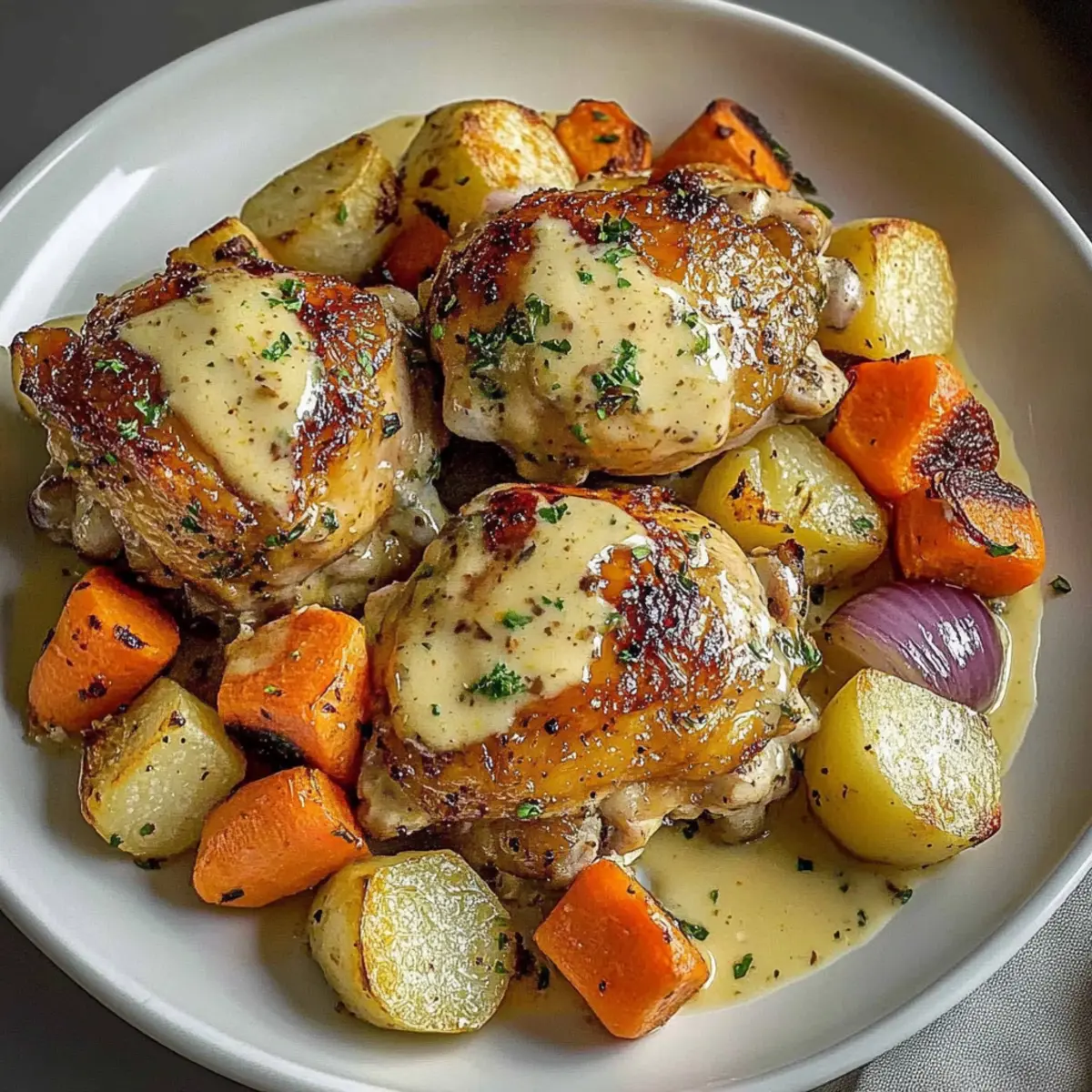 As I pulled the tender, golden chicken thighs from the oven, a cozy aroma enveloped my kitchen, instantly transporting me to a rustic French bistro. These Baked Dijon Chicken Thighs are more than just a meal; they are the embodiment of warmth and comfort, perfect for those gatherings that linger in memory. This dish combines rich, creamy Dijon sauce with roasted root vegetables, offering both a hearty flavor and a simple yet sophisticated presentation. Not only is it a crowd-pleaser for family dinners, but it also boasts gluten-free goodness for anyone seeking a wholesome, homemade option. Whether you’re entertaining friends or treating yourself to a relaxing night in, this recipe promises to deliver comfort and joy with every savory bite. Curious how to create this mouthwatering experience at home? Let’s dive into the recipe! Why try Baked Dijon Chicken Thighs? Flavor Explosion: The rich, creamy Dijon sauce brings a burst of tanginess, perfectly harmonizing with the savory notes of roasted root veggies. Crowd Pleaser: Ideal for family dinners or gatherings, this dish impresses guests without keeping you in the kitchen for hours. Versatile Ingredients: Easily swap in seasonal vegetables or choose different sauces, like Greek yogurt instead of cream, to suit your taste. Time Saver: Prep is quick and simple, letting you spend more time savoring each delicious bite. Gluten-Free Goodness: Enjoy comforting flavors while catering to dietary preferences, ensuring everyone around your table is happy! Try serving it alongside some buttered egg noodles or a simple green salad for a balanced meal. Baked Dijon Chicken Thighs Ingredients For the Chicken • Chicken Thighs – Choose bone-in, skin-on for maximum moisture and flavor; boneless thighs can be a quicker option. For the Sauce • Dijon Mustard – Adds a delightful tang; swap for whole grain mustard if you prefer more texture. • Heavy Cream – Provides a rich base; Greek yogurt or coconut cream are great dairy-free alternatives. • Olive Oil – Perfect for roasting vegetables evenly; always go for extra virgin for the best flavor. • Honey – Balances the tangy mustard; maple syrup works well too if you’re looking for a vegan option. • Garlic Powder & Onion Powder – Enhance the overall flavor profile; fresh garlic and onions can provide an aromatic punch. • Dried Thyme & Paprika – Bring herbal and smoky notes; feel free to use fresh thyme or smoked paprika for a twist. For the Vegetables • Root Vegetables (Carrots, Parsnips, Potatoes, Red Onion) – Add depth and texture; consider sweet potatoes or butternut squash for a seasonal spin. • Salt & Pepper – Essential for seasoning; season to taste for that perfect finish. Enjoy the delightful creation of Baked Dijon Chicken Thighs, a dish that promises to be a hit at your next family gathering! Step‑by‑Step Instructions for Baked Dijon Chicken Thighs Step 1: Preheat the Oven Begin by preheating your oven to 400°F (205°C). This temperature is perfect for achieving crispy skin on your chicken thighs while ensuring the root vegetables become tender and caramelized. While the oven warms up, gather your baking dish and other necessary ingredients to make the cooking process seamless. Step 2: Prepare the Vegetables In a large mixing bowl, toss the carrots, parsnips, potatoes, and red onion with a drizzle of olive oil, salt, and pepper until well-coated. This mixture not only enhances the root vegetables’ natural sweetness but also sets the stage for a deliciously roasted base. Spread the vegetables evenly in a baking dish to allow for even cooking and caramelization. Step 3: Make the Dijon Cream Sauce In a separate bowl, whisk together the Dijon mustard, heavy cream, olive oil, honey, garlic powder, onion powder, dried thyme, paprika, salt, and pepper until the mixture is smooth and well combined. This creamy sauce is what makes your Baked Dijon Chicken Thighs truly special, infusing them with great flavor. Step 4: Coat the Chicken Pat the chicken thighs dry with paper towels to ensure a crispy finish. Arrange the thighs over the prepared root vegetables, then generously brush them with the creamy Dijon sauce, making sure each piece is coated well. The combination of flavors will meld beautifully as everything bakes together. Step 5: Bake the Dish Place your baking dish in the preheated oven and bake for 40–45 minutes, or until the chicken thighs are golden brown and the juices run clear when pierced. You’ll know your Baked Dijon Chicken Thighs are ready when the skin looks crispy and the vegetables are fork-tender. Step 6: Broil for a Crispy Finish For an extra layer of flavor and texture, turn on the broiler for an additional 2–3 minutes. Keep a close eye on the dish as it broils to prevent burning; this step enhances the chicken skin’s crispiness, making each bite even more delightful. Step 7: Rest and Serve Once out of the oven, let the Baked Dijon Chicken Thighs rest for about 5 minutes. This resting time allows the juices to redistribute, ensuring a succulent texture. When ready, plate the chicken and vegetables, spooning the remaining sauce over the top for a delicious finish. Storage Tips for Baked Dijon Chicken Thighs Fridge: Store leftovers in an airtight container for up to 3 days. This will help preserve the flavors of the creamy Dijon sauce and roasted vegetables. Freezer: For long-term storage, freeze the chicken and vegetables in portions. They can last up to 3 months; just thaw overnight in the fridge before reheating. Reheating: To enjoy your Baked Dijon Chicken Thighs again, reheat in the oven at 350°F (175°C) until warmed through, about 20-25 minutes. This ensures a deliciously moist texture. Meal Prep: You can also assemble the dish up to the baking stage and freeze it raw. This makes for a convenient meal option that’s ready to pop in the oven when you need it! Baked Dijon Chicken Thighs Variations Feel free to get creative with this