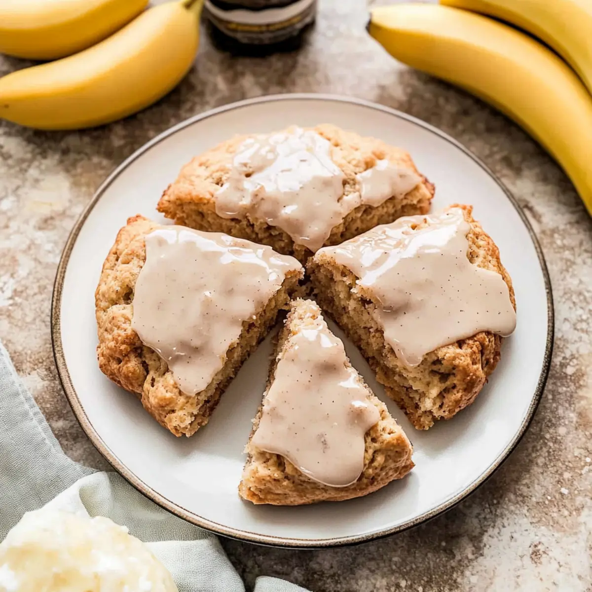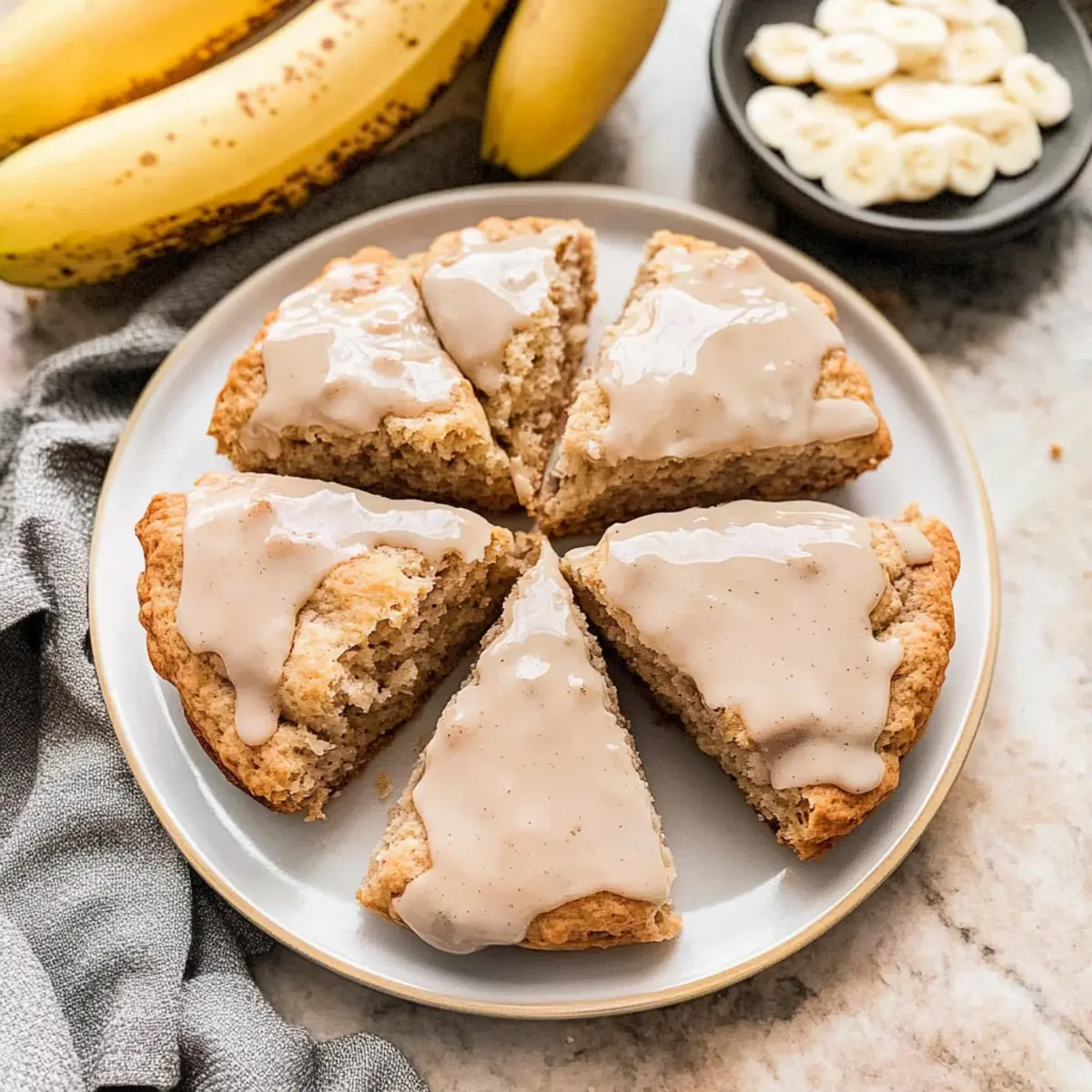 As I rummaged through my kitchen one rainy afternoon, the scent of ripe bananas transformed the space into a cozy haven. This inspired me to whip up a batch of Cinnamon Banana Scones, perfect for brightening up our day. With their delicate balance of spiced sweetness and moist texture, these scones can be a quick breakfast or an indulgent treat with afternoon tea. What’s even better? They’re incredibly easy to make and require just a handful of ingredients! Imagine serving these warm, drizzled with a luscious cream cheese glaze that adds an irresistible touch. Whether you’re stepping away from fast food or looking to elevate your brunch game, these banana scones are the delicious answer. Curious about how to make your mornings a little sweeter? Let’s dive into this delightful recipe! Why Are These Banana Scones Irresistible? Unmatched Flavor: The warm blend of ground cinnamon and ripe bananas creates an unforgettable taste experience that’s comforting and delightful. Quick and Easy: This recipe boasts simple steps that lead to fluffy scones in no time, perfect for busy mornings or last-minute gatherings. Versatile Treat: Pair them with coffee, tea, or your favorite breakfast spread for a delicious twist. You can also experiment by adding chocolate chips or nuts for added delight! Crowd-Pleasing Delight: Whether you’re hosting a brunch or just enjoying a quiet morning at home, these banana scones are sure to impress everyone who tries them! Banana Scone Ingredients For the Scones All-purpose flour – Provides the structure and body needed for perfect scones; remember to spoon and level it for best results. Salt – A crucial addition that enhances flavor and ensures a perfect balance with the sweetness. Baking powder – Helps the scones rise beautifully, giving them a light and fluffy texture. Baking soda – Works with the bananas, contributing to an ideal rise and texture. Ground cinnamon – Infuses the scones with a warm, sweet flavor that complements the bananas perfectly. Ground nutmeg – Adds a subtle nutty depth that pairs beautifully with cinnamon. Brown sugar – Provides moisture and sweetness; use light or dark depending on your preference. Unsalted butter – Creates that coveted flakiness; make sure it’s cold and cubed to keep the scones from spreading. Ripe bananas – These act as a natural sweetener and vital moisture provider; ensure they are well-mashed for even distribution. Heavy cream – Essential for producing that soft, moist scone texture that we all love. Pure vanilla extract – Adds a lovely depth and richness to the overall flavor. Egg – Binds all the ingredients together, ensuring a sturdy yet tender scone. Granulated sugar – Sprinkled on top for a sweet and textured finish. For the Cream Cheese Glaze Cream cheese – The rich base for the glaze, it should be at room temperature for easy blending. Powdered sugar – Sweetens the glaze and helps achieve that smooth, velvety texture. Milk – Adjusts the consistency to your liking; can be swapped for a dairy-free alternative if desired. Ground cinnamon – Reinforces the warm flavor, tying the glaze back to the delicious scones. Vanilla extract – Enhances the glaze, making every bite even more delightful. Step‑by‑Step Instructions for Cinnamon Banana Scones Step 1: Prepare Dry Ingredients In a large bowl, sift together 2 cups of all-purpose flour, 1 teaspoon of salt, 1 tablespoon of baking powder, ½ teaspoon of baking soda, 1 teaspoon of ground cinnamon, ¼ teaspoon of ground nutmeg, and ½ cup of brown sugar. Whisk these dry ingredients thoroughly until well combined, ensuring the mixture is light and airy. Set the bowl aside as you prepare the other components of the banana scones. Step 2: Prepare Bananas & Butter In a small bowl, mash 2 ripe bananas until smooth, leaving no large lumps. Then, cut ½ cup of cold unsalted butter into small cubes. To maintain its cold temperature, place the butter cubes in the freezer for about 10 minutes, which will help create the flakiness needed for the scones. Step 3: Combine Ingredients Add the cold butter cubes to the bowl with the dry ingredients. Using a pastry cutter or your fingers, work the butter into the flour until the mixture resembles pea-sized crumbs. This step is essential for achieving the perfect texture in your cinnamon banana scones, so take your time to ensure even distribution before proceeding. Step 4: Incorporate Wet Ingredients Gently fold in the mashed bananas, along with 1 beaten egg, 1 teaspoon of pure vanilla extract, and ¾ cup of heavy cream, into the dry mixture. Stir until just combined; be careful not to over-knead the dough, as it should remain slightly crumbly with some flour bits still visible. This preserves the lightness of the banana scones. Step 5: Shape Dough Transfer the dough onto a parchment-lined cookie sheet. Shape it into a 7-inch round circle, taking care to maintain an even thickness. Using a sharp knife, cut the dough into 8 equal triangles, but do not separate them completely. Freeze the shaped dough for 20 minutes to allow it to firm up, which will help maintain shape during baking. Step 6: Bake Preheat your oven to 375°F (190°C). After the dough has chilled, brush the tops generously with heavy cream and sprinkle granulated sugar over them for added sweetness and texture. Place the scones in the preheated oven and bake for 25–28 minutes, until they turn a beautiful golden brown and rise slightly. Step 7: Cool and Prepare Glaze Once baked, allow the cinnamon banana scones to cool on the baking sheet for about 15 minutes. While they cool, prepare the cream cheese glaze by mixing together 4 oz. of room temperature cream cheese, 1 cup of powdered sugar, 1-2 tablespoons of milk, ½ teaspoon of ground cinnamon, and ½ teaspoon of vanilla extract. Stir until smooth and drizzle generously over the cooled scones. Storage Tips for Banana Scones Room Temperature: Store scones in an airtight container