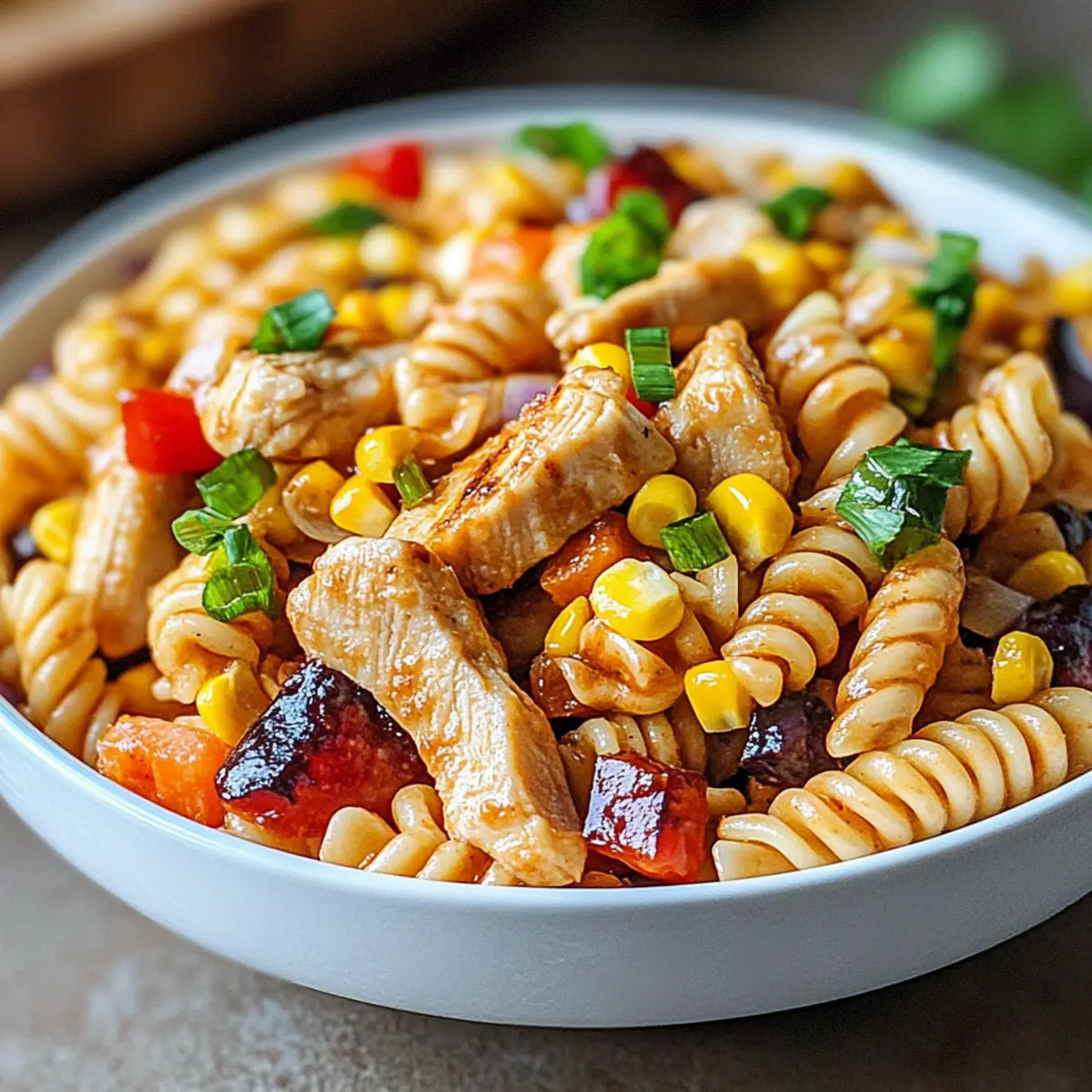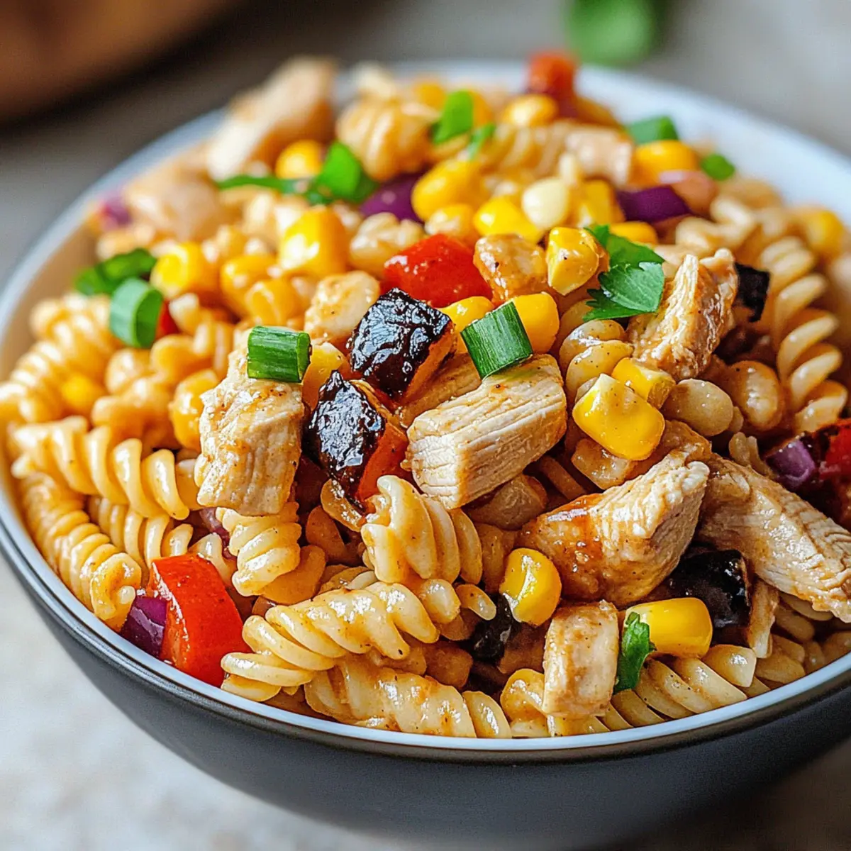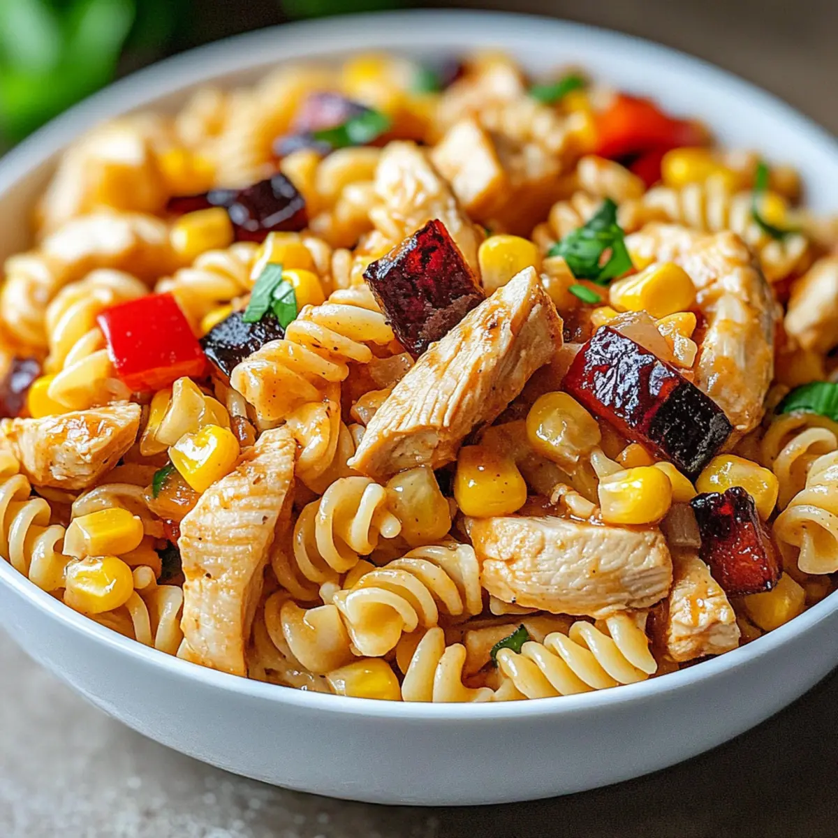 Crisp veggies and smoky grilled chicken mingle in the most unexpected way, creating a dish that marries the essence of summer barbecues with the charm of pasta salad. This BBQ Chicken Pasta Salad isn’t just a meal; it’s a versatile recipe that can easily fit into any weeknight rotation or serve as the star of your next gathering. With its customizable ingredients, everyone can enjoy a dish that suits their preferences, whether you’re looking for a hearty main or something lighter and fresher. Plus, it’s a meal-prep dream, keeping well in the fridge for those busy days ahead. Ready to uncover the delightful flavors and make this summer staple your own? Why is this BBQ Chicken Pasta Salad a must-try? Simplicity at Its Best: Preparing this dish is a breeze, making it perfect for both novice cooks and busy chefs who want great taste without fuss. Customizable Options: Whether you prefer chicken, grilled tofu, or a vibrant mix of seasonal veggies, this salad caters to all dietary preferences. Flavor Explosion: The combination of smoky grilled chicken, sweet corn, and tangy BBQ mayo dressing ensures every bite is packed with satisfying flavors. Meal Prep Friendly: Make it ahead of time, store it in the fridge, and enjoy a delicious meal throughout the week. Crowd-Pleasing: Perfect for summer gatherings or weeknight dinners, everyone will be raving about this tasty and hearty dish. For more delicious meal ideas, check out this Cajun Salmon Pasta or perhaps a light Crab Salad Refreshing. BBQ Chicken Pasta Salad Ingredients For the Salad Chicken Breasts – Main protein, grilled for smoky flavor; can substitute with grilled tofu or tempeh for vegan options. Elbow Pasta – Base of the salad, provides structure; substitute with rotini or gluten-free pasta for varied textures. Corn Kernels – Adds sweetness and a pop of color; use canned or frozen corn, and consider grilling fresh corn for added flavor. Red Bell Pepper – Freshness and crunch; green bell pepper or cherry tomatoes can be used in place for different flavors. Green Onions – Sharp, fresh flavor; chives can be a milder substitute. Shredded Cheddar Cheese – Richness and creaminess; substitute with dairy-free cheese for a vegan salad. For the Dressing BBQ Sauce – Provides tangy sweetness; choose your favorite brand and adjust spice levels to taste. Mayonnaise – Creaminess in the dressing; use vegan mayo for dairy-free, or Greek yogurt for a lighter alternative. Apple Cider Vinegar – Adds acidity to balance flavors; white vinegar can be used instead. Step‑by‑Step Instructions for BBQ Chicken Pasta Salad Step 1: Grill Chicken Start by seasoning the chicken breasts with salt and pepper. Preheat your grill to medium-high heat (about 400°F/200°C) and grill the chicken for 6-8 minutes on each side. You’ll know it’s cooked through when the internal temperature reaches 165°F (74°C). Once done, remove from the grill and let it rest for a few minutes before dicing into bite-sized pieces. Step 2: Cook Pasta In a large pot, bring salted water to a boil. Add the elbow pasta and cook according to the package instructions until al dente, usually around 8-10 minutes. Drain the pasta in a colander and rinse it under cold water to stop the cooking process. This will help maintain the perfect texture for your BBQ Chicken Pasta Salad. Step 3: Make Dressing In a mixing bowl, whisk together the BBQ sauce, mayonnaise, apple cider vinegar, salt, and pepper until the mixture is smooth and well combined. Adjust the consistency by adding more BBQ sauce or mayonnaise to your liking. This creamy dressing is what brings the flavors of the BBQ Chicken Pasta Salad together beautifully. Step 4: Assemble Salad In a large mixing bowl, combine the diced grilled chicken, cooked pasta, corn kernels, chopped red bell pepper, sliced green onions, and shredded cheddar cheese. Pour the prepared dressing over the top of the ingredients and gently toss everything together until evenly coated. Ensure that all components are well-mixed for the best flavor. Step 5: Chill Salad Transfer the assembled BBQ Chicken Pasta Salad to an airtight container and refrigerate for at least 30 minutes before serving. Chilling allows the flavors to meld beautifully, enhancing the overall taste of the dish. This step is crucial for serving a refreshing salad full of vibrant flavors that everyone will enjoy. How to Store and Freeze BBQ Chicken Pasta Salad Fridge: Store any leftover BBQ Chicken Pasta Salad in an airtight container for up to 3 days. The flavors meld beautifully after a day, making it even tastier on subsequent servings. Freezer: While not recommended for long-term freezing, you can freeze the salad components (without dressing) for up to 1 month. Assemble and dress the salad fresh after thawing for best quality. Reheating: If you do choose to heat any leftovers, use the microwave on low power to warm it gently. Avoid heating too much, as the pasta can become mushy. Serving Tips: Enjoy cold, straight from the fridge, or let it sit at room temperature for about 15 minutes before serving to enhance its flavors. What to Serve with BBQ Chicken Pasta Salad? Creating the perfect meal around this vibrant BBQ Chicken Pasta Salad can elevate your dining experience and satisfy all appetites. Grilled Corn on the Cob: A summer favorite, its sweetness complements the smoky flavors of the pasta salad and provides a delightful crunch. Garden Fresh Coleslaw: This refreshing side offers a crunchy texture and tangy flavor that balances the richness of the creamy salad. The colorful veggies also brighten up your plate. Watermelon Salad with Feta: Juicy watermelon pairs perfectly with the savory salad, bringing a refreshing sweetness that enhances the overall dining experience. Garlic Breadsticks: The crispy, buttery texture of these sticks is ideal for scooping up pasta salad remnants. Plus, they add a comforting touch to your meal. Lemonade or Iced Tea: A refreshing drink op
