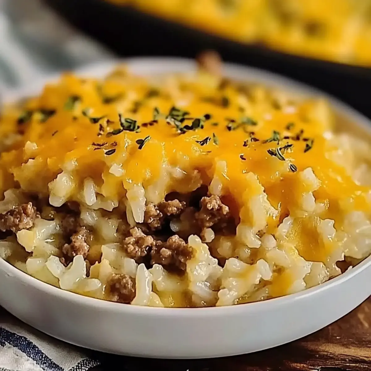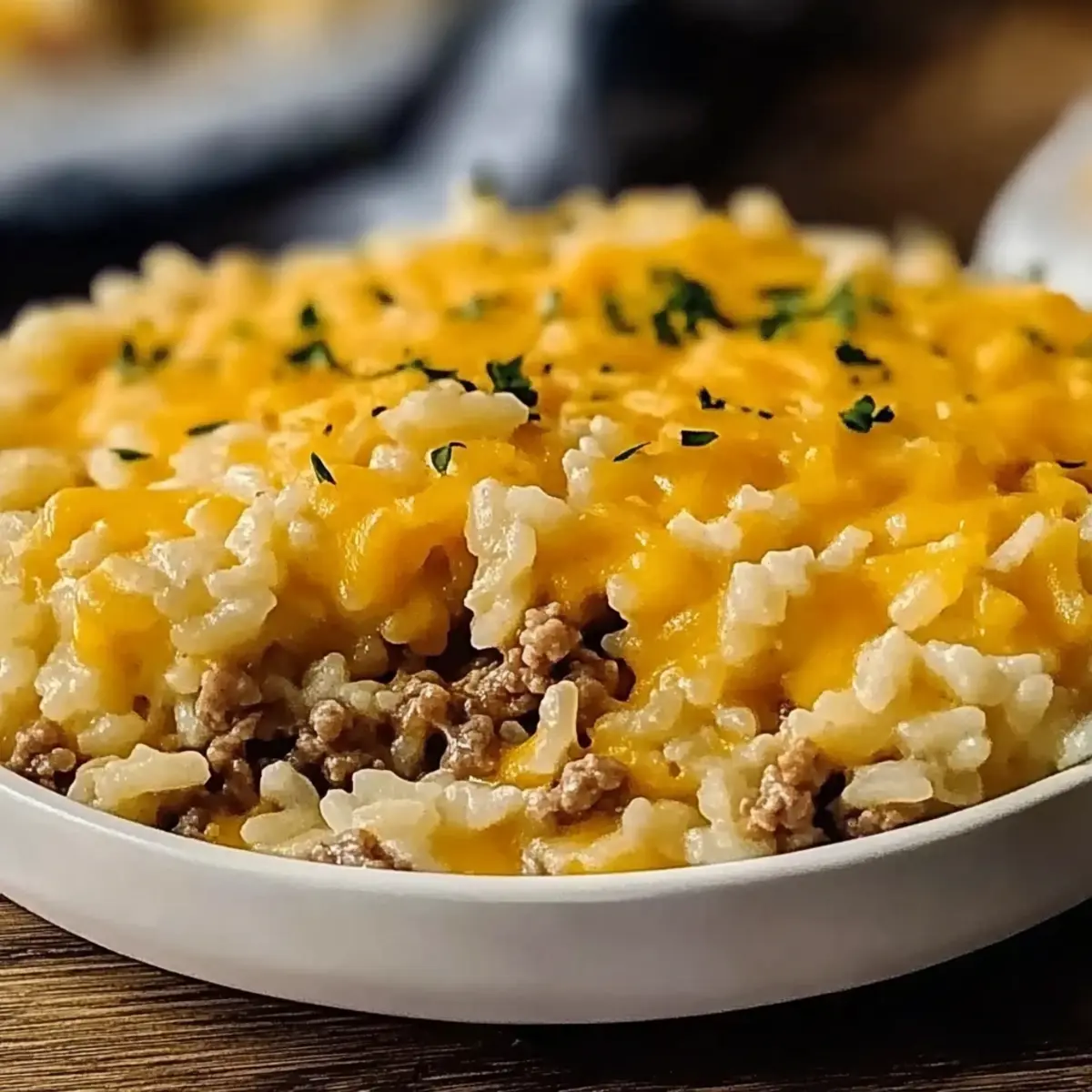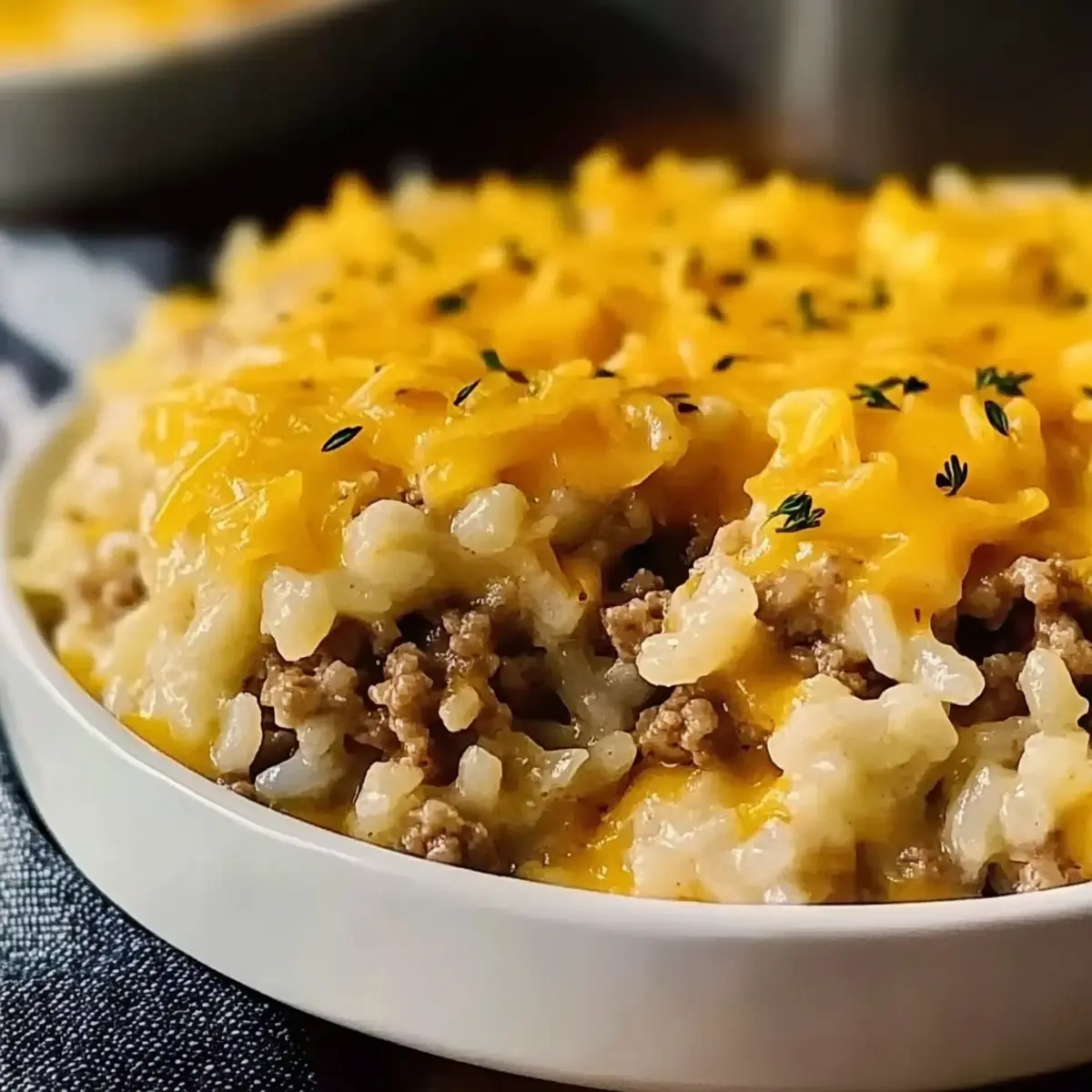 There’s something truly magical about the sounds of a bustling kitchen—chopping, sizzling, and the mouthwatering aroma of comfort food wafting through the air. Today, I’m sharing my go-to dish, the Cheddar Crusted Beef and Rice Casserole, which has become a beloved staple in my home. This recipe combines juicy ground beef with fluffy rice and a symphony of spices, all topped with a glorious crust of melted cheddar cheese. It’s not just a crowd-pleaser; it’s a quick and easy meal that can turn any busy weeknight into a heartwarming family gathering. Plus, the options for customization are endless, letting you sneak in your favorite veggies or even swap the beef for a plant-based alternative. What’s your favorite twist on a classic casserole? Let’s dive into this one! Why is Beef and Rice Casserole a Must-Try? Comforting warmth fills your home as this casserole bakes, creating a delicious experience for everyone. Customizable options let you swap in your favorite veggies or proteins, making it a standout dish for all dietary preferences. Easy preparation allows you to whip it up in no time, perfect for busy nights or unexpected guests. Family-friendly flavors ensure that even the pickiest eaters will ask for seconds. Best of all, the rich, cheesy topping adds a delightful finish that’s simply irresistible—just like our Chickpea Rice Bliss or Joe Pasta Casserole that both promise tasty comfort in every bite! Beef and Rice Casserole Ingredients For the Casserole • Ground Beef – Provides protein and flavor; consider using ground turkey for a lighter option. • Onion – Adds sweetness and depth; yellow onions are ideal for a richer taste. • Garlic – Enhances savory notes, making the dish aromatic and inviting. • Paprika – Introduces smoky depth; smoked paprika gives a stronger flavor. • Dried Oregano – Offers herbal notes that lift the casserole’s richness. • Salt & Black Pepper – Essential for bringing all the flavors together. • Uncooked White Rice – Acts as the hearty base; brown rice can be used with adjustments. • Beef Broth – Adds moisture and umami; opt for low-sodium broth for a healthier twist. • Diced Tomatoes (canned, undrained) – Brings acidity and moisture for balance. • Frozen Peas or Mixed Vegetables (optional) – Adds color and nutrition; feel free to swap with bell peppers or fresh greens. • Shredded Cheddar Cheese – Creates a rich, gooey topping; mix in mozzarella for more complexity. • Olive Oil – Used for sautéing the onion and beef, adding a touch of flavor. This Beef and Rice Casserole is versatile and delicious, making it an ideal addition to your cooking repertoire! Step‑by‑Step Instructions for Cheddar Crusted Beef and Rice Casserole Step 1: Preheat the Oven Begin by preheating your oven to 350°F (175°C). This step is crucial as it allows the Cheddar Crusted Beef and Rice Casserole to bake evenly, developing its rich flavors. While the oven heats up, prepare your ingredients for the next steps. Step 2: Sauté the Onion In a large skillet, heat a drizzle of olive oil over medium heat. Once the oil is shimmering, add the diced onion and sauté for 3-4 minutes, stirring frequently until the onion becomes translucent and fragrant. This process enhances the flavor base for your casserole. Step 3: Add Garlic and Beef Stir in the minced garlic and cook for another minute, allowing the garlic to become aromatic. Next, add the ground beef to the skillet, breaking it apart with a spatula. Cook until the beef is thoroughly browned, about 5-7 minutes, and drain any excess fat to keep the casserole light. Step 4: Season and Simmer Sprinkle in the paprika, dried oregano, salt, and black pepper, stirring well to season the meat. Add the undrained diced tomatoes and let the mixture simmer for 5 minutes. This step allows the flavors to meld beautifully and creates a rich sauce for the casserole. Step 5: Combine Rice and Beef Mix In a large bowl, combine the uncooked white rice and beef broth, mixing well. Then, gently fold in the cooked beef mixture and any optional frozen peas or mixed vegetables you desire. This fusion melds all the ingredients into a satisfying base for the Cheddar Crusted Beef and Rice Casserole. Step 6: Transfer to Baking Dish Grease a 9×13-inch baking dish with cooking spray or a bit of olive oil for easy removal. Pour the casserole mixture into the prepared dish, spreading it out evenly to ensure even cooking. This ensures every bite is packed with flavor as it bakes. Step 7: Top and Bake Sprinkle the shredded cheddar cheese generously over the top of the casserole, covering it entirely. Cover the dish with aluminum foil and place it in the preheated oven to bake for 30 minutes. This helps the casserole cook through while keeping it moist. Step 8: Uncover and Finish Baking After 30 minutes, carefully remove the foil to expose the cheesy top. Continue baking uncovered for an additional 10-15 minutes, or until the cheese is golden brown and bubbling. This final step creates that delightful crispy crust that everyone loves in a casserole. Step 9: Cool Before Serving Once baked to perfection, remove the Cheddar Crusted Beef and Rice Casserole from the oven. Allow it to cool for about 5-10 minutes before serving. This resting time helps the casserole set, making for easier servings and ensuring every delicious flavor is locked in. Make Ahead Options Preparing the Cheddar Crusted Beef and Rice Casserole ahead of time is a fantastic way to streamline your busy weeknights! You can assemble the casserole up to 24 hours in advance and simply refrigerate it until you’re ready to bake. To maintain the casserole’s quality, layer your ingredients as directed, cover tightly with foil, and refrigerate without baking. When it’s time to eat, just preheat the oven and add an extra 10-15 minutes to the baking time, monitoring until the cheese is beautifully golden. This way, you’ll enjoy the same comfo