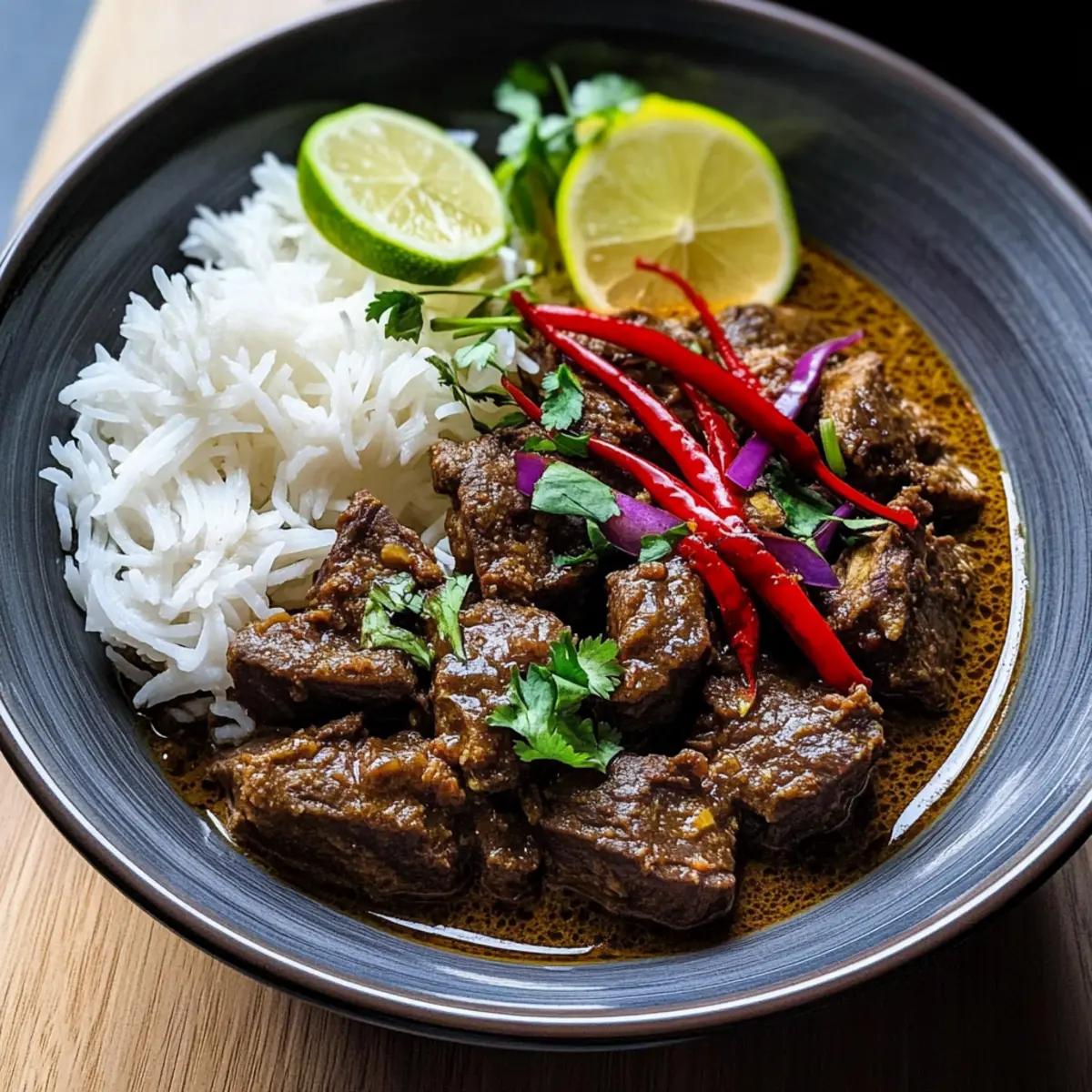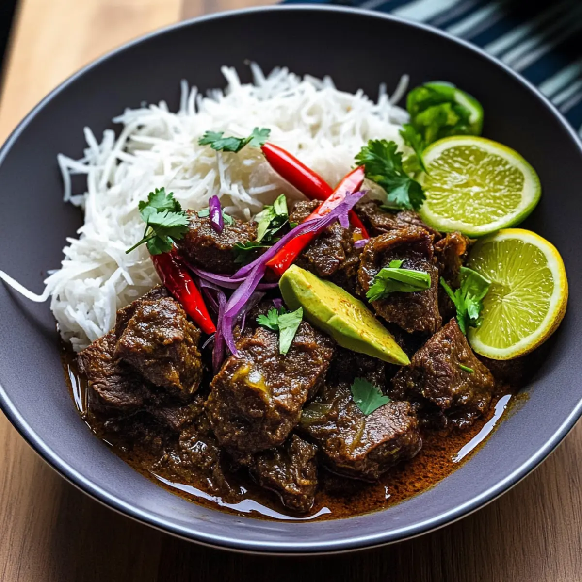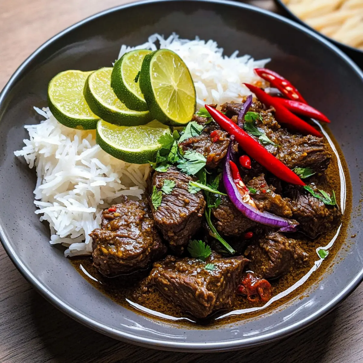 As I stirred the bubbling pot, the warm aroma of aromatic spices enveloped my kitchen, transporting me to the bustling streets of Indonesia. This is the magic of Beef Rendang, an iconic Indonesian/Malaysian curry that transcends ordinary meals. Bursting with robust flavors, this gluten-free dish masterfully combines tender, slow-cooked beef with rich coconut milk and a symphony of spices. Beyond its enchanting taste, one of the most irresistible perks is how effortlessly it can warm your home and your heart on a chilly evening. It’s a crowd-pleaser that invites everyone to the table, perfect for both special occasions and cozy weeknights. Are you ready to create a bowl of sheer comfort that’s both satisfying and full of flavor? Let’s dive into this culinary adventure together! Why is Beef Rendang so special? Hearty, Comforting Dish: The rich flavors of Beef Rendang encapsulate home-cooked goodness, making it the perfect dish for chilly evenings. Aromatic Spice Blend: This recipe highlights a unique mix of spices that introduces warmth and depth, elevating the beef beyond your typical curry. Versatile Ingredient Options: Feel free to experiment! Swap beef for chicken or tofu for a delicious twist, catering to both meat lovers and vegetarians alike. Easy Slow-Cooking Possibility: This dish comes together effortlessly, particularly in a slow cooker—allowing flavors to meld beautifully without much hands-on time. Ultimate Crowd-Pleaser: The mouthwatering aroma and robust taste guarantee that guests will rave about this dish, making it perfect for gatherings or special occasions! For more delicious comfort food, check out my Ground Beef Enchiladas and Cheesy Ground Beef recipes! Beef Rendang Ingredients • Discover the delightful components of this authentic dish! For the Spice Paste Dried Chilies – Add heat and depth; adjust quantity for your desired spice level. Shallots (or Onion) – Provides sweetness and aroma; can substitute with yellow or white onion. Galangal – Adds a unique earthy flavor; fresh ginger is a milder alternative. Ginger – Enhances warmth and spice complexity; use fresh for best results. Garlic – Offers a strong aromatic base; mince for an even blend. Lemongrass – Brings citrusy freshness; only use the white tender part for best flavor. For the Main Dish Oil – Essential for browning meat; high-smoke point oils like canola or vegetable are recommended. Beef – Use tough cuts like short ribs or chuck, cut into bite-sized pieces for tenderness. Cinnamon Stick – Provides warmth and sweetness; do not exceed the recommended amount. Cloves – Adds heady aromatic notes; whole cloves work best for flavor extraction. Star Anise – Contributes sweet, licorice-like flavor; utilize sparingly for balance. Cardamom Pods – Introduces an aromatic, minty flavor; lightly crush before adding. For the Rich Sauce Coconut Milk – Creates a rich, creamy texture; opt for light coconut milk for a lower-fat version. Tamarind Paste – Adds tanginess and depth; lime juice can be used for a similar flavor. Kaffir Lime Leaves – Enhances aroma and flavor; finely shredded lime zest is a handy substitute. Unsweetened Coconut Flakes – Adds texture and flavor; toasting them enhances nuttiness. Palm Sugar (or Brown Sugar) – Sweetens and balances flavors; regular sugar can be used, adjusting to taste. Salt – Essential for enhancing overall flavor; always adjust to taste as the last step in cooking. Now that you’ve gathered your ingredients, you’re ready to create an unforgettable Beef Rendang that will warm your home with its enchanting aroma and flavors! Step‑by‑Step Instructions for Beef Rendang Step 1: Make the Spice Paste Start by soaking the dried chilies in boiling water for about 15-20 minutes until softened. Drain and transfer them to a food processor, along with shallots, galangal, ginger, garlic, and the tender part of lemongrass. Blend until a smooth paste forms, scraping down the sides as needed. This vibrant spice paste is the heart of your Beef Rendang, so take your time to achieve a fine consistency. Step 2: Brown the Beef In a large saucepan, heat 2 tablespoons of oil over medium-high heat until shimmering. Add the bite-sized beef pieces in a single layer, allowing them to brown on all sides for about 5-7 minutes. The beef should be well-seared and caramelized, creating a flavorful base for your Beef Rendang. Stir occasionally to prevent sticking, ensuring each piece gets that beautiful golden crust. Step 3: Cook the Spices Reduce the heat to medium and add the spice paste you prepared in Step 1. Stir continuously for about 1-2 minutes, allowing the aromatic spices to release their fragrance. Next, toss in the whole spices—cinnamon stick, cloves, star anise, and lightly crushed cardamom pods. Cook for an additional minute until the paste is richly fragrant, enveloping the beef in tantalizing scents. Step 4: Simmer with Coconut Milk Pour in a can of coconut milk and 2 tablespoons of tamarind paste, stirring well to combine everything. Increase the heat to bring the mixture to a gentle boil, then reduce to low heat. Cover and let it simmer for 1-2 hours, stirring occasionally, until the beef is fork-tender and has absorbed all the beautiful flavors of the Beef Rendang. The sauce will thicken as it cooks. Step 5: Finish with Lime and Coconut Once the beef is tender, stir in the kaffir lime leaves, toasted coconut flakes, and palm sugar. Cook for an additional minute, allowing the flavors to meld together beautifully. Taste and adjust with salt as needed, ensuring the balance of flavors shines through. The gooey sweetness from the palm sugar complements the rich, tangy sauce perfectly. Step 6: Serve Before serving, carefully remove the whole spices like the cinnamon stick, cloves, star anise, and cardamom pods. Serve the Beef Rendang hot, either over a bed of fluffy jasmine rice or alongside flatbreads, ensuring your guests can enjoy every last drop