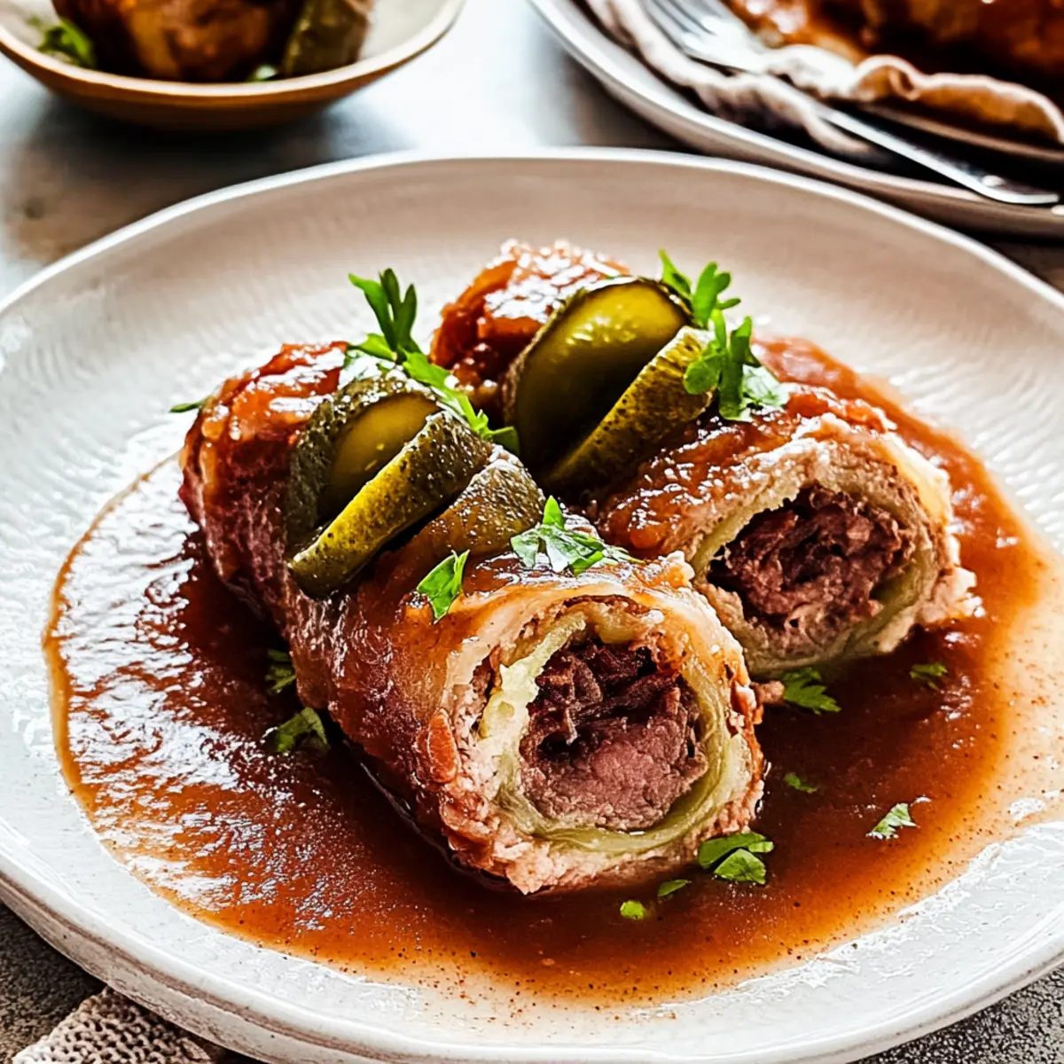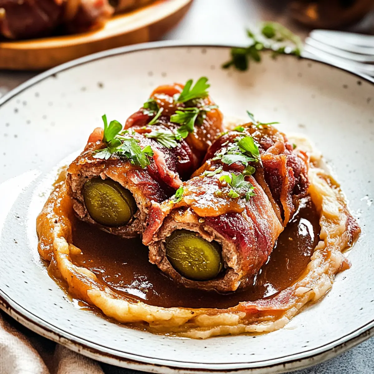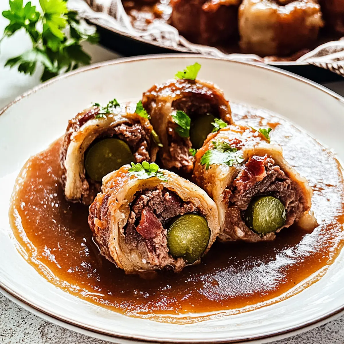 As I stood in my kitchen, the rich, inviting aroma of sautéing bacon filled the air, instantly transporting me to the heart of Germany. This authentic beef Rouladen recipe blends tender, flavorful beef with a delightful filling of crispy bacon, zesty mustard, and tangy pickles, all enveloped in a luscious gravy. The beauty of this dish lies not just in its comforting heartiness, but also in its ability to transform an ordinary meal into a celebration, making it perfect for Sunday dinners or special occasions. It’s an impressive crowd-pleaser that requires just a little prep time while delivering big on taste. If you’re longing for a dish that brings family and friends together, you’ll love making this German classic. Ready to savor every bite? Let’s dive in! Why is Rouladen a must-try? Authentic Flavor: This beef Rouladen recipe captures the essence of traditional German cuisine, bringing a rich flavor to your table that’s hard to resist. Hearty Comfort: Each bite offers a warm embrace with tender beef, smoky bacon, and tangy pickles, making it the ultimate comfort food. Easy to Make: With a straightforward process, this dish allows even novice cooks to impress their guests with gourmet-level meals. Perfect for Sharing: Ideal for family gatherings or special occasions, it’s a crowd-pleaser that sparks joy and conversation. Versatile Pairings: Serve with spaetzle, mashed potatoes, or fresh salads, and you’ll create a balanced meal that caters to every palate. Explore more delightful recipes like Cheesy Ground Beef or try your hand at rustic flavors with Ground Beef Enchiladas for varied tastes! Beef Rouladen Recipe Ingredients For the Rouladen Top Round Beef Steak – Provides a tender base; ask your butcher for slices about 8-10 inches long and ¼-inch thick. Kosher Salt & Black Pepper – Essential for seasoning; adjust to personal taste preferences. Prepared Yellow German Mustard – Adds a zesty flavor that complements the beef magnificently. Bacon – Gives a rich, smoky taste as a delicious filling. Dill Pickles – Contributes a crunchy and tangy contrast; slice medium-size pickles lengthwise. Yellow Onion – Enhances flavor depth; chop for both the rouladen filling and the gravy. For the Gravy Unsalted Butter & Olive Oil – Used for sautéing and adding richness to the dish. Carrot, Celery, Garlic – Provides aromatic flavor in the gravy; chop the carrot and celery, and mince the garlic. Soy Sauce & Low-Sodium Beef Broth – Forms the savory base of the gravy, enriching umami flavors. Tomato Paste – Adds lovely depth and color to your gravy’s texture. Cornstarch & Water – Necessary to thicken the gravy; create a slurry for the desired consistency. For Garnish Chopped Fresh Parsley – An optional fresh touch that brightens the presentation of your dish. Ready to dive into creating a fantastic beef Rouladen recipe that will wow your family and friends? Let’s get cooking! Step‑by‑Step Instructions for beef Rouladen recipe Step 1: Prepare the Beef Begin by laying out your top round beef slices on a clean cutting board. Using a meat mallet, gently pound each slice to about ¼ inch thick for uniform tenderness. Season both sides generously with kosher salt and black pepper, ensuring the beef is well-flavored before moving on to the filling. Step 2: Assemble the Rouladen Spread a thin layer of yellow German mustard evenly across each beef slice. Next, layer the strips of bacon, dill pickles, and chopped onions on top of the mustard. Carefully roll each slice tightly, starting from one end, and secure each roulade with toothpicks to hold it together during cooking. Step 3: Brown the Rouladen In a large skillet, heat a combination of unsalted butter and olive oil over medium-high heat until melted and bubbling. Add the prepared rouladen and brown them for about 3-4 minutes on each side, until they develop a rich golden color. Once browned, remove them from the skillet and set aside on a plate. Step 4: Sauté Aromatics In the same skillet, add the chopped onions, diced carrot, celery, and minced garlic. Sauté these vegetables over medium heat for about 5-7 minutes until they are soft and fragrant, stirring occasionally to prevent browning. This mixture will provide a flavorful base for your gravy. Step 5: Create the Gravy Base Pour in the soy sauce, low-sodium beef broth, and tomato paste into the skillet with the sautéed vegetables. Stir thoroughly to combine, ensuring the tomato paste is well incorporated. Bring the mixture to a gentle simmer, allowing it to cook for about 2-3 minutes before returning the browned rouladen to the skillet. Step 6: Simmer the Rouladen Cover the skillet with a lid and reduce the heat to low. Let the beef rouladen simmer gently for 1.5 to 2 hours. Check occasionally, and ensure the sauce remains at a low simmer; the beef should become fork-tender and the flavors meld beautifully, creating a comforting dish. Step 7: Thicken the Gravy Once the beef is tender, carefully remove the rouladen and set aside. Strain the broth from the skillet to discard the solid vegetables. Return the liquid to the pot and bring it back to a simmer. In a small bowl, mix cornstarch with water to form a slurry, then gradually whisk it into the simmering broth to thicken the gravy. Step 8: Finish the Gravy Stir in a tablespoon of chilled butter into the thickened gravy for a glossy finish. Taste and adjust the seasoning with additional salt and pepper as needed. Allow the gravy to simmer on low heat for a few more minutes, ensuring it is rich and flavorful. Step 9: Serve the Rouladen Place each beef roulade on a serving platter and generously spoon the thick gravy over the top. If desired, sprinkle freshly chopped parsley for a vibrant garnish. Serve immediately with spaetzle, boiled potatoes, or your favorite side dishes, and relish the authentic flavors of this hearty beef Rouladen recipe! What to Serve with Authentic Beef Rouladen? Creating a delightf