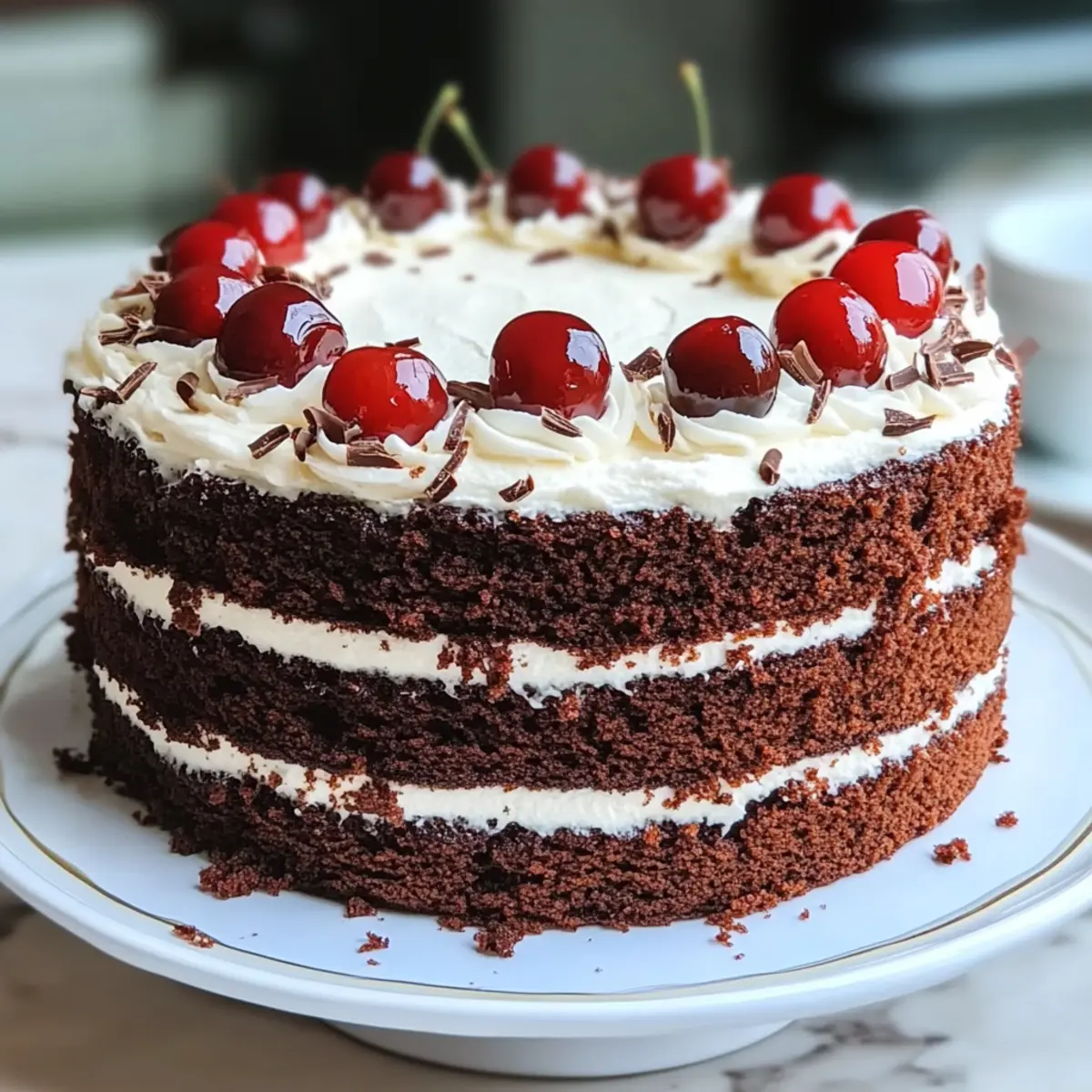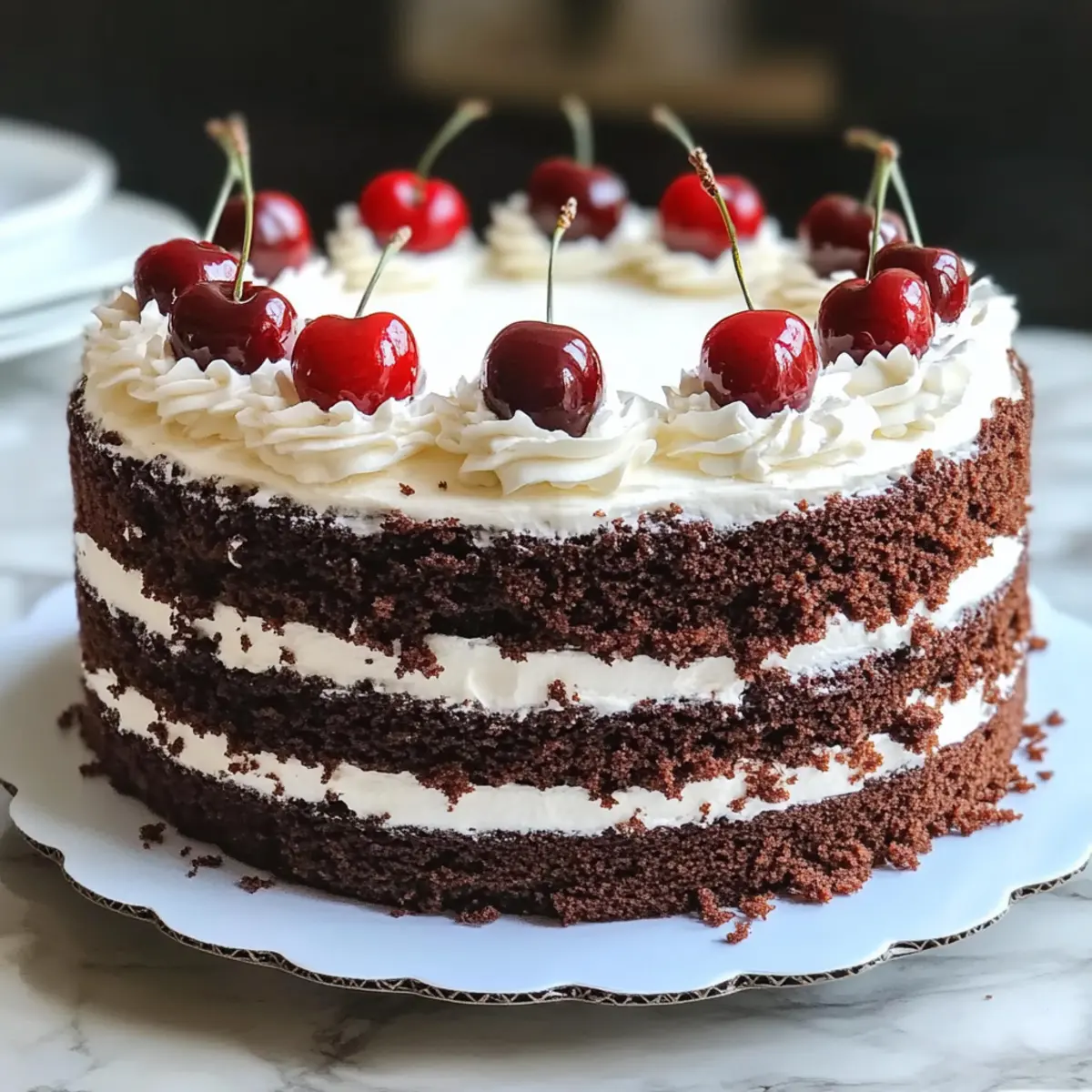 As I took my first bite of a homemade Black Forest Cake, I was transported to a charming German village, where the air was thick with the scent of chocolate and cherries. This delightful dessert is a sensational treat that pairs rich chocolate layers with luscious cherry filling and airy whipped cream frosting. Not only is this classic recipe a showstopper for any celebration, but it also allows you to enjoy the simplicity and joy of home baking without hours in the kitchen. The result? A perfect companion for family gatherings or a cozy night in. Ready to make your own slice of bliss? Let’s dive into crafting this irresistible Black Forest Cake that’s sure to impress! Why is Black Forest Cake a Must-Try? Irresistible Layers: Each slice reveals moist chocolate layers combined with a luscious cherry filling, making it a feast for the senses. Homemade Delight: With simple ingredients and straightforward steps, you’ll be creating a stunning masterpiece without excessive effort. Crowd-Pleasing Treat: This dessert is perfect for celebrations or just a weekend treat, sure to impress guests and family alike. Perfect Pairings: Enjoy it with coffee, dessert wines, or as an indulgent ending to a hearty meal. Timeless Classic: The blend of flavors and textures evokes warmth and nostalgia, highlighting the beauty of traditional baking. Now, unleash your inner baker and create your own version, diving into the delicious world of a Classic Black Forest Cake that will leave everyone asking for seconds! Black Forest Cake Ingredients A classic treat you’ll love! For the Cake Layers All-Purpose Flour – Forms the tender base for your delectable Black Forest cake. Cocoa Powder – Adds that deep, rich chocolate flavor that everyone craves. Granulated Sugar – Sweetens the batter, balancing the cocoa’s bitterness. Eggs – Provide structure and moisture to support those lovely layers. Vegetable Oil – Keeps the cake soft and moist, making every bite delightful. Buttermilk – Enhances the cake’s tenderness, giving it that perfect crumb. Baking Powder and Baking Soda – Essential for a fluffy rise, ensuring a light texture. Salt – A little pinch to enhance and balance all the flavors. For the Cherry Filling Cherry Filling or Cherries in Syrup – Brings that signature fruity sweetness to the cake. Kirsch or Cherry Juice – Keeps your cake moist while adding a hint of cherry flavor. For the Whipped Cream Frosting Heavy Cream – Whips into a rich, fluffy frosting that perfectly complements the chocolate. Powdered Sugar – Adds just the right amount of sweetness to the cream without overpowering it. Chocolate Shavings – Adds a decorative and flavorful touch to bring your cake to life. Step‑by‑Step Instructions for Black Forest Cake Step 1: Prepare the Oven and Cake Pans Preheat your oven to 350°F (175°C) and prepare two 9-inch round cake pans by greasing the sides and lining the bottoms with parchment paper. This ensures easy release after baking. As the oven heats, you’ll have the perfect environment for your Black Forest Cake to rise beautifully. Step 2: Combine Dry Ingredients In a large mixing bowl, whisk together 2 cups of all-purpose flour, 2 cups of granulated sugar, ¾ cup of cocoa powder, 1 tablespoon of baking powder, 1 tablespoon of baking soda, and ½ teaspoon of salt until well combined. The mix should be evenly blended with no lumps, providing a rich chocolate flavor and the proper structure for the cake layers. Step 3: Add Wet Ingredients Next, add 2 large eggs, 1 cup of buttermilk, ½ cup of vegetable oil, and 2 teaspoons of vanilla extract to the dry ingredients. Mix on medium speed until the batter is smooth and well integrated. Gradually pour in 1 cup of boiling water, which will thin out the batter and keep the cake layers moist while baking. Step 4: Bake the Cake Layers Divide the batter evenly between the prepared cake pans and smooth the tops with a spatula. Place them in the preheated oven and bake for 30-35 minutes, or until a toothpick inserted in the center comes out clean. Your Black Forest Cake layers should rise beautifully and develop a lovely, shiny crust. Step 5: Cool the Cakes Once baked, remove the pans from the oven and let them cool in the pans for 10 minutes. Then carefully transfer the cakes to a wire rack to cool completely. This process is crucial for ensuring a tender texture, allowing the layers to firm up without becoming soggy. Step 6: Prepare the Cherry Filling While the cakes cool, prepare the cherry filling by combining 2 cups of cherries in syrup and ⅓ cup of granulated sugar in a saucepan over medium heat. Stir until the juices are released and simmer for about 5-7 minutes. If you desire a thicker filling, mix 1 tablespoon of cornstarch with 2 tablespoons of water and stir it into the cherries until thickened. Step 7: Make the Whipped Cream Frosting In a separate bowl, whip 2 cups of heavy cream with ¼ cup of powdered sugar and 1 teaspoon of vanilla extract until stiff peaks form. This airy whipped cream will create a luscious layer between the chocolate and cherries, enhancing the overall decadence of your Black Forest Cake. Step 8: Assemble the Cake Once the cakes are completely cooled, place one layer on a serving plate. Spread a generous portion of whipped cream over the top, followed by half of the cherry filling. Carefully place the second cake layer on top and repeat the process with whipped cream and cherries. Finally, frost the sides and top of the cake with the remaining whipped cream. Step 9: Chill Before Serving Refrigerate the finished Black Forest Cake for 2-3 hours, allowing the flavors to meld beautifully and the cake to firm up. This chilling period not only enhances the taste but also helps in slicing the cake with precision. Step 10: Garnish and Enjoy Before serving, decorate the top of your chilled Black Forest Cake with chocolate shavings and a few fresh cherries for a stunning presentation. Slice into gener