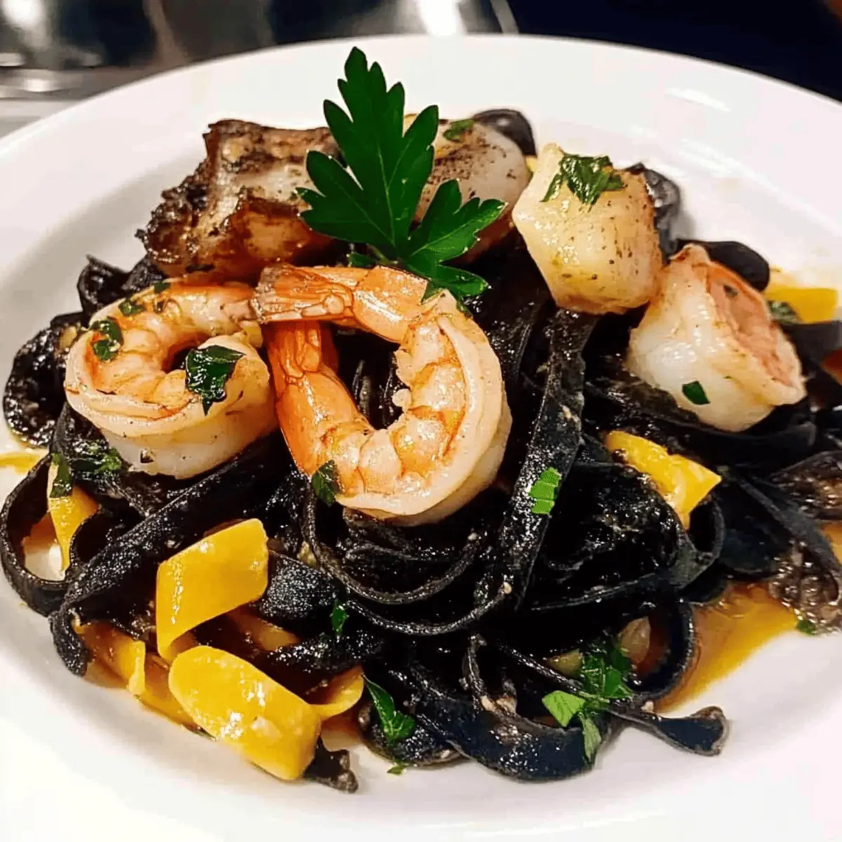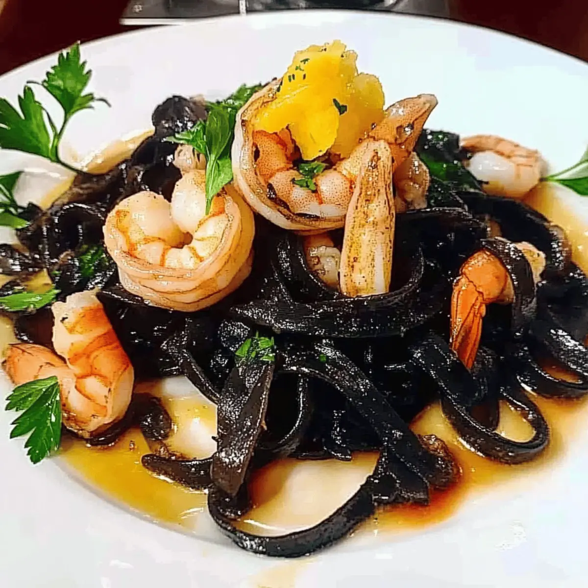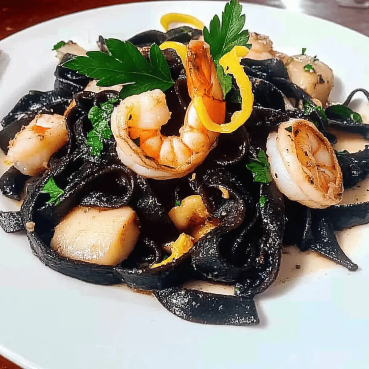 As I was stirring my pot of bubbling water, a thought crept in: why not add a touch of the extraordinary to our Halloween feast this year? Enter the delightful Homemade Black Squid Ink Pasta—a dish that not only turns heads but also tantalizes taste buds with a briny essence straight from the sea. The beauty of this recipe lies in its simplicity; created with just flour, eggs, and cuttlefish ink, it’s as easy to make as it is to impress. Imagine treating your friends and family to a stunning visual experience that doesn’t skimp on flavor! Plus, it’s perfect for those seeking a unique, homemade alternative to fast food this Halloween. Curious about how to bring this gourmet delight to your kitchen? Let’s dive into the recipe together! Why is Squid Ink Pasta a Halloween Hit? Uniqueness: This stunning black squid ink pasta is not just a meal; it’s an eye-catching centerpiece that adds a spooky flair to your Halloween celebrations. Simplicity: With minimal ingredients like flour, eggs, and cuttlefish ink, you’ll whip up a gourmet dish easily at home, perfect for adventurous cooks or those seeking unique recipes. Flavor Explosion: The briny richness of the squid ink beautifully complements the fresh seafood, transforming your dinner into a flavorful experience that diners won’t forget. Versatility: Feel free to mix it up—swap in lobster or crab for even more indulgence, or add veggies like spinach or mushrooms for a nutritious twist. Crowd-Pleaser: Served with freshly grated parmesan, this dish is sure to impress your guests and elevate your gathering, making it a memorable Halloween feast. Ready for more delightful creations? Check out our Garlic Butter Pasta or Creamy Cajun Salmon Pasta for additional delicious options! Black Squid Ink Pasta Ingredients For the Dough • “00” Flour – Provides structure and smoothness in the pasta; can use all-purpose flour but may lose silkiness. • Large Eggs – Essential for binding the pasta and imparting richness. • Salt – Enhances flavor and strengthens gluten in the dough. • Cuttlefish Ink (0.25 oz) – Adds distinctive color and a mild brininess to the pasta; can substitute with squid ink if necessary. For the Seafood Sauce • Large Shrimp (12 pieces) – Main protein source, tender and flavorful when cooked correctly. • Sea Scallops (8 pieces) – Adds sweetness and texture contrast to the dish. • Tomatoes (2 medium, chopped) – Provides acidity and freshness to the sauce. • Garlic (3 cloves, minced) – Adds aromatic flavor to the dish. • Extra Virgin Olive Oil (¼ cup) – For sautéing seafood and enhancing flavor. • White Wine (¼ cup) – Adds depth and acidity to the sauce. • Pasta Cooking Liquid (1 cup) – Adjusts sauce consistency and infuses brininess. • Hot Pepper Flakes (½ tablespoon) – Adds a mild heat profile. • Fresh Lemon Juice (1 tablespoon) – Brightens and balances flavors in the dish. • Italian Flat Leaf Parsley (½ cup, chopped) – For garnish and fresh flavor. You’re all set to create this Black Squid Ink Pasta for Halloween. Let your culinary adventure begin! Step‑by‑Step Instructions for Black Squid Ink Pasta for Halloween Step 1: Prepare the Dough In a blender, combine large eggs and cuttlefish ink, blending until smooth. In a large mixing bowl, create a well with “00” flour mixed with a pinch of salt. Gradually pour the egg mixture into the well, using a fork to incorporate the flour from the edges. Continue mixing until the dough begins to form, then set aside. Step 2: Knead the Dough Transfer the dough onto a lightly floured surface and knead it by hand for approximately 10 minutes, until it becomes smooth and elastic. Expect it to darken in color as the squid ink is fully integrated. Cover the dough with a clean kitchen towel to prevent it from drying out, and let it rest. Step 3: Rest the Dough Allow the dough to rest for 45–60 minutes at room temperature. This step is crucial as it helps relax the gluten, making the dough easier to roll out later. If you’re preparing in advance, you can also wrap it in plastic wrap and refrigerate it overnight for best results. Step 4: Cook Seafood In a large skillet, heat ¼ cup of extra virgin olive oil over medium heat. Sauté the large shrimp and sea scallops for about 2 minutes on each side until they turn pink and opaque. Once cooked, remove them from the skillet and set aside, keeping them warm while you prepare the sauce. Step 5: Make Sauce Using the same skillet, add minced garlic and sauté until fragrant, about 30 seconds. Then, add the chopped tomatoes and ¼ cup of white wine, stirring to combine. Allow the mixture to simmer for about 5 minutes, letting the flavors meld together, and season lightly with salt, pepper, and hot pepper flakes. Step 6: Cook Pasta Bring a large pot of salted water to a boil. Once boiling, add the fresh black squid ink pasta and cook for 2–3 minutes, or until the pasta floats to the top and is al dente. Reserve 1 cup of the pasta cooking liquid before draining the pasta in a colander. Step 7: Combine and Serve Return the drained pasta to the skillet with the sauce. Add the reserved pasta cooking liquid, cooked seafood, fresh lemon juice, and chopped parsley. Toss everything gently over low heat until well combined, approximately 1–2 minutes. Serve immediately, garnishing with additional parsley and a sprinkle of grated parmesan if desired. What to Serve with Black Squid Ink Pasta for Halloween This enchanting dish pairs beautifully with a variety of sides and treats, creating a memorable dining experience for your Halloween celebration. Creamy Garlic Mashed Potatoes: Silky and buttery, these potatoes offer comfort and a rich contrast to the briny notes of your pasta. Roasted Brussels Sprouts with Bacon: The crispy, savory elements of bacon and earthy Brussels sprouts create a deliciously crunchy texture alongside your sauce-coated noodles. Crisp Caesar Salad: A refreshing 