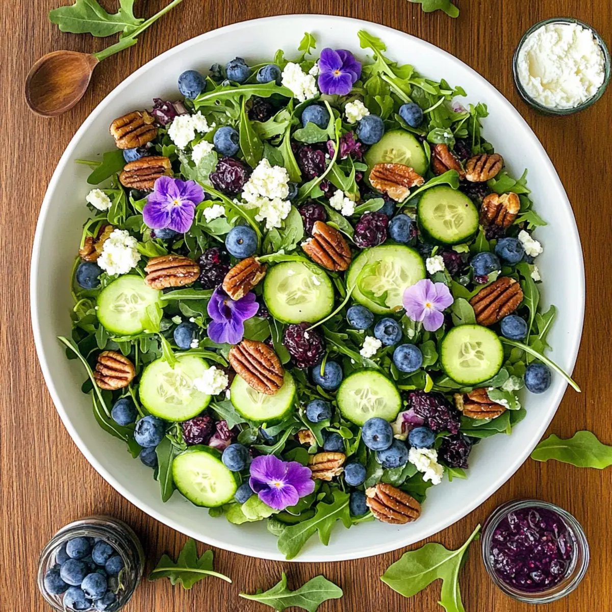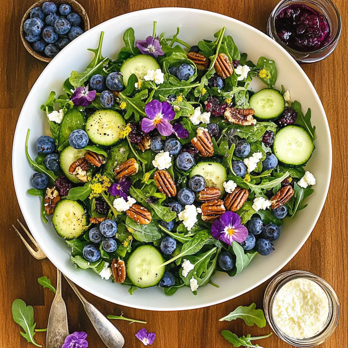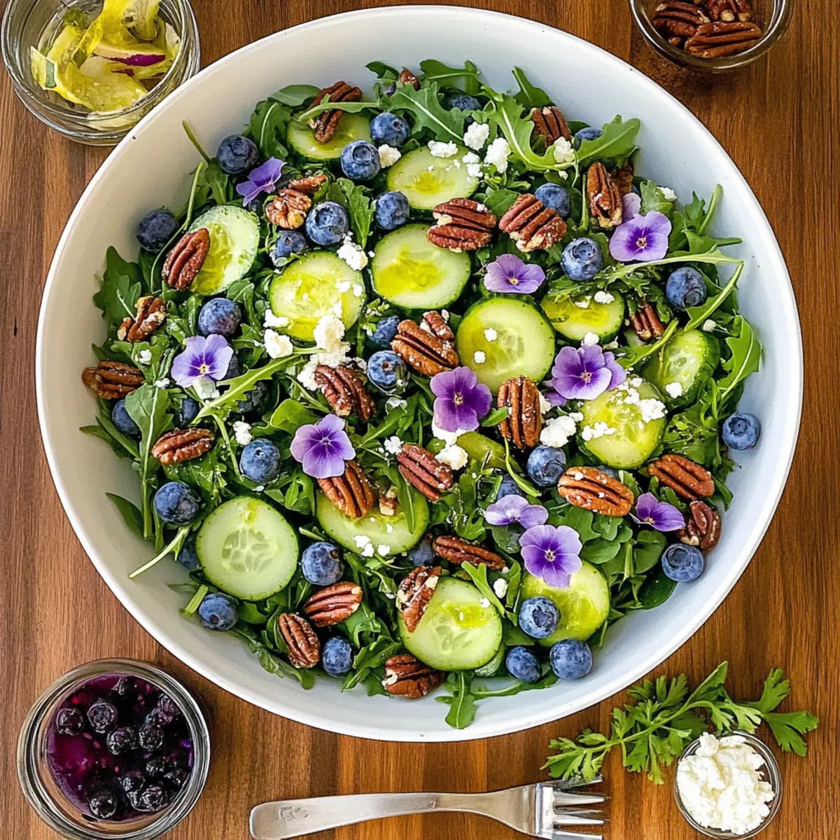 As the summer sun warms the days and vibrant blossoms fill the air, I can’t help but crave the fresh, lively tastes of the season. Enter the Blueberry Arugula Herb Salad, a perfect marriage of crisp arugula, succulent blueberries, and an aromatic assortment of herbs. This salad isn’t just about looking gorgeous on a picnic table; it’s a celebration of health and flavor that’s incredibly easy to whip up. With its crowd-pleasing charm and nutrient-rich ingredients, this dish is an ideal companion for your summer gatherings—be it a casual barbecue or an elegant brunch. Who wouldn’t want a refreshing, colorful salad that elevates any meal? Ready to dive into this delightful blend of ingredients? Let’s get started! Why is this salad a must-try? Savor the freshness: This Blueberry Arugula Herb Salad combines crisp greens with vibrant berries, delivering a deliciously refreshing bite. Customizable potential: With the ability to swap herbs and add proteins like grilled chicken or shrimp, you’ll never get bored! Nutritious choice: Packed with vitamins and antioxidants, it’s a guilt-free indulgence. Quick preparation: Ready in under 30 minutes, it’s perfect for busy summer days or last-minute gatherings. Crowd-pleaser: Its colorful presentation and delightful flavors make it a hit at any event, pairing beautifully with options like Avocado Egg Salad or Quinoa Crunch Salad! Blueberry Arugula Herb Salad Ingredients • Perfect for summer gatherings! For the Greens Baby Arugula – A peppery base that adds a vibrant touch; consider spinach for a milder flavor. Fresh Herb Leaves (Basil, Cilantro, Dill, Mint, Italian Parsley, Tarragon) – An aromatic mix that enhances flavor; choose herbs based on what you have at home. For the Fruit and Veggies Fresh Blueberries – Bursting with natural sweetness; swap for raspberries or strawberries if preferred. Small Red Onion – Adds crunch and sharpness; soak in cold water to mellow the bite. Seedless Cucumber – Contributes a refreshing crunch; zucchini can be a great substitute. Radicchio (optional) – Offers slight bitterness and vibrant color; omit if you like it milder. For the Crunch Candied Pecans – Sweet and crunchy; toasted walnuts or almonds also provide a delightful crunch. For the Creaminess Goat Cheese (optional) – Creamy and tangy, it elevates the dish; replace with feta for a similar creamy touch. For Garnish Edible Flowers (optional) – Beautiful addition for presentation; only use confirmed edible varieties like pansies. This Blueberry Arugula Herb Salad is sure to be a hit at your next gathering, offering a burst of flavor in every bite! Step‑by‑Step Instructions for Blueberry Arugula Herb Salad Step 1: Marinate the Onions In a mixing bowl, combine halved red onions with cider vinegar, sugar, and salt. Allow this mixture to marinate for 10 minutes, giving it time to soften and reduce its sharpness. As the onions soak, they will become a sweet and tangy addition that ties the flavors of your Blueberry Arugula Herb Salad together. Step 2: Prepare the Dressing After the onions have marinated, drizzle olive oil into the onion mixture. Whisk in honey, Dijon mustard, lemon juice, and a pinch of salt and pepper. This creamy dressing should be smooth and lightly tangy, bringing richness to the salad while balancing the freshness of the arugula and blueberries. Step 3: Combine the Greens and Fruits In a large bowl, combine a generous portion of baby arugula, a selection of your favorite fresh herbs, radicchio, diced seedless cucumber, and plump blueberries. The vibrant colors and varied textures make this Blueberry Arugula Herb Salad visually appealing, and the ingredients will provide a delightful crunch with each bite. Step 4: Toss with the Dressing Pour the prepared dressing over the combined salad ingredients and toss gently to ensure everything is evenly coated. Aim for a beautiful blend of colors and flavors, making sure the arugula, blueberries, and herbs are all well-dressed without wilting. This step is essential for achieving that refreshing taste! Step 5: Add Garnishes Optional but highly recommended, sprinkle crumbled goat cheese over the top of the salad for a creamy finish. If you’re feeling fancy, add edible flowers to enhance the presentation. Their vibrant colors will make your Blueberry Arugula Herb Salad not only delicious but also a stunning centerpiece for your summer gathering. How to Store and Freeze Blueberry Arugula Herb Salad Fridge: Store the salad in a sealed airtight container for up to 2 days. Keep the dressing separate until ready to serve to maintain freshness and crunch. Freezer: Freezing is not recommended for this salad due to the delicate texture of arugula and blueberries. It’s best enjoyed fresh! Reheating: If you’ve added protein like grilled chicken, ensure you reheat it gently in the microwave until warmed through. Serve immediately with fresh toppings. Serving Suggestions: Enjoy with fresh herbs and a sprinkle of goat cheese just before serving to keep flavors bright and appealing! What to Serve with Blueberry Arugula Herb Salad Elevate your dining experience by adding complementary dishes that harmonize with the vibrant flavors of this refreshing salad. Grilled Chicken Skewers: Tender and smoky, these skewers add protein that beautifully balances the salad’s freshness. Perfect for gatherings! Quinoa Pilaf: A nutty, hearty side that offers a delightful contrast in texture while remaining light and nutritious. It’s an excellent gluten-free option. Herbed Goat Cheese Crostini: Creamy and tangy, these crostini are a perfect pairing with the salad’s flavors. Plus, they make for a stunning appetizer! Chilled White Wine Spritzer: A light, effervescent drink that complements the fruitiness of the salad perfectly on a warm summer day. It enhances enjoyment with every sip! Watermelon Feta Salad: A refreshing side that echoes the summer vibe, combining sweet and savory in every