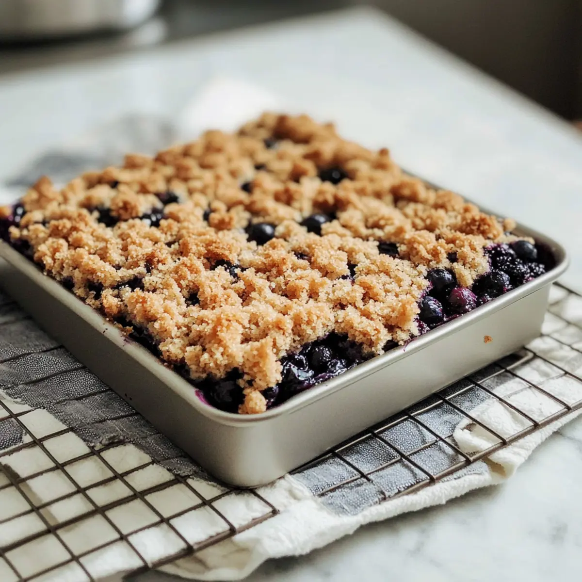 Once baked, remove the cake from the oven and let it cool in the pan for about 5 minutes. Carefully transfer it to a wire rack for further cooling. This brief resting time will make slicing easier. Once cooled slightly, cut into squares and serve warm, highlighting those delightful blueberries and buttery topping.