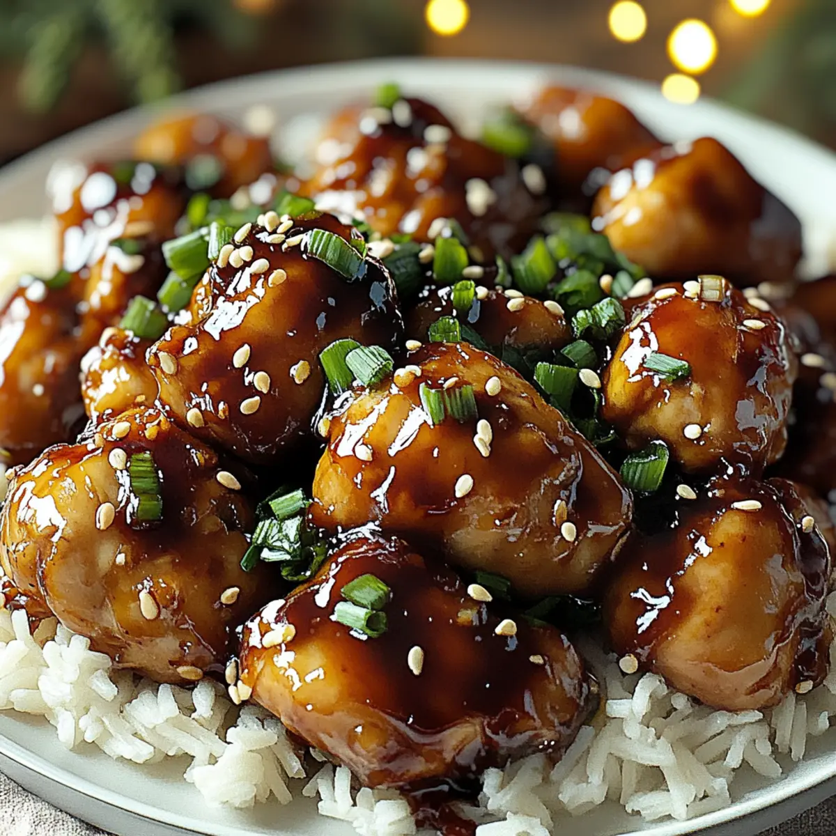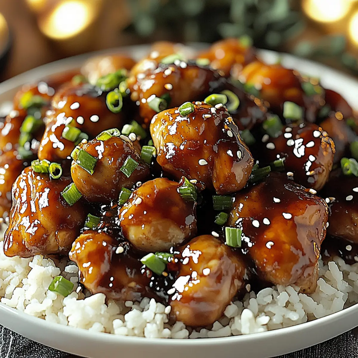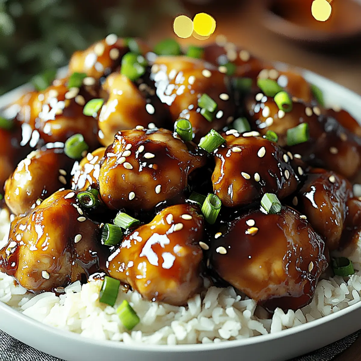 As the aroma of savory-sweet Bourbon Chicken fills my kitchen, I’m instantly transported back to evenings spent savoring flavors reminiscent of my favorite takeout. This dish, a beloved staple of American-Chinese cuisine, features tender chicken thighs glazed in a rich, sticky sauce made with soy sauce, brown sugar, and a splash of bourbon. What I adore most about this Bourbon Chicken recipe is how it brings the ease of a quick 30-minute meal to the table while delivering all the comforting nuances of a restaurant-quality dish. It’s perfect for busy weeknights or meal prep, effortlessly transforming dinner from mundane to mouthwatering. So, are you ready to take your taste buds on a delicious journey? Let’s get cooking! Why Is Bourbon Chicken a Must-Try? Quick and Easy: This Bourbon Chicken recipe takes just 30 minutes from start to finish, making it perfect for busy weeknights when you crave something delicious without the hassle of complicated cooking. Savory Sweet Balance: The tender chicken thighs are enveloped in a sticky sauce that masterfully combines sweet brown sugar with the depth of soy sauce and a hint of bourbon, creating a flavor experience that truly impresses. Crowd-Pleasing: Whether it’s a family dinner or a gathering with friends, this dish is guaranteed to please everyone at the table, reminiscent of your favorite takeout without the long wait. Versatile Serving Options: Pair it with steamed rice or toss it in a stir-fry for a quick meal that can be customized to your liking. You might even love it with some fresh veggies or over noodles for a delightful twist! Ready to elevate your dinner game? Check out my Honey Bourbon Chicken for another exciting flavor fusion! Bourbon Chicken Ingredients For the Chicken • Chicken Thighs – Tender and juicy meat source. Substitute with boneless chicken breasts for a leaner option. • Olive Oil – Cooking fat for sautéing the chicken. Can replace with vegetable oil. For the Sauce • Soy Sauce – Provides saltiness and umami depth to the sauce. Use tamari for a gluten-free version. • Brown Sugar – Adds sweetness and rich flavor. You can substitute with honey or coconut sugar for a different sweetness profile. • Bourbon – Contributes a unique taste to the sauce. Swap with apple juice or omit for a non-alcoholic version. • Garlic – For aromatic flavor. Fresh garlic is preferred; powdered garlic can be used in a pinch. • Fresh Ginger – Adds warmth and zest. Ground ginger can be a substitute, with a reduction in amount. • Crushed Red Pepper Flakes – Provides a mild kick to the dish. Adjust to taste or use fresh chili peppers for more heat. • Cornstarch – Thickens the sauce. Arrowroot powder can be a gluten-free alternative. • Water – Used to create cornstarch slurry. No alternative necessary. For Garnish • Green Onions – For garnish and freshness. Can be substituted with chives or omitted. Step‑by‑Step Instructions for Bourbon Chicken Step 1: Cook the Chicken Heat 1 tablespoon of olive oil in a large skillet over medium-high heat. Once shimmering, add 1 pound of bite-sized chicken thighs, sautéing them for 5–7 minutes. Cook until they turn golden brown and are no longer pink in the center. Use a meat thermometer to ensure they reach an internal temperature of 165°F. Remove the chicken from the skillet and set it aside, keeping it warm. Step 2: Prepare the Sauce In the same skillet, reduce the heat to medium and add a mixture of ½ cup soy sauce, ¼ cup brown sugar, ¼ cup bourbon, 2 minced garlic cloves, 1 tablespoon of freshly grated ginger, and ½ teaspoon of crushed red pepper flakes. Stir well and bring this mixture to a gentle simmer, allowing the flavors to meld for about 2–3 minutes. The sauce should become fragrant and slightly thickened. Step 3: Thicken the Sauce In a small bowl, whisk together 1 tablespoon of cornstarch with 2 tablespoons of water to create a slurry. Gradually add this slurry to the simmering sauce, whisking continuously to prevent any lumps from forming. Allow the sauce to bubble gently for an additional 2–3 minutes until it thickens to a glossy, sticky consistency, perfect for coating your Bourbon Chicken. Step 4: Combine Once the sauce is thickened, return the sautéed chicken to the skillet. Stir well to coat each piece evenly in the luscious sauce. Cook for an additional 2–3 minutes, allowing the chicken to heat through and absorb the flavorful sauce. During this time, the Bourbon Chicken will become glossy and inviting with its rich color. Step 5: Garnish and Serve Remove the skillet from heat and transfer the Bourbon Chicken to a serving platter. Sprinkle freshly chopped green onions over the top for a burst of flavor and color. Serve hot, paired with steamed rice or noodles, and enjoy this delightful dish that brings the taste of takeout right to your kitchen! Make Ahead Options Bourbon Chicken is an excellent choice for meal prep, allowing you to enjoy its delightful flavors with minimal fuss later on. You can prepare the chicken and sauce separately up to 24 hours in advance. To do this, cook the chicken as instructed, then cool and refrigerate it in an airtight container. The sauce can also be stored in the fridge for the same period; just reheat it gently before combining it with the warmed chicken. When it’s time to serve, simply heat everything together in a skillet for 5-7 minutes until heated through. This make-ahead approach ensures your Bourbon Chicken remains just as delicious as on the first day, making busy weeknights so much easier! Bourbon Chicken Variations & Substitutions Explore these delightful twists on your Bourbon Chicken, inviting you to personalize this dish to your taste buds! Dairy-Free: Swap in coconut aminos for a soy-free version that maintains a sweet, salty flavor. Extra Veggies: Add bell peppers, snap peas, or broccoli during cooking for a nutritious boost and vibrant color. Spicy Kick: Mix in fresh sliced ch