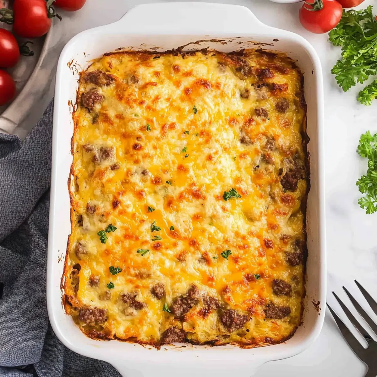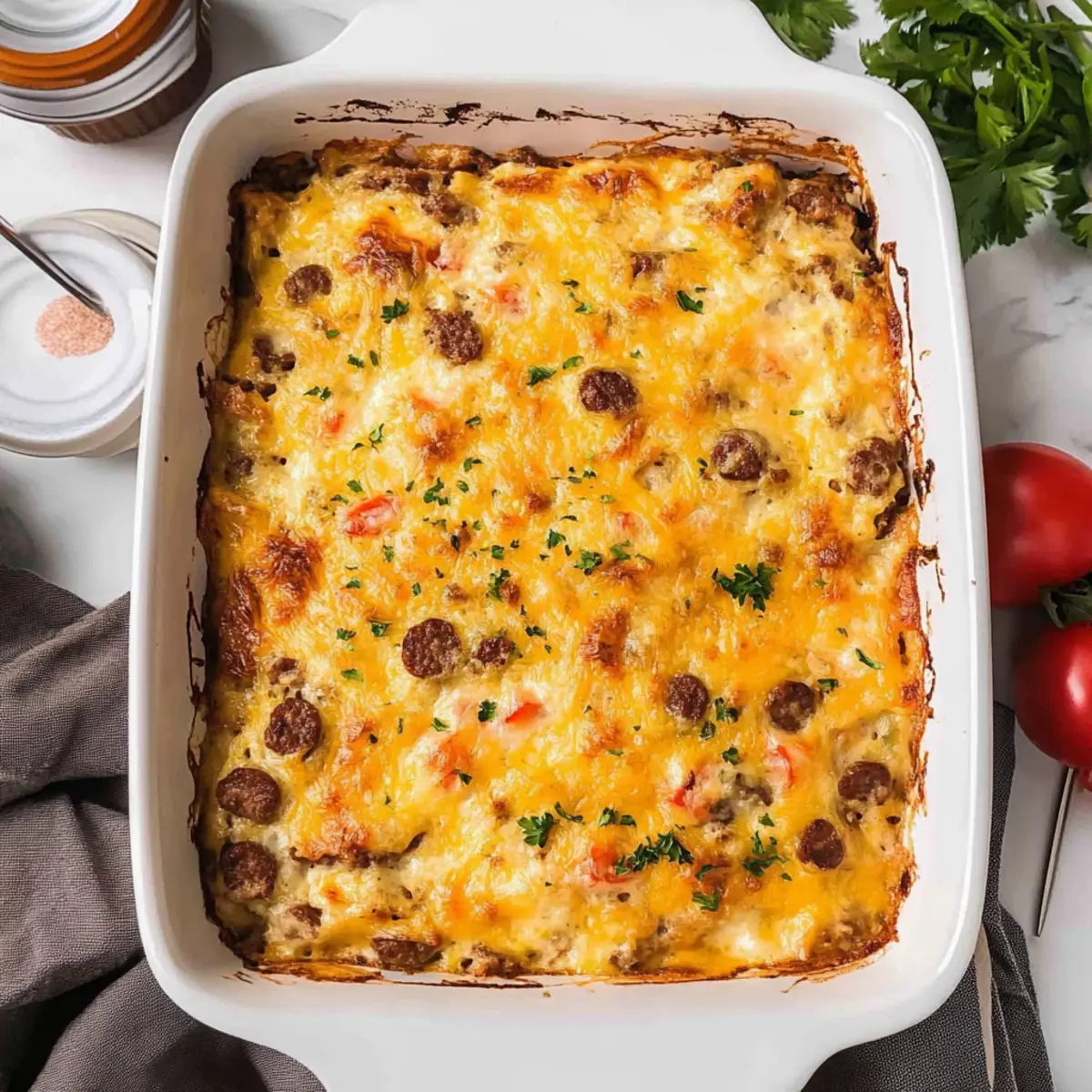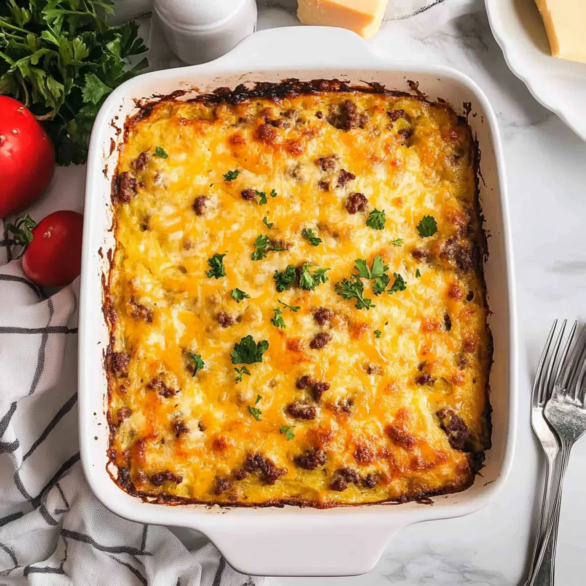 As the sun creeps through my kitchen window, I find myself in a mini crisis: breakfast is looming, but I have no time to whip up something fancy. That’s when I turn to my go-to Easy Breakfast Casserole with Sausage and Hash Browns. This dish isn’t just a time-saver; it’s the perfect blend of savory sausage, colorful peppers, and crispy hash browns—a true crowd-pleaser that transforms breakfast into a hearty feast. Another great perk? You can make it ahead of time, leaving you free to savor your morning coffee instead of scrambling around. Ready to dive into this delicious recipe and discover how easy it is to elevate your breakfast game? Let’s get cooking! Why is this Breakfast Casserole a Game-Changer? Quick Preparation: This Easy Breakfast Casserole is ideal for busy mornings, needing just a few minutes of prep before it goes into the oven. Flavor Explosion: The combination of savory sausage, fresh peppers, and melty cheese creates a taste sensation that will have everyone asking for seconds. Versatile Options: With easy variations, you can customize it to fit any dietary need—think low-carb or add extra veggies for a healthier twist. Make-Ahead Convenience: You can prepare this dish the night before and simply pop it in the oven in the morning, ensuring you start the day stress-free. Crowd-Pleaser: Whether it’s a family gathering or brunch with friends, this breakfast casserole can feed a crowd, making it a go-to for entertaining. For more delicious casserole ideas, check out my recipes for Mexican Cornbread Casserole or Comforting Low Carb Vegetarian Casserole. Breakfast Casserole Ingredients • Discover what makes this Breakfast Casserole delicious! For the Sausage Mixture Ground sausage – Provides savory flavor and protein; choose pork or turkey for a lighter option. Minced garlic – Adds depth of flavor; fresh garlic is preferred for the best taste. Onion (diced) – Contributes sweetness and texture; yellow or white onions work well. Red bell pepper (diced) – Provides color and sweetness; substitute with green bell pepper for a sharper taste. For the Base Shredded hash browns (frozen) – Serves as a hearty base for the casserole; can substitute with freshly grated potatoes, though extra prep is required. Eggs – Acts as the binding agent, creating a fluffy texture; large eggs are standard in recipes. For Seasoning and Topping Salt – Enhances overall flavor; adjust to taste based on personal preference. Pepper – Adds mild heat; freshly cracked black pepper is recommended for the best flavor. Cheddar cheese (shredded) – Adds creaminess and richness; swap with mozzarella or pepper jack for a twist. Step‑by‑Step Instructions for Breakfast Casserole Step 1: Preheat the Oven Begin by preheating your oven to 350°F (175°C). While the oven warms up, grab a 9×13 inch casserole dish and generously coat it with non-stick cooking spray. This ensures that your Easy Breakfast Casserole with Sausage and Hash Browns will slide out easily once baked, allowing for a beautiful presentation on your breakfast table. Step 2: Cook the Sausage Mixture In a large skillet over medium heat, add the ground sausage. Cook for about 5-7 minutes, stirring frequently, until the sausage is fully browned and no longer pink. Add the minced garlic, diced onion, and diced red bell pepper to the skillet, sautéing for another 2-3 minutes until the vegetables are tender. This mixture will add a savory base to your breakfast casserole. Step 3: Combine Ingredients in Casserole Dish Once your sausage mixture is ready, carefully transfer it to the prepared casserole dish. Next, sprinkle in the frozen shredded hash browns and half of the shredded cheddar cheese. Use a spatula to stir everything together, ensuring that the hash browns and sausage blend well. The colors and textures should be vibrant, setting the stage for a delightful casserole. Step 4: Whisk the Eggs In a large mixing bowl, crack the eggs and whisk them together. Add a pinch of salt and freshly cracked black pepper to enhance the flavors. Pour this whisked egg mixture evenly over the casserole, making sure it seeps into all the nooks and crannies of the sausage and hash browns. This step is crucial for keeping your breakfast casserole fluffy and cohesive. Step 5: Top with Cheese and Bake Sprinkle the remaining shredded cheddar cheese evenly over the top of your casserole. This will create a deliciously melty and golden topping. Place the casserole in the preheated oven and bake for 45 minutes, or until the eggs are fully set and a fork comes out clean. You’ll know it’s ready when the top is bubbly and lightly browned, inviting everyone to the table. Step 6: Serve and Enjoy Once baked, remove the breakfast casserole from the oven and allow it to cool for a few minutes. This will make it easier to cut and serve. Garnish with freshly chopped parsley if desired, and slice into squares to serve. Your Easy Breakfast Casserole with Sausage and Hash Browns is now ready to enjoy with family or friends, making mornings a little more special. What to Serve with Easy Breakfast Casserole with Sausage and Hash Browns Elevate your breakfast experience with delightful sides and accompaniments that accentuate the flavors of this hearty casserole. Fresh Fruit Salad: A medley of sweet and juicy fruits balances the savory richness of the casserole, adding a refreshing touch to your plate. Crispy Bacon: The smoky crunch pairs beautifully, enhancing the savory goodness while adding a satisfying crunch that contrasts the casserole’s softness. Avocado Toast: Creamy avocado spread over hearty toast complements the dish’s flavors and adds healthy fats to your meal—a nourishing choice! Spinach Salad: Toss some fresh spinach with a zingy vinaigrette for a light, peppery side that contrasts nicely with the richness of the casserole. Homemade Biscuits: Fluffy biscuits are the perfect vehicle for a smear of butter or jam, making every bite a co