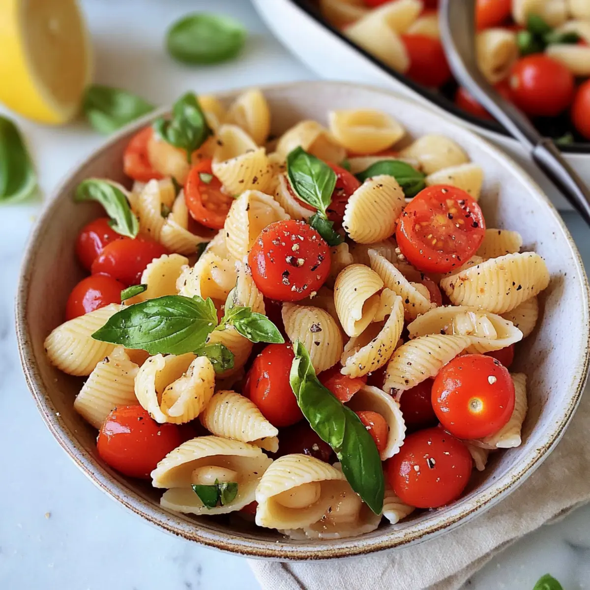 The moment I tossed together my Easy Bruschetta Pasta Salad, the kitchen filled with the bright scent of ripe cherry tomatoes and fresh basil, instantly bringing thoughts of sunlit summer picnics to mind. This delightful dish comes together in no time, making it perfect for those busy weeknights or casual get-togethers with friends. With its refreshing combination of flavors and easy prep, the Bruschetta Pasta Salad is not just a meal — it’s an experience that celebrates seasonal produce and vibrant ingredients. Plus, it’s vegan and can be served at room temperature, making it a flexible option for any occasion. Are you ready to bring a taste of summer into your home? Let’s dive into this delicious recipe! Why is Bruschetta Pasta Salad a Must-Make? Vibrant flavors: This salad bursts with the fresh taste of ripe cherry tomatoes, aromatic garlic, and zesty lemon, creating a dish that’s a celebration of summer on a plate. Quick and easy: With minimal cooking required, you’ll whip up this delightful meal in no time, perfect for those busy weeknights. Versatile options: Feel free to switch up ingredients based on what’s in season or your personal preference, whether you want to add vegan mozzarella or try a Greek twist! Perfect for gatherings: Serve chilled or at room temperature, making it an ideal dish for picnics, barbecues, or potlucks. Healthful and light: Packed with fiber and vitamins, this Bruschetta Pasta Salad is a nourishing choice that feels indulgent without the guilt. If you love easy pasta dishes, you might also enjoy my Garlic Butter Pasta for a cozy weeknight treat! Bruschetta Pasta Salad Ingredients • Grab the freshest ingredients for this vibrant dish! For the Pasta Whole Wheat Pasta Shells – These serve as a hearty base, offering texture and fiber; feel free to substitute with orecchiette or other pasta shapes. For the Topping Cherry Tomatoes – Burst with sweetness and juiciness, using a mix of colors for added visual appeal and flavor variation. Fresh Basil – Delivers a fragrant, herbaceous note; try mint for an exciting twist on this Bruschetta Pasta Salad. Garlic – A flavor enhancer that’s best when grated into a paste for even distribution; adjust based on your garlic sensitivity. For the Dressing Lemon – Adds acidity and brightness; both juice and zest work wonders in this dish. Extra Virgin Olive Oil – Serves as the rich dressing base; substitute with more lemon juice if you prefer a lighter option. Step‑by‑Step Instructions for Bruschetta Pasta Salad Step 1: Marinate the Tomatoes Begin by halving about 2 cups of colorful cherry tomatoes and placing them in a mixing bowl. Add 2 cloves of grated garlic, 3 tablespoons of extra virgin olive oil, the juice and zest of one lemon, and a pinch of sea salt. Stir well to combine, allowing the flavors to meld while letting the mixture marinate at room temperature for about 15 minutes. Step 2: Cook the Pasta In a large pot, bring water to a rolling boil and add a generous pinch of salt. Cook your 8 ounces of whole wheat pasta (shells work beautifully) according to package instructions for about 9-11 minutes until al dente. Once cooked, drain the pasta and rinse it under cold water to halt the cooking process, then set it aside to cool. Step 3: Combine Ingredients In a large mixing bowl, combine the cooled pasta with the marinated tomato mixture, including all the delicious juices. Toss the ingredients gently to ensure the pasta is well-coated with the vibrant mixture, letting each bite of the Bruschetta Pasta Salad soak up the flavors from the tomatoes and garlic. Step 4: Add Fresh Herbs and Season Tear a handful of fresh basil leaves into the bowl, allowing their fragrant aroma to fill the air. Mix them into the salad, then taste and adjust the seasoning as needed. Add extra lemon juice, olive oil, or salt to enhance the flavors, ensuring this dish is perfectly balanced to your liking. Step 5: Serve or Chill For an optimal experience, you can serve the Bruschetta Pasta Salad immediately at room temperature, or refrigerate it for about 30 minutes to chill. This resting time enhances the flavors, making it an even more delightful dish. To serve, garnish with additional basil or sprinkle red chili flakes for a little kick if desired. Step 6: Enjoy Leftovers If you have leftovers, store the Bruschetta Pasta Salad in an airtight container in the refrigerator for up to 3 days. The flavors will continue to develop, making for a wonderful meal prep option that is perfect for quick lunches or easy dinners throughout your week. Expert Tips for Bruschetta Pasta Salad Salt the Water: Make sure you add enough salt to the pasta water; it’s crucial for enhancing the flavor of the entire dish. Grate Garlic: For the best flavor distribution, grate your garlic into a paste instead of chopping. This ensures every bite is packed with garlicky goodness! Fresh Ingredients: Use the ripest cherry tomatoes and freshest basil you can find. Quality ingredients will take your Bruschetta Pasta Salad to the next level. Taste as You Go: Always taste your salad before serving. Adjust the seasoning with extra lemon juice and olive oil to suit your preference. Customize Your Salad: Don’t be afraid to experiment with seasonal produce! Adding ingredients like capers or marinated artichokes can elevate your Bruschetta Pasta Salad. Make Ahead Options These Easy Bruschetta Pasta Salad is perfect for meal prep enthusiasts! You can chop and marinate the cherry tomatoes with garlic, olive oil, lemon juice, and salt up to 24 hours in advance; just keep them in the refrigerator to maintain freshness. Additionally, cook the whole wheat pasta and store it separately in an airtight container for up to 3 days. When you’re ready to serve, simply combine the chilled pasta with the marinated tomatoes, toss in fresh basil, and adjust the seasoning. This allows you to enjoy a wonderfully flavorful meal with minimal effort on busy weeknight