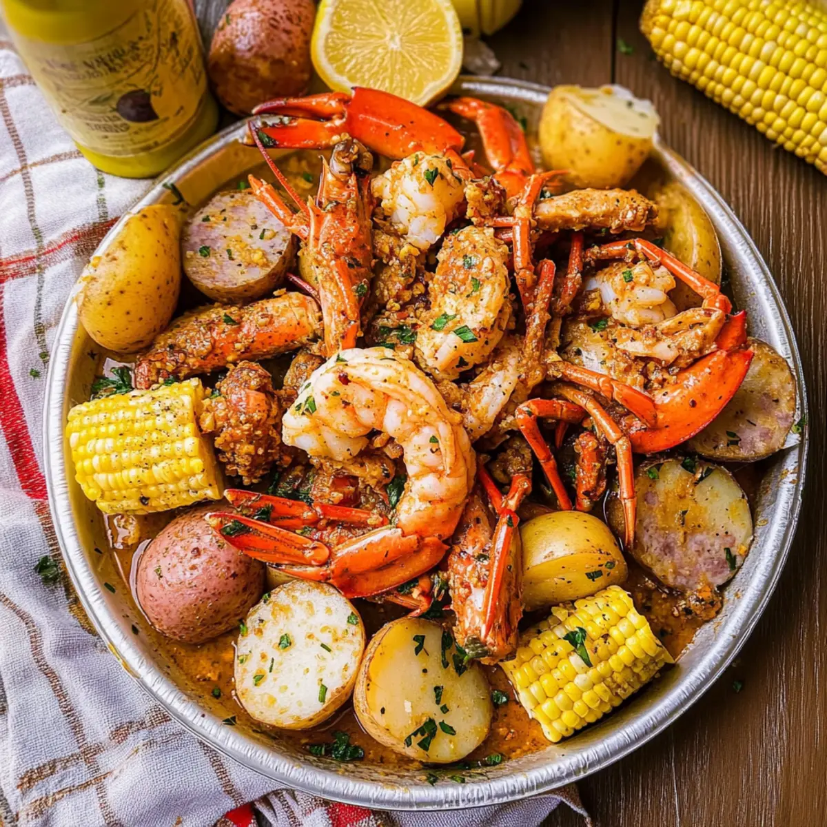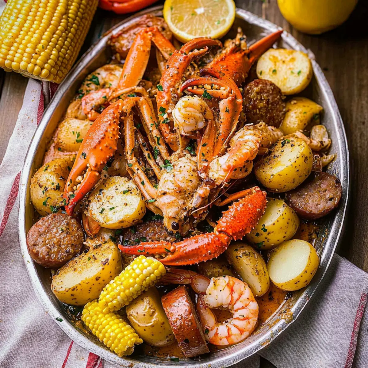 The aroma wafting through the air was nothing short of intoxicating. As I gathered my family around the table, I knew it was time to unveil my Ultimate Cajun Seafood Boil with Garlic Butter Sauce. Bursting with mouth-watering jumbo shrimp, succulent crab, and zesty andouille sausage, this dish brings together the vibrant flavors of Southern cuisine for a feast that’s as delightful to make as it is to enjoy. Perfect for summer gatherings, it’s an interactive dining experience where everyone can dive into the fun of cracking shells and savoring every morsel. Plus, with just one pot to clean up, it’s a winner for busy weeknights or weekend celebrations! Are you ready to take your seafood game to the next level? Let’s get cooking! Why is Cajun Seafood Boil a Must-Try? Flavor Explosion: This delightful dish blends succulent seafood and spice, creating a mouth-watering feast that screams summer. Customizable: You can easily swap in your favorite seafood like lobster or clams, ensuring there’s something for everyone at the table. Easy Cleanup: With everything cooked in one pot, you’ll have more time to enjoy the party and less time scrubbing pans. Crowd-Pleaser: Perfect for gatherings, this interactive boil lets your guests dig in and share, making every meal a festive occasion. Rich Sauce: The garlic butter sauce elevates the dish, wrapping each bite in a burst of flavor, reminiscent of my Garlic Butter Pasta. Prepare for smiles and satisfied taste buds with this highlight of Southern cuisine! Cajun Seafood Boil Ingredients • Here’s what you need for the ultimate flavor adventure! For the Seafood: Jumbo Shrimp – A star protein in this dish; fresh or frozen, just be sure they’re deveined. Crab (Snow Crab Clusters) – Adds a rich sweetness; pre-cooked options save you time in the kitchen. Andouille Sausage – Infuses a smoky, spicy flair; substitute with kielbasa if you prefer a milder taste. For the Vegetables: Potatoes – Hearty and filling; small red or Yukon Gold potatoes cut into quarters will cook evenly. Corn on the Cob – Brings sweetness to the mix; cut into halves or thirds for easier handling. For Flavoring: Cajun Seasoning – Essential for that authentic Southern flavor; homemade or store-bought works perfectly. Old Bay Seasoning – Adds another layer of deliciousness; feel free to swap with your favorite seafood seasoning. For the Butter Sauce: Garlic – Essential for aromatic richness; fresh minced garlic is highly recommended for the best flavor. Unsalted Butter – Creates a luscious garlic butter sauce, bringing everything together beautifully. Optional Additions: Eggs – Hard-boil them separately to add richness; serve alongside the boil for added indulgence. Beer – Enhances the broth’s flavor; choose lagers, IPAs, or pilsners, or omit if desired. Gather your ingredients and get ready for a Cajun Seafood Boil with Garlic Butter Sauce that will tantalize your taste buds and make for an unforgettable meal! Step‑by‑Step Instructions for Cajun Seafood Boil with Garlic Butter Sauce Step 1: Prepare the Broth Begin by filling a large pot with water and bringing it to a rolling boil over high heat. Once boiling, add beer, Cajun seasoning, and Old Bay seasoning, stirring well. This aromatic mixture will provide the flavorful base for your Cajun Seafood Boil, enhancing the delightful seafood flavors that will follow. Step 2: Cook Potatoes and Sausage Add your quartered potatoes and sliced andouille sausage to the boiling broth. Allow them to cook for about 10–15 minutes or until the potatoes are tender when pierced with a fork. This step will infuse the sausage’s spicy flavor into the broth while also preparing your hearty base for the seafood. Step 3: Add Corn and Shrimp Next, incorporate the corn on the cob pieces and jumbo shrimp into the pot. Continue boiling for an additional 5–7 minutes, or until the shrimp turn opaque and curl slightly. This ensures that all the seafood is perfectly cooked without being overdone, creating a succulent dish. Step 4: Make Garlic Butter Sauce While the seafood is cooking, melt unsalted butter in a separate saucepan over medium heat. Once melted, add minced garlic and sauté until fragrant, about 1-2 minutes. Stir in a pinch of Cajun seasoning to enhance the flavor profile of your garlic butter sauce, which adds richness to the entire Cajun Seafood Boil. Step 5: Combine and Serve Drain the seafood boil, then carefully pour the garlic butter sauce over the beautifully cooked seafood and vegetables. Gently toss everything together to coat each piece with the rich, flavorful sauce. Serve immediately for a delightful feast that highlights the robust flavors of the Cajun Seafood Boil with Garlic Butter Sauce, perfect for sharing around the table! What to Serve with Cajun Seafood Boil with Garlic Butter Sauce To elevate your seafood feast, consider these delightful pairings that will tantalize your taste buds and delight your guests. Crusty French Bread: Perfect for soaking up the rich garlic butter sauce, offering a satisfying contrast to the juicy seafood. Garlic Butter Rice: A fragrant side that mirrors the buttery flavors of the boil, enhancing the overall experience of this savory dish. Coleslaw: Refreshing and crunchy, this tangy slaw adds a bright note, balancing the richness of the seafood and providing a lovely texture contrast. Roasted Vegetables: Seasonal veggies like asparagus or bell peppers add sweetness and a vibrant color, making your meal more inviting. Lemon Wedges: A squeeze of fresh lemon uplifts the dish, cutting through the richness and adding a zesty brightness that complements the seafood beautifully. Fruity White Wine: Opt for a chilled Sauvignon Blanc or Pinot Grigio, as their crisp acidity will enhance the flavors of the boil delightfully. Peach Cobbler: Cap off your meal with this indulgent dessert; the sweet and warm flavors harmonize perfectly with the Cajun spices for a satisfying finis