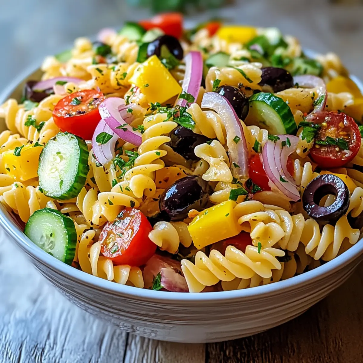 As I stood in the kitchen, a medley of vibrant colors caught my eye—crunchy vegetables, tangy olives, and creamy cheese all waiting to come together in a delightful masterpiece. That’s how my California Pasta Salad was born! This dish is not just a feast for the eyes; it’s incredibly versatile and can easily cater to various dietary preferences, whether you’re vegan or gluten-free. Picture whipping this up in no time, making it perfect for summer gatherings or as a make-ahead meal for busy weekdays. With its bold flavors and fresh ingredients, it’s the ultimate crowd-pleaser. Ready to impress your taste buds? Let’s dive into this cheerful recipe that brings a taste of the sunny West Coast right to your table! Why will you adore this pasta salad? Vibrant Flavors: This California Pasta Salad bursts with freshness from crunchy veggies and zesty dressing, making each bite a delightful experience. Flexible Ingredients: Adapt to your preferences! Easily modify to be vegan or gluten-free, ensuring everyone can enjoy it. Quick and Simple: With straightforward instructions, you’ll have a refreshing dish ready in no time—perfect for those busy summer days! Make-Ahead Magic: Prepare this salad in advance for parties or meal prep; it tastes even better after chilling, allowing flavors to meld beautifully. Crowd-Pleasing Appeal: Whether for a potluck or a family dinner, this salad is a guaranteed hit—serve it alongside your favorite dishes like Garlic Butter Pasta for a complete meal! California Pasta Salad Ingredients For the Salad • Rotini Pasta (12 oz) – Provides the base and structure for the salad; substitute with your favorite pasta shape or use gluten-free pasta. • Cherry Tomatoes (1 cup, halved) – Adds sweetness and vibrant color; use grape tomatoes or heirloom varieties for a different flavor profile. • Cucumber (1 cup, diced) – Offers a refreshing crunch; substitute with zucchini for a similar texture. • Red Onion (1/2 cup, finely chopped) – Contributes sharpness and depth; green onions or scallions can be used for a milder taste. • Black Olives (1/2 cup, sliced) – Enhances flavor with brininess; substitute with green olives for a different twist. • Bell Pepper (1/2 cup, chopped) – Provides a sweet, crunchy texture; any color of bell pepper can be used or replaced with roasted vegetables. • Sharp Cheddar Cheese (1/2 cup, cubed) – Adds creaminess and richness; use dairy-free cheese for a vegan option. • Italian Salad Dressing (1/2 cup) – Binds the flavors together with zest; homemade dressing can be substituted for tailored flavor. • Fresh Parsley (1 tablespoon, chopped) – Adds freshness and color; substitute with basil or cilantro for a different herbaceous note. • Salt and Pepper to taste – Enhances overall flavor. Step‑by‑Step Instructions for California Pasta Salad Step 1: Cook the Pasta Bring a large pot of salted water to a rolling boil over high heat. Add the 12 oz of rotini pasta, stirring occasionally to prevent sticking. Cook according to package instructions until the pasta is al dente, usually about 8-10 minutes. Once done, drain the pasta in a colander and rinse it under cold water to stop the cooking process and cool the pasta down. Step 2: Prepare the Vegetables While the pasta cools, chop your fresh vegetables. In a large mixing bowl, combine 1 cup of halved cherry tomatoes, 1 cup of diced cucumber, ½ cup of finely chopped red onion, ½ cup of sliced black olives, and ½ cup of chopped bell pepper. The vibrant colors will bring the California Pasta Salad to life, so mix them all together for an inviting look. Step 3: Combine Ingredients Once the pasta has cooled, add it to the bowl of vegetables. Gently fold in ½ cup of cubed sharp cheddar cheese to introduce creamy richness. This is where the California Pasta Salad comes together, so be careful not to mash the ingredients as you combine them. Step 4: Add the Dressing Pour ½ cup of Italian salad dressing over the pasta and vegetable mixture. Use a spatula to gently toss everything together until all the ingredients are evenly coated with the dressing. The zesty flavor will enhance the salad’s overall freshness, setting the stage for a delicious meal. Step 5: Season and Garnish Sprinkle salt and pepper to taste over the mixed salad. For an extra touch of freshness, add 1 tablespoon of chopped fresh parsley. This aromatic herb will not only add flavor but also a pop of color, making your California Pasta Salad visually appealing. Step 6: Chill Before Serving Cover the mixing bowl with plastic wrap or transfer the salad to an airtight container. Refrigerate for at least 30 minutes to allow the flavors to meld beautifully. Chilling the salad enhances the overall taste, making it even more enjoyable when served at your next gathering. Storage Tips for California Pasta Salad Fridge: Store the California Pasta Salad in an airtight container in the fridge for up to 3 days. This ensures maximum freshness and flavor retention. Make-Ahead: Feel free to prepare this salad a day in advance! The flavors meld beautifully when chilled, making it ideal for gatherings or busy weeknights. Freezer: It’s best to avoid freezing this salad due to the fresh vegetables and cheese, which can change in texture once thawed. Reheating: If you have leftovers, enjoy them cold straight from the fridge or let them come to room temperature. For a warm twist, gently microwave the pasta (without the veggies) just until heated through. What to Serve with California Pasta Salad? Looking to create the perfect meal experience with your delightful California Pasta Salad? Consider these flavorful pairings that enhance the fresh, vibrant ingredients of this dish. Garlic Bread: The warm, buttery garlic bread is a classic that complements the salad’s refreshing crunch and adds a cozy touch. Grilled Chicken: Juicy grilled chicken adds a hearty protein element that meshes well with the lightness of the
