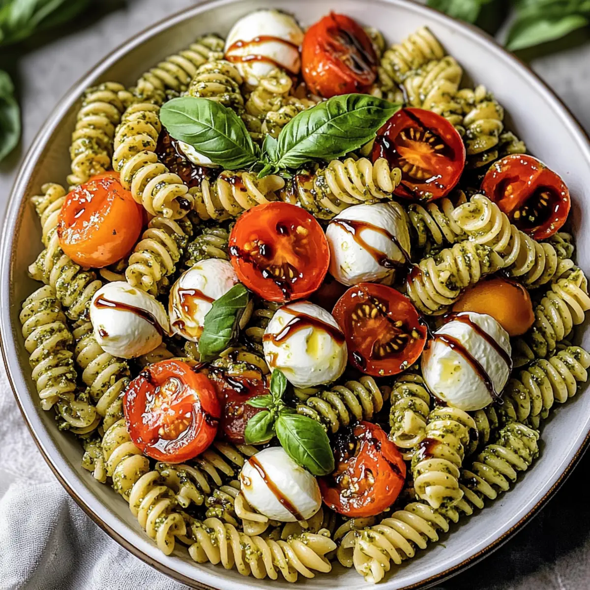 The kitchen was filled with the warm, inviting aroma of fresh basil, igniting a memory of summer picnics and garden parties. This Fresh Caprese Pesto Pasta Salad captures that essence beautifully, intertwining the vibrant flavors of creamy mozzarella, sweet cherry tomatoes, and the addictive zing of basil pesto. Not only is this dish a cinch to throw together, making it perfect for busy weeknight dinners or casual get-togethers, but it’s also highly customizable to fit your taste. Whether you want to add a protein boost or swap out ingredients for a unique twist, the possibilities are endless. Plus, it’s make-ahead friendly, allowing the flavors to meld together into a delightful dish waiting in your fridge. So, are you ready to elevate your summer meals with this colorful pasta salad? Let’s dive in! Why is Caprese Pesto Pasta Salad a Must-Try? Vibrant colors: This salad bursts with fresh, colorful ingredients that make it visually stunning and inviting. Quick and easy: With just a few simple steps, you can have a delicious meal ready in no time—perfect for those busy summer days. Customizable: Feel free to mix and match ingredients based on your preferences; swap mozzarella for burrata or add grilled chicken for extra protein. Make-ahead friendly: Prepare it in advance and watch as the flavors deepen, making it a great option for meal prep or picnics. Crowd-pleaser: This Caprese Pesto Pasta Salad is sure to impress friends and family at any gathering, much like the equally delightful Crab Salad Refreshing or the hearty Sloppy Joe Pasta. Caprese Pesto Pasta Salad Ingredients For the Salad Rotini Pasta – The base of the salad that cooks quickly and holds the creamy pesto well; feel free to substitute with gluten-free pasta like chickpea or quinoa for a gluten-free option. Cherry Tomatoes – These sweet and juicy gems add freshness; any small tomato variety works beautifully if you can’t find cherries. Mozzarella Pearls – They bring creaminess and richness to the salad; swapping them for burrata or torn buffalo mozzarella provides an even more indulgent experience. Basil Pesto – This is the star of the dish, offering an intense herbal flavor; use homemade or store-bought, and for nut-free needs, opt for a nut-free pesto. Extra Virgin Olive Oil – Enhances the flavors and adds richness; investing in a good quality oil elevates the health benefits and flavor profile. Balsamic Glaze – Adds a delightful tangy sweetness; if unavailable, balsamic vinegar works just as well. Fresh Basil Leaves – Use these for garnish and a burst of fresh flavor; you can swap with any fresh herbs, like parsley or arugula, for a twist. Salt & Pepper – Essential for enhancing flavors; adjust according to your preference for the perfect seasoning. For Serving Additional Basil or Arugula – A sprinkle on top adds a pop of color and flavor just before serving. Toasted Nuts – Options like pine nuts or sliced almonds introduce a crunchy texture, enhancing the dish even further. Dive into this Caprese Pesto Pasta Salad and enjoy a medley of flavors that embody the joy of summer dining! Step‑by‑Step Instructions for Caprese Pesto Pasta Salad Step 1: Cook Pasta Begin by bringing a large pot of salted water to a boil over high heat. Add the rotini pasta and cook according to package instructions, usually about 9-11 minutes, until al dente. Once cooked, drain the pasta and rinse it under cold water to stop the cooking process, allowing it to cool while you prepare the remaining ingredients. Step 2: Combine Ingredients In a large mixing bowl, combine the cooled rotini pasta, halved cherry tomatoes, and mozzarella pearls. Gently fold the ingredients together with a spatula or wooden spoon, ensuring even distribution of colors and textures. This Caprese Pesto Pasta Salad base is the heart of the dish, so take your time to mix thoroughly. Step 3: Add Dressing Pour the fragrant basil pesto and a drizzle of extra virgin olive oil over the pasta mixture. Carefully toss the salad using your spatula to coat all the ingredients evenly. The pesto should cling to the pasta and mozzarella, infusing the salad with its vibrant flavor. Step 4: Season Taste your Caprese Pesto Pasta Salad and season with salt and freshly cracked pepper according to your preference. These essential seasonings enhance the flavors of the fresh ingredients, so taste as you go, adjusting until the salad perfectly suits your palate. Step 5: Garnish & Chill Transfer the salad to a beautiful serving dish, then drizzle with balsamic glaze for a tangy sweetness. Sprinkle fresh basil leaves on top for that burst of flavor and color. Cover the dish with plastic wrap and refrigerate for 15–30 minutes to let the flavors meld, creating an even more delicious dish to serve. Caprese Pesto Pasta Salad Variations Feel free to unleash your creativity and customize your dish with these delightful twists! Gluten-Free: Substitute rotini with gluten-free pasta like chickpea or quinoa to make this meal accessible for gluten sensitivities. Protein-Packed: Add grilled chicken or shrimp for an extra protein boost, creating a heartier salad that still feels light and fresh. Each bite will be a satisfying experience! Veggie-Loaded: Incorporate additional veggies like arugula, spinach, or bell peppers for added nutrients and a pop of color. This enhances both texture and taste, making each forkful delightfully crunchy. Nutty Crunch: Sprinkle on toasted pine nuts or sliced almonds for a deliciously crunchy texture that contrasts beautifully with the creamy mozzarella. The nutty flavor will elevate your salad to new heights! Herb Swaps: Use fresh herbs like parsley or arugula in place of basil for a unique twist on the flavor profile. This can give the salad a fresh, new identity, perfect for adventurous eaters. Creamy Upgrade: Swap mozzarella pearls for rich burrata or torn buffalo mozzarella to indulge in a creamier experience that’s sophisticated yet comf