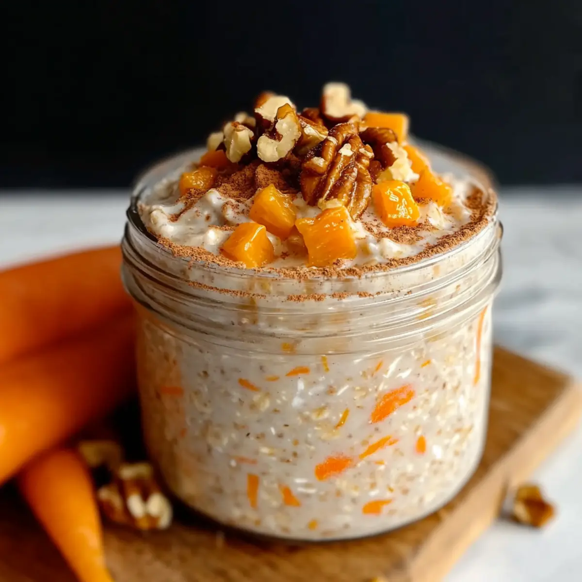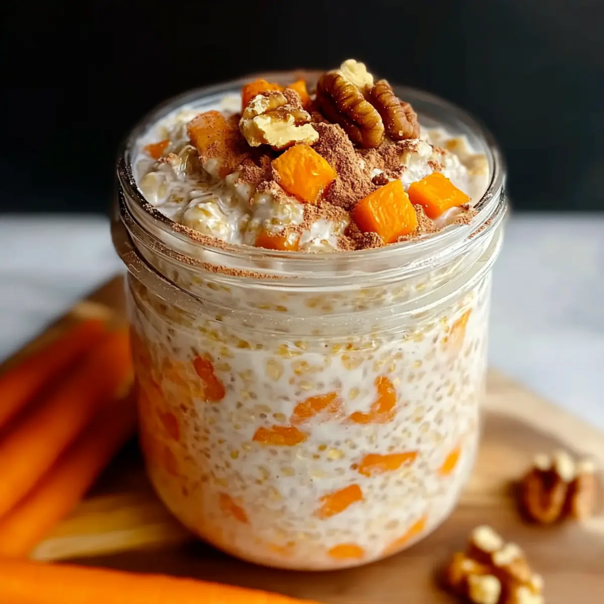 As I sift through memories of cozy family gatherings, one sweet indulgence always stands out: carrot cake. It captures that perfect balance of warmth and nostalgia, and now, I’ve transformed that cherished flavor into a breakfast that’s just as enchanting. These Carrot Cake Overnight Oats deliver the comfort of dessert in a healthy, quick-prep meal that you can whip up in just 10 minutes. Not only do they simplify your morning routine, but they also pack a nutritious punch that’s sure to keep you energized throughout your day. Imagine waking up to a creamy bowl of spiced oats dotted with the sweetness of carrots and pineapple! Aren’t you just a bit curious about how to make this delightful breakfast? Let’s dive in! Why Are Carrot Cake Overnight Oats Perfect? Deliciously Nostalgic: These oats capture the flavors of classic carrot cake, bringing a delightful twist to your morning routine. Quick Preparation: With just 10 minutes of prep, you can enjoy a satisfying breakfast that’s ready when you wake. Nutritious Ingredients: Packed with healthy ingredients like carrots, chia seeds, and your choice of milk, they’re nutritious and will fuel your day. Versatile & Customizable: Substitute ingredients easily to fit your dietary needs. Substitute pecans for walnuts or try a dairy-free option by using almond milk to discover your perfect blend. Meal Prep Friendly: Make a batch at the start of the week, and you’ll have breakfast ready to go, just like with Smashed Carrots Bites for easy and healthy snacking! With every bite, you’ll enjoy the comfort of dessert without the guilt, keeping mornings exciting and flavorful! Carrot Cake Overnight Oats Ingredients For the Oats • Rolled Oats – Essential for creating that creamy base, but you can swap for quick oats if you prefer a softer texture. • Chia Seeds – These little powerhouses thicken the oats and add fiber; ground flaxseeds work well as a substitute. For the Creaminess • Milk – Choose any variety you love for creaminess; almond or coconut milk are fantastic dairy-free options! • Greek Yogurt – Adds creaminess and protein; opt for dairy-free yogurt if you’re avoiding lactose. For the Flavor • Carrot – Freshly grated carrots bring in the signature carrot cake taste; pre-grated carrots can save time! • Pineapple – Adds sweetness; if you’re not a fan, you can use applesauce or simply skip it. • Maple Syrup or Honey – A natural sweetener to enhance flavors; agave nectar is a great alternative too. • Ground Cinnamon – Provides a warm spice kick, reminiscent of cozy carrot cake. • Ground Nutmeg – Adds depth to the flavor; just a dash will do wonders! For Toppings • Chopped Walnuts or Pecans – For a delightful crunch and added texture; feel free to mix and match based on your preference! • Raisins – For a touch of sweetness, or use fresh grated carrot for a pop of color and taste on top! These Carrot Cake Overnight Oats not only make your mornings easier but also fill them with delicious, wholesome goodness that tastes like dessert! Step‑by‑Step Instructions for Carrot Cake Overnight Oats Step 1: Mix Dry Ingredients In a mixing bowl or mason jar, combine 1 cup of rolled oats, 2 tablespoons of chia seeds, 1 teaspoon of ground cinnamon, ½ teaspoon of ground nutmeg, and a pinch of salt. Stir them together until well blended, allowing the spices to create a fragrant base for your Carrot Cake Overnight Oats. This step takes just a couple of minutes and sets the foundation for your delightful breakfast. Step 2: Incorporate Wet Ingredients Add to the dry mixture 1 cup of your favorite milk, ½ cup of Greek yogurt, and 2 tablespoons of maple syrup or honey for sweetness. Pour in a splash of vanilla extract for depth of flavor and mix well until everything is evenly combined. The mixture should be smooth, creamy, and inviting, making the anticipation of the next step even more exciting. Step 3: Fold in Carrots and Pineapple Gently fold in 1 cup of finely grated carrots and ½ cup of crushed pineapple, if using, ensuring that they are distributed evenly throughout the mixture. This step not only adds moisture but also infuses your Carrot Cake Overnight Oats with that signature sweetness and flavor. It’s the heart of the recipe that truly brings the essence of carrot cake to your morning. Step 4: Prepare for Refrigeration Cover your bowl or jar tightly with a lid or plastic wrap to seal in all the deliciousness. Place it in the refrigerator and let it chill for at least 6 hours, or ideally overnight. During this time, the oats will absorb the liquid, thicken, and develop a creamy texture that mimics the richness of a dessert, ready to delight your taste buds in the morning. Step 5: Final Touches in the Morning When you’re ready to enjoy your Carrot Cake Overnight Oats, remove them from the fridge and give the mixture a good stir. If it seems too thick for your liking, simply add a splash more milk until you achieve your desired consistency. This is the perfect opportunity to adjust the flavors to your preference. Step 6: Serve and Garnish Spoon the creamy oats into bowls or enjoy them directly from the jar. Top your Carrot Cake Overnight Oats with a handful of chopped walnuts or pecans, a sprinkle of raisins, or a touch of freshly grated carrot for added texture and flavor. This final flourish not only enhances the appeal but also elevates the overall experience of your delightful breakfast. Make Ahead Options These Carrot Cake Overnight Oats are a fantastic solution for busy mornings! You can mix all the ingredients together and refrigerate them up to 24 hours in advance, allowing the flavors to meld beautifully. Simply prepare the oats as per the instructions, cover them tightly, and store in the refrigerator. To maintain optimal quality, avoid adding toppings like nuts or fruits until you are ready to serve. When morning arrives, give your oats a quick stir and adjust the consistency with