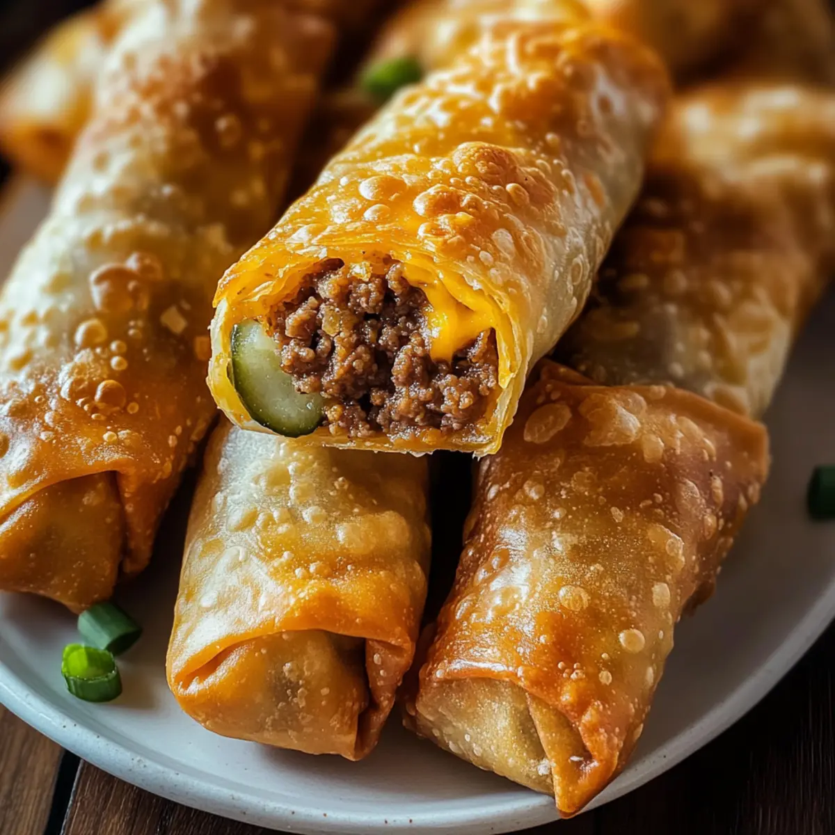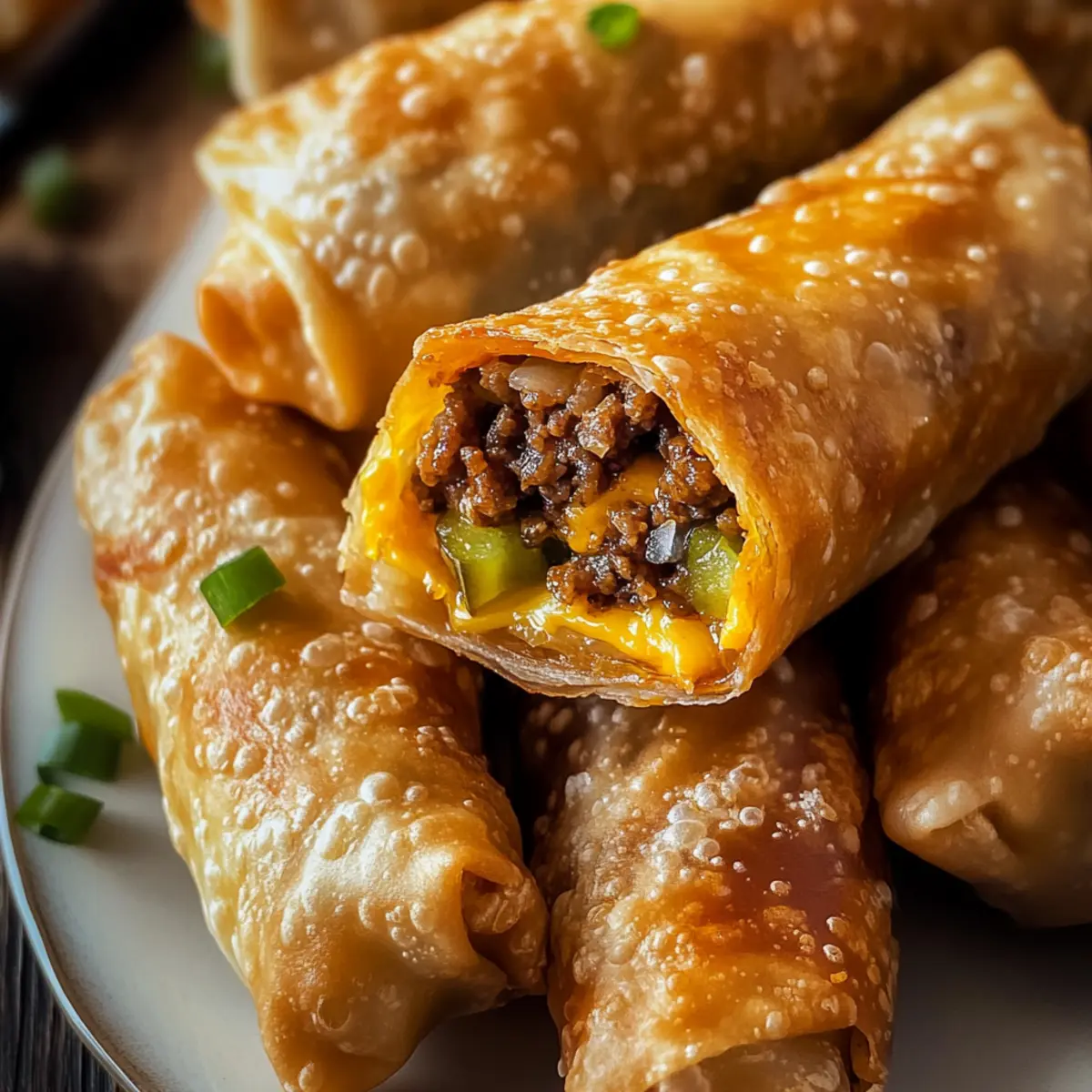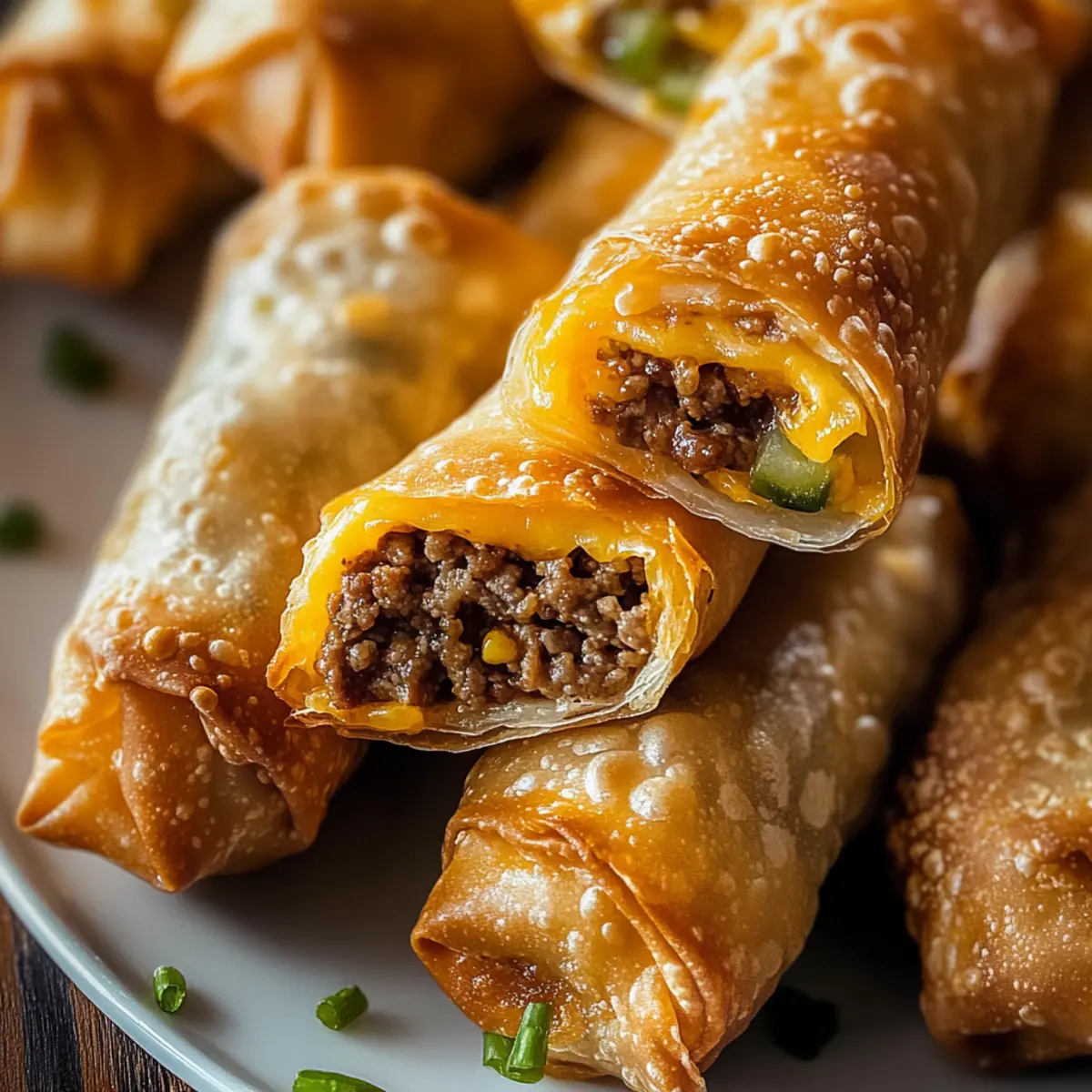 As I stood in my kitchen, the comforting aroma of sizzling ground beef wafted through the air, and I couldn’t help but feel excitement bubbling inside me. That’s when the idea struck—what if I combined the beloved flavors of a classic cheeseburger with the delightful crunch of egg rolls? Enter the world of Crispy Cheeseburger Egg Rolls. This recipe is not only easy to make, taking just 30 minutes from start to finish, but it’s also completely customizable. Whether you want to sneak in some crispy bacon or fresh tomatoes, these savory bites guarantee to be a crowd-pleaser at your next gathering. Imagine serving these at a party, delighting your friends with a fun twist on a favorite comfort food. Are you ready to impress your guests with the ultimate finger food? Let’s start rolling! Why are Cheeseburger Egg Rolls a Must-Try? Crispy exterior: Each roll is enveloped in a perfectly golden, crunchy shell that begs for a dip! Flavor explosion: The combination of seasoned beef, gooey cheese, and tangy pickles allows every bite to deliver a burst of classic cheeseburger goodness. Customizable delight: Don’t hesitate to mix and match—add bacon, tomatoes, or even spicy jalapeños to tailor the flavors to your liking or mimic culinary favorites like Cheeseburger Twice Baked. Quick preparation: Ready in just 30 minutes, these egg rolls fit seamlessly into your busy lifestyle—making them perfect for unexpected guests or a fun game night! Crowd-pleaser: Serve these at your next gathering and watch them vanish in minutes—everyone will be clamoring for the recipe! Get ready to take your appetizers to the next level! Cheeseburger Egg Rolls Ingredients For the Filling • Ground Beef – the star of the show, use lean beef to keep it flavorful but not greasy. • Shredded Cheese – adds that melty richness; cheddar or American are perfect choices. • Tangy Pickles – bring a zesty kick that complements the beef; use relish as a tasty alternative. • Seasonings (onion powder, garlic salt) – these enhance the overall flavor; adjust according to your taste. For the Wrappers • Egg Roll Wrappers – provide that desired crispy exterior; make sure they’re thawed if frozen. For Dipping • Dipping Sauce (ketchup, mustard) – definitely recommended for that extra savory touch; mix and match to suit your palate. These Cheeseburger Egg Rolls are not only a treat to make but promise a delightful, savory snacking experience! Step‑by‑Step Instructions for Cheeseburger Egg Rolls Step 1: Prepare the Beef Mixture In a large skillet over medium heat, add 1 pound of lean ground beef and cook until browned, about 5-7 minutes. Drain any excess fat, then stir in your choice of 1 cup shredded cheese and 1/2 cup diced pickles. Season with onion powder and garlic salt, ensuring everything is well combined. Set this savory meat filling aside while you prepare the egg rolls. Step 2: Assemble the Egg Rolls On a clean work surface, lay out one egg roll wrapper with a corner facing you. Place about 2 tablespoons of the cheeseburger filling in the center, making sure not to overfill. Fold the bottom corner up over the filling, then fold in the sides and roll tightly to seal the egg roll. Use a little water on the edges to help them stick, ensuring no filling escapes while frying. Step 3: Heat the Oil In a deep pan or fryer, pour in at least 2 inches of vegetable oil and heat it to 350°F (175°C). This level of heat is crucial for achieving the perfect crispy exterior for your Cheeseburger Egg Rolls. You can test if the oil is ready by dropping in a small piece of dough; it should sizzle immediately and float. Step 4: Fry the Egg Rolls Carefully add the egg rolls in batches, frying for about 3-5 minutes per side until they turn golden brown and crispy. Make sure not to overcrowd the pan – this ensures even cooking and a perfect crunch. Use a slotted spoon to flip them halfway through for even browning and texture. Step 5: Drain and Serve Once the egg rolls are golden brown, remove them from the oil and place them on a plate lined with paper towels to absorb excess grease. Allow them to cool slightly, then serve hot with your favorite dipping sauces like ketchup or mustard. These Cheeseburger Egg Rolls are now ready to delight your guests! Make Ahead Options These Cheeseburger Egg Rolls are a fantastic choice for meal prep, allowing you to whip up a quick and satisfying snack any day of the week! You can prepare the beef filling up to 24 hours in advance by cooking and combining the ground beef, cheese, pickles, and seasonings, then storing it in an airtight container in the refrigerator. Additionally, you can assemble the egg rolls and keep them wrapped in plastic wrap in the fridge for up to 3 days. To maintain their crispiness, refrigerate them separated by parchment paper to avoid sogginess. When you’re ready to enjoy, simply fry them in hot oil as directed, and you’ll have delicious, homemade Cheeseburger Egg Rolls that taste just as fresh as if you made them on the spot! What to Serve with Crispy Cheeseburger Egg Rolls Elevate your gathering with delightful pairings that complement the mouthwatering flavor of cheeseburger egg rolls. Crispy French Fries: Their golden crunch is a classic companion, perfect for dipping alongside the egg rolls. Fresh Garden Salad: A light salad with mixed greens and a tangy vinaigrette refreshes the palate and adds a crisp contrast. Creamy Coleslaw: The creamy, slightly sweet crunch of coleslaw balances the savory richness, bringing a refreshing twist to your meal. Combining textures from creamy to crunchy, this pairing enriches the overall dining experience. Tangy Pickle Chips: Serve a side of pickle chips to echo the flavors integrated in the egg rolls, enhancing that cheeseburger essence. Mini Corn Dogs: These fun finger foods provide a nostalgic touch while appealing to all ages, making them a hit at gatherings. Beer or Soda: A chilled lager or your favorit
