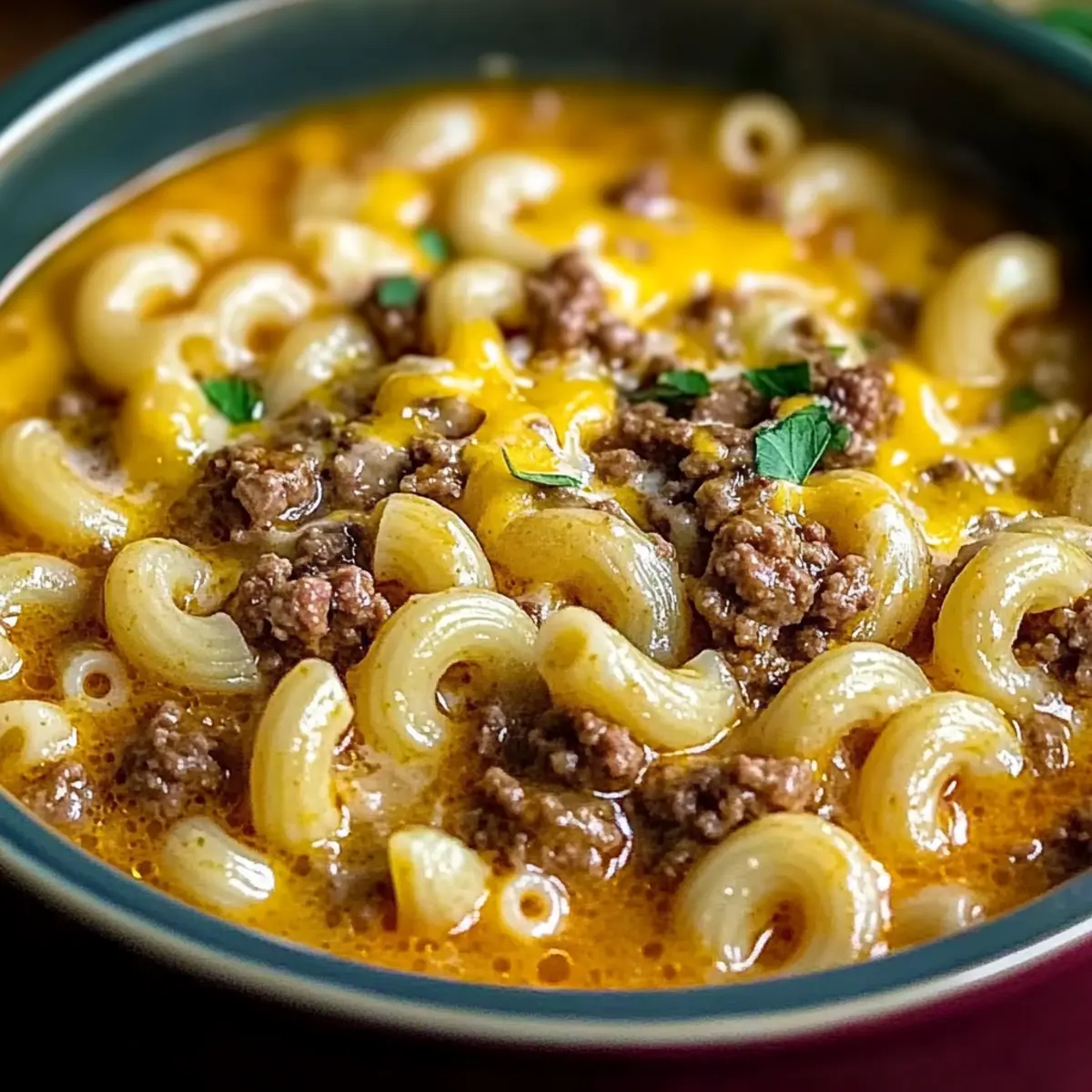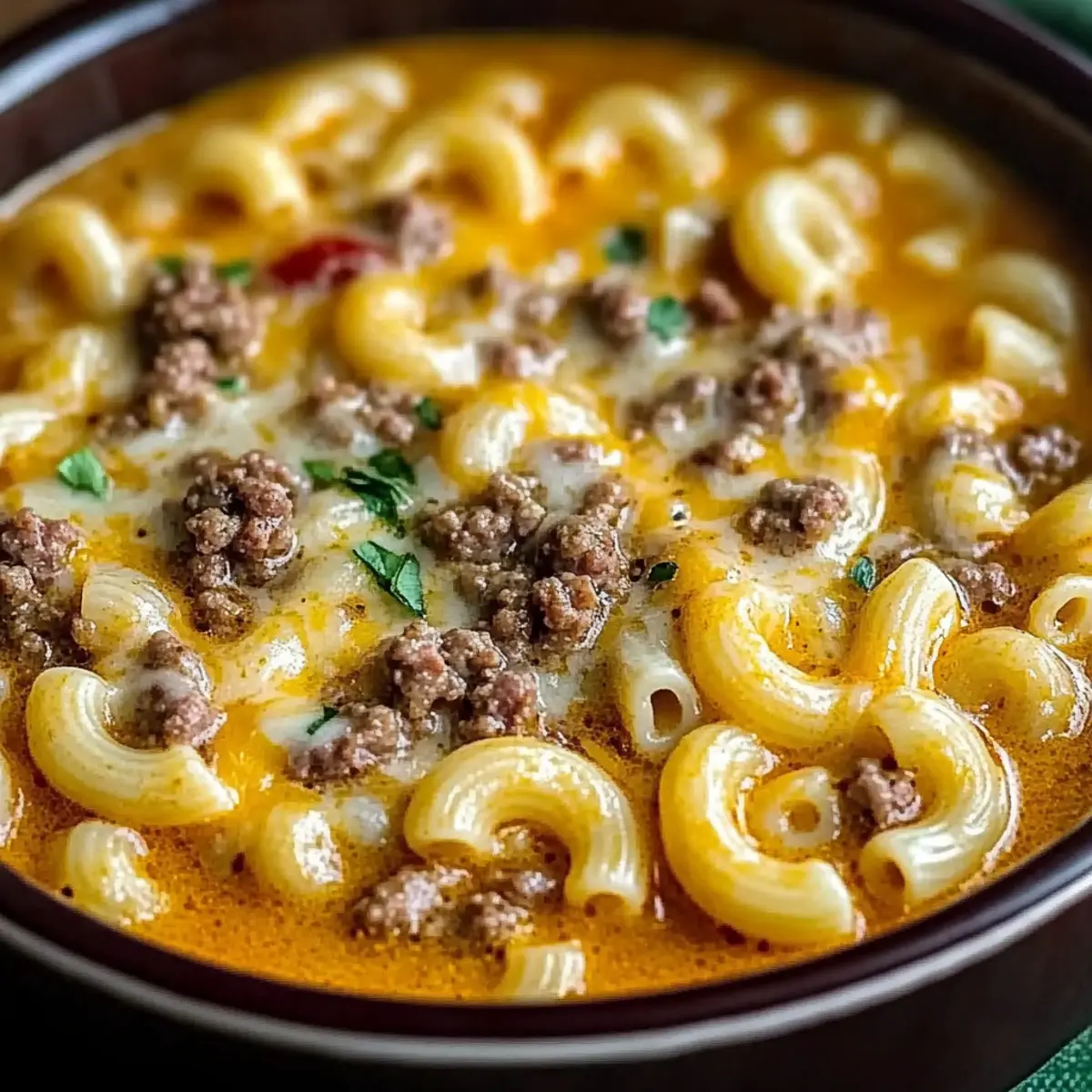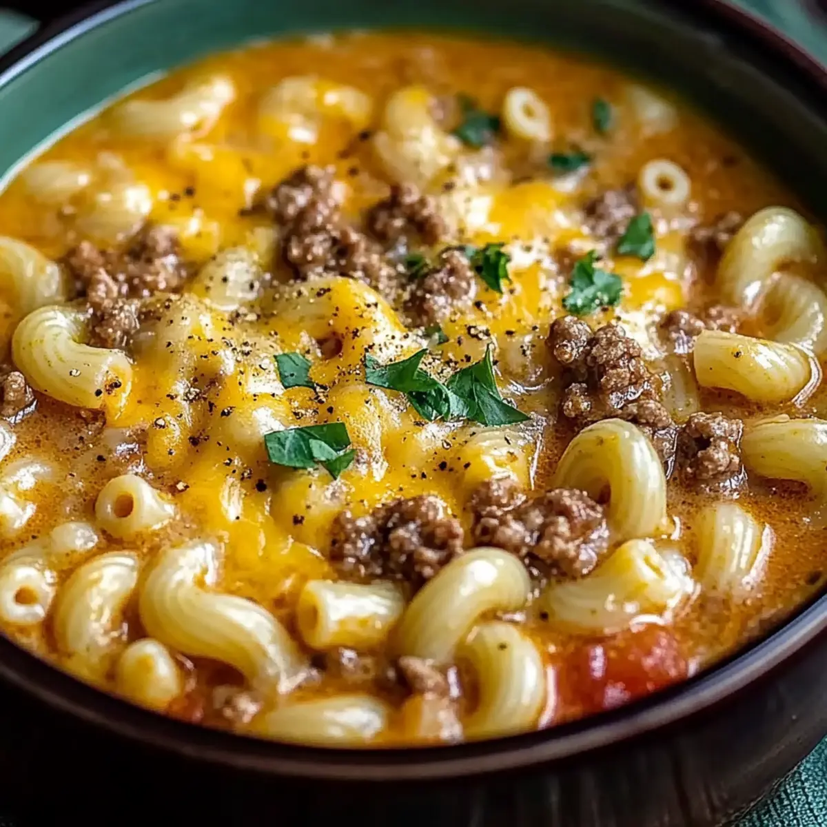 The aroma of simmering beef and melting cheese wafts through the kitchen, instantly transporting me back to those carefree family dinners. This One-Pot Cheeseburger Macaroni Soup captures the essence of comforting childhood meals while being surprisingly effortless to whip up on a busy weeknight. Not only is this dish perfect for satisfying the whole family, but it also requires minimal cleanup—a true gift for any home chef! The creamy broth envelops tender macaroni, savory ground beef, and a richness that will have you reaching for seconds. Ready to dive into a bowl of nostalgia? Let’s make this heartwarming recipe together! Why is this soup a must-try? Simplicity at its finest: This One-Pot Cheeseburger Macaroni Soup requires minimal effort and cleanup, making it perfect for busy nights. Rich, Creamy Flavor: The combination of melted cheddar and savory beef creates a luxurious taste that will please everyone at the dinner table. Family-Friendly: It’s a dish that both kids and adults adore, ensuring happy bellies all around! Versatile: Easily swap in ground turkey or even add crispy bacon bits for a delicious twist. If you want to explore more creative takes, try a Turkey Vegetable Soup or Colcannon Soup Flavorful that suits your family’s taste. Quick and Easy: Whip this up in less than 30 minutes, leaving you time to relax after dinner. Ultimate Comfort: With velvety texture and nostalgic flavors, this soup perfectly blends beloved comfort foods into one delicious bowl! Cheeseburger Macaroni Soup Ingredients For the Soup Ground Beef – Adds heartiness and protein to the soup; can be replaced with ground turkey, chicken, or plant-based alternatives for different tastes. Elbow Macaroni – Serves as the pasta base, holding onto the creamy broth; short pasta shapes like shells or rotini are great substitutes if needed. Shredded Cheddar Cheese – Provides a rich and creamy texture; freshly grated cheese melts better than pre-packaged options. Beef Broth – The foundation of the soup, contributing depth of flavor and making each bite delightful. Heavy Cream – Enhances the creaminess and richness, essential for that smooth, comforting texture. Onion (diced) – Adds a touch of flavor and sweetness; yellow or white onions work best. Garlic (minced) – A fragrant aroma that elevates the overall taste; fresh garlic gives the best flavor. Olive Oil – Used for sautéing the onion and garlic, adding a healthy fat to the mix. For Garnish (Optional) Fresh Herbs – Such as parsley or chives; a sprinkle adds color and freshness to your bowl. Crispy Bacon Bits – For a flavorful crunch that enhances the cheeseburger experience. Dill Pickle Spears – A fun twist that complements the cheeseburger flavors in the soup. This Cheeseburger Macaroni Soup is sure to be a hit, snugging up to your childhood memories while satisfying your comfort food cravings! Step‑by‑Step Instructions for Cheeseburger Macaroni Soup Step 1: Sauté Aromatics Heat 1 tablespoon of olive oil in a large pot over medium-high heat. Once the oil is shimmering, add in the diced onion. Sauté for about 3-4 minutes until the onion turns translucent and fragrant. Then, stir in the minced garlic and cook for an additional minute until it’s aromatic, taking care not to let it brown. Step 2: Cook Ground Beef Add the ground beef to the pot, breaking it up with a wooden spoon. Cook for 6-8 minutes, stirring occasionally, until the meat is browned and fully cooked through. If necessary, drain any excess fat from the pot to keep the dish light. At this point, you’re enhancing the rich base for the Cheeseburger Macaroni Soup. Step 3: Add Broth and Macaroni Carefully pour in 4 cups of beef broth, making sure to scrape any browned bits from the bottom of the pot for added flavor. Bring the mixture to a rolling boil over high heat. Once boiling, stir in 2 cups of elbow macaroni. Cook according to package instructions, typically about 7-9 minutes, until the pasta is al dente, stirring occasionally. Step 4: Stir in Cream and Simmer Reduce the heat to low and gently stir in 1 cup of heavy cream. Allow the soup to simmer for 2-3 minutes, letting the flavors meld together beautifully while creating a velvety texture. Keep an eye on it to ensure it doesn’t boil, as you want the cream to maintain its rich consistency. Step 5: Melt the Cheese Gradually incorporate 2 cups of shredded cheddar cheese into the soup, stirring continuously. Keep the heat low to ensure the cheese melts evenly and smoothly without clumping. This step is crucial for achieving the creamy goodness characteristic of your Cheeseburger Macaroni Soup. Step 6: Season and Serve Taste your soup and season generously with salt and pepper to enhance the flavors, adjusting to your preference. Once everything is well combined and creamy, ladle the soup into bowls. For a delightful finishing touch, garnish with fresh herbs or crispy bacon bits, if desired, before serving hot to your eagerly awaiting family! Expert Tips for Cheeseburger Macaroni Soup Cheese Gradation: Gradually add shredded cheddar while stirring on low heat; this prevents clumping or curdling and ensures creamy consistency in your Cheeseburger Macaroni Soup. Thickness Control: If you prefer a thicker soup, simmer uncovered for longer or mix cornstarch with milk and stir it in for additional body. Proper Storing: Dairy-based soups don’t freeze well, so store leftovers in an airtight container and consume within 2-3 days for the best texture and flavor. Flavor Boost: Experiment with ingredients like diced tomatoes or flavored broth to enhance the depth of taste, adding a personal twist to your Cheeseburger Macaroni Soup. Browning the Beef: Ensure you thoroughly brown the ground beef for a rich flavor base; this step is crucial in making your soup truly mouthwatering. Cheeseburger Macaroni Soup Variations Feel free to customize your bowl of warmth and joy with these delightful twists that elevate the flav