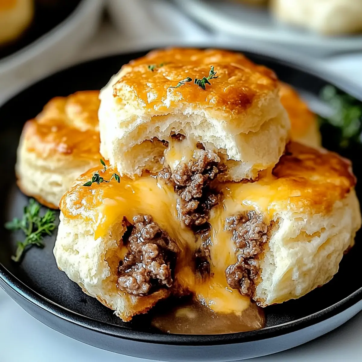 As I stood in my kitchen the other day, the aroma of sizzling beef mingled with melting cheese, instantly transporting me back to cozy family gatherings. My latest culinary adventure has found its way to these Cheesy Beef Biscuit Bombs, the perfect comfort food for any occasion. These delightful morsels are not just easy to whip up—they’re also a hit with everyone, making them ideal for a quick breakfast, a fun snack, or even a simple dinner. Each flaky biscuit envelops a savory and gooey filling that brings everyone to the table with wide smiles. Cooking doesn’t have to be complicated; it can be both delicious and approachable. Are you ready to embark on a cheesy journey that will leave your loved ones craving more? Why Are These Biscuit Bombs So Irresistible? Comfort Food at its finest: These Cheesy Beef Biscuit Bombs deliver a warm, nostalgic hug with each bite, making them perfect for family gatherings or cozy nights in. Effortless to prepare, even beginner cooks can master this delightful dish. Simply mix, fill, and bake! Customizable ingredients allow you to swap flavors – try adding jalapeños for a spicy kick or your favorite cheese blend. Perfect for Any Meal, whether served for breakfast, as a snack, or a casual dinner alongside a fresh salad. They truly shine on any table! Crowd-Pleasing goodness means they’re guaranteed to disappear quickly—some might even ask for seconds! Don’t forget to check out my mouthwatering Cheesy Ground Beef for more delicious ideas. Cheesy Beef Biscuit Bombs Ingredients For the Filling Ground Beef – The heart of the bomb, delivering robust flavor and texture that forms the base of your cheesy filling. Shredded Cheddar Cheese – This key ingredient creates that gooey melting center; feel free to mix with mozzarella for a delightful diversification. Cream Cheese – Adds creaminess and helps bind the filling together; try using Neufchâtel for a lighter option. Grated Parmesan Cheese – Elevates the umami flavor profile; optional but highly recommended for that extra richness. Garlic Powder – Introduces aromatic depth; if you have fresh garlic, mash in 1 clove for a punch of flavor. Onion Powder – Brings a hint of sweetness; replace with finely chopped fresh onions if you prefer. Black Pepper – Adds a little kick; adjust to your taste for a spicier bomb. For the Dough Refrigerated Biscuit Dough – The flaky outer layer that cradles all the wonderful flavors; feel free to use homemade dough if you want to go the extra mile. For Finishing Touch Melted Butter – A brush on top before baking ensures a golden, crispy finish; olive oil is a lighter alternative but works great too. Prepare to be amazed by the delightful Cheesy Beef Biscuit Bombs that will make any meal feel special! Step‑by‑Step Instructions for Cheesy Beef Biscuit Bombs Step 1: Preheat the Oven Begin by preheating your oven to 375°F (190°C). This ensures that when your Cheesy Beef Biscuit Bombs go in, they’re welcomed by a hot atmosphere that promotes a golden, flaky exterior. While the oven heats, gather your baking sheet and line it with parchment paper to prevent sticking. Step 2: Cook the Ground Beef In a large skillet over medium heat, add the ground beef and sauté for approximately 6-8 minutes, stirring often until it’s fully browned. Look for no pink spots to guarantee even cooking. Once browned, drain any excess grease to keep your filling lean and flavorful, then remove the skillet from heat. Step 3: Season the Beef Return the skillet to low heat and sprinkle garlic powder, onion powder, and black pepper over the cooked beef. Stir for about 1-2 minutes, allowing the seasonings to blend and infuse the meat with aromatic flavors. This step will greatly enhance the flavor profile of your Cheesy Beef Biscuit Bombs. Step 4: Cool the Beef Mixture Once seasoned, transfer the beef mixture to a bowl and let it cool slightly. This cooling period is essential to prevent the biscuits from melting or becoming soggy when you fill them. Take this time to prepare your filling ingredients while the beef mixture settles. Step 5: Mix the Filling In another bowl, combine cream cheese, shredded cheddar cheese, and grated Parmesan. This trio creates a creamy and cheesy base. After the beef has cooled, fold the beef mixture into the cheese mixture, stirring thoroughly until well blended. Your flavorful filling is now ready! Step 6: Prepare the Biscuit Dough Open the refrigerated biscuit dough and carefully separate each biscuit. Flatten them gently into rounds on a clean surface, creating a base for your delicious fillings. Ensure each round is ample enough to encase the filling, setting the stage for your Cheesy Beef Biscuit Bombs. Step 7: Fill the Biscuit Rounds Spoon an ample amount of the beef and cheese mixture onto the center of each biscuit round. Carefully fold the dough over the filling and press the edges together to seal. It’s important to ensure there are no gaps, which can lead to leakage while baking. Step 8: Brush with Butter Melt some butter and gently brush the tops of each biscuit bomb with it. This will help achieve a rich, golden-brown finish as they bake. If you prefer, use olive oil for a lighter alternative while maintaining that crispy texture. Step 9: Bake to Perfection Place your filled and buttered Cheesy Beef Biscuit Bombs on the lined baking sheet, ensuring they have space between them for expansion. Bake in the preheated oven for 12-15 minutes. Watch closely for a beautiful golden-brown color to ensure they’re baked just right. Step 10: Cool and Serve Once baked, remove the biscuit bombs from the oven and let them cool on the baking sheet for a few minutes before serving. This short cooling time allows the flavors to meld and the filling to stabilize, making each bite of your Cheesy Beef Biscuit Bombs all the more delightful! Variations & Substitutions for Cheesy Beef Biscuit Bombs Feel free to give your Cheesy Beef Biscuit Bombs a de