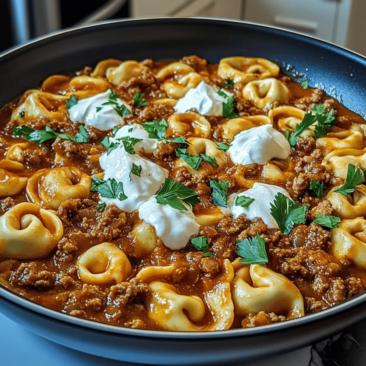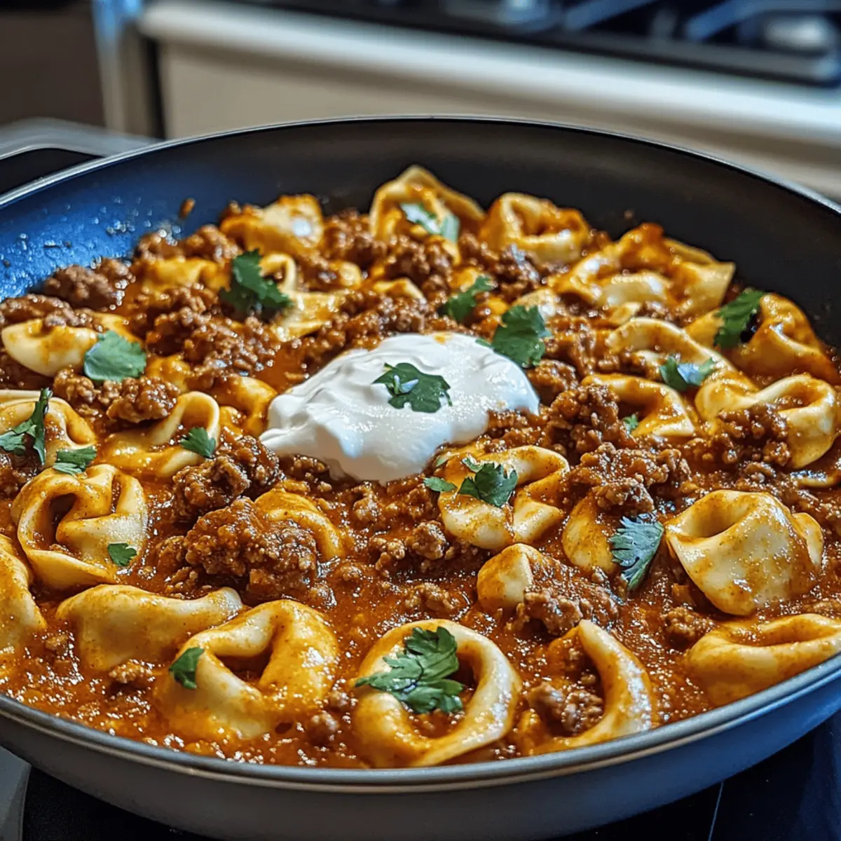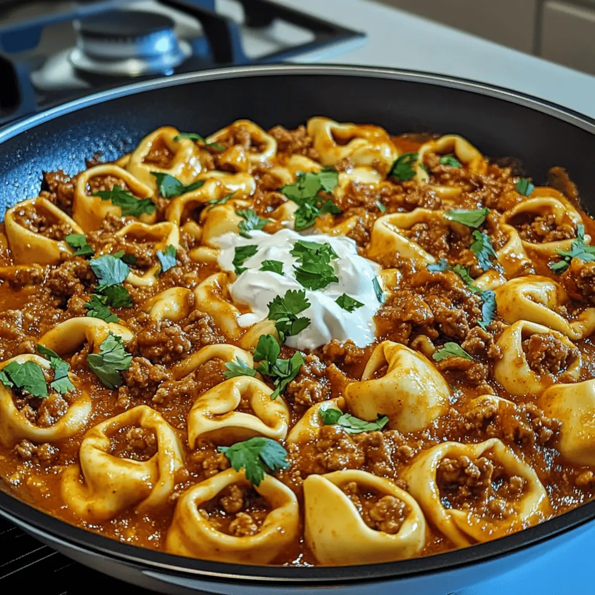 As I stood in my kitchen watching the clock, dreading yet another hustle-and-bustle weeknight dinner, I stumbled upon the perfect solution: Quick Cheesy Beef Enchilada Tortellini. With creamy cheese, savory ground beef, and a zesty enchilada sauce wrapped around tender tortellini, this dish transforms a chaotic day into a comforting delight in just over half an hour. Not only is it a breeze to prepare—making it an ideal go-to for busy evenings—but it also caters to those craving a quick, gluten-free dinner option. As the cheese oozes and the flavors meld together, you’ll find it’s more than just a meal; it’s the kind of comfort food that brings everyone to the table. Ready to elevate your weeknight dinners? Let’s dive into this culinary adventure! Why will you love Cheesy Beef Enchilada Tortellini? Quick and Easy: This dish comes together in just over half an hour, perfect for busy weeknights when time is of the essence. Comforting Flavors: The creamy cheese, savory ground beef, and zesty enchilada sauce mingle beautifully, creating a dish that everyone will crave again and again. Versatile Option: Whether you’re cooking for a family or a cozy gathering, this easy recipe is sure to impress. You can even explore variations like using Ground Beef Enchiladas or try a vegetarian twist with black beans! Crowd-Pleaser: With gooey melted mozzarella on top, it’s the kind of meal that brings smiles all around the table. Gluten-Free Friendly: Using specific cheese tortellini allows those with gluten sensitivities to enjoy a hearty meal without compromise. Cheesy Beef Enchilada Tortellini Ingredients For the Skillet Dish • Olive Oil – Adds flavor and helps with sautéing; can substitute with any cooking oil. • Onion – Provides a sweet, aromatic base; yellow or white onions work best. • Garlic – Enhances flavor depth; use fresh minced garlic for optimal taste. • Ground Beef – The main protein source providing heartiness; can substitute with ground turkey or shredded chicken. • Salt & Pepper – Essential for seasoning and enhancing flavors; adjust to taste. • Chili Powder – Adds warmth and spice; optional for varying heat levels. • Ground Cumin – Contributes a warm flavor profile; can swap with paprika for a milder taste. • Red Enchilada Sauce – Offers rich, tangy flavor; use store-bought or homemade. • Cream Cheese – Creates a creamy texture; full-fat or reduced-fat works well. • Refrigerated Cheese Tortellini – Main component of the dish; use gluten-free tortellini for a satisfying GF option. • Shredded Mozzarella Cheese – Melts into a bubbly topping; substitute with cheddar or a dairy-free alternative if necessary. Step‑by‑Step Instructions for Cheesy Beef Enchilada Tortellini Step 1: Heat the Oil Begin by heating a large skillet over medium heat. Once it’s warm, pour in a drizzle of olive oil, allowing it to coat the bottom. This will create a flavorful base for your Cheesy Beef Enchilada Tortellini. When the oil is shimmering, it’s time to add the onion. Step 2: Sauté the Onion and Garlic Add the diced onion to the skillet and sauté for about 3–4 minutes until it becomes translucent and fragrant. Next, stir in the minced garlic and cook for an additional 30 seconds, allowing the aroma to enhance the dish. The foundation for wonderful flavors is now set! Step 3: Brown the Beef Introduce the ground beef to the skillet, crumbling it as you add it in. Season with salt, pepper, chili powder, and cumin. Cook for 5–7 minutes until the beef is nicely browned and cooked through. Use a slotted spoon to drain any excess fat from the skillet, leaving you with rich, meaty goodness. Step 4: Add the Enchilada Sauce Now, pour in the red enchilada sauce, stirring to combine thoroughly with the beef mixture. Let this simmer on medium-low for about 3–5 minutes, allowing the flavors to meld together beautifully. The sauce should bubble gently, enveloping the beef in its rich texture. Step 5: Incorporate the Cream Cheese Cut the cream cheese into chunks and add it to the skillet. Stir well until completely melted and creamy, fully integrating it into the sauce. This addition will bring a luscious, rich quality to your Cheesy Beef Enchilada Tortellini, making it irresistible. Step 6: Fold in the Tortellini Carefully fold in the refrigerated cheese tortellini, ensuring they are coated in the creamy sauce. Cook for an additional 5–7 minutes, stirring occasionally, until the tortellini are tender and heated through. You’ll know it’s ready when everything is bubbling and fragrant. Step 7: Melt the Mozzarella on Top Finally, sprinkle the shredded mozzarella cheese generously over the top of your skillet dish. Cover the skillet with a lid and let it cook for 2–3 minutes, or until the cheese is melted and bubbly. For an extra crispy top, broil for a minute or two, keeping a close eye on it to avoid burning. Expert Tips for Cheesy Beef Enchilada Tortellini Brown the Beef Well: Ensure the ground beef is well-browned before adding the sauce for a deeper, richer flavor. Stir Gently: When folding in the cheese tortellini, stir gently to prevent them from sticking together in the creamy sauce. Monitor the Broiler: If you’re broiling to crisp the cheese, watch closely to avoid burning; it cooks quickly! Customize Your Heat: Adjust the amount of chili powder and choose mild enchilada sauce to control the spice level in your Cheesy Beef Enchilada Tortellini. Use Fresh Ingredients: Fresh minced garlic and good-quality cheese deepen the dish’s flavor, making it even more enjoyable! Cheesy Beef Enchilada Tortellini Variations Feel free to personalize this dish using your favorite ingredients for an extra special night! Ground Turkey: Swap ground beef for ground turkey for a slightly lighter option that still packs flavor. Vegetarian Twist: Substitute with black beans, lentils, or even a mix of your favorite vegetables to make it meat-free while maint