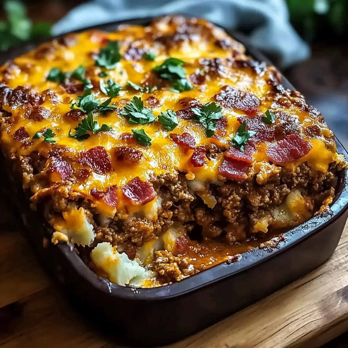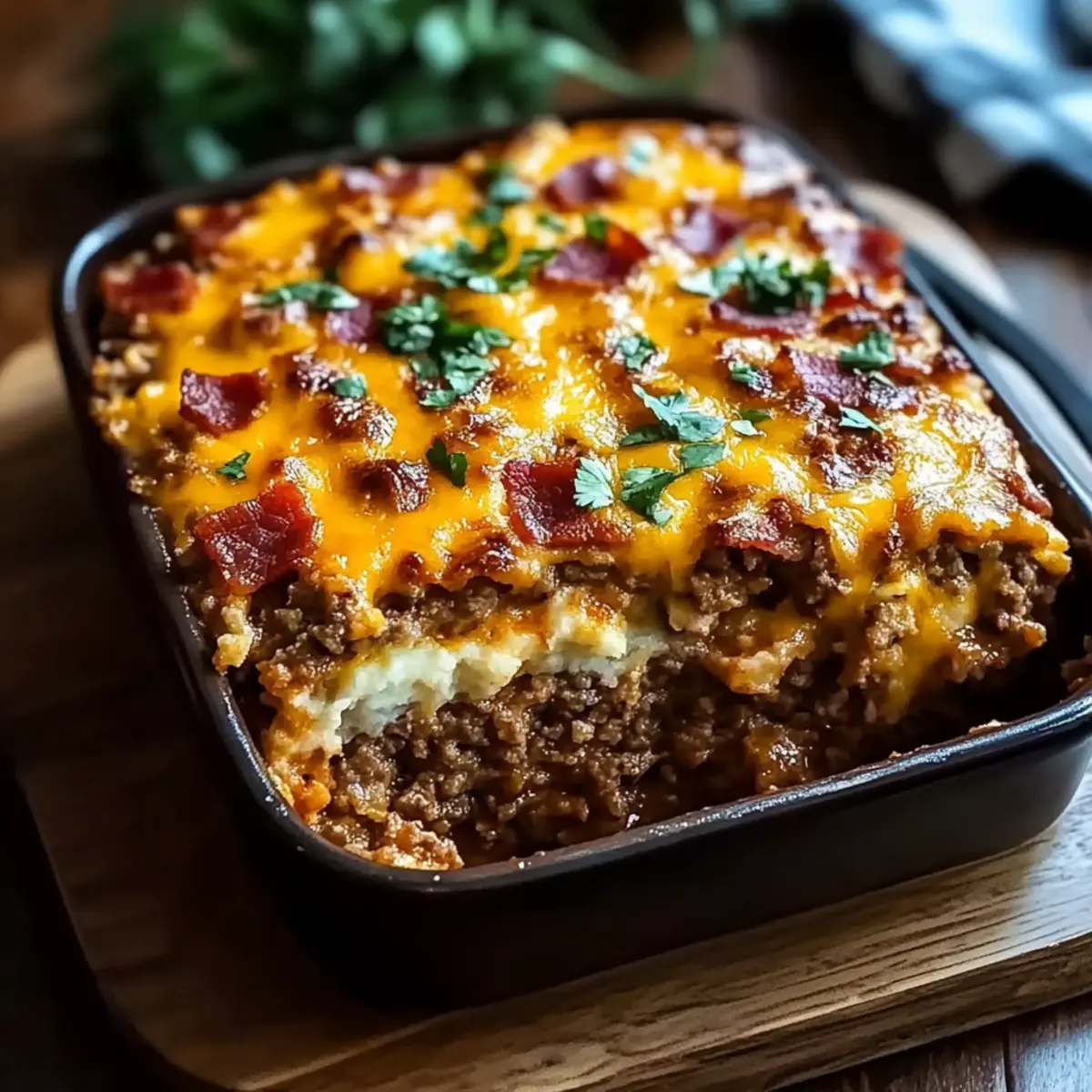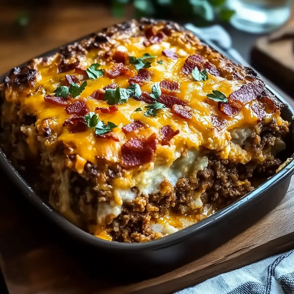 As the aroma of melting cheese and savory meat wafts through my kitchen, I can’t help but feel a wave of nostalgia wash over me. There’s just something magical about gathering around a warm, hearty dish that evokes childhood comforts. Enter my Cheesy Loaded Meatloaf Casserole: a delightful twist on the classic that brings together ground beef, creamy mashed potatoes, and a drizzle of crispy bacon. What’s not to love? This recipe not only delivers rich flavors but is also incredibly easy to whip up, making it a family-friendly favorite perfect for busy weeknights or cozy gatherings. So, are you ready to experience a warm embrace of comfort in every bite? Why Is This Meatloaf Casserole So Special? Comfort Food Redefined: The Cheesy Loaded Meatloaf Casserole elevates your average meal with layers of creamy mashed potatoes and melted cheese, bringing just the right amount of indulgence to your dining table. Family-Friendly Delight: Kids and adults alike will be reaching for seconds, making it an ideal dish for family gatherings or busy weeknights. Versatile Ingredients: Feel free to mix things up! Substitute ground beef with ground turkey, add in spinach or bell peppers, or even switch to a cheese blend for a twist. Easy Prep & Cleanup: The straightforward instructions minimize fuss, leaving you more time to enjoy with your loved ones. Perfect for anyone tired of fast food! Leftover-Friendly: Easily store leftovers for up to three days, or freeze for later, ensuring a delicious meal is always within reach. Check out our Comforting Low Carb Vegetarian Casserole for another great option! Cheesy Loaded Meatloaf Casserole Ingredients For the Meat Mixture Ground Beef – Primary protein source for the dish; substitute with lean turkey for a lighter option. Ground Pork – Adds flavor and moisture; can be replaced with additional ground beef if desired. Onion – Finely chopped for flavor; yellow onion works best, but shallots are a suitable alternative. Breadcrumbs – Provides structure to the meatloaf; use gluten-free breadcrumbs for a gluten-free version. Milk – Moistens the meat mixture; non-dairy milk can be utilized as a substitute. Egg – Binds the ingredients together; replace with a flax egg for a vegan version. Worcestershire Sauce – Introduces umami flavors; soy sauce can be used as a substitute. Salt and Black Pepper – Seasonings for flavor enhancement; adjust amounts to taste. Garlic Powder – Adds depth of flavor; fresh minced garlic is a good substitute. For the Topping Mashed Potatoes – Creamy topping for the casserole; ready-made mashed potatoes can be used for convenience. Shredded Cheddar Cheese – Provides richness and flavor; opt for a dairy-free cheese for a vegan take. Cooked Bacon – Adds crispy texture; omit for a vegetarian version or use turkey bacon as a lighter alternative. Chopped Green Onions – Garnish for fresh flavor; swap for chives if preferred. Step‑by‑Step Instructions for Cheesy Loaded Meatloaf Casserole Step 1: Preheat the Oven Begin by preheating your oven to 375°F (190°C). This step is crucial to ensure your Cheesy Loaded Meatloaf Casserole bakes evenly. While the oven heats up, gather all your ingredients and cooking equipment, including a large mixing bowl and a greased 9×13-inch baking dish, to streamline the process. Step 2: Prepare the Meat Mixture In your large mixing bowl, combine the ground beef, ground pork, finely chopped onion, breadcrumbs, milk, egg, Worcestershire sauce, salt, black pepper, and garlic powder. Use your hands or a spatula to gently mix until just combined, taking care not to overmix, which can make the meatloaf tough. Aim for a well-blended yet tender mixture. Step 3: Form the Meat Layer Transfer the meat mixture into the greased 9×13-inch baking dish, pressing it down evenly to create a uniform layer. This creates a solid base for your Cheesy Loaded Meatloaf Casserole. Using a spatula, smooth the surface as needed, ensuring it’s packed but not too tightly for a juicy result. Step 4: Add the Mashed Potatoes Spoon your creamy mashed potatoes over the layer of meat, using a spatula to spread them evenly. Make sure to cover the meat layer completely, creating a beautiful, smooth top. The potatoes should look soft and inviting, ready to support the delicious toppings to come in this comfort food dish. Step 5: Sprinkle Cheese on Top Generously sprinkle the shredded cheddar cheese over the mashed potatoes, allowing it to cascade down the sides for added flavor. The cheese should cover the potatoes completely for that melty, gooey goodness that defines your Cheesy Loaded Meatloaf Casserole. Get ready for a delightful cheese pull when serving! Step 6: Top with Bacon Crumble the cooked bacon over the cheese, distributing it evenly across the top. The crispy bits will add a savory crunch and rich flavor while baking. This extra layer of indulgence is sure to enhance the overall appeal of your casserole, making it even more enticing for family gatherings. Step 7: Bake the Casserole Place the baking dish into the preheated oven and let your Cheesy Loaded Meatloaf Casserole bake for 40-45 minutes. Keep an eye out for bubbling cheese and a golden-brown top, which indicates that it’s cooked through. The internal temperature of the meat should reach at least 160°F (71°C) for safety. Step 8: Let It Rest Once out of the oven, allow the casserole to rest for 5-10 minutes before slicing. This step helps the layers set, making it easier to serve. As the delightful aromas fill the room, you’ll be gearing up for a hearty meal that will bring warmth and satisfaction to your dining table. Step 9: Garnish and Serve Finally, garnish your Cheesy Loaded Meatloaf Casserole with freshly chopped green onions for a burst of color and flavor. Slice into portions, serving alongside your favorite sides. This dish is sure to impress both family and friends, providing a comforting embrace of flavor in every bite. Expert Tips for C