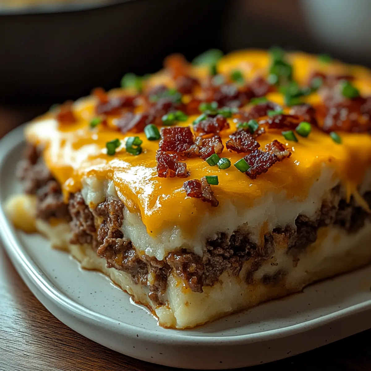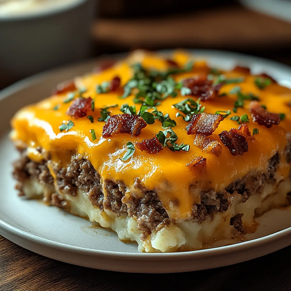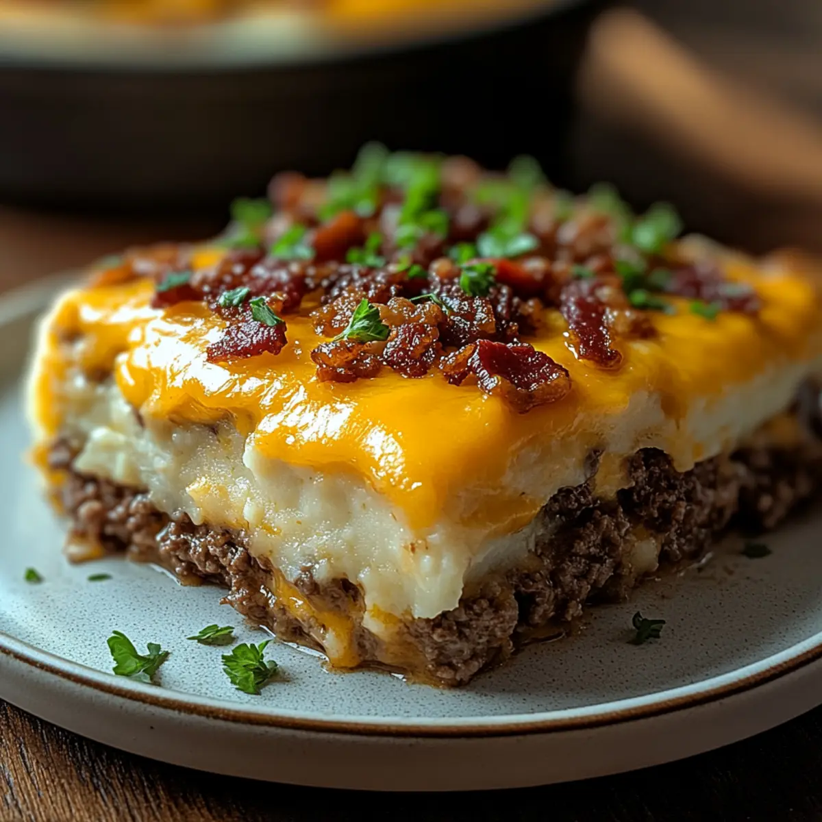 As I pulled my Cheesy Loaded Meatloaf Casserole from the oven, the sizzling aroma of melted cheddar and crispy bacon filled my kitchen, whisking me back to family dinners where comfort food reigned supreme. This dish combines all the nostalgic flavors of a traditional meatloaf with a creamy twist, topped with fluffy garlic mashed potatoes. Not only is it a true crowd-pleaser for those busy weeknights, but it’s also freezer-friendly—perfect for meal prep! Plus, with easy variations available, whether you’re looking for a lighter spin or a spicy kick, everyone can enjoy their own version. Curious to see how this heartwarming casserole comes together? Let’s dive into the recipe! Why is this casserole a must-try? Comforting and familiar, this Cheesy Loaded Meatloaf Casserole brings together all your favorite flavors in one dish. Easy to customize, you can swap out ingredients to suit your family’s taste. Meal prep-friendly, it freezes beautifully, making weeknight dinners a breeze. Bacon and cheese elevate the dish, adding a savory crunch and gooey goodness that everyone will love. If you enjoy hearty meals, don’t miss out on this recipe that’s reminiscent of classic comfort foods like our Cattle Drive Casserole. Ingredients • • Cheesy Loaded Meatloaf Casserole Ingredients For the Meat Mixture • Lean Ground Beef – Main protein source providing rich flavor; substitute with ground turkey or chicken for a lighter option. • White Onion, Finely Chopped – Adds sweetness and moisture to the beef mixture. • Fresh Garlic, Minced – Enhances the overall flavor with a savory kick. • Brown Sugar – Balances savory flavors with a hint of sweetness. • Worcestershire Sauce – Contributes depth and umami richness to the dish. • Italian Breadcrumbs – Binds the meat mixture while providing additional seasoning. • Large Egg – Serves as a binder for the beef mixture. For the Topping • Cold Garlic Mashed Potatoes – Provides the creamy top layer; use leftover mashed potatoes for convenience. If not already garlic-flavored, add minced garlic. • Sharp Cheddar Cheese, Grated – Melts beautifully for a delicious cheesy topping; substitute with pepper jack for spice or mozzarella for extra meltiness. • Cooked and Crumbled Bacon or Bacon Bits – Adds crunch and smoky flavor to the casserole. • Kosher Salt and Freshly Ground Black Pepper – Essential for seasoning the meat mixture to enhance overall flavor. This delightful Cheesy Loaded Meatloaf Casserole will warm your heart and satisfy your cravings! Step‑by‑Step Instructions for Cheesy Loaded Meatloaf Casserole Step 1: Preheat the Oven Begin by preheating your oven to 400ºF (200ºC). This will ensure that your Cheesy Loaded Meatloaf Casserole bakes evenly and crisps up perfectly on top. While the oven is warming up, gather your baking dish and all the ingredients needed for the recipe. Step 2: Prepare the Meat Mixture In a large mixing bowl, combine the lean ground beef, finely chopped white onion, minced garlic, brown sugar, and Worcestershire sauce. Use your hands or a spatula to mix these ingredients thoroughly until they’re well integrated, with no visible pockets of onion or garlic. This step ensures that all the flavors meld together beautifully. Step 3: Season and Bind the Mixture Next, season your meat mixture with kosher salt and freshly ground black pepper to taste. Gently fold in Italian breadcrumbs and the large egg, mixing until everything is evenly combined. The breadcrumbs will not only add flavor but also bind the meat mixture, creating the comforting base for your casserole. Step 4: Assemble the Casserole Transfer the prepared beef mixture into an 8-inch square baking dish, using a spatula to spread it evenly and pack it down gently. Make sure the layer is uniform to allow for even cooking. This hearty base is the foundation of your Cheesy Loaded Meatloaf Casserole, ready to support the delicious toppings. Step 5: Spread the Mashed Potatoes Take your cold garlic mashed potatoes and evenly spread them over the beef layer. Use a spatula to create a smooth, even layer, covering the meat completely. This creamy topping not only adds texture but also infuses the casserole with delicious garlic flavor, making every bite a treat. Step 6: Add Cheese and Bacon Sprinkle a generous amount of grated sharp cheddar cheese over the mashed potatoes, followed by the cooked and crumbled bacon or bacon bits. Make sure to cover the entire surface, creating a delightful cheesy and crunchy top layer that will melt and crisp up beautifully during baking. Step 7: Cover and Bake Cover the assembled casserole loosely with aluminum foil, ensuring it doesn’t touch the cheese. Place it in the preheated oven and bake for 30 minutes. This step allows the flavors to meld together and keeps the top from browning too soon, ensuring a perfectly cooked center. Step 8: Remove Foil and Brown the Top After 30 minutes, carefully remove the foil and continue to bake for an additional 10–15 minutes. Keep an eye on your Cheesy Loaded Meatloaf Casserole as it bakes—it’s ready when the cheese is melted, bubbly, and lightly golden on top, indicating a beautiful, delicious finish. Make Ahead Options These Cheesy Loaded Meatloaf Casserole are perfect for meal prep enthusiasts! You can assemble the entire casserole up to 24 hours in advance and store it covered in the refrigerator. To prevent the mashed potatoes from browning, keep the layers well separated until you’re ready to bake. Alternatively, for longer storage, you can freeze the assembled casserole for up to 3 months. When ready to serve, simply thaw it overnight in the fridge before baking. Cook as directed (approximately 40-45 minutes total), and you’ll have a comforting family meal that is just as delicious as if it were freshly made, saving you precious time on busy weeknights! Cheesy Loaded Meatloaf Casserole Variations Feel free to customize your Cheesy Loaded