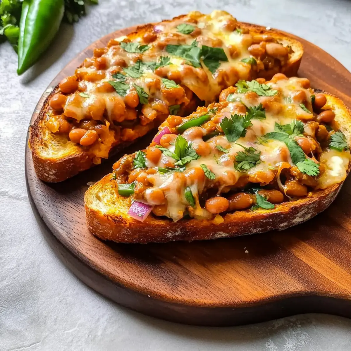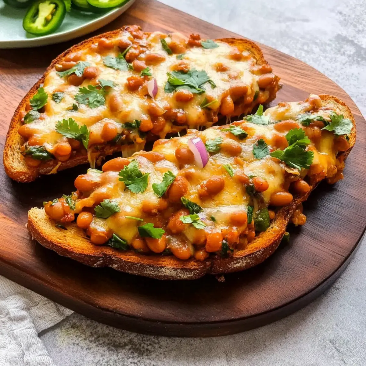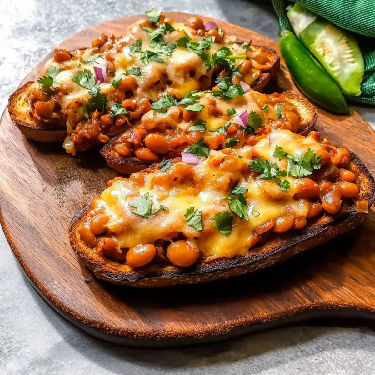 There’s nothing quite like the moment when a comforting aroma wafts through the kitchen, urging you out of the fast-food rut. That’s exactly how I felt when I stumbled upon the perfect way to elevate my morning routine: Cheesy Masala Beans on Toast. This delightful dish marries the hearty flavors of spiced baked beans with the satisfying crunch of toasted bread and rich, gooey cheese. It’s not just a quick meal; it’s a comforting embrace on a plate, perfect for breakfast, brunch, or even a speedy lunch. With simple ingredients that easily transform your standard baked beans into something extraordinary, you’ll find it’s a dish that bridges cultures and excites the palate. Are you ready to embark on this flavor journey with me? Why Try Cheesy Masala Beans on Toast? Comforting Fusion: This recipe beautifully combines traditional British baked beans with vibrant Indian spices, making each bite a delightful surprise. Quick and Easy: With minimal preparation, you can whip up this dish in under 15 minutes, making it a perfect solution for busy mornings. Crowd-Pleasing Flavor: The rich combination of ghee, cheddar, and garam masala guarantees that even the pickiest eaters will want seconds—perfect for family brunches! Versatile Option: Don’t hesitate to customize it! Add sautéed mushrooms or spinach for an extra nutrition boost or use Pepperoni Pizza Quesadillas for a flavor twist. Mouthwatering Cheese: Who can resist bubbly, melted cheese on top? This dish is all about indulgence, making it a comforting staple in your cooking repertoire! Cheesy Masala Beans on Toast Ingredients For the Base: 2 slices toast – A foundation for the dish; white sourdough works well for added flavor. 1 x 400g tin baked beans – The main protein source; opt for brands like Branston for balanced taste. For the Flavoring: 1 tbsp ghee – Adds richness and unique flavor; can be substituted with butter or oil for a vegan option. 1/2 tsp cumin seeds – Provides a warm, nutty flavor; toast briefly to enhance the aroma. 1 medium-sized red onion, finely chopped – Adds sweetness and texture; substitute with yellow onion or shallots if needed. 1 green chilli, finely sliced – Brings heat; adjust quantity to taste, red chilli can be used for a different flavor profile. 1 tsp garam masala – Essential for complexity; using a homemade blend can elevate the dish. 1/4 tsp turmeric – Adds earthiness and color; can be omitted if unavailable. 1-2 tsp fresh coriander leaves and stalks – For garnish and freshness; dried coriander works too, but less vibrant. For the Cheesy Topping: 75g Cheddar, grated – Melting cheese that provides creaminess; substitute with a dairy-free cheese for a vegan option. 75g Red Leicester, grated – Offers a subtle sweetness; if unavailable, more Cheddar or similar cheese can be used. For Final Touches: 1/2 small red onion, finely chopped – Adds freshness and crunch on top; can substitute with shallots. 2 green or red chillies, finely sliced – Adds another layer of heat as a garnish. 1 tbsp chopped coriander leaves – Extra garnish for freshness. 2 tsp hot sauce (Tabasco recommended) – For added heat; optional based on spice preference. This Cheesy Masala Beans on Toast is sure to spice up your morning routine with a delightful twist! Step‑by‑Step Instructions for Cheesy Masala Beans on Toast Step 1: Prepare the Base In a medium saucepan, melt 1 tablespoon of ghee over medium heat. Once the ghee is shimmering, add 1/2 teaspoon of cumin seeds and sizzle for about 30 seconds until fragrant. Quickly stir in the finely chopped red onion and sauté for about 2 minutes, or until the onions turn soft and translucent, setting a flavorful foundation for your Cheesy Masala Beans on Toast. Step 2: Incorporate Spices Add the sliced green chilli to the pan, cooking for another 30 seconds to release its heat. Reduce the heat to low and mix in 1 teaspoon of garam masala, 1/4 teaspoon of turmeric, and 1-2 teaspoons of fresh coriander leaves. Stir in the 400g tin of baked beans, ensuring everything is well combined, and simmer for about 2 minutes. If the mix appears dry, add a splash of water to reach your desired consistency. Step 3: Assemble the Dish While your beans are simmering, toast 2 slices of your chosen bread until golden brown and crisp. Spread the hot, spicy masala beans generously over the toasted bread, followed by a sprinkling of finely chopped red onions and extra chilli slices. Finally, heap a generous amount (150g total) of grated Cheddar and Red Leicester cheese on top, paving the way for a melty finish. Step 4: Grill Transfer the assembled toast to a grilling rack or oven-safe dish, placing it under the grill on high heat. Grill for about 2-3 minutes, watching closely as the cheese melts and begins to bubble and turn a lovely golden brown. This step ensures that your Cheesy Masala Beans on Toast turns out indulgently gooey and just right. Step 5: Serve Once the cheese has melted to your liking, carefully remove the dish from the grill. Cut the Cheesy Masala Beans on Toast into triangles for easier handling. Garnish with a sprinkle of chopped coriander leaves and, if desired, a dash of hot sauce for an extra kick. Serve hot and delight in this comforting fusion dish! What to Serve with Cheesy Masala Beans on Toast Elevate your dining experience by exploring delicious sides and drinks that complement the bold flavors of this comforting dish. Fresh Green Salad: A light, crisp salad with mixed greens and a zesty lemon vinaigrette balances the rich beans and cheese beautifully. The freshness cuts through the creaminess, making for a perfect contrast. Cucumber Raita: This cooling yogurt dip, mixed with finely chopped cucumbers and herbs, serves as a refreshing accompaniment. It helps tone down the heat from the green chillies while introducing a creamy texture. Spiced Roasted Potatoes: Crispy, spiced potatoes make a hearty side that’s bursting with flavor. Their crun