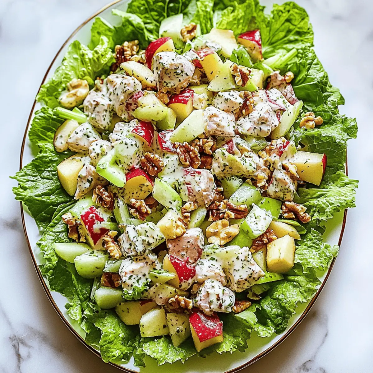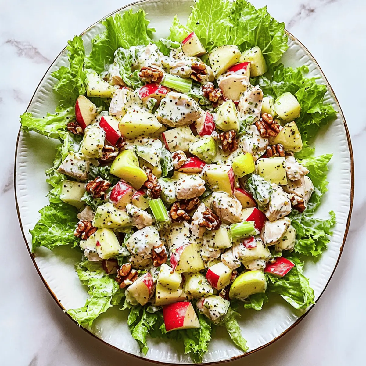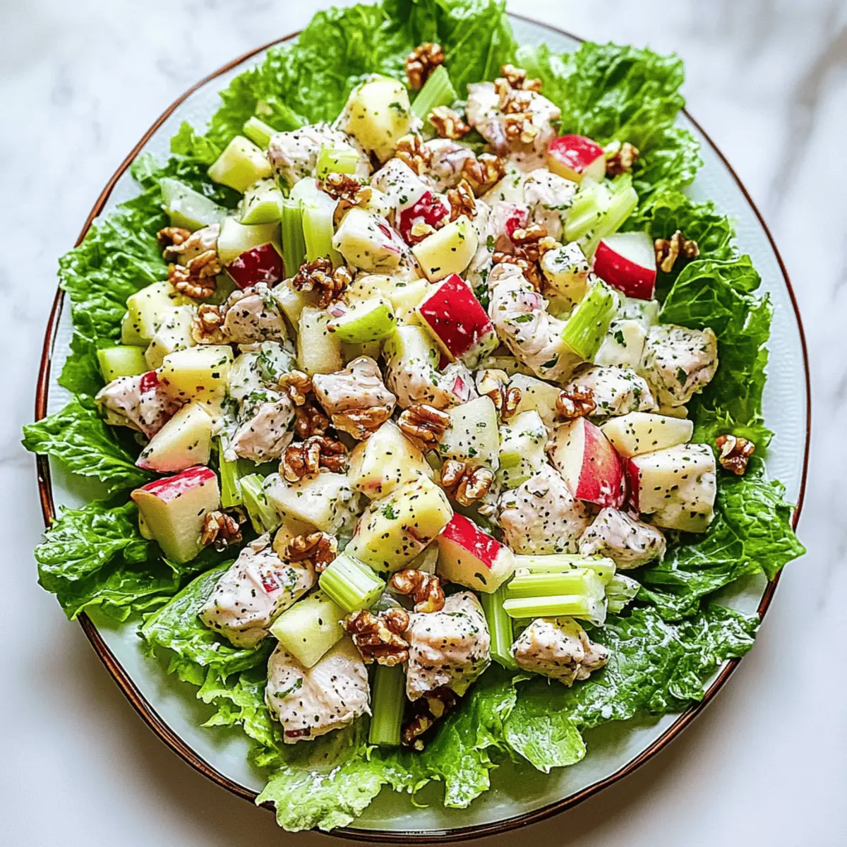 As I lifted the lid of the salad bowl, a kaleidoscope of colors and textures greeted me, promising a delightful experience. This High-Protein Chicken Waldorf Salad not only appeals to the eye but also elevates regular lunch fare into something special and satisfying. With tender poached chicken mingling with sweet-tart apples, crunchy celery, and roasted walnuts, this dish is a perfect blend of healthy and hearty. It’s easily adaptable, allowing you to swap in raisins if you prefer a chewy sweet note over grapes. Plus, it’s a breeze to prepare, making it an ideal choice for anyone seeking a quick and nutritious meal. Curious about how to create this vibrant salad that’s packed with protein yet low in carbs? Let’s get started! Why is Chicken Waldorf Salad So Loved? Vibrant and colorful: This salad is a feast for the eyes, making it a perfect centerpiece for lunch gatherings or picnics. Nutritious powerhouse: Packed with high-protein ingredients like chicken and walnuts, it’s designed for those craving a healthy boost. Customizable delight: Easily swap ingredients like grapes for raisins or experiment with nuts, giving you a recipe that never gets old. Quick to prepare: With simple steps, this dish can be ready in no time, perfect for busy weekdays. Crowd-pleaser guaranteed: Whether you serve it on its own or as a filling in a wrap, everyone will love this refreshing twist on a classic! For another easy recipe, try my Bang Bang Chicken or our creamy Lemon Chicken Orzo. Chicken Waldorf Salad Ingredients For the Salad • Chicken Breasts – A high-protein source; poaching ensures tenderness and moisture. • Red Apples – Adds natural sweetness and crunch; choose a firm variety for the best texture. • Green Apple (Granny Smith) – Provides a refreshing tartness; feel free to swap for any tart apple variety. • Celery – Delivers the perfect crunch and refreshing taste; fresh stalks are preferred, though asparagus can add a crisp twist. • Walnuts – Imparts a toasty flavor and delightful crunch; pecans make a fine alternative if desired. • Raisins or Grapes – Introduces a touch of sweetness; use raisins for a chewy texture or skip if you prefer minimal sweetness. • Chopped Parsley – Brings freshness and vibrant color; chives or cilantro can also enhance the flavor profile. • Salt – Essential for enhancing flavors; adjust according to your taste preferences. • Romaine or Gem Lettuce – Sets the stage for your salad; spinach or watercress are good substitutes for a different texture. For the Dressing • Low-Fat Mayonnaise – Provides creaminess; Greek yogurt can be used for a lighter option. • Lemon Juice – Brightens the dish and prevents apple browning; substitute vinegar if lemons are unavailable. • Dijon Mustard – Elevates the dressing flavor; yellow mustard can be used for a milder touch. Step‑by‑Step Instructions for Chicken Waldorf Salad Step 1: Toast the Walnuts Preheat your oven to 350°F (180°C). Spread the walnuts on a baking sheet and toast them for about 5 minutes, or until they become fragrant and golden brown. Keep an eye on them to avoid burning. Once done, allow them to cool before chopping into smaller pieces, enhancing the flavor of your Chicken Waldorf Salad. Step 2: Poach the Chicken In a large saucepan over medium heat, add enough water to submerge the chicken breasts completely. Bring it to a simmer and gently add the chicken, poaching for approximately 15-20 minutes until cooked through and no longer pink in the center. Remove the chicken and let it cool, then cube it for the salad. Step 3: Prepare the Fruits and Vegetables While the chicken cools, core and dice the red and green apples into bite-sized pieces, ensuring to leave the skin on for added texture. Chop the celery into thin slices, incorporating its refreshing crunch into the Chicken Waldorf Salad. Place all these ingredients into a large mixing bowl. Step 4: Combine the Ingredients Once the chicken is cooled and cubed, add it to the bowl with the apples, celery, and any raisins or grapes if desired. Gently fold everything together, ensuring each component gets well-distributed to create a vibrant and tasty medley in your Chicken Waldorf Salad. Step 5: Make the Dressing In a separate small bowl, whisk together the low-fat mayonnaise, lemon juice, and Dijon mustard. Stir until smooth, and taste before adjusting seasoning with salt. This creamy dressing brings everything together, enhancing the flavors in your Chicken Waldorf Salad. Step 6: Dress the Salad Drizzle the prepared dressing over the mixed salad ingredients. Use a spatula or wooden spoon to carefully fold the dressing in, ensuring each piece is thoroughly coated. It’s crucial to mix gently to preserve the integrity of the apples and chicken in your delicious Chicken Waldorf Salad. Step 7: Let it Rest After mixing everything, let the Chicken Waldorf Salad sit for about 10 minutes at room temperature. This resting time allows the flavors to meld beautifully, creating a more harmonious dish before serving. Step 8: Serve the Salad Arrange the romaine or gem lettuce leaves on a serving platter, creating a fresh and inviting base for your salad. Spoon the Chicken Waldorf Salad mixture generously over the lettuce, presenting a colorful and appetizing dish ready to impress at your next meal or gathering. Expert Tips for Chicken Waldorf Salad • Fresh Ingredients: Use the freshest produce available; it enhances flavor and texture, making your Chicken Waldorf Salad more vibrant and enjoyable. • Rest for Flavor: Allow the salad to sit for at least 10 minutes before serving. This resting time helps the flavors meld together beautifully. • Mind the Dressing: Mix your dressing gently into the salad to prevent mashing the apples and chicken, ensuring a delightful crunch in every bite. • Texture Essentials: Choose crispy apples and celery for the best crunch. Soggy veggies can ruin the mouthfeel of your Chicken