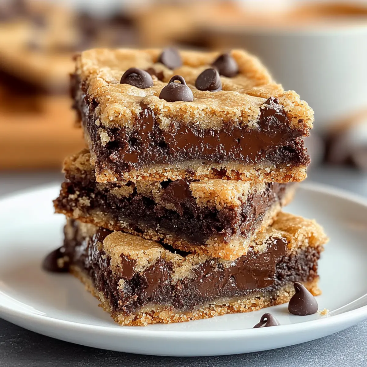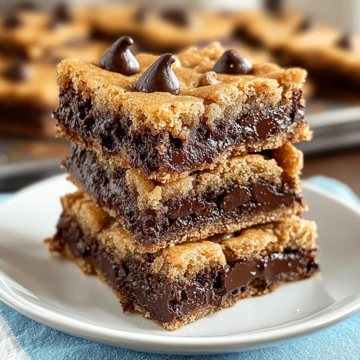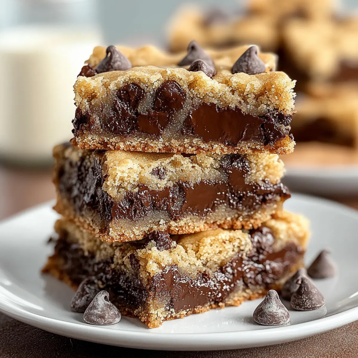 There’s something undeniably heartwarming about the smell of fresh cookies wafting through the kitchen, isn’t there? My latest obsession is these chewy Chocolate Chip Cookie Bars that seamlessly meld the nostalgia of childhood baking with the convenience of a single pan. Perfect for a quick dessert or a cheeky breakfast treat, they promise a delightful experience with each messy, chocolatey bite. Not only are they incredibly easy to whip up, but they also make sharing a breeze—great for gatherings or even a late-night snack. With just a few simple ingredients and a handful of clever substitutions for dietary needs, you’ll want to keep this recipe in your back pocket. So, who’s ready to indulge in some chewy goodness? Why are these cookie bars so special? Chewy, Melt-in-Your-Mouth Texture: Each bite offers a delightful blend of soft, chewy goodness that keeps you coming back for more. Quick and Easy: With just a few steps and simple ingredients, you can have these delicious bars ready in no time. Versatile for Everyone: Want to make them dairy-free? Substitute with coconut oil! Prefer a vegan option? Flax eggs work wonders! Perfect for Sharing: These bars are easy to cut and serve, making them ideal for parties, potlucks, or a cozy family night. Nostalgic Flavor: They capture the beloved taste of classic chocolate chip cookies, bringing back fond memories of home baking without the hassle. Make sure to enjoy with a scoop of ice cream, or check out my Gluten Free Chocolate for more delightful treats! Chocolate Chip Cookie Bars Ingredients For the Base All-Purpose Flour – Provides structure and body to the bars; can be substituted with gluten-free flour blend for a gluten-free option. Baking Soda – Acts as a leavening agent for texture; ensure it’s fresh for best results. Salt – Enhances sweetness and balances flavors; consider reducing or omitting for lower sodium needs. Unsalted Butter (melted) – Adds richness and moisture; coconut oil can be used for a dairy-free option. Brown Sugar (packed) – Contributes to a chewy texture and deep flavor; light brown sugar offers a milder taste, while dark enhances caramel notes. Granulated Sugar – Sweetens the bars and enhances texture; honey or maple syrup can replace part of the sugar for a natural sweetener. Large Eggs (room temperature) – Binds ingredients and aids in rising; for a vegan alternative, use flax eggs or applesauce. Vanilla Extract – Provides aromatic depth and enhances overall flavor; pure vanilla extract yields the best results. For the Chocolate Goodness Semisweet Chocolate Chips – The star ingredient providing rich bursts of chocolate flavor; feel free to swap for milk or dark chocolate chips based on your preference. Step‑by‑Step Instructions for Chocolate Chip Cookie Bars Step 1: Preheat and Prepare Begin by preheating your oven to 350°F (175°C). While the oven warms, grease a 9×13 inch baking pan with butter or cooking spray. This critical first step ensures your chewy chocolate chip cookie bars will bake evenly and easily release from the pan once they’re ready. Step 2: Mix the Dry Ingredients In a medium bowl, whisk together the all-purpose flour, baking soda, and salt until thoroughly combined. This process helps to evenly distribute the leavening agent and salt, leading to a perfectly risen texture in your cookie bars. Set this bowl aside as you prepare your wet ingredients. Step 3: Combine the Sugars and Butter In a large mixing bowl, mix the melted unsalted butter, packed brown sugar, and granulated sugar until the mixture becomes smooth and creamy. This should take about 2-3 minutes of vigorous stirring. This blend of flavors will provide the chewy, rich base for your chocolate chip cookie bars. Step 4: Add Eggs and Vanilla Next, add the room-temperature large eggs and the vanilla extract to the butter-sugar mixture. Beat these ingredients together until well combined and the mixture appears light and airy, making your chocolate chip cookie bars tender and flavorful. This step should take another 2 minutes. Step 5: Combine Wet and Dry Ingredients Gradually fold the dry ingredients into the wet mixture, stirring until just combined. Be careful not to overmix; you want your chocolate chip cookie bars to remain soft and chewy. Mixing until no dry flour is visible will yield the best texture, so take your time with this crucial step. Step 6: Add the Chocolate Chips Once your batter is ready, lovingly fold in the semisweet chocolate chips until they are evenly distributed throughout the dough. This step infuses your chewy chocolate chip cookie bars with bursts of chocolate goodness that every chocolate lover craves. Make sure not to leave any unchocolatey spots! Step 7: Spread and Bake Pour the batter into your prepared baking pan, spreading it evenly with a spatula. Bake the bars in the preheated oven for 25 minutes, or until they turn golden brown and a toothpick inserted into the center comes out clean. This step is essential for achieving that delightful chewy texture. Step 8: Cool and Cut Allow the chocolate chip cookie bars to cool completely in the pan at room temperature. This cooling phase will ensure the bars set properly and make cutting them easier. After about 30-40 minutes, slice them into squares, and savor the joy of sharing homemade treats! Chocolate Chip Cookie Bars Variations Feel free to unleash your creativity and customize these delectable cookie bars to fit your taste! Dairy-Free: Replace unsalted butter with coconut oil for a rich, buttery flavor without the dairy. Nutty Addition: Stir in chopped walnuts or pecans for a delightful crunch and nutty flavor that complements the chocolate. Chocolate Twist: Mix in some cocoa powder to the dry ingredients for a luscious chocolate-flavored cookie bar. White Chocolate Delight: Swap out semisweet chocolate chips for white chocolate chips for a sweeter, creamy twist that’s irresistible. Fruity Flair: Add dried cranberries