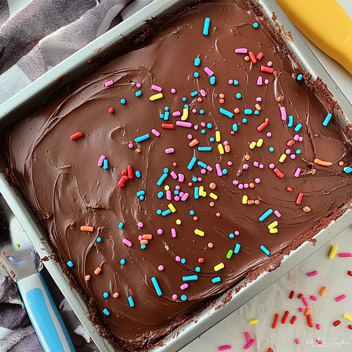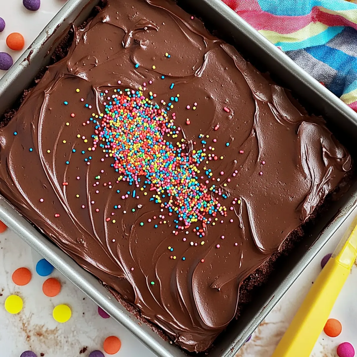 Once the cake has cooled, use an offset spatula to spread half of the buttercream frosting over the top in a rustic fashion. For added flair, pipe a decorative shell border with the remaining frosting around the edges. Finally, sprinkle colorful rainbow sprinkles over the top to give a cheerful, festive touch to your Chocolate Sheet Cake!