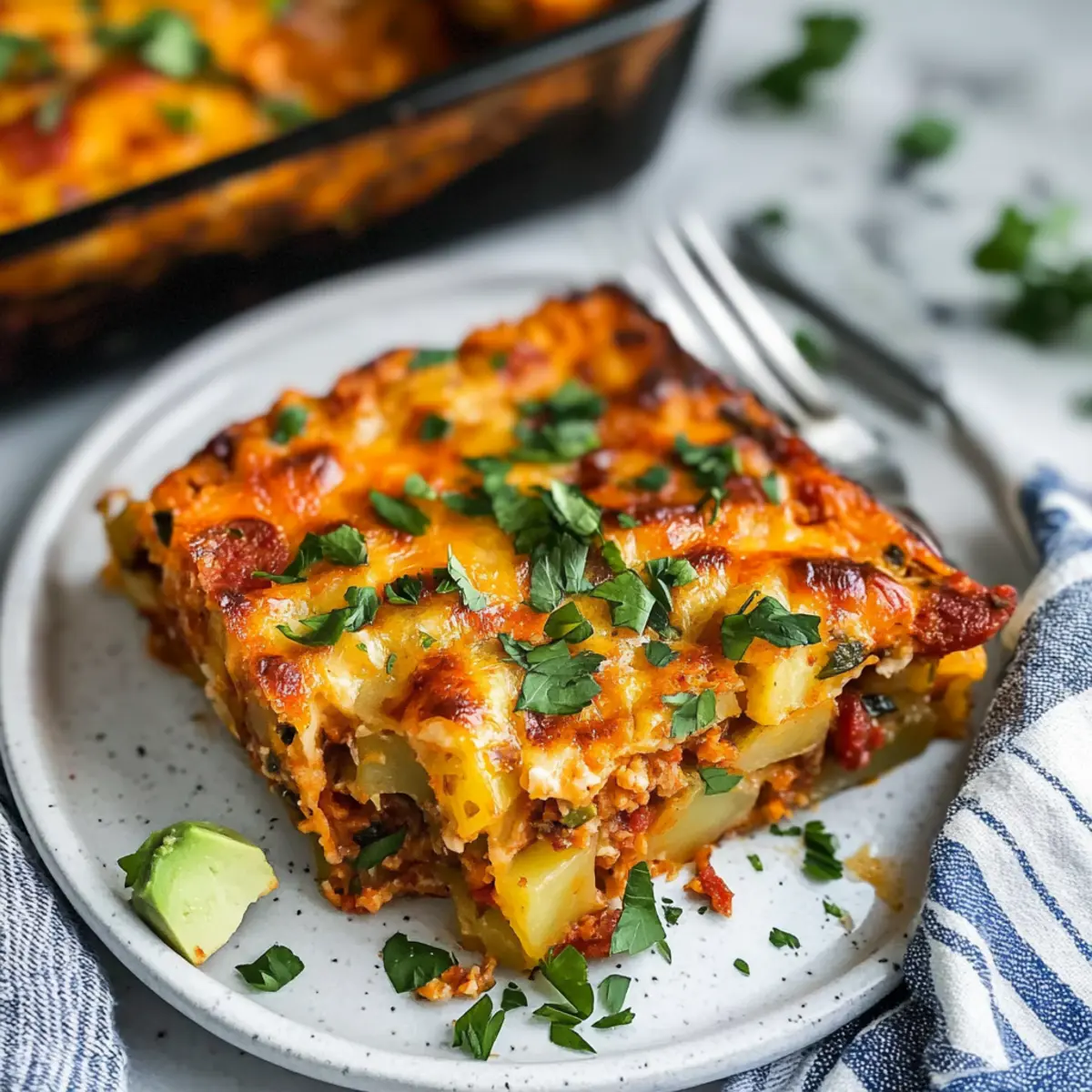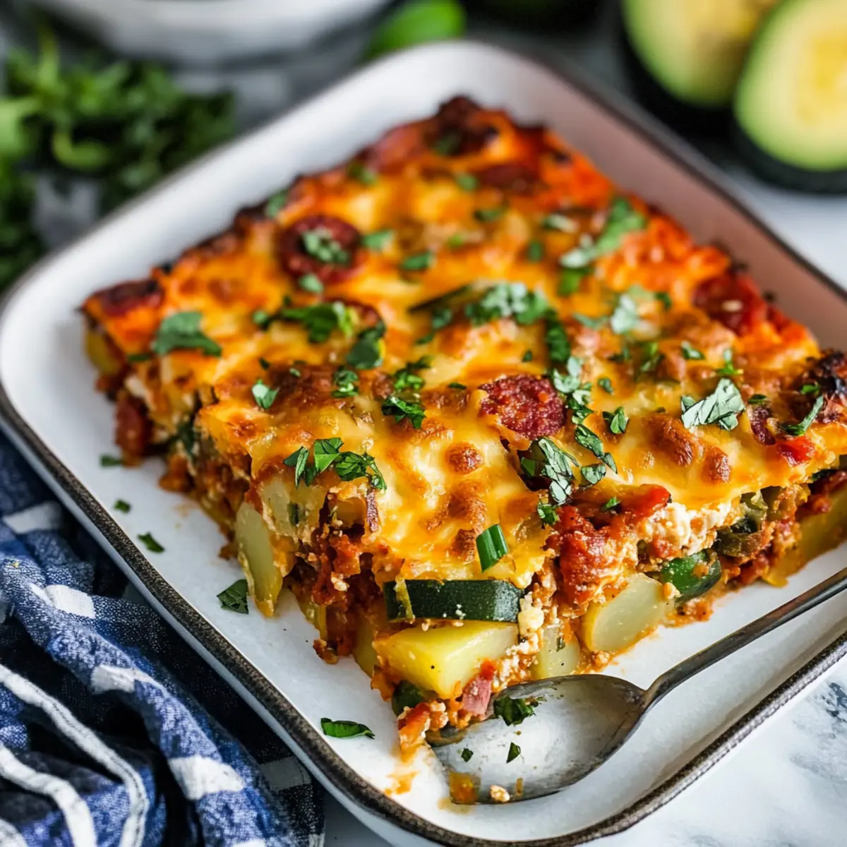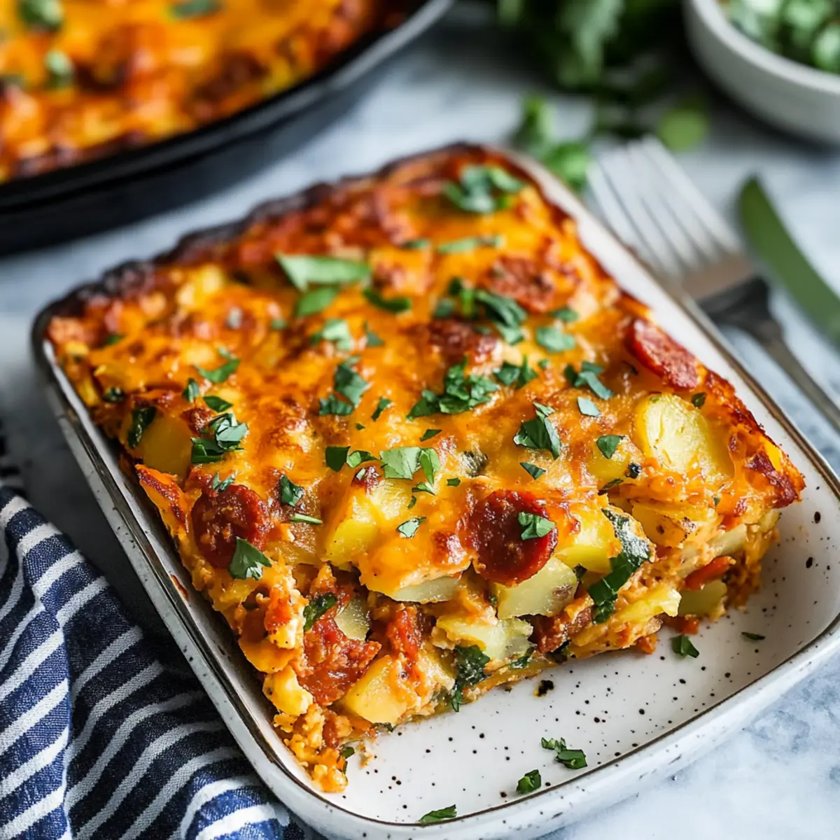 As the sun rises, the enticing aroma of sautéed chorizo begins to fill my kitchen, instantly whisking me away to sun-drenched mornings in Mexico. Today, I’m excited to share my recipe for Spicy Chorizo & Potato Egg Casserole—a hearty breakfast dish that’s as vibrant as it is satisfying. This casserole brings together the bold flavors of spicy Mexican chorizo, colorful sautéed veggies, and creamy potatoes, all enveloped in a fluffy egg mixture that promises to ignite your morning—and your taste buds. With its quick prep time and versatility, it’s perfect for family gatherings or a cozy brunch at home. Plus, it’s gluten-free and can easily adapt to a dairy-free lifestyle! Are you ready to bring a little fiesta to your breakfast table? Why is this casserole a brunch winner? Flavor Explosion: The combination of spicy chorizo and creamy potatoes creates a mouthwatering medley that’ll have everyone asking for seconds. Versatile Ingredients: Feel free to swap in your favorite veggies or proteins; it’s your dish to customize! Quick & Easy Prep: Whip it up in just 15 minutes before popping it in the oven, giving you more time to relax or entertain. Crowd-Pleaser: Perfect for family gatherings, this hearty casserole will impress even the pickiest eaters. Don’t forget to pair it with a fresh salad or some sliced avocado for that complete meal experience! Make-Ahead Friendly: Assemble the night before and simply bake it in the morning, making breakfast a breeze! If you enjoy breakfast casseroles, you might also love my Eggplant Casserole Savory or Lightened Cauliflower Potato recipes for added variety on your brunch table. Chorizo & Potato Egg Casserole Ingredients • Get ready to spice up your breakfast! For the Casserole Chorizo – Main protein source, adds spiciness and flavor; substitute with soyrizo for a vegetarian option. Red Bell Pepper – Adds sweetness and color; can be replaced with green bell pepper. Poblano Pepper – Provides mild heat and flavor; substitute with additional red bell pepper or jalapeño for more spice. White Onion – Offers aromatic flavor; yellow onion can be a substitute. Diced Green Chiles – Adds mild spiciness; choose mild or hot based on your preference. Eggs – Binder that provides richness and structure; no substitutions recommended. Milk – Adds creaminess to the egg mixture; can use dairy-free milk for a non-dairy version. Shredded Cheese – Enhances flavor and creaminess; substitute with non-dairy cheese for dairy-free diets. Frozen Diced Potatoes – Offers convenience as a base; can use frozen hash browns or partially cooked fresh diced potatoes. Salt & Black Pepper – Seasoning for balance; can adjust to taste. Chopped Cilantro – Garnish that adds freshness; omit if not available. For Serving Avocado – Brings creaminess and freshness; slice it up for a delightful addition on the side. Chunky Salsa – Enhances flavor; optional but recommended for that extra zesty kick. Prepare to dive into the flavors of this Chorizo & Potato Egg Casserole, an unforgettable dish that transforms your breakfast routine! Step‑by‑Step Instructions for Chorizo & Potato Egg Casserole Step 1: Preheat and Prepare Begin by preheating your oven to 350°F (175°C). While the oven heats up, take a 9×13 glass dish and generously coat it with cooking spray to ensure that your Chorizo & Potato Egg Casserole doesn’t stick. This will help create those delightful golden edges that everyone loves. Step 2: Cook the Chorizo In a nonstick pan, add your chorizo and cook over medium-high heat for about 5-7 minutes. Stir regularly until the chorizo is well-cooked and the liquid has evaporated, leaving it slightly crispy. Once done, transfer the chorizo to a paper towel-lined bowl to absorb any excess grease, allowing the flavors to concentrate. Step 3: Sauté the Vegetables Using the same pan, add chopped red bell pepper, poblano pepper, and white onion. Sauté for 3-4 minutes, stirring frequently, until they soften and become fragrant. You want them to turn slightly translucent but still hold their vibrant colors. Set the sautéed veggies aside, letting their flavors meld while you prepare the egg mixture. Step 4: Whisk the Eggs In a large mixing bowl, whisk together the eggs, milk, salt, and black pepper until the mixture is light and fluffy. This should take about 1-2 minutes. Once you’ve achieved a bubbly texture, fold in the drained diced green chiles. This mixture will bring a delightful creaminess to your Chorizo & Potato Egg Casserole. Step 5: Layer the Casserole In the prepared dish, evenly layer the frozen diced potatoes along the bottom. Then sprinkle the cooked chorizo and sautéed veggies over the potatoes, followed by a generous amount of shredded cheese. Carefully pour the whisked egg mixture over the layers, ensuring everything is well-covered. If you desire extra cheesiness, sprinkle a bit more cheese on top. Step 6: Bake to Perfection Place the assembled casserole in the preheated oven and bake for 40-45 minutes. Look for a golden top and make sure the cheese is bubbling while the eggs are set in the center. To check doneness, you can insert a knife into the casserole; it should come out clean. Step 7: Cool and Garnish Once baked, remove the casserole from the oven and let it cool for about 5 minutes. This brief cooling period allows the layers to set, making it easier to cut. Before serving, garnish with chopped cilantro for a burst of freshness, and don’t forget to offer slices of avocado and chunky salsa on the side for that extra zing! Make Ahead Options These Chorizo & Potato Egg Casserole is a fantastic choice for meal prepping, saving you precious time on busy mornings! You can assemble the entire casserole up to 24 hours in advance. Simply prepare it as directed, but cover it tightly with plastic wrap and store it in the refrigerator. This allows the flavors to meld beautifully, making it just as delicious when baked. When ready