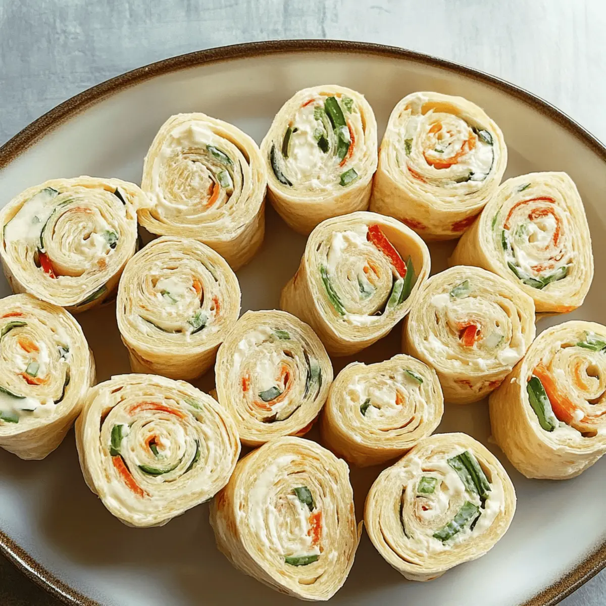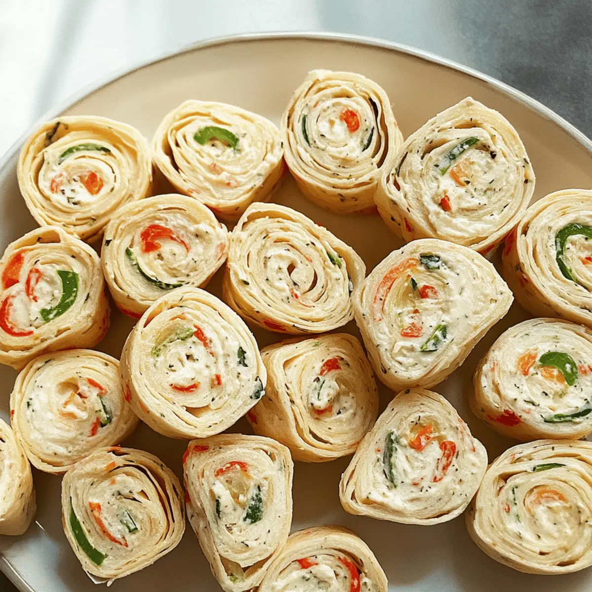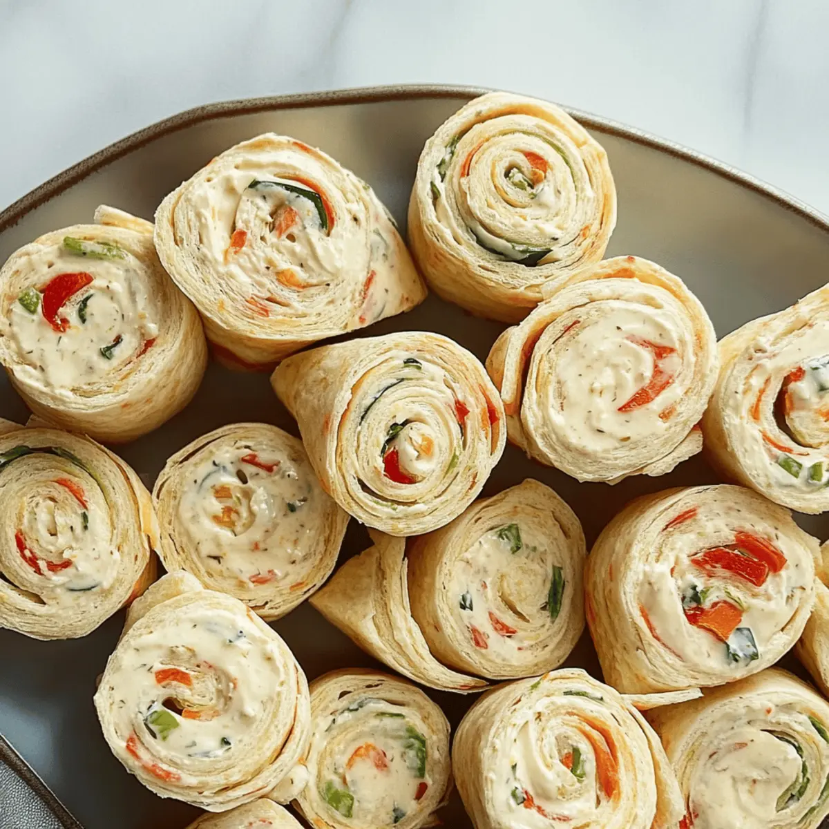 Step into my kitchen for a moment, where the delightful aroma of festive spices wafts through the air, hinting at the joy of holiday gatherings. Today, I’m excited to share my Christmas Pinwheels, a quick appetizer that transforms a simple tortilla into a vibrant party pleaser. With just 15 minutes of prep time (plus a little chill), these make-ahead delights come together with creamy ranch-flavored cheese and a colorful medley of crunchy vegetables. They are not only a breeze to whip up but also a vegetarian-friendly treat that even the pickiest of eaters will enjoy. Perfect for those bustling holiday parties or cozy family get-togethers, these pinwheels are sure to bring smiles and satisfaction. Ready to impress your guests? Let’s roll into the details of this delicious recipe! Why Are These Christmas Pinwheels a Must-Try? Simplicity, The straightforward preparation takes just 15 minutes, making them accessible for both novice cooks and seasoned chefs alike. Colorful, Their festive appearance not only brightens any platter but also makes them visually enticing for holiday gatherings. Flavor-Packed, The creamy ranch-flavored cheese paired with crunchy vegetables creates a delightful blend that will please all palates. Make-Ahead, Perfect for busy schedules, these pinwheels can be prepared a day in advance, giving you more time to enjoy the festivities. Versatile, Feel free to swap ingredients based on your taste or what’s on hand—try different vegetables or flavored tortillas for a unique twist! Serve these on a stunning platter alongside a side of ranch dressing for dipping, and watch them disappear. For more festive appetizer ideas, check out my post on quick holiday snacks! Christmas Pinwheels Ingredients For the Filling Cream Cheese – Provides richness and a creamy texture; ensure it’s softened for easy mixing. Ranch Dressing Mix – Adds flavor and seasoning; consider using homemade ranch seasoning for a fresher taste. Sweet Red Pepper – Gives a sweet crunch; you can substitute with any color bell pepper for variety. Celery – Contributes a refreshing crunch; crisp cucumbers make a great substitute if preferred. Green Onions – Adds mild onion flavor; chives work similarly if you want a change. Pimento-Stuffed Olives – Adds a salty and briny flavor; omit them if not preferred and add more green onions instead. For the Base Flour Tortillas (10 inches) – The ideal wrap for the filling; colored tortillas can create a festive visual appeal. Create these delicious Christmas Pinwheels to enhance your holiday gatherings with vibrant flavors and cheerful colors! Step‑by‑Step Instructions for Christmas Pinwheels Step 1: Prepare the Creamy Filling In a large mixing bowl, beat 8 ounces of softened cream cheese and 1 packet of ranch dressing mix together with an electric mixer on medium speed until smooth and creamy, about 2 minutes. The mixture should be fluffy and spreadable. This creamy base will be the heart of your delicious Christmas Pinwheels, enhancing the festive flavors that await. Step 2: Incorporate Vegetables Next, add 1/2 cup each of finely diced sweet red pepper, chopped celery, and sliced green onions into the bowl with the cream cheese mixture. Gently fold the vegetables into the cream cheese using a spatula until they are evenly distributed, about 1-2 minutes. The bright colors should be visible throughout the filling, giving your Christmas Pinwheels a vibrant look. Step 3: Add Optional Ingredients If desired, stir in 1/4 cup of minced pimento-stuffed olives for a salty kick, or substitute with extra green onions for a milder flavor. Mix until fully combined, ensuring each bite of the filling will bring a burst of flavor. This step is crucial as it adds depth and adds a delightful surprise to your festive Christmas Pinwheels. Step 4: Assemble the Pinwheels Layout a large flour tortilla (10 inches in diameter) on a clean cutting board. Spread approximately 3/4 cup of the prepared filling evenly across the tortilla, leaving about an inch of space around the edges. It should reach the sides without overflowing, ensuring a neat roll. This is the foundation for building your colorful and creamy Christmas Pinwheels. Step 5: Roll and Wrap Starting from one end, tightly roll the tortilla, ensuring the filling stays inside as you go. Once rolled, place the pinwheel seam-side down on a piece of plastic wrap. Tightly wrap the plastic around the roll to secure it and prevent any filling from escaping. This helps maintain the shape and makes for easier slicing later on. Step 6: Chill for Firmness Refrigerate the wrapped pinwheels for at least 2 hours, or overnight if possible. The chilling process will help the filling firm up, making it easier to slice and giving the flavors time to meld together. You’ll know they’re ready when they feel firm to the touch, ensuring perfectly shaped Christmas Pinwheels for your holiday gathering. Step 7: Slice and Serve Once chilled, remove the pinwheels from the refrigerator and unwrap them from the plastic. Using a sharp knife, slice each roll into 1/2-inch thick pinwheels. Arrange the delightful, colorful slices on a festive platter, ready for your guests to enjoy. These visually appealing Christmas Pinwheels are now ready to serve as a quick appetizer and holiday treat! Make Ahead Options These Christmas Pinwheels are a fantastic option for meal prep, allowing you to save time and enjoy festive moments without a rush! You can prepare the filling (cream cheese mixture with vegetables) up to 24 hours in advance; simply store it covered in the refrigerator to maintain its freshness. Additionally, the assembled pinwheels can be wrapped tightly in plastic and refrigerated for up to 3 days before serving. To ensure the pinwheels remain delightful and colorful, slice them just before your gathering. When ready to serve, slice and arrange them on a platter—voilà! You’ll have a beautiful and delicious appetizer that’s just as