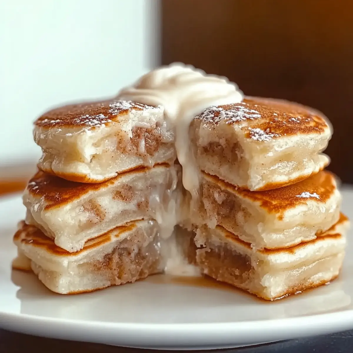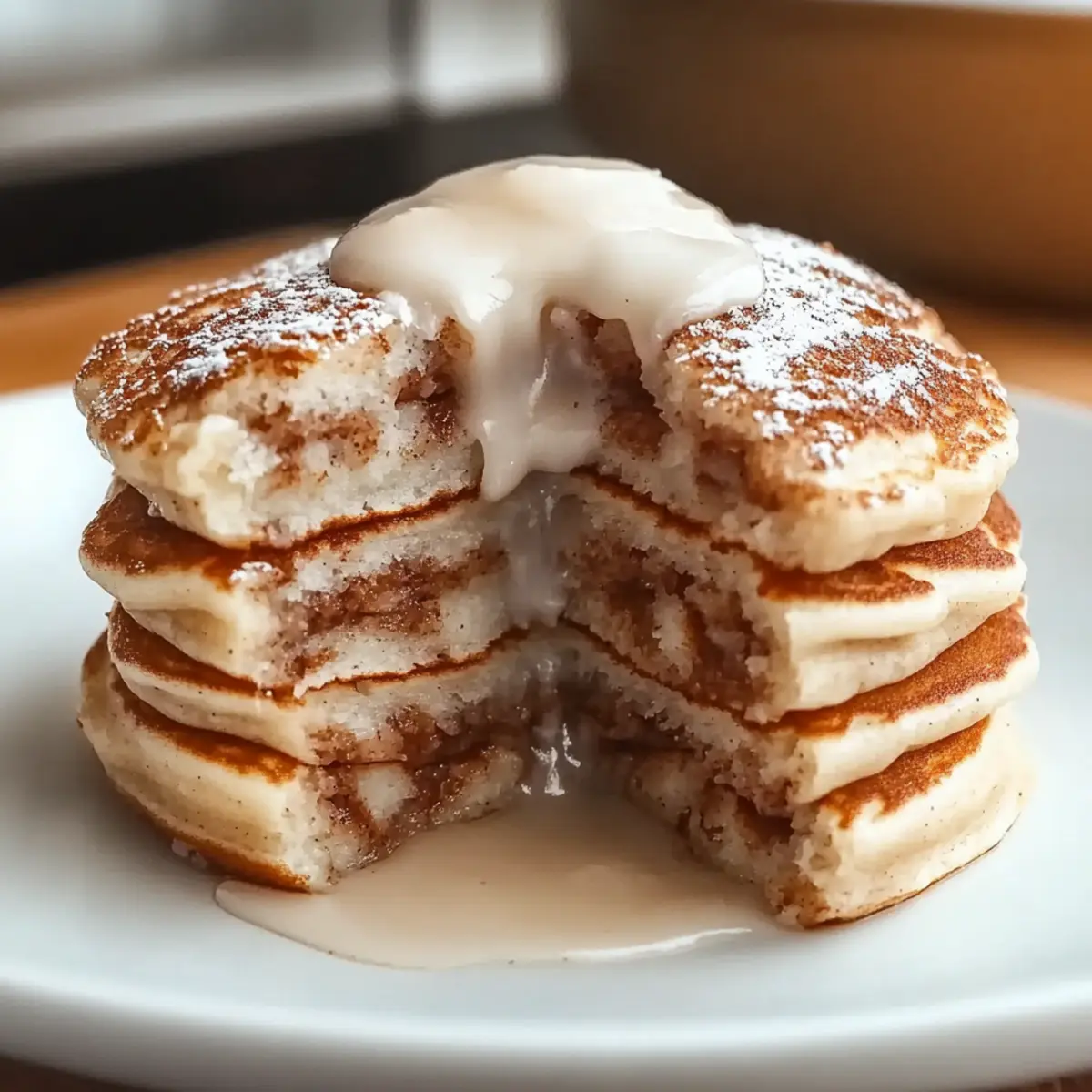 As I flipped the last fluffy pancake, a sweet aroma swept through my kitchen, instantly transporting me back to childhood breakfasts filled with chatter and laughter. Today, I’m sharing my delightful recipe for Cinnamon Roll Pancakes, where comfort food meets brunch magic. With their warm, gooey cinnamon swirls and a creamy glaze drizzled on top, these pancakes are not just delicious but incredibly easy to whip up—perfect for a cozy family gathering or a special weekend treat. Plus, I’ve got you covered with gluten-free and vegan options, so everyone can enjoy this delectable twist on a classic. Are you ready to indulge in the joy of homemade breakfast bliss? Let’s get started! What Makes These Pancakes Irresistible? Fluffy Texture: Each bite offers a perfect balance of fluffiness and moisture, ensuring a satisfying start to your day. Gooey Surprises: The buttery cinnamon swirl hidden inside adds a delightful surprise that enhances the overall experience. Simple to Prepare: This recipe is straightforward, allowing even novice chefs to create a lovely brunch treat without stress. Diet-Friendly: Offering gluten-free and vegan options means that nobody has to miss out on this indulgent delight! For other incredible options, consider exploring these Philly Cheesesteak Rolls for an easy dinner or Cinnamon Sugar Cruffins for a sweet treat. Perfect for Sharing: The warm, inviting aroma will draw friends and family to your kitchen, making these pancakes the highlight of any gathering. Cinnamon Roll Pancake Ingredients For the Pancake Batter • Flour – Essential for structure; use a gluten-free flour blend for dietary needs. • Baking Powder – Helps the pancakes rise; make sure it’s fresh to avoid flat cakes. • Salt – Enhances flavor; sea salt adds an extra touch. • Milk – Moistens the batter; substitute with non-dairy milk for a vegan option. • Egg – Binds everything together; replace with a flax egg for vegan pancakes. • Vegetable Oil – Adds moisture; melted butter can give a richer flavor. For the Cinnamon Filling • Melted Butter – Provides richness to the swirl; can substitute with vegetable oil. • Brown Sugar – Sweetens the filling; light or dark brown sugar works well. • Ground Cinnamon – The star flavor; add nutmeg for an extra flavor punch. For the Cream Cheese Glaze • Cream Cheese – Creates a luscious glaze; mascarpone is a tasty alternative. • Powdered Sugar – Sweetens the glaze; adjust to your preferred sweetness. • Vanilla Extract – Amplifies flavor; pure vanilla is recommended for the best taste. Dive into the delightful world of Cinnamon Roll Pancakes and experience the gooey goodness with every bite! Step‑by‑Step Instructions for Cinnamon Roll Pancakes Step 1: Prepare Cinnamon Filling In a bowl, combine the melted butter, brown sugar, and ground cinnamon, stirring until the mixture is smooth and well-blended. Transfer this delicious filling into a ziplock bag, sealing it tightly, and allow it to thicken at room temperature for about 10–15 minutes. This step is essential for achieving the perfect swirl in your Cinnamon Roll Pancakes. Step 2: Make Pancake Batter In a large mixing bowl, whisk together the flour, baking powder, and salt until well combined. Gradually add the milk, vegetable oil, and beaten egg, stirring gently until the batter is just mixed. It’s okay if a few lumps remain, as this will make your pancakes fluffy. Set the bowl aside and let the batter rest for a few minutes. Step 3: Make Cream Cheese Glaze In a microwave-safe bowl, combine the cream cheese and melted butter. Heat on medium power for about 20-30 seconds or until warm, and then whisk together until smooth. Gradually blend in the powdered sugar and vanilla extract, mixing until the glaze is creamy and glossy. This luscious glaze will top your warm Cinnamon Roll Pancakes beautifully. Step 4: Cook Pancakes Heat a non-stick skillet over low heat, allowing it to warm up gently. Pour ½ cup of pancake batter onto the skillet, creating a circle. Using the ziplock bag, pipe the prepared cinnamon filling into a swirl pattern on top of the batter. Cook the pancakes for about 2-3 minutes or until bubbles begin to form on the surface, then carefully flip and cook for an additional 1-2 minutes until golden brown. Step 5: Serve Stack your fluffy Cinnamon Roll Pancakes on a warm plate, allowing the sweet aroma to envelop your kitchen. Generously drizzle the cream cheese glaze over the top and let it cascade down the sides. For an extra treat, consider adding optional toppings like a dusting of powdered sugar or a handful of chopped nuts for added texture and flavor. What to Serve with Cinnamon Roll Pancakes Elevate your breakfast experience by pairing these delightful pancakes with a variety of savory and sweet accompaniments. Crispy Bacon: The salty crunch of bacon balances the sweetness of the pancakes, giving your plate a delicious contrast in flavors. Fresh Fruit Salad: A medley of seasonal fruits brings a refreshing burst of flavor, perfectly complementing the rich, sweet pancakes. Consider vibrant strawberries, blueberries, and juicy melon—a colorful bite of summer! Yogurt Parfait: Layering creamy yogurt with granola and fresh berries adds a delightful crunch and tangy sweetness, enriching your brunch experience. Maple Syrup: A classic choice that enhances the warm spices in the pancakes, its rich sweetness beautifully harmonizes with the velvety cream cheese glaze. Nutty Granola: A sprinkle of nutty granola on top offers a satisfying crunch and additional flavor depth while enhancing the pancake’s homemade charm. Iced Coffee: A cool, invigorating drink pairs perfectly with warm pancakes, keeping your brunch refreshing and delightful. Herbal Tea: A light, aromatic herbal tea can cleanse the palate and serve as a soothing counterpoint to the sweet indulgence. Chocolate Chip Cookies: For a fun twist, offer some chocolate chip cookies on the side—e