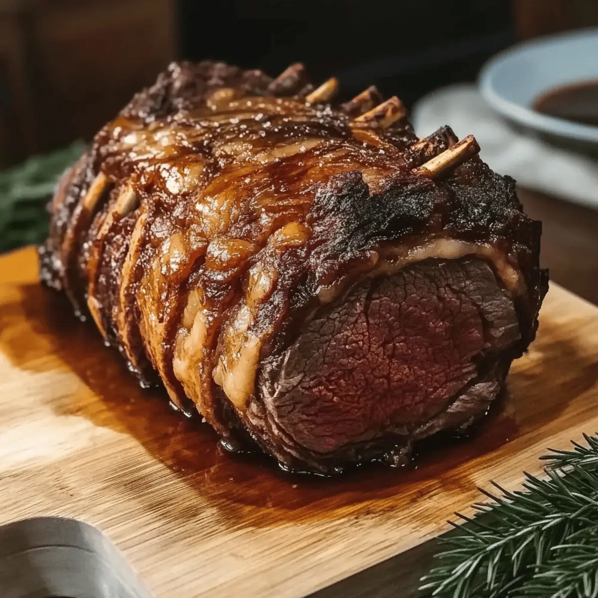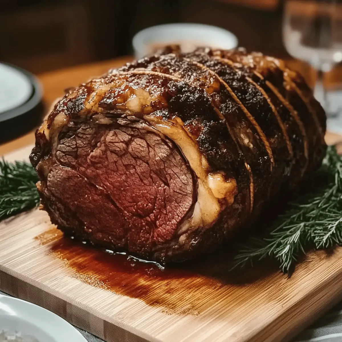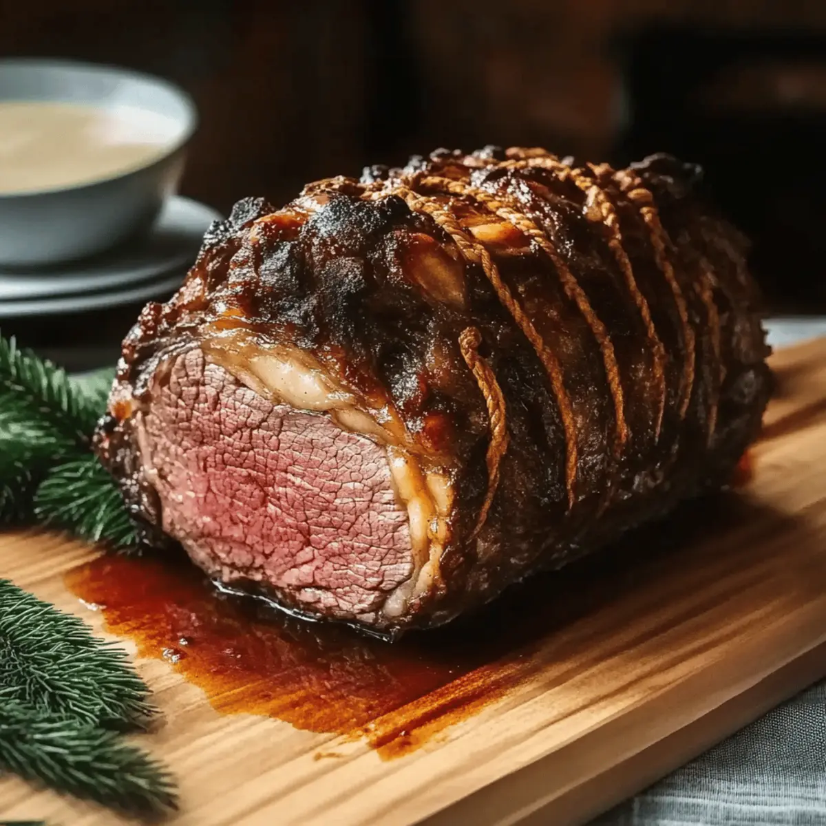 The aroma of freshly roasted beef wafting through the kitchen can transport you back to cherished holiday gatherings. This Classic Christmas Prime Rib recipe will turn your festive dinner into an unforgettable experience, complete with tender, juicy meat that will have everyone clamoring for more. One of the best parts? This straightforward recipe means you can impress your family without spending endless hours in the kitchen. With a juicy roast that pairs beautifully with a rich au jus and zesty horseradish sauce, you’re not just serving dinner; you’re creating memories. So, are you ready to make this holiday centerpiece the star of your table? Let’s get started! Why is Prime Rib a Holiday Favorite? Decadent Flavor: This recipe boasts a melt-in-your-mouth tenderness that showcases the rich, savory flavor only prime rib can provide. Simplicity: With straightforward steps and minimal prep, you can focus on enjoying the festivities rather than stressing over complicated cooking techniques. Impressive Centerpiece: Serves as the ultimate showstopper for your holiday table, making any dinner party feel like a gourmet experience. Versatile Pairing: The juicy roast pairs beautifully with classic sides like creamy mashed potatoes or roasted Brussels sprouts, ensuring there’s something for everyone. Time-Saving: Your guests can’t believe how quickly you whip up this sumptuous meal, leaving you ample time to savor each moment. Elevate your cooking game this holiday season, and don’t forget to check out our tips for making creamy mashed potatoes or a zesty horseradish sauce that’s perfect with your prime rib! Classic Christmas Prime Rib Ingredients • Get ready to create a culinary masterpiece that will delight your holiday guests! For the Roast Prime Rib Roast – Essential for a flavorful and tender result; opt for “Prime” or “Choice” grade for the best quality. Kosher Salt (30 grams) – Aids in dry brining to enhance flavor; be sure to brine for at least 24 hours! Olive Oil (3 tablespoons) – Used for browning the meaty bones to develop a rich and robust sauce. For the Au Jus Meaty Bones (3 pounds) – Adds depth to the au jus; oxtails or neck bones are great substitutes! Garlic (5 cloves) – Infuses aromatic flavor into the au jus; don’t skip this step! Carrots (2 large), Celery (3 ribs), Onion (1) – Essential vegetables for the au jus that offer sweetness and complexity. Tomato Paste (1 tablespoon) – Thickens and enriches the au jus, giving it that velvety texture. Dry Red Wine (1/2 cup) – Helps deglaze the pot and introduces acidity; a splash really elevates the sauce. Low-Sodium Beef Stock (6 cups) – The heartbeat of your au jus; provides richness while managing the salt content. Thyme (2 sprigs) & Bay Leaf (1) – Aromatic herbs that bring delightful flavor notes to the au jus. For the Horseradish Sauce Sour Cream (1 cup) – Forms the creamy base for the sauce; balances the zesty flavors nicely. Prepared Horseradish (5 tablespoons) – Adds that spicy kick perfect for pairing with prime rib. Dijon Mustard (1 tablespoon) – Introduces a tangy depth that rounds out the sauce beautifully. Worcestershire Sauce (2 teaspoons) – A touch of umami flavor to elevate the overall taste. Mayonnaise (2 tablespoons) – Contributes creaminess; it’s the secret ingredient for a luscious sauce! Get ready to embark on a culinary journey this holiday season with the Classic Christmas Prime Rib! Step‑by‑Step Instructions for Juicy Classic Christmas Prime Rib Step 1: Brine the Roast Begin by generously coating the prime rib roast with kosher salt, ensuring it’s evenly covered on all sides. This dry brining process not only enhances flavor but also ensures tenderness. Wrap the roast in plastic and refrigerate for at least 24 hours before cooking. This advanced preparation is essential for achieving a delectable Classic Christmas Prime Rib that your family will rave about. Step 2: Prepare Room Temp On the day of cooking, remove the brined prime rib from the refrigerator and let it sit at room temperature for 5-6 hours. This step is crucial, as it allows the meat to come to an even temperature, promoting consistent cooking and a beautifully pink center. While waiting, you can start to gather your other ingredients for the au jus, ensuring you’re ready for the next steps. Step 3: Preheat Oven Preheat your oven to a low temperature of 250°F (120°C). A gentle roast will allow your prime rib to cook slowly and evenly, resulting in incredibly tender meat. Arrange your oven racks so that there’s enough space for the roast to fit comfortably. Setting such a low temperature will make your Classic Christmas Prime Rib truly melt in your mouth. Step 4: Prepare the Au Jus In a large pot, heat the olive oil over medium heat, then add the meaty bones and brown them for 10-12 minutes. This adds rich flavor to the au jus. Next, toss in minced garlic, chopped carrots, celery, and onion, cooking for another 10 minutes until the vegetables are softened and fragrant. Stir in the tomato paste, then deglaze the pot with red wine, scraping up any browned bits at the bottom. Step 5: Simmer the Au Jus After deglazing, pour in the low-sodium beef stock, adding thyme and bay leaf to the mixture. Bring this flavorful concoction to a gentle simmer while your Classic Christmas Prime Rib cooks in the oven. Keep the au jus warm and allow the flavors to deepen, stirring occasionally. This rich gravy will perfectly complement your roast. Step 6: Cook the Roast Insert a meat thermometer into the thickest part of the prime rib, ensuring it doesn’t touch the bone. Cook the roast in the preheated oven until the internal temperature reaches 115°F for rare or 120°F for medium-rare, which typically takes about 3 hours. Monitor the temperature closely during the final phases of cooking; your Classic Christmas Prime Rib will shine when perfectly cooked. Step 7: Rest the Roast Once the roast has reach
