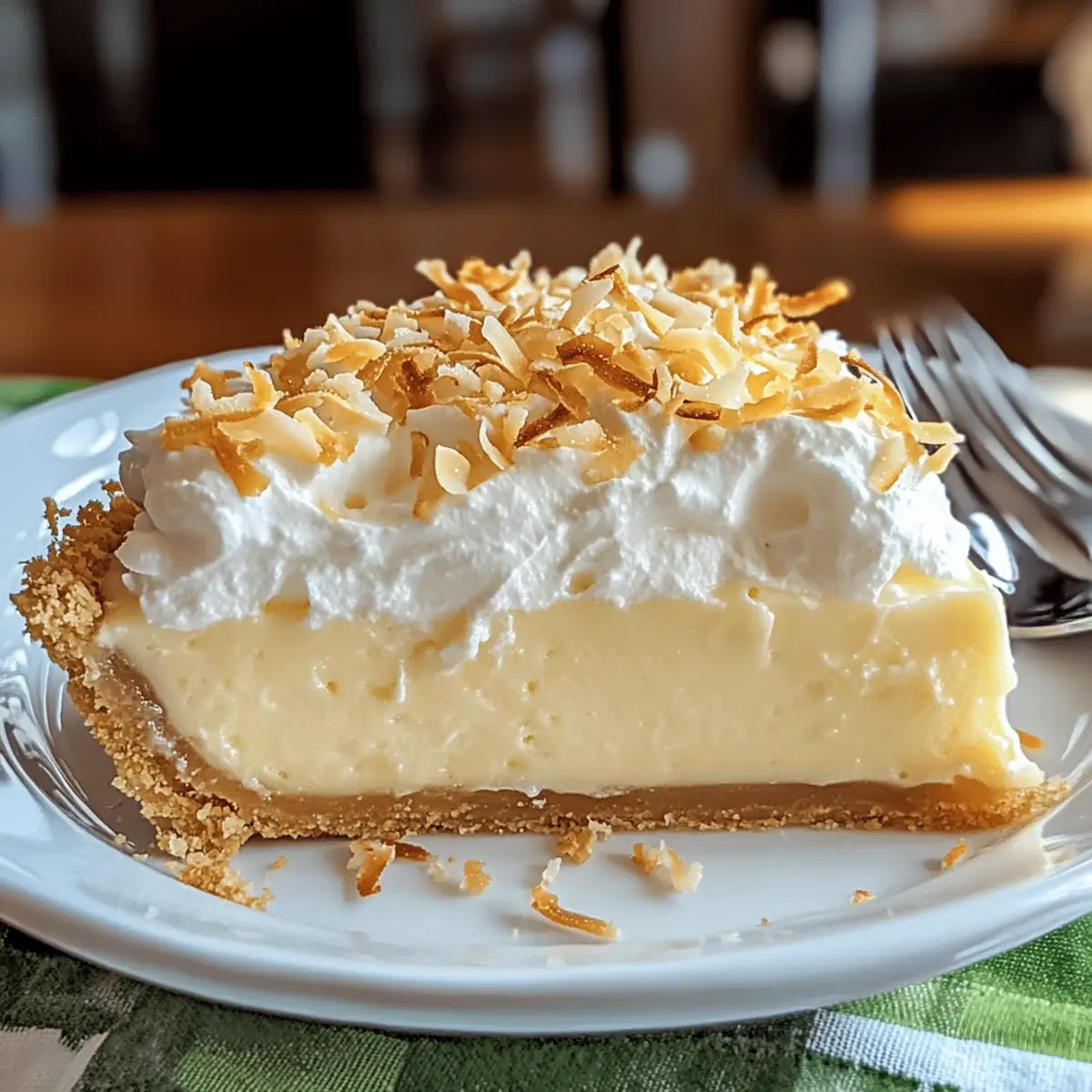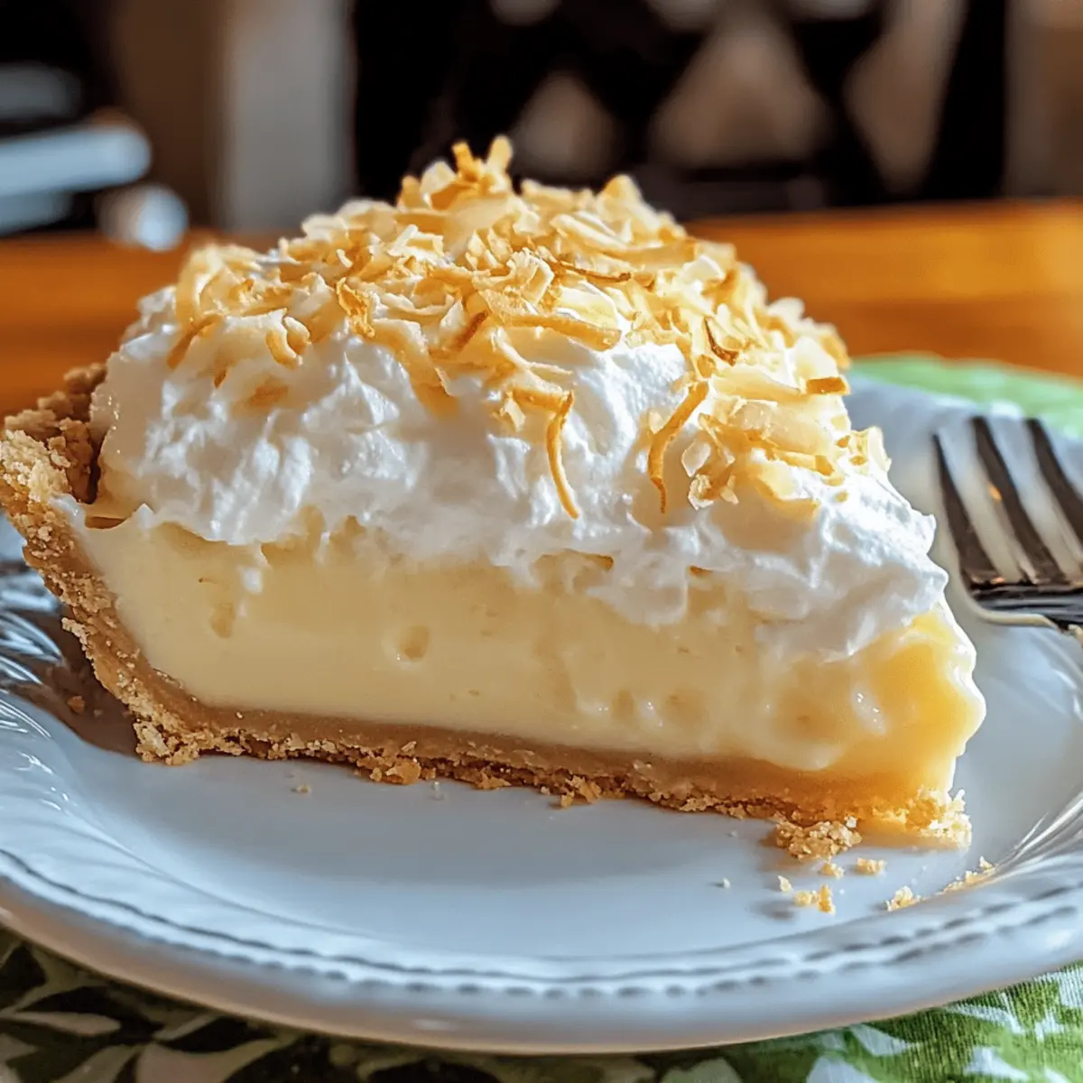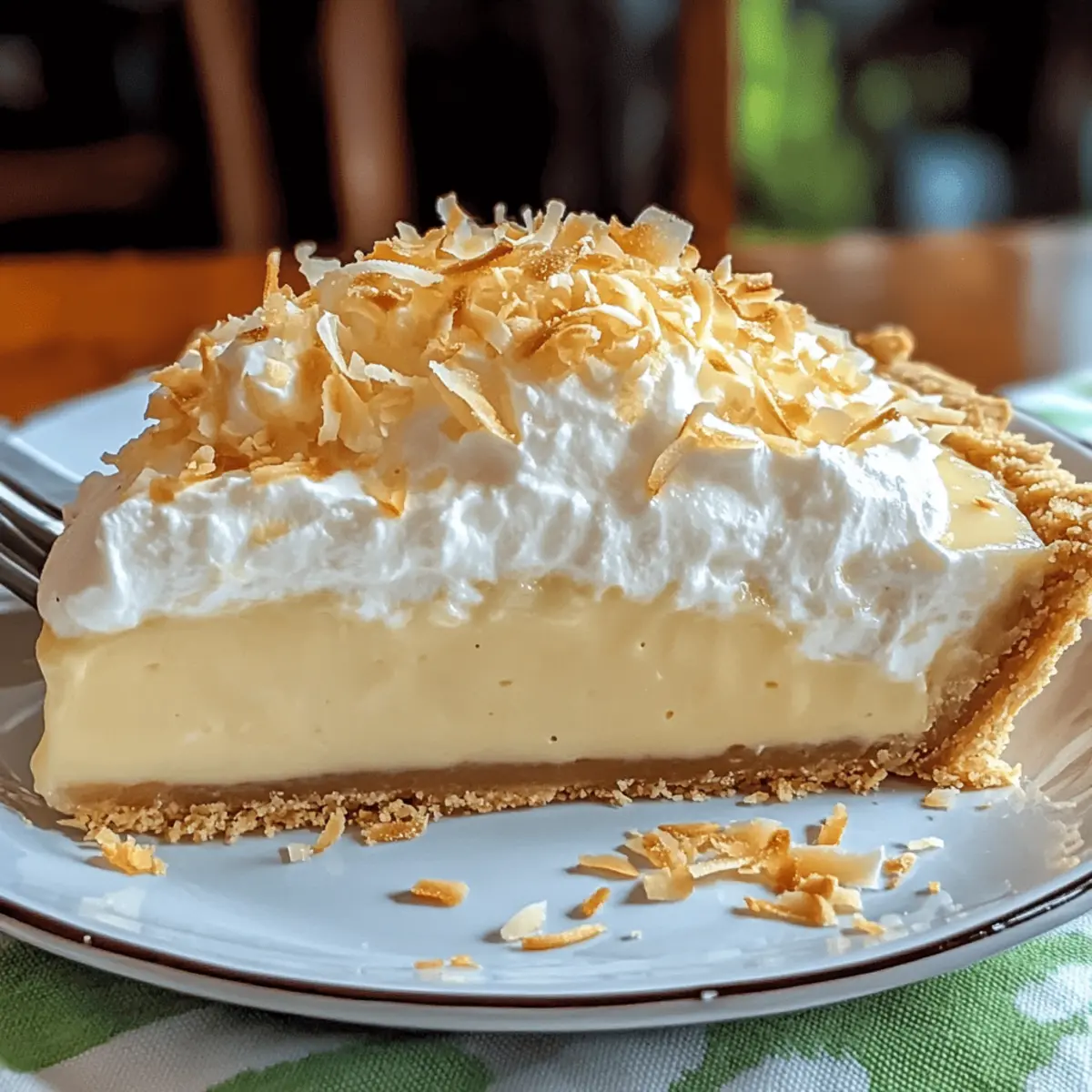 As I slid the tropical Coconut Cream Pie from the refrigerator, the cool, inviting scent of coconut wafted through the kitchen, instantly transporting me to a sun-soaked beach. This delightful Coconut Cream Pie recipe combines a buttery, flaky crust with a luscious coconut custard filling, topped with fluffy whipped cream that promises to be a crowd-pleaser at any gathering. Not only is it a satisfying dessert that feels like a mini holiday on each plate, but it also comes together surprisingly quickly, making it the perfect treat for busy nights or spontaneous celebrations. Are you ready to whip up this tropical delight and impress your friends and family? Why Is This Coconut Cream Pie Special? Decadent and Tropical: This Coconut Cream Pie elevates your dessert game with its rich, velvety filling that transports you straight to a sunny beach. Quick Preparation: Save time in the kitchen! This recipe comes together swiftly, making it perfect for those with a busy schedule. Classic Appeal: A timeless favorite, it’s sure to delight guests of all ages at family gatherings or holiday celebrations. Irresistible Texture: The contrast between the buttery crust, creamy filling, and fluffy whipped cream creates a dessert experience that’s simply unforgettable. Endless Versatility: Want to switch it up? Try adding layers of fresh fruit or chocolate shavings for a fun twist! If you love a tropical touch, consider pairing it with these delightful Coconut Mango Popsicles for a fruity complement. Coconut Cream Pie Ingredients For the Crust All-Purpose Flour (1 ¼ cups) – The base for the crust, giving it structure. Substitution: Gluten-free all-purpose flour for a gluten-free option. Salt (¼ teaspoon) – Enhances flavor. No substitutions necessary. Cold, Cubed Butter (½ cup) – Adds richness and flakiness to the crust. Substitution: Margarine for a dairy-free version. Ice Water (Up to ½ cup) – Binds the dough. Substitution: Chilled vodka may be used to enhance flakiness. For the Coconut Custard Filling Milk (1 cup) – The creamy base for the custard. Substitution: Almond or coconut milk for a dairy-free version. Heavy Cream (1 cup) – Adds a luscious richness to the filling. Substitution: Coconut cream for a more pronounced coconut flavor. Shredded Coconut (1 cup) – Provides delightful texture and flavor. Substitution: Sweetened vs. unsweetened based on preference. Granulated Sugar (¾ cup) – Sweetens the filling perfectly. No substitutions necessary. Egg Yolks (4) – Thickens and enriches the custard. No substitutions; whole eggs not recommended here. Cornstarch (2 tablespoons) – Acts as a thickening agent for the custard. Substitution: Arrowroot powder for a similar effect. Salt (¼ teaspoon) – Balances the sweetness of the filling. No substitutions necessary. Butter (2 tablespoons) – Enhances flavor and richness in the filling. No substitutions necessary. Vanilla Extract (1 teaspoon) – Adds depth of flavor to the custard. No substitutions necessary. Coconut Extract (optional, ½ teaspoon) – Intensifies the coconut flavor. Omit if not available. For the Whipped Topping Heavy Cream (for whipped topping, 1 cup) – The base for the light and fluffy whipped cream. No substitutions necessary. Powdered Sugar (2 tablespoons) – Sweetens the whipped cream nicely. Substitution: Granulated sugar can be used, but will not dissolve as quickly. Vanilla Extract (1 teaspoon) – Enhances the flavor of the whipped cream. No substitutions necessary. Whipping together these ingredients will have you on your way to making an unforgettable Coconut Cream Pie Recipe that your friends and family will love! Step‑by‑Step Instructions for Coconut Cream Pie Recipe Step 1: Prepare the Pie Crust Preheat your oven to 375°F (190°C). In a large mixing bowl, combine 1 ¼ cups of all-purpose flour with ¼ teaspoon of salt. Cut in ½ cup of cold, cubed butter using a pastry blender until the mixture resembles coarse crumbs. Gradually stir in ice water, one tablespoon at a time, until the dough forms. Chill for 30 minutes, then roll the dough into a 12-inch circle, place it in your pie dish, and prick the bottom with a fork. Bake for 10-12 minutes, or until lightly golden, then let it cool completely. Step 2: Make Coconut Cream Filling In a medium saucepan, combine 1 cup of milk, 1 cup of heavy cream, and 1 cup of shredded coconut. Heat over medium, stirring continuously until simmering. While it heats, whisk together 4 egg yolks, ¾ cup of granulated sugar, 2 tablespoons of cornstarch, and ¼ teaspoon of salt in a separate bowl until smooth. Temper the egg mixture by gradually adding hot milk while whisking, then return it to the saucepan. Cook over medium heat, whisking constantly, until the mixture thickens (about 5-7 minutes). Stir in 2 tablespoons of butter and 1 teaspoon of vanilla extract for added richness. Step 3: Assemble the Pie Once the filling is thick and creamy, pour it into the cooled pie crust evenly. Cover the pie with plastic wrap and refrigerate for at least 3 hours, allowing the filling to set properly. You’ll know it’s ready when the custard is firm to the touch but still slightly jiggly at its center. Step 4: Prepare Whipped Cream Topping In a mixing bowl, combine 1 cup of heavy cream, 2 tablespoons of powdered sugar, and 1 teaspoon of vanilla extract. Using an electric mixer, beat on medium-high speed for 3-5 minutes until soft peaks form. The whipped cream should be light and fluffy, perfect for topping your Coconut Cream Pie. Spread it generously over the chilled filling, creating a delightful meringue-like layer that adds a lovely contrast. Step 5: Serve and Enjoy Slice the Coconut Cream Pie into 8 generous slices for serving. To elevate the presentation, consider garnishing with toasted coconut flakes for an added crunch. Keep the pie refrigerated until serving to ensure it stays fresh and creamy, providing you with the ultimate tropical dessert experience! Coconut C