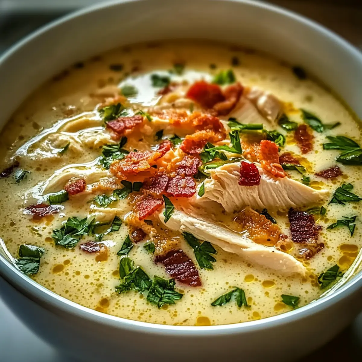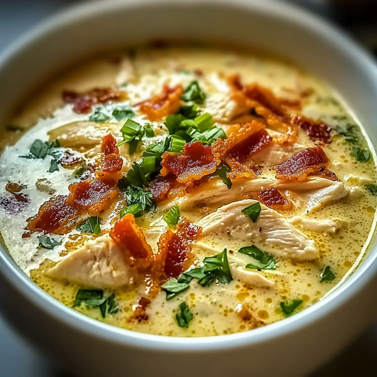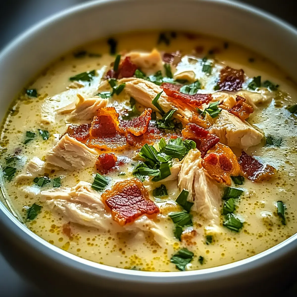 The warm aroma of chicken simmering on the stove instantly transports me to sweet memories of family gatherings and cozy evenings. My favorite dish during those times? This Creamy Crack Chicken Soup! Packed with tender chicken, silky cream cheese, and those irresistible crunchy bacon bits, it’s a comforting hug in a bowl that keeps you coming back for more. The beauty of this quick recipe is that it comes together in under 30 minutes, making it the ideal weeknight solution for those tired of typical fast food fare. Plus, its customizable nature means everyone at the table can savor it in their own way, whether by opting for gluten-free ingredients or adding their favorite veggies. Ready to dive into a bowl of homemade goodness? Let’s get cooking! Why is Crack Chicken Soup a must-try? Comforting Warmth: This delicious soup wraps you in a cozy embrace, making it perfect for chilly evenings. Quick & Easy: With just 30 minutes of prep, you can serve a hearty meal without the fuss. Customizable Delight: Tailor it to fit every dietary need—swap in veggies for a vegetarian option or choose gluten-free alternatives! Flavor Bomb: The combination of creamy cheese and crispy bacon creates a mouthwatering flavor profile that’s hard to resist. Crowd-Pleaser: Whether for dinner parties or family meals, this soup will impress guests and satisfy even the pickiest eaters. For more comforting inspiration, check out my Honey Bourbon Chicken or try a warm bowl of Mushroom Soup Without. Crack Chicken Soup Ingredients • Get ready for a cozy feast with these must-have ingredients! For the Soup Base Chicken Breasts/Thighs – The star of the show; cooked and shredded for optimal tenderness. Chicken Broth – Use low-sodium for a healthier soup that still packs in the flavors. For Creaminess Cream Cheese – This brings rich, velvety goodness; low-fat options keep it lighter. Shredded Cheddar Cheese – Adds a cheesy punch; substitute with mozzarella or gouda if desired. For Crunch Bacon Bits – Optional, but they add delightful crispiness; turkey bacon works for a healthier twist. For Freshness Green Onions/Chives – Sprinkle on top for a fresh flavor and garnish that brightens the dish. For Seasoning Salt and Pepper – Essential for enhancing all the delicious flavors; season to your taste. Now that you have everything you need, let’s dive into crafting this heavenly Crack Chicken Soup! Step‑by‑Step Instructions for Crack Chicken Soup Step 1: Boil the Chicken In a large pot, fill with water and bring it to a boil over medium-high heat. Add the chicken breasts or thighs and let them simmer for about 15-20 minutes until fully cooked. Check for doneness by ensuring the juices run clear when pierced. Once cooked, carefully remove the chicken, shred it into bite-sized pieces with two forks, and set aside to prepare for the Crack Chicken Soup. Step 2: Create the Soup Base In the same pot, pour in the chicken broth over medium heat and add the cream cheese along with salt and pepper to taste. Stir continuously for about 5 minutes, allowing the cream cheese to melt smoothly into the broth. Keep an eye on it, as the mixture should become silky and creamy. Once combined, it sets the perfect base for your delicious Crack Chicken Soup. Step 3: Add the Cheese Next, sprinkle in the shredded cheddar cheese, stirring gently as it melts into the soup. Allow this to simmer for an additional 3-4 minutes, ensuring the cheese is fully incorporated. You’ll know it’s ready when the soup is thick and creamy with a rich cheese flavor permeating through. This step makes the Crack Chicken Soup indulgently creamy and satisfying. Step 4: Stir in the Chicken Introduce the shredded chicken back into the pot and gently fold it into the soup mixture. Lower the heat and let it simmer for another 5 minutes; this allows the flavors to meld beautifully. As you stir, watch for the soup to bubble slightly, signaling that it’s warmly heating through. This will add a comforting richness to your Crack Chicken Soup. Step 5: Garnish and Serve Finally, ladle the steaming Crack Chicken Soup into bowls. To elevate the dish, sprinkle freshly chopped green onions or chives on top for a pop of color and flavor. Serve hot, optionally alongside crusty bread for dipping or in bread bowls for fun presentation. Enjoy the comforting warmth of this hearty soup with your family! Make Ahead Options These Crack Chicken Soup is a fantastic choice for meal prep lovers! You can cook and shred the chicken up to 24 hours in advance, storing it in the refrigerator to maintain its tenderness. Additionally, the creamy base of the soup can be prepared ahead—combine the chicken broth and cream cheese, then refrigerate. When you’re ready to finish cooking, simply reheat the mixture on low heat, stir in the cheddar cheese, and add the shredded chicken just before serving. This method not only saves you time during busy weeknights but also ensures your soup remains just as delicious and comforting! Expert Tips for Crack Chicken Soup • Avoid Dry Chicken: Ensure your chicken is fully cooked but not overboiled. Overcooking can render chicken dry and less enjoyable in the Crack Chicken Soup. • Smooth Creaminess: Continuously stir while adding cream cheese to prevent lumps. This helps achieve that perfect, silky texture in your soup. • Season Gradually: Taste your soup as you adjust the seasoning. Adding salt and pepper gradually ensures a balanced flavor throughout. • Reheat Gently: When reheating leftovers, use low heat. This helps maintain the creaminess of your Crack Chicken Soup without making it curdle. • Prep Ahead: To save time, prepare your chicken and chop ingredients in advance. This makes it even quicker to whip up on a busy weeknight. How to Store and Freeze Crack Chicken Soup Fridge: Store leftover Crack Chicken Soup in an airtight container for up to 4 days. Allow it to cool completely before sealing to prevent condensation. Freezer: