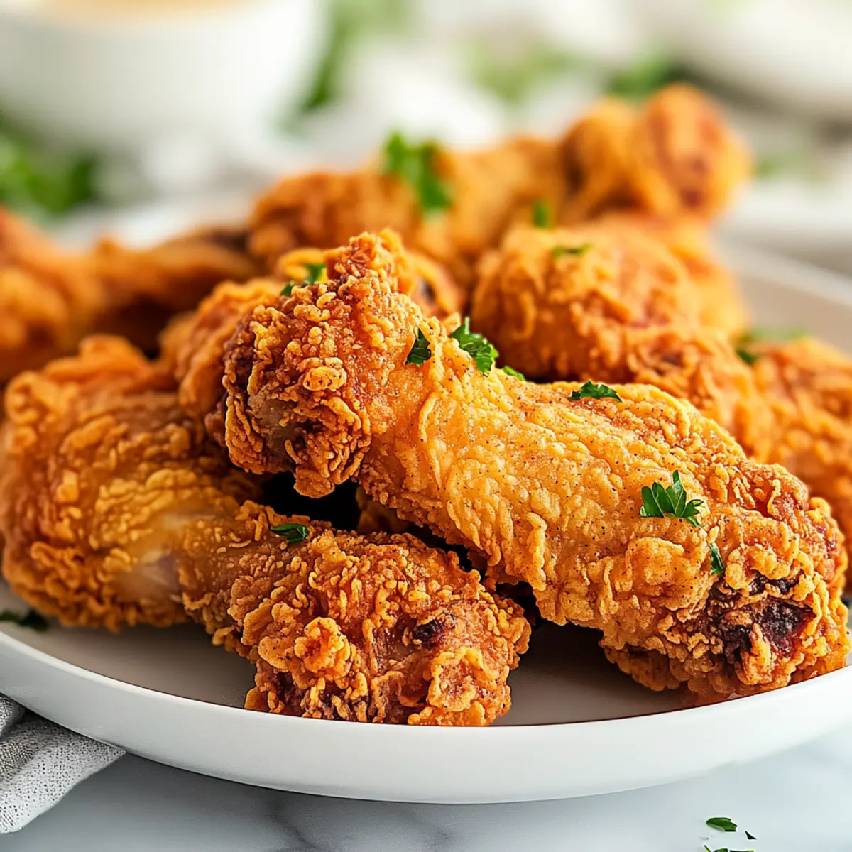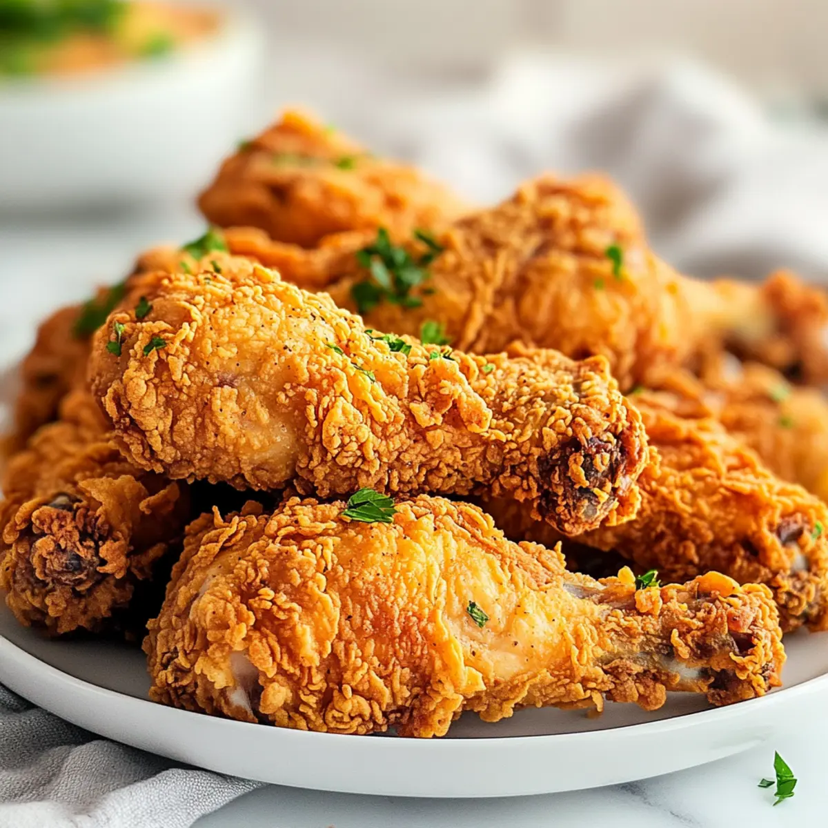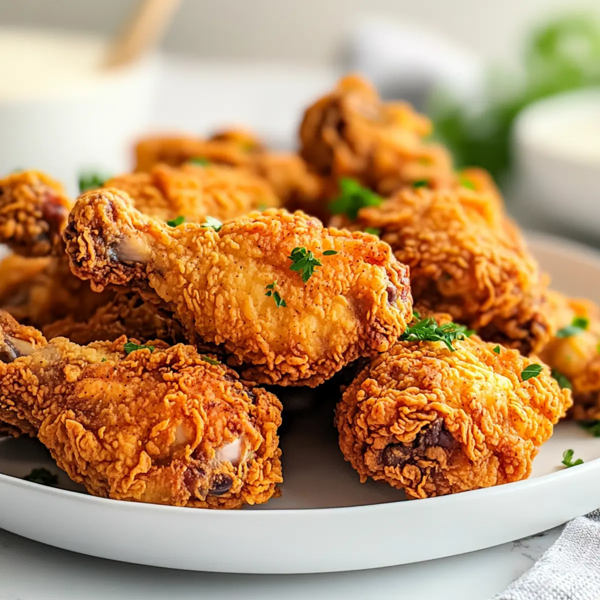 As I stood in my kitchen, the enticing aroma of sizzling oil filled the air, instantly transporting me back to family gatherings where crispy fried chicken was the star of the show. This recipe for Ultimate Crispy Buttermilk Fried Chicken is the ultimate comfort food experience, marrying a perfectly crunchy exterior with juicy, flavorful meat. With just a few simple steps, you can impress your friends and family, making this dish not only a crowd-pleaser but also a fun culinary project to tackle on the weekends. Plus, it’s freezer-friendly for those busy weeknights when fast food just won’t cut it! Are you ready to lift the lid on frying techniques that will elevate your chicken game? Let’s dive in! Why Is This Chicken Recipe Special? Crispy Texture: The secret to that irresistible crunch lies in the perfect dredging mixture infused with flavorful spices and just the right amount of baking powder. Marination Magic: Buttermilk not only tenderizes the chicken but also deepens its flavor, ensuring every bite is juicy and succulent. Weekend Fun: This recipe doubles as a fun culinary project that brings family and friends together in the kitchen. Freezer-Friendly: Make a batch and freeze it for easy weekday meals, just like my Crispy Rice Paper Egg Wraps for quick, satisfying dinners. Versatile Serve: Pair it with sides like coleslaw or mashed potatoes for that ultimate comfort food experience. Trust me, this crispy golden delight will have everyone coming back for seconds! Crispy Golden Delight Ingredients • Get ready to create the ultimate crispy fried chicken with these essential ingredients! For the Chicken Bone-in, Skin-on Chicken – Thighs and legs are preferred for their juiciness and flavor. Buttermilk – This key ingredient tenderizes the chicken and delivers rich flavor; substitute with yogurt mixed with a bit of water if necessary. For the Dredging Mixture All-Purpose Flour – Forms the crispy coating; gluten-free flour can also be used for those with dietary restrictions. Baking Powder – Essential for that light, airy crust that distinguishes crispy golden delights. Garlic Powder – A savory staple that enhances flavor; fresh garlic may be used if you prefer. Paprika – Adds mild flavor and color; smoked paprika delivers an extra depth of taste. Onion Powder – Bringing an aromatic touch, this ingredient enriches the overall profile. Salt – Be generous to enhance natural flavors; adjust according to your taste. Dried Thyme / Dried Basil – Add aromatic flair; Italian seasoning is a good substitute if you’re in a pinch. Ground Black Pepper – For heat and flavor; freshly ground is always best. Dried Mustard – Offers a tangy kick; you can replace it with a dash of Dijon if desired. Cayenne Pepper – Provides a spicy punch, so adjust according to your heat preference. For Frying Vegetable Oil – Ideal for frying; peanut or canola oil works well for a neutral flavor. Prepare to unleash your inner chef and create a crispy golden delight that will take your comfort food game to the next level! Step‑by‑Step Instructions for Ultimate Crispy Buttermilk Fried Chicken Step 1: Marinate Chicken Start by placing bone-in, skin-on chicken pieces into a large bowl. Generously season with salt, black pepper, garlic powder, and cayenne pepper. Pour buttermilk over the chicken, ensuring each piece is fully coated. Cover with plastic wrap and refrigerate for at least 1 hour, but ideally overnight; this allows the buttermilk to tenderize the meat for the ultimate crispy buttermilk fried chicken experience. Step 2: Prepare Dredging Mixture While the chicken marinates, prepare the dredging mixture to create that mouthwatering crispy texture. In a shallow dish, whisk together all-purpose flour, baking powder, garlic powder, paprika, onion powder, thyme, and a pinch of salt and black pepper. This blend of spices will enhance the flavor and ensure that perfect crunch when fried. Set aside for later use. Step 3: Heat Oil In a deep fryer or large pot, pour in vegetable oil until it reaches a depth of about 2-3 inches. Heat the oil to 340°F over medium-high heat, using a candy thermometer to monitor the temperature accurately. This ensures that each piece of chicken will fry evenly and develop a golden-brown crust. Be patient, as reaching the right temperature is key for your crispy golden delight. Step 4: Dredge Chicken Once your chicken has marinated and the oil is hot, remove each piece from the buttermilk, letting any excess drip off. Dredge the chicken in the prepared flour mixture, pressing gently to ensure a thick, even coating. Make sure each piece is thoroughly covered—all that seasoning and flour will help create that irresistible crunchy exterior on your fried chicken. Step 5: Fry Chicken Carefully place the dredged chicken into the hot oil, working in batches to avoid overcrowding. Fry for about 15 minutes, turning occasionally, until the chicken reaches a beautiful golden brown color and the internal temperature hits 170°F. This step is crucial for achieving that perfect crispy buttermilk fried chicken everyone’s going to love. Step 6: Drain Chicken Once the chicken is done frying, use tongs to transfer it to a wire rack set over a baking sheet. This allows any excess oil to drain off while keeping the crust crispy. Avoid placing the chicken on paper towels, as this can make it soggy. Let it rest for a few minutes, allowing the flavors to settle and that perfect crispiness to shine through. Expert Tips for Crispy Golden Delight Oil Temperature Matters: Keep the oil steady at 340°F; fluctuations can lead to soggy or burnt chicken. Prioritize using a thermometer for accurate readings. Don’t Rush the Marinade: For the ultimate crispy buttermilk fried chicken, marinate overnight. This allows the chicken to absorb more flavor and tenderize to perfection. Use a Wire Rack: After frying, place the chicken on a wire rack instead of paper towels. This ensures maximum c