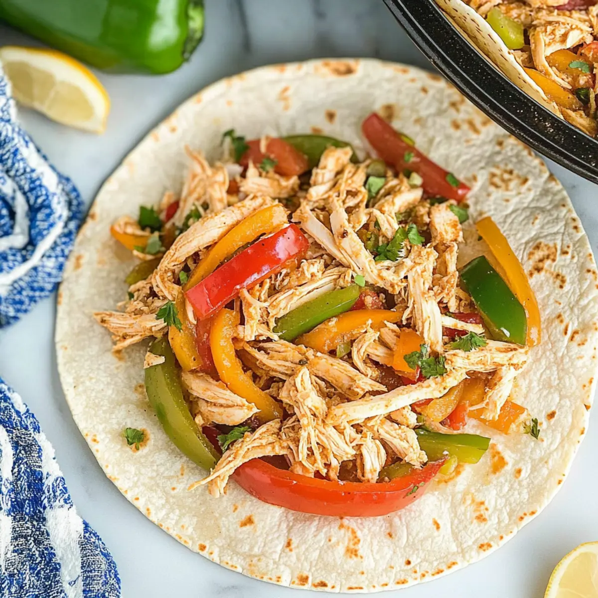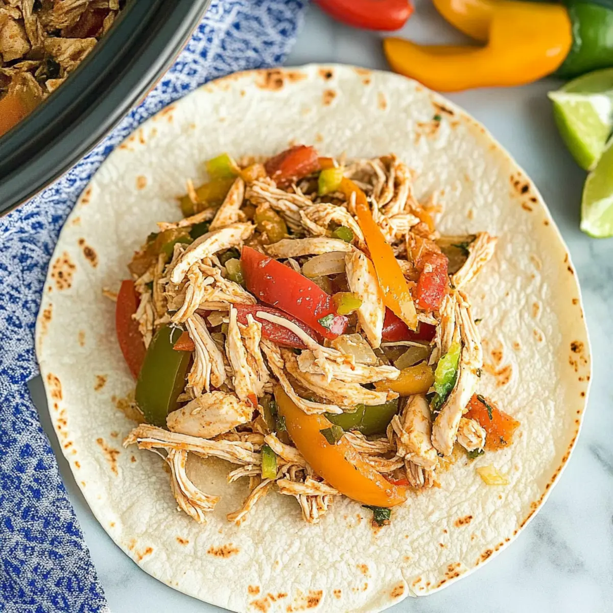 “Can you believe a dinner this delicious can be ready with just 10 minutes of prep?” That was my thought when I first made these Crockpot Chicken Fajitas. The combination of tender, shredded chicken with vibrant bell peppers and zesty spices creates a feast for the senses without the fuss. Plus, they’re not just tasty—they’re also a healthy, family-friendly meal option. With low sodium and Whole30-friendly choices, these fajitas are perfect for busy weeknights when you want to prioritize flavor and nourishment. Imagine coming home to that savory aroma filling your kitchen, knowing you’ve got an easy, satisfying dinner just waiting for you. Ready to dive into a recipe that simplifies mealtime while bringing the whole family together? Why Are These Fajitas a Family Favorite? Simplicity: With just 10 minutes of prep, you can set your crockpot and let it work its magic, making this the ultimate no-fuss meal for busy nights. Healthy: Packed with lean chicken and colorful veggies, these fajitas offer a nutritious option for anyone looking to eat well without sacrificing flavor. Versatile: Whether you prefer chicken, steak, shrimp, or pork, this recipe is adaptable, inviting creativity with every meal. Crowd-pleaser: Perfect for family dinners or casual gatherings, these fajitas will have everyone coming back for seconds! Serve them with warm tortillas and fresh toppings like avocado or cilantro for a complete experience. Remember, if you love flavorful, healthy meals like these, check out my Honey Bourbon Chicken or add some flair with Bang Bang Chicken for your next family night! Crockpot Chicken Fajita Ingredients For the Fajita Base • Rotel – Adds a spicy tomato base with diced green chiles; substitute with canned tomatoes if unavailable. • Honey – Provides a hint of sweetness; substitute with maple syrup, or skip for Whole30. • Minced Garlic – Enhances flavor depth; use fresh or jarred garlic for convenience. • Bell Peppers – Contributes color and crunch; any variety (green, red, yellow) works beautifully. • Diced Onion – Adds sweetness and flavor; yellow, white, or red onions can all be used. • Boneless Skinless Chicken Breasts – The main protein source for these delicious fajitas; can substitute with steak, shrimp, or pork for variety. • Low Sodium Taco Seasoning – Season the dish while keeping sodium levels in check; homemade is preferred. • Limes – Adds brightness and freshness; freshly squeezed lime juice is highly recommended when serving. Indulge in these Crockpot Chicken Fajitas, a family meal that’s sure to impress with its effortless preparation and delightful flavors! Step‑by‑Step Instructions for Crockpot Chicken Fajitas Step 1: Prepare the Base In a 6-8 quart crockpot, combine one can of Rotel, a drizzle of honey, and a generous amount of minced garlic. Stir these ingredients together until well mixed. This tangy tomato mixture will serve as the flavorful base for your Crockpot Chicken Fajitas, immersing the chicken and veggies in zesty goodness while they cook. Step 2: Add Vegetables Layer sliced bell peppers and diced onion over the prepared tomato mixture in the crockpot. Use a mix of colors—green, red, and yellow—to create a vibrant, crunchy texture. These vegetables will soften and release their juices, adding to the overall flavor of the fajitas. Spread them evenly for happy cooking! Step 3: Season the Chicken Next, take boneless, skinless chicken breasts and place them gently on top of the vegetables. Sprinkle a generous amount of low sodium taco seasoning evenly over the chicken. This seasoning will infuse the dish with its rich flavors as it cooks. Ensure the chicken is well coated for maximum taste. Step 4: Cook to Perfection Cover the crockpot with its lid and set it to cook on low for 6-8 hours or on high for 4 hours. The chicken is done when it reaches an internal temperature of 165°F. You’ll know it’s perfect when the chicken is tender and easily shreds with a fork. The aroma will fill your kitchen, promising a delightful meal. Step 5: Shred the Chicken Once cooked, remove the chicken breasts from the crockpot and place them on a cutting board. Use two forks to shred the chicken into bite-sized pieces. Return the shredded chicken to the crockpot and stir it into the mixture of peppers and sauce, ensuring it’s evenly combined for the most flavorful filling for your fajitas. Step 6: Serve Warm Spoon the warm, savory mixture onto soft tortillas, and feel free to add your favorite toppings like avocado, cilantro, or a squeeze of fresh lime juice for that extra zing. These Crockpot Chicken Fajitas are now ready to be enjoyed with family and friends, bringing a satisfying and comforting meal to the table. Variations & Substitutions for Crockpot Chicken Fajitas Feel free to jazz up these Crockpot Chicken Fajitas and make them uniquely yours with these fun twists! Steak Substitute: Swap the chicken for thinly sliced flank steak. Just adjust the cooking time to prevent overcooking, and enjoy a beefy flair. Shrimp Option: For a seafood delight, use peeled shrimp instead of chicken. Toss them in during the last 30 minutes of cooking for a succulent addition. Pork Variance: Replace chicken with pork tenderloin for a juicy, flavorful variation. The pork will absorb the spices wonderfully and create a savory experience. Vegetarian Twist: Try replacing the meat with black beans or lentils for a hearty vegetarian version. Add extra spices and flavors to amp up taste! Extra Veggies: Incorporate corn or zucchini for added texture and nutrition. These veggies will cook down beautifully in the sauce, making every bite delightful. Spice It Up: For a fiery kick, use spicy taco seasoning or add sliced jalapeños. Your taste buds will thank you for the heat! Sour Cream Swap: Top your fajitas with Greek yogurt instead of sour cream for a tangy and protein-packed twist that’s also healthier! Tortilla Varieties: Experiment with