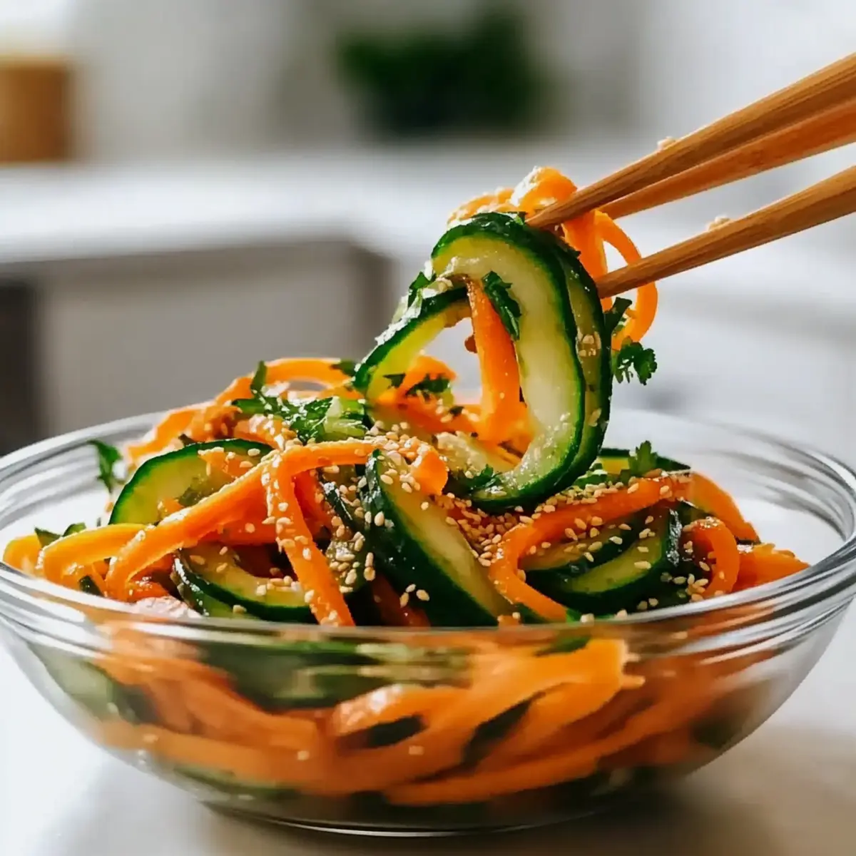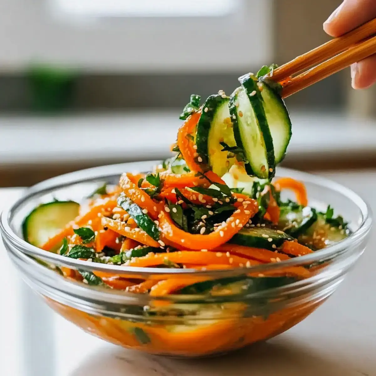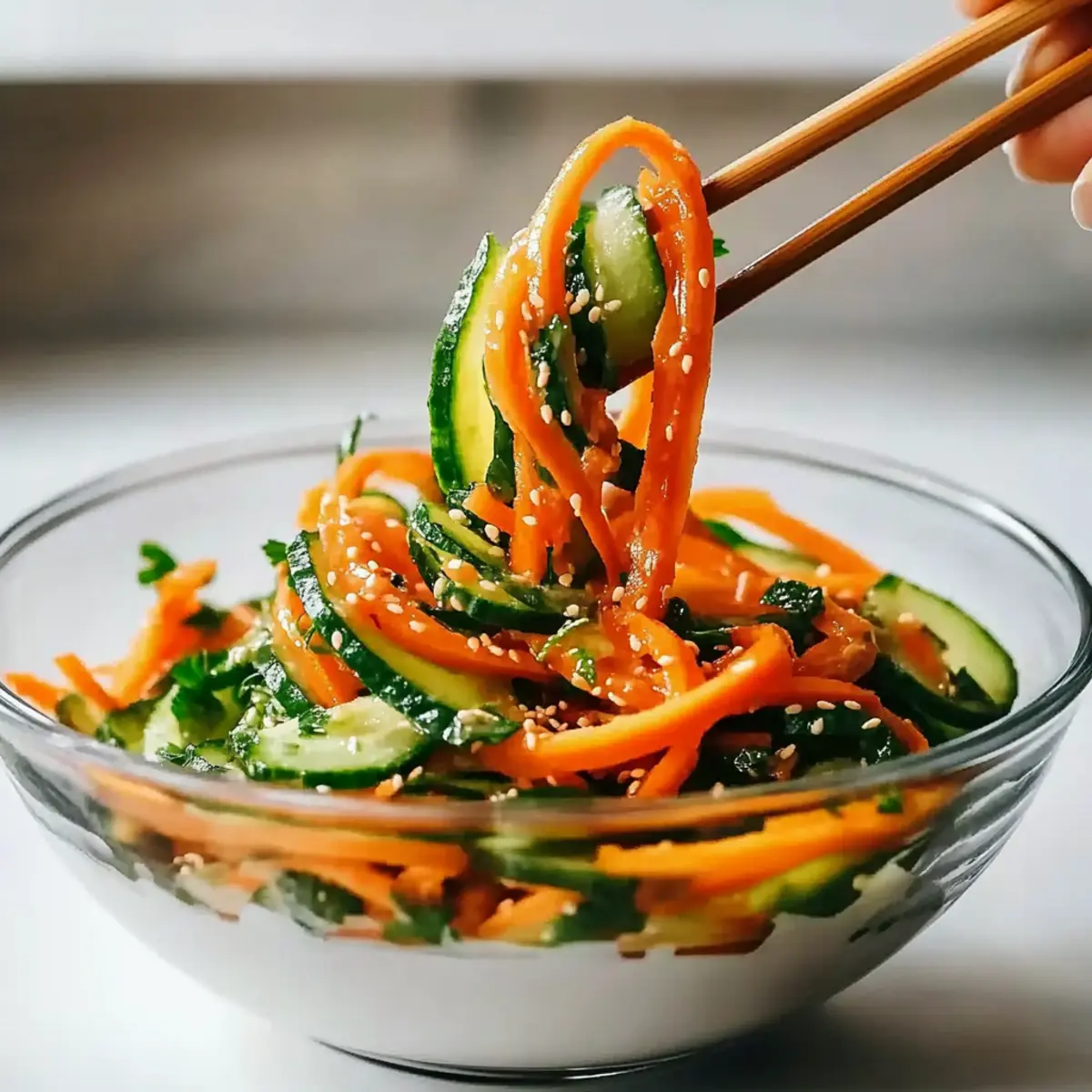 As I chopped the vibrant vegetables, I was struck by the sheer simplicity of the moment—just a few fresh ingredients transforming into something beautiful. Enter my 15-Minute Asian-Inspired Cucumber Carrot Salad, bursting with crisp cucumbers and sweet carrots enveloped in a tangy, spicy dressing. This easy recipe not only provides a refreshing escape from the heat, but it also packs a fiber-rich punch, making it perfect for those looking for a healthy side dish or a quick weeknight meal. Its versatility means you can customize it to suit your tastes, encouraging creativity in the kitchen. Who knew making a delicious salad could be this effortless? Are you ready to experience the crunch and flavor that awaits? Why Is This Salad So Irresistible? Simplicity at Its Best: This Cucumber Carrot Salad is a breeze to whip up, requiring just 15 minutes and minimal prep work. Vibrant, Fresh Flavors: The combination of crunchy cucumbers and sweet carrots, drizzled with a tangy dressing, will awaken your taste buds. Customizable Goodness: Feel free to add your favorite ingredients like chickpeas or roasted peanuts, ensuring a unique twist each time you make it. Perfect for Any Meal: Whether as a side to grilled salmon or a refreshing standalone dish, it complements a variety of cuisines beautifully. Fiber-Rich & Healthy: Each serving is a low-calorie powerhouse that’s perfect for anyone looking to maintain a healthy lifestyle or cater to special diets, including an option suited for fatty liver conditions. For even more veggie-packed inspiration, check out my Avocado Egg Salad or try a delightful Quinoa Crunch Salad for variety! Cucumber Carrot Salad Ingredients For the Salad • Large Cucumber – Base of the salad; use julienned or thinly sliced for optimal texture. • Large Carrots – Adds natural sweetness; julienned or finely shredded is best for a delightful crunch. • Sesame Seeds – Provides a nutty flavor and extra crunch to each bite. • Fresh Parsley (or Cilantro) – Enhances freshness; feel free to substitute with any fresh herb you enjoy. For the Dressing • Garlic – Minced for even distribution; adds pungency that elevates the salad’s flavor. • Olive Oil – Acts as a dressing base, bringing richness to the mix. • Lemon Juice – Provides brightness and acidity, balancing the flavors beautifully. • Gochugaru (Korean Red Chili Flakes) – Adds heat; can be reduced or swapped with red pepper flakes for less spice. • Soy Sauce – Boosts umami flavor, enhancing the overall taste experience. • Sugar/Maple Syrup – Balances flavors with a touch of sweetness; essential for a well-rounded dressing. Optional Add-ins • Carrot Ribbons – For an elegant presentation and additional texture. • Green Onion – Adds a mild onion flavor that complements the other veggies. • Roasted Peanuts or Cashews – Introduces a delicious crunch and nutty flavor, enhancing the salad further. This Cucumber Carrot Salad is not only vibrant and satisfying but also easy to make, ensuring you can whip it up whenever you need something fresh and healthy! Step‑by‑Step Instructions for Cucumber Carrot Salad Step 1: Prepare the Vegetables Start by washing the large cucumber and carrots under cool running water to remove any dirt. After drying them with a clean towel, julienne the cucumber and shred or julienne the carrots using a sharp knife or a box grater. Aim for even pieces to ensure a consistent crunch in your Cucumber Carrot Salad, making prep easy and enjoyable. Step 2: Make the Dressing In a small mixing bowl, combine olive oil, lemon juice, gochugaru, soy sauce, and sugar or maple syrup. Use a whisk to blend these ingredients thoroughly for about 30 seconds until the mixture reaches a glossy consistency. Taste the dressing to ensure a balance of flavors, as it will wonderfully elevate your fresh salad. Step 3: Mix the Salad Ingredients In a large salad bowl, combine the julienned cucumber, shredded carrots, minced garlic, and roughly chopped parsley or cilantro. Toss the ingredients lightly with your hands to distribute everything evenly, ensuring each bite is packed with vibrant flavor and freshness, key attributes of the Cucumber Carrot Salad. Step 4: Add the Dressing Pour the freshly prepared dressing over the vegetable mixture in the large bowl. Use your hands or a salad tongs to gently toss the ingredients together until every piece of vegetable is coated in the delicious dressing. This step is crucial for achieving that perfect blend of flavors throughout the salad. Step 5: Garnish and Final Toss Once the salad is well mixed, sprinkle sesame seeds over the top and toss gently again to incorporate them evenly. This adds a delightful crunch and nutty flavor to your Cucumber Carrot Salad. Step 6: Let It Rest For the best flavor, allow your Cucumber Carrot Salad to rest for about 10 minutes at room temperature. This waiting period allows the vegetables to absorb the dressing and enhances the overall taste. After resting, you can serve it immediately or refrigerate it for a chilled option. How to Store and Freeze Cucumber Carrot Salad Fridge: Store the Cucumber Carrot Salad in an airtight container for up to 24 hours. Dress lightly before storing to maintain the vegetables’ crispness. Veggie Prep: If you’re making the salad ahead of time, keep the chopped cucumbers and carrots separate from the dressing for fresh crunch, combining them just before serving. Freezer: It’s not recommended to freeze the Cucumber Carrot Salad as the texture of the vegetables may become mushy upon thawing. Enjoy it fresh for the best experience! Reheating: This salad is meant to be served cold; simply toss with dressing right before enjoying to bring that tantalizing freshness back to life. Make Ahead Options These Cucumber Carrot Salad preparations are perfect for busy cooks looking to save time! You can prep the vegetables (cucumbers and carrots) up to 24 hours in advance by washing, julien