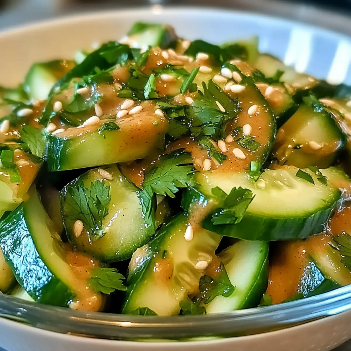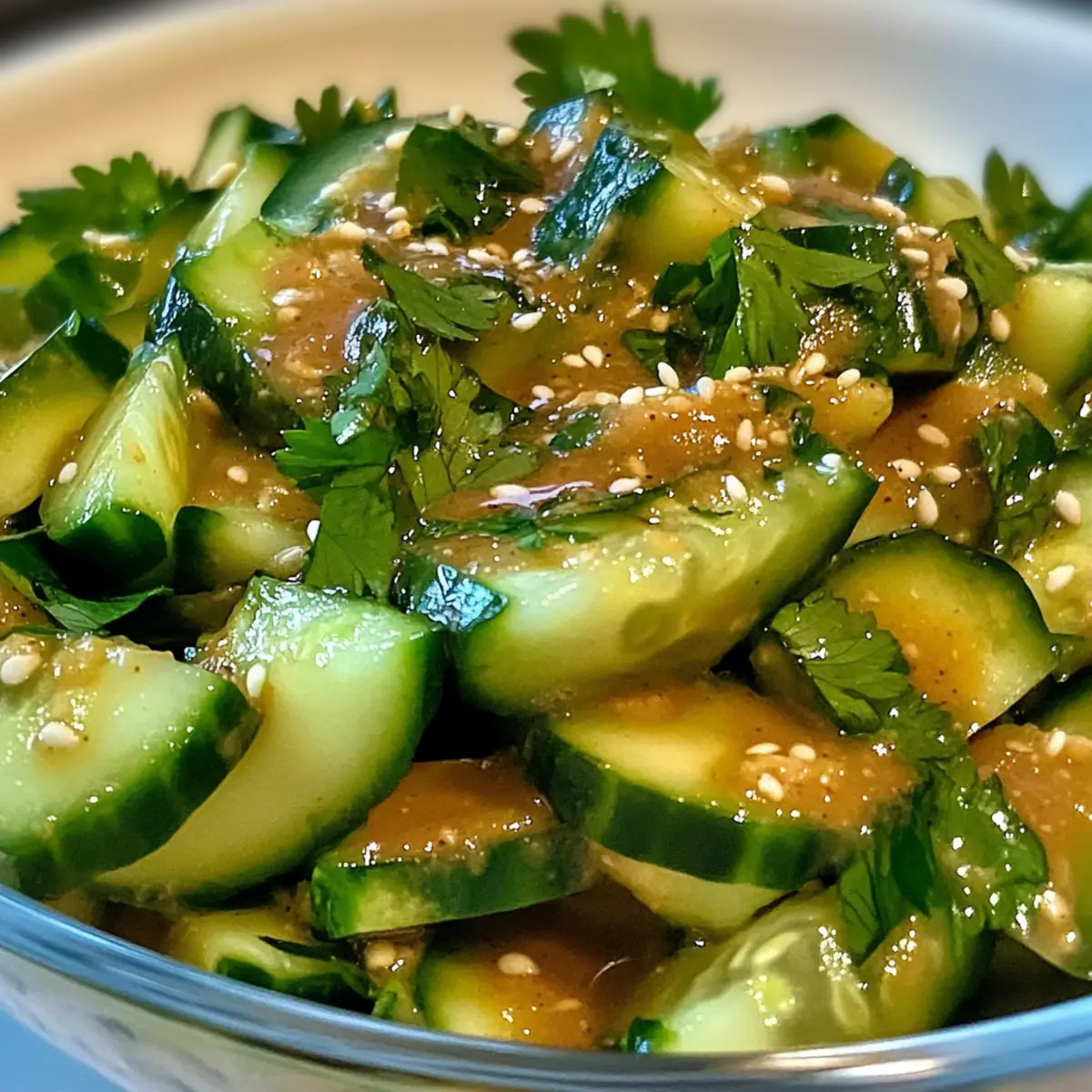 Once combined, distribute the Cucumber Peanut Butter Salad into individual bowls or onto a serving platter. If desired, garnish with additional toasted sesame seeds for an extra crunch and visual appeal. The freshness of the cucumbers and the richness of the dressing will invite everyone to dig in, making it a delightful centerpiece for your summer gathering.