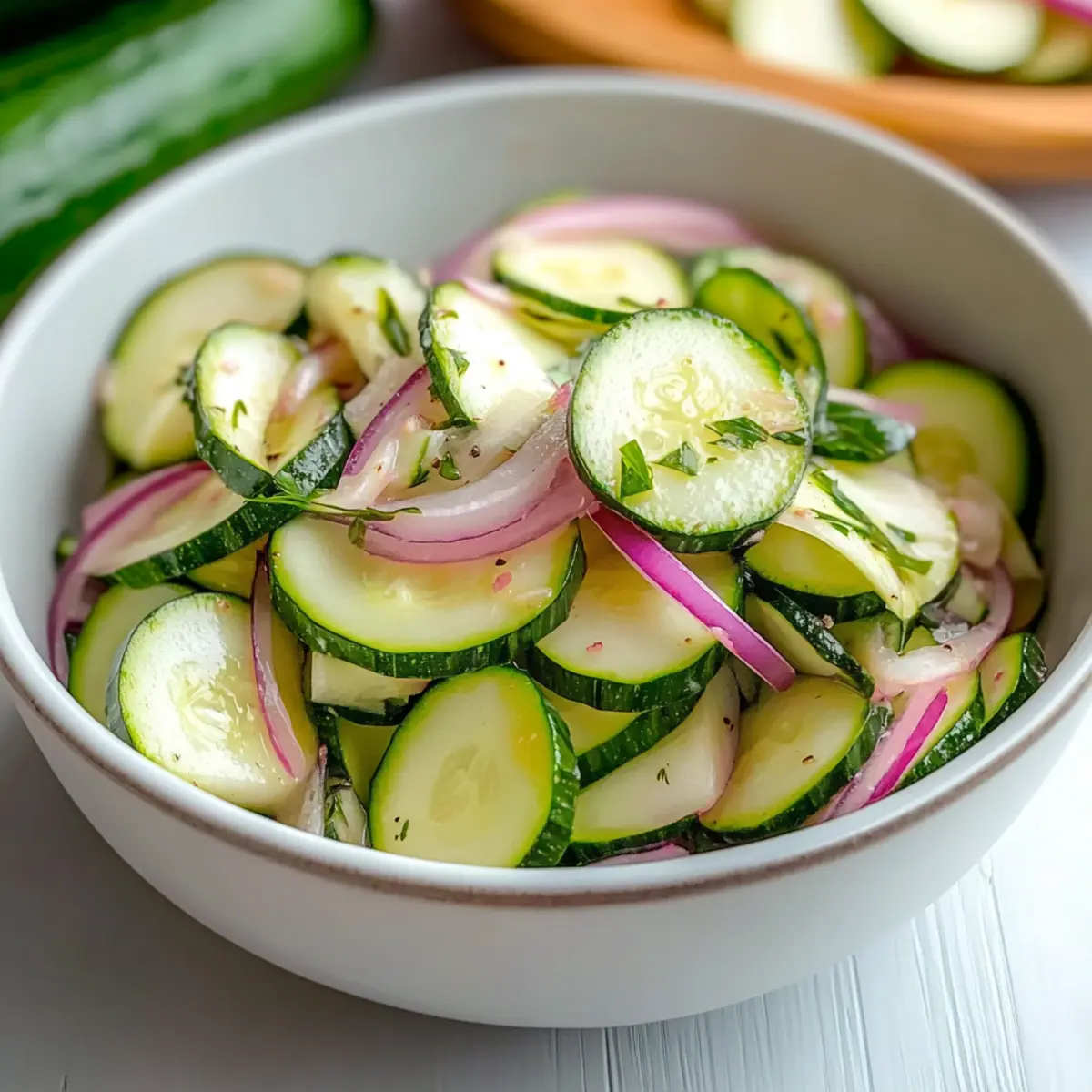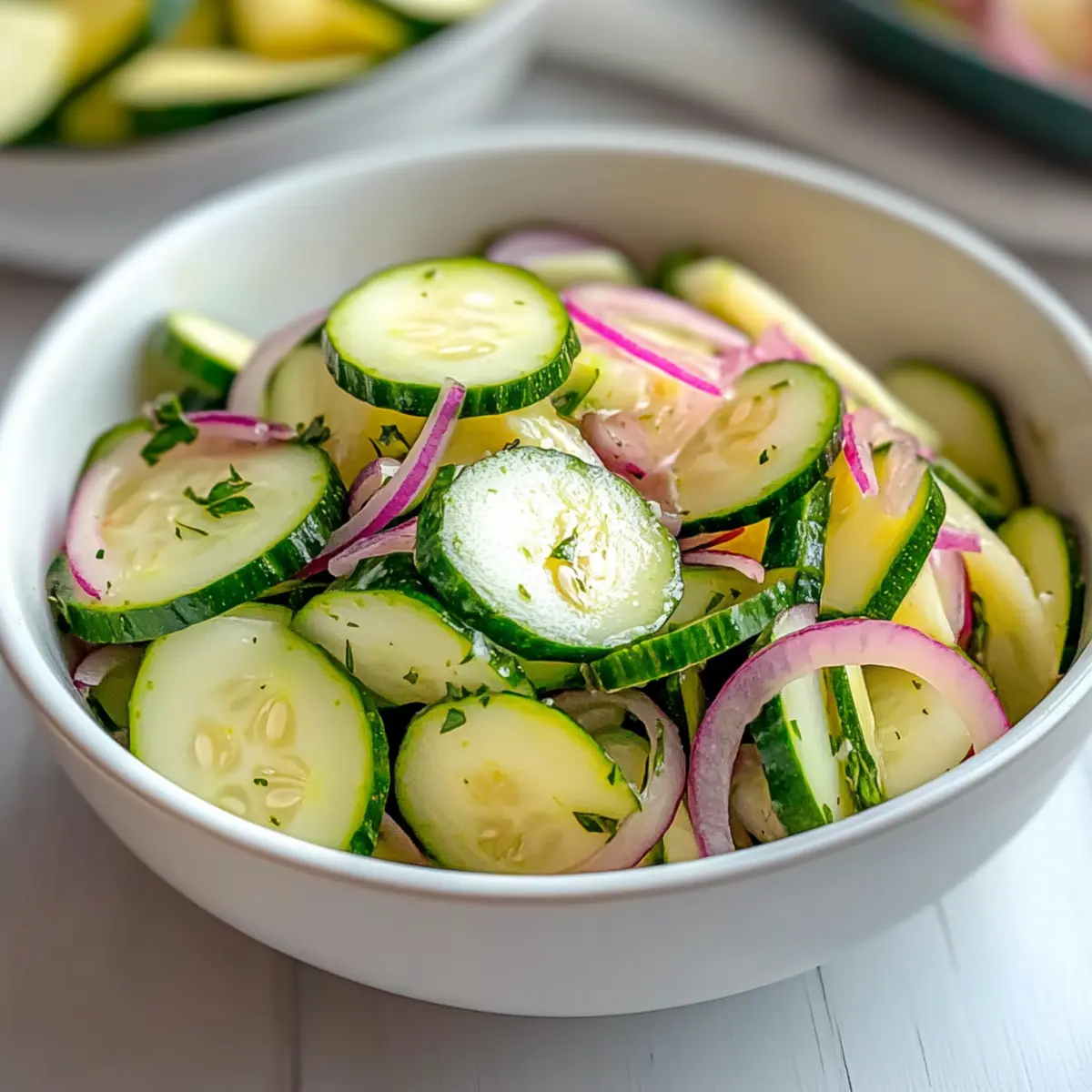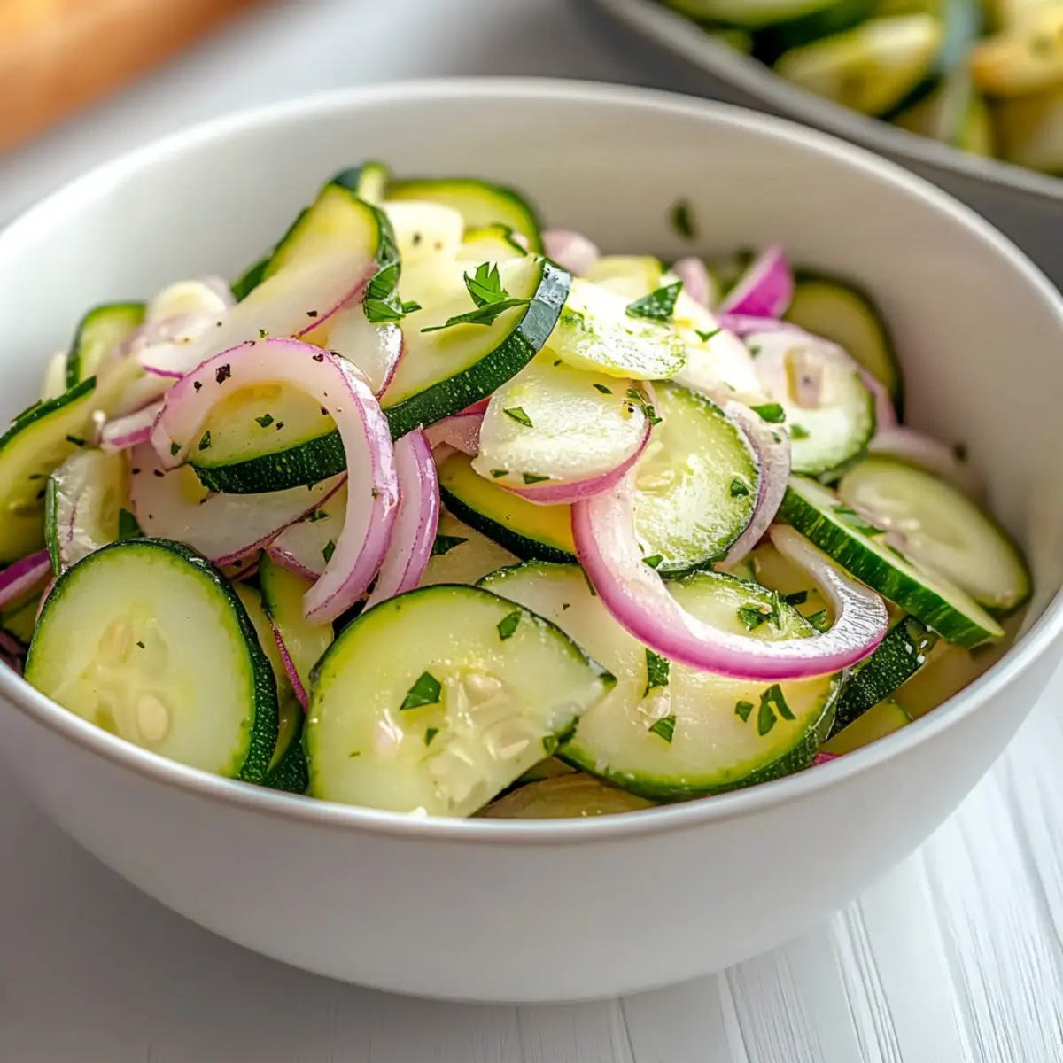 As the sun blazes and gardens overflow with fresh produce, I find myself reaching for seasonal favorites to celebrate the warmth. Enter my Crisp and Refreshing Cucumber Zucchini Salad—a delightful blend of flavors and textures that captures the essence of summer in every bite. This vibrant salad is not only a quick fix for those sizzling days but is also gluten-free and packed with wholesome goodness. Prepared in under 10 minutes, it’s the perfect side dish that complements anything you throw on the grill or can be enjoyed solo for a light lunch. Plus, it’s a crowd-pleaser that tastes even better the next day, making it an ideal addition to your meal prep. Curious about how to whip up this fresh salad and impress your friends at the next BBQ? Let’s dive in! Why Is This Salad So Refreshing? Freshness at Its Core: Each ingredient shines in this salad, from the crisp cucumbers to tender zucchini, ensuring every bite bursts with flavor. Quick and Easy: With just under 10 minutes to prep, it’s perfect for any busy day. Versatile and Fun: Feel free to customize with your favorite veggies like cherry tomatoes or even add protein with quinoa for a filling meal. Vibrant Summer Colors: The bright hues of each slice create a visually stunning dish that’s as pleasing to the eyes as it is to the palate. Make-Ahead Magic: It’s perfect for meal prepping; just whip it up a few hours or even a day in advance for flavors that meld beautifully! If you’re interested in adding more vibrant salads to your lineup, you might also like this Cucumber Caesar Salad or a light and refreshing Quinoa Crunch Salad. Cucumber Zucchini Salad Ingredients For the Salad • English Cucumbers – These are your stars for a refreshing crunch; select firm ones for the best texture. • Zucchini – Adds a mild sweetness to contrast the other flavors; slice uniformly for even bites. • Onion (thinly sliced) – Introduces a zesty kick; sweet onions or red onions are great options for a milder taste. For the Dressing • Salt – This key ingredient draws out moisture from the veggies, ensuring a crisp salad. • Apple Cider Vinegar – Provides that tangy acidity; swap in red wine vinegar for a flavor twist. • Granulated Sugar – Balances the dressing’s acidity; feel free to leave it out for a sugar-free treat. • Red Pepper Flakes – Add a touch of heat; adjust to your heat preference for the perfect zing. This Cucumber Zucchini Salad is not only refreshing but also easy to prepare! Enjoy the delightful mix of flavors and textures! Step‑by‑Step Instructions for Cucumber Zucchini Salad Step 1: Slice the Vegetables Begin by thinly slicing 2 cups of English cucumbers and 1½ cups of zucchini to a uniform thickness of about ⅛ inch. Use a sharp knife or mandoline for precision, ensuring each slice maintains that refreshing crunch. Place the slices in a large mixing bowl and add 1 cup of thinly sliced onion for an added kick. Step 2: Salt the Mixture Sprinkle a generous amount of salt over the cucumber, zucchini, and onion mixture in the bowl. Gently toss the ingredients together to evenly coat them in salt. Allow this mixture to rest for about 30 minutes in the bowl. You’ll notice the vegetables releasing excess moisture, which is key to preventing a watery Cucumber Zucchini Salad. Step 3: Drain the Vegetables After 30 minutes, place a colander over the sink and pour the vegetable mixture into it. This step is crucial to remove the moisture and enhance the salad’s crunch. Let the vegetables sit in the colander for another 5 minutes, allowing any remaining liquid to escape while you prepare the dressing. Step 4: Whisk the Dressing In a separate medium bowl, whisk together ¼ cup of apple cider vinegar, 1 tablespoon of granulated sugar, and a pinch of red pepper flakes. Mix until the sugar dissolves completely and the dressing is well combined, creating a tangy yet balanced flavor that will beautifully enhance the Cucumber Zucchini Salad. Step 5: Combine the Salad and Dressing Transfer the drained vegetables back to the original mixing bowl. Pour the prepared dressing evenly over the vegetable mixture. Using salad tongs or a large spoon, gently toss everything together until each slice of cucumber and zucchini is well coated in that vibrant dressing. Step 6: Chill the Salad Cover the bowl with plastic wrap or a lid and refrigerate the salad for at least 30 minutes before serving. This chilling time allows the flavors to meld beautifully, enriching the taste of your Cucumber Zucchini Salad. If you have time, letting it sit for an hour will result in an even more delightful flavor. Step 7: Serve and Enjoy Once chilled, give the salad a gentle toss one last time before serving. Enjoy it as a refreshing side dish on its own or paired with grilled meats. The cool crunch of this Cucumber Zucchini Salad makes it perfect for those warm summer days, inviting you to savor every bite! How to Store and Freeze Cucumber Zucchini Salad Fridge: Store leftover Cucumber Zucchini Salad in an airtight container for up to 24 hours for the best flavor and crunch. Prep Ahead: You can slice the vegetables and keep them in the fridge for up to one day; just be sure to combine them with the dressing right before serving to maintain freshness. Freezer: While it’s best enjoyed fresh, you can freeze individual components like sliced cucumbers and zucchini for up to 3 months. Just remember that the texture may change after thawing. Reheating: This salad is meant to be served cold, so simply let it come to room temperature after refrigeration before enjoying again! Expert Tips for Cucumber Zucchini Salad Salt Wisely: Always sprinkle salt on the vegetables to draw out moisture. This step prevents a watery Cucumber Zucchini Salad, ensuring a perfectly crunchy texture. Uniform Slices: Aim for even thickness when slicing cucumbers and zucchini—about ⅛ inch. This helps the dressing coat each piece evenly and adds to the salad’s 