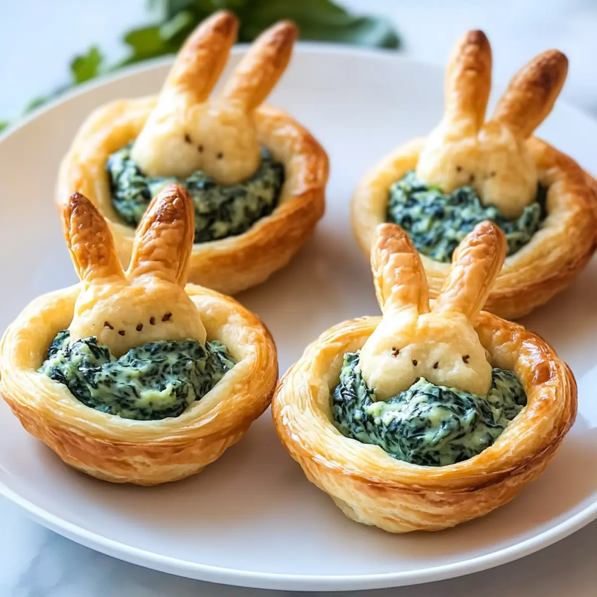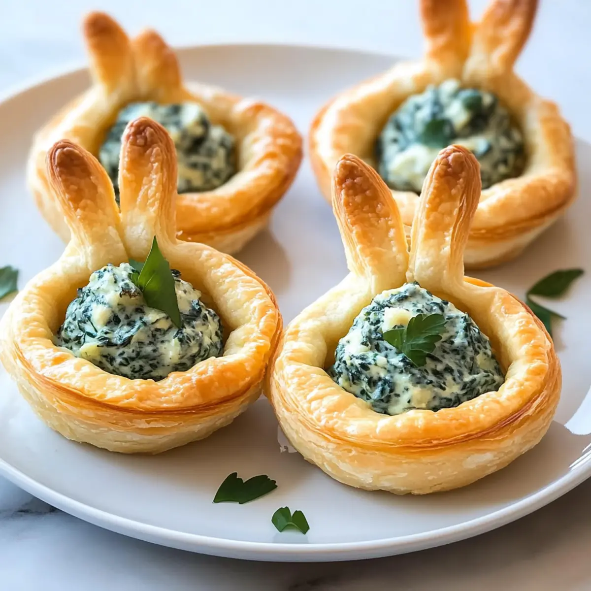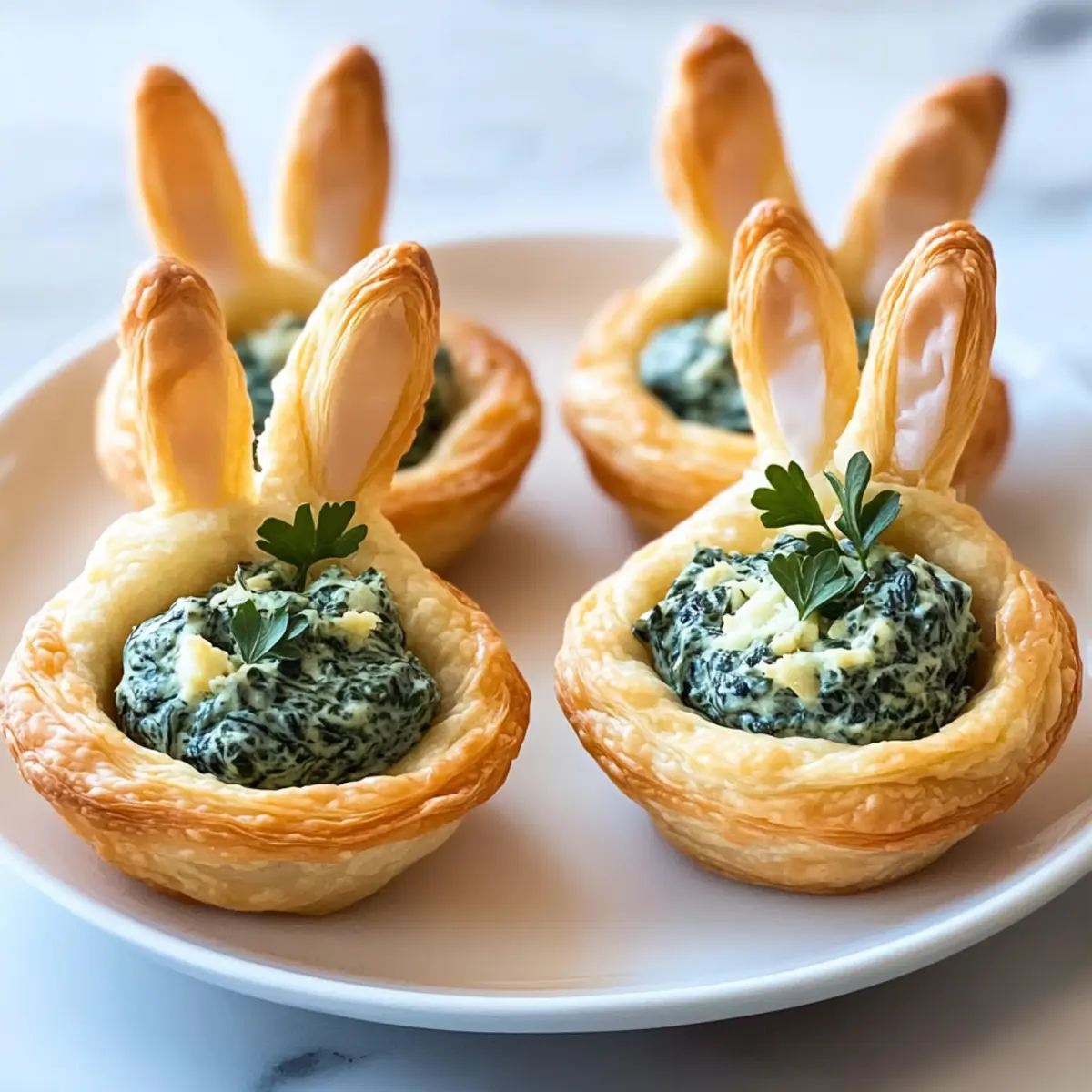 Fill each baked crescent cup generously with the creamy spinach-artichoke filling you’ve prepared. Once filled, take the bunny ears and gently insert them into the filling, letting them stand up adorably. For a pop of color, sprinkle fresh parsley or chives on top as a garnish.