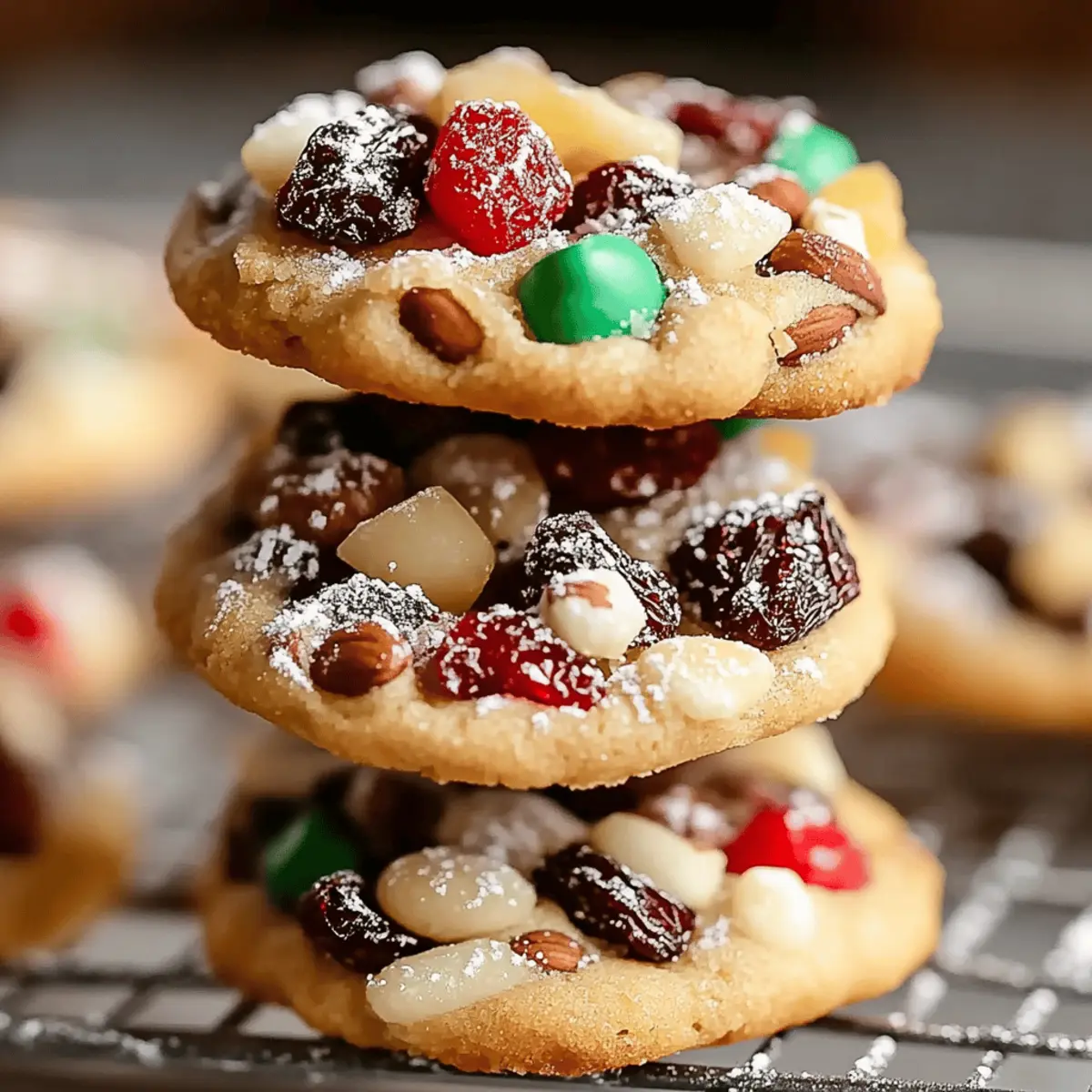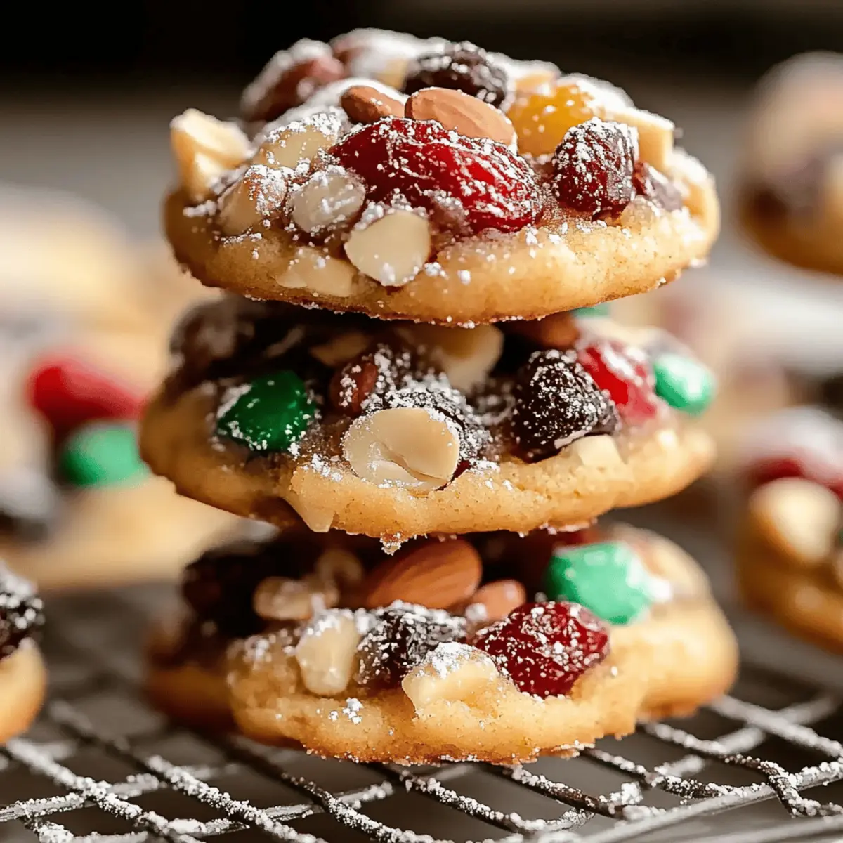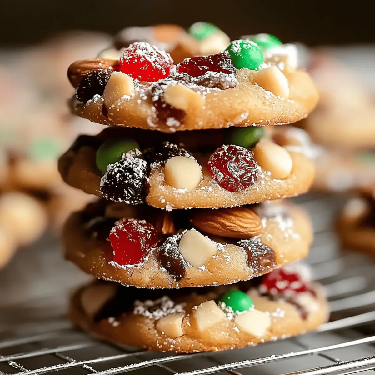 It’s that magical time of year when the air is filled with warmth and holiday cheer. I can’t help but reminisce about cozy afternoons spent baking with loved ones, the scent of spices wafting through the house. One of my absolute favorites to whip up are these Easy Christmas Fruitcake Cookies, a delightful twist on a classic holiday treat. Not only are they quick to make, ensuring you won’t be stuck in the kitchen all day, but they also capture the essence of festive gatherings with their chewy texture and bursts of fruity goodness. With just a handful of ingredients, you can create a cookie that evokes nostalgia while satisfying those sweet cravings. Ready to bring a touch of home-baked happiness to your holiday celebrations? Let’s get baking! Why are these cookies a holiday favorite? Simplicity at its Best: These Easy Christmas Fruitcake Cookies require minimal effort, making them perfect for busy holiday schedules. Bursting with Flavor: The delightful mix of dried fruits and crunchy nuts creates a festive explosion of taste in every bite. Tradition Reimagined: They offer a new take on classic fruitcake while retaining the nostalgic elements that we all love. Quick to Make: With just a few steps, you can whip up a batch that is sure to impress friends and family. Versatile Options: Feel free to switch up the dried fruits or nuts based on your preferences to make them truly your own! Perfect Pairing: Serve these cookies with a steaming cup of tea or hot cocoa for a cozy holiday treat. You might also love making Lemon Pistachio Cookies or Meringue Pie Cookies to add variety to your festive dessert table! Easy Christmas Fruitcake Cookies Ingredients For the Cookie Base All-purpose flour – Provides the structure needed for chewy cookies; can substitute with gluten-free flour blend if desired. Baking powder – A leavening agent that helps the cookies rise beautifully. Baking soda – Adds leavening and contributes to that lovely golden-brown color. Salt – Enhances the overall flavor profile of your cookies. Ground cinnamon – Infuses warmth and holiday spice into the mix. Ground nutmeg – Adds a delightful festive aroma, making each bite even more special. For the Wet Mix Unsalted butter – Adds richness and moisture; use vegan butter for a dairy-free option. Brown sugar – Provides sweetness and moisture; white sugar can be used for a lighter flavor. Eggs – Essential for binding the ingredients together; substitute with flaxseed meal for a vegan alternative. Vanilla extract – Adds depth of flavor that rounds out the sweetness. For the Flavor Burst Mixed dried fruit – Contributes sweetness and chewiness; feel free to mix in your favorites like raisins, currants, or cranberries. Chopped nuts – Adds a satisfying crunch; walnuts, pecans, or almonds work wonderfully here. Chopped candied fruit peel (optional) – Provides an extra festive flavor and texture that can elevate your cookies. For Finishing Touches Powdered sugar (for dusting, optional) – A sweet finish to decorate your cookies before serving. Dive into making these Easy Christmas Fruitcake Cookies and spread the joy of the season with every delicious bite! Step‑by‑Step Instructions for Easy Christmas Fruitcake Cookies Step 1: Preheat and Prepare Begin by preheating your oven to 350°F (175°C) to ensure it reaches the right temperature for baking your Easy Christmas Fruitcake Cookies. While the oven warms up, line a baking sheet with parchment paper, providing a non-stick surface for the cookies to bake on. Step 2: Mix Dry Ingredients In a large mixing bowl, whisk together the all-purpose flour, baking powder, baking soda, salt, ground cinnamon, and ground nutmeg. This step builds the flour foundation and incorporates the spices evenly, infusing your cookies with festive flavors. Set aside the dry mixture while you prepare the wet ingredients. Step 3: Cream Butter and Sugar In another bowl, use an electric mixer to beat the softened unsalted butter and brown sugar together until the mixture is light and fluffy, approximately 2-3 minutes. The goal is to create a smooth texture that will make your Easy Christmas Fruitcake Cookies rich and tender. Step 4: Combine Wet Ingredients Add in the eggs and vanilla extract to the creamed butter and sugar mixture. Mix thoroughly until all components are well integrated. This step transforms your batter into a rich, flavorful mix essential for bringing your cookies to life. Step 5: Combine Mixtures Gradually blend the dry mixture into the wet ingredients, mixing just until they are combined. Avoid overmixing to keep the texture of your Easy Christmas Fruitcake Cookies tender and soft. It’s okay if some streaks of flour remain as you prepare for the next delicious step. Step 6: Fold in Add-ins Gently fold in your chosen mixed dried fruit, chopped nuts, and candied fruit peel (if using) until evenly distributed throughout the dough. This step is where your cookies get that delightful burst of fruity flavor and texture, contributing to the holiday spirit with each bite. Step 7: Scoop Cookie Dough Using a cookie scoop or two tablespoons, portion out the cookie dough onto the prepared baking sheet. Space them about 2 inches apart to allow room for spreading while baking. The anticipation grows as you prepare to create these festive Easy Christmas Fruitcake Cookies! Step 8: Bake Cookies Place the baking sheet in the preheated oven and bake your cookies for 20-25 minutes. Keep an eye on them, looking for golden edges and set centers for the perfect chewy texture. The kitchen will fill with a tempting aroma as they transform into holiday goodness. Step 9: Cooling Once baked, remove the cookies from the oven and let them cool on the baking sheet for about 5 minutes. After that, transfer the cookies to a wire rack to cool completely, allowing them to firm up while maintaining their softness in the middle. Step 10: Dust with Sugar If desired, sprinkle cooled cookies with pow