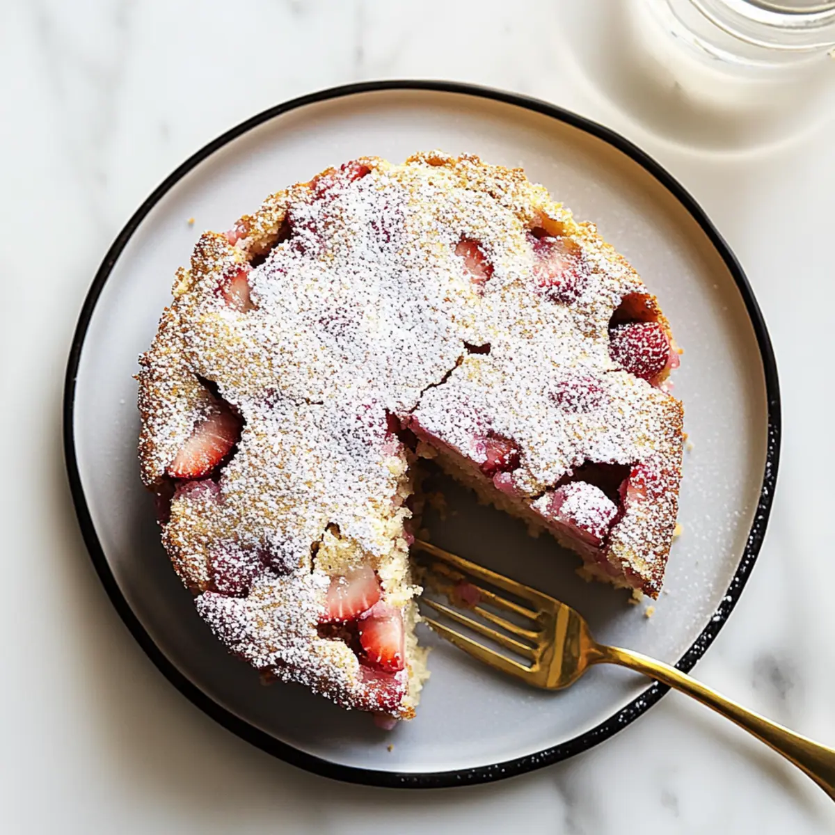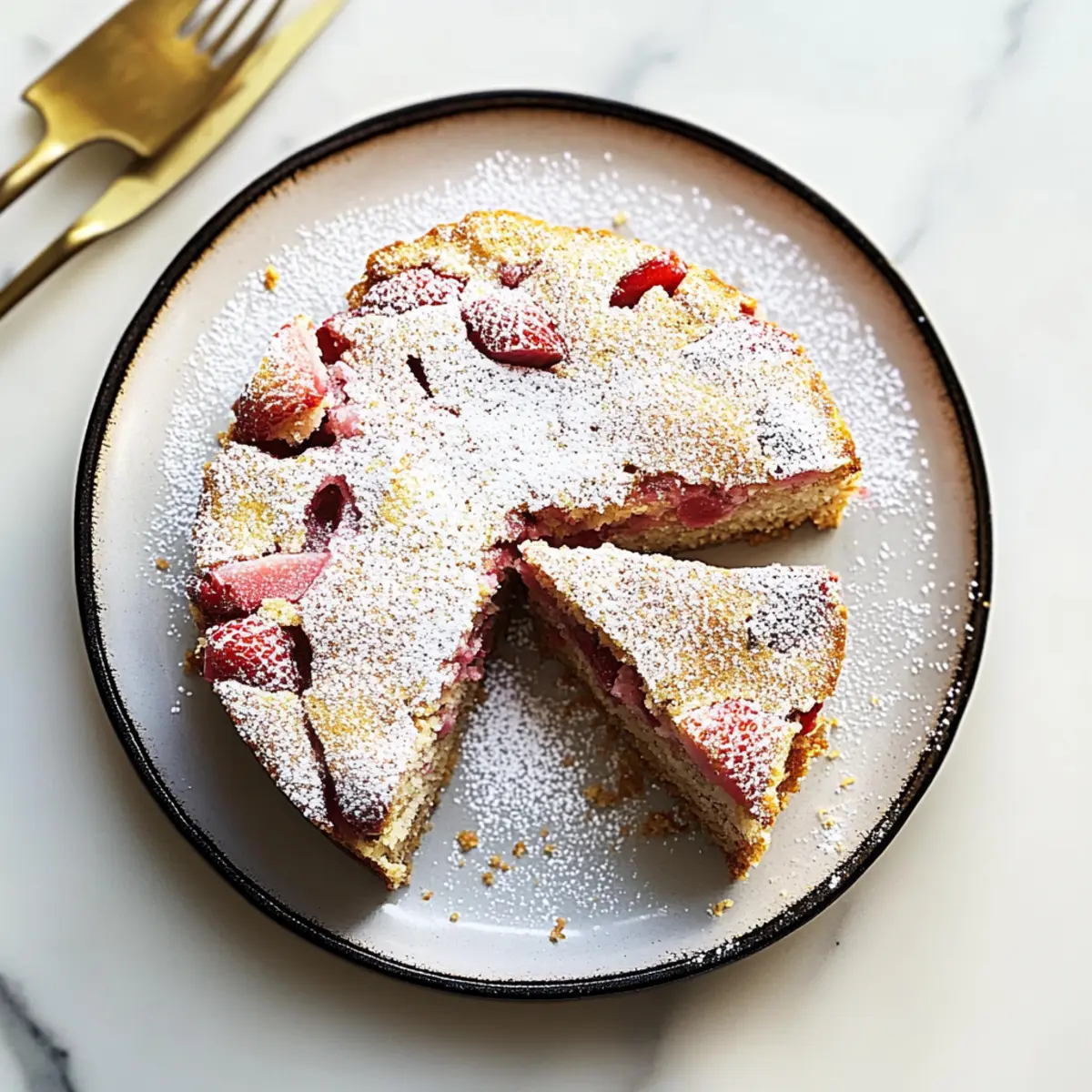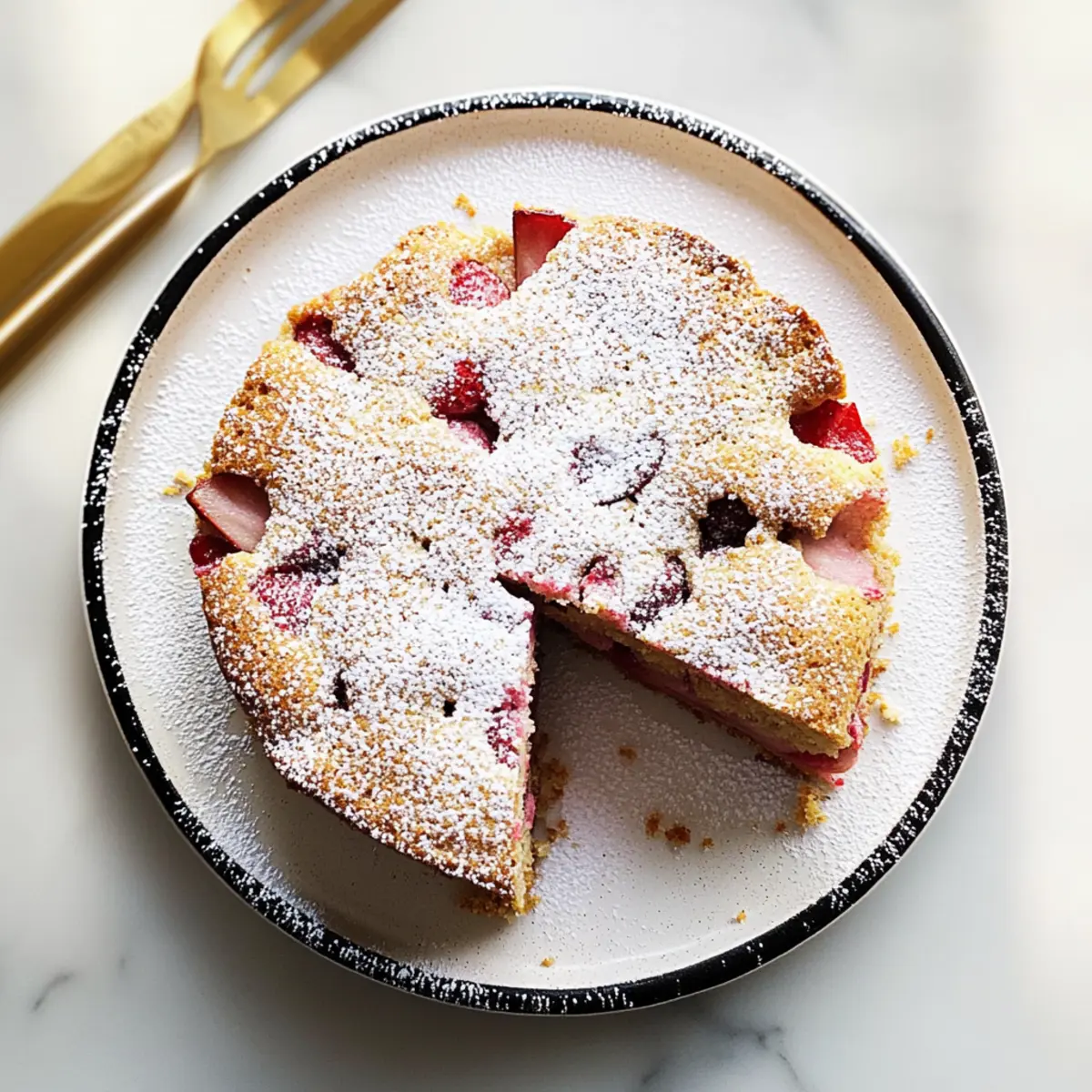 As I pulled out my mixing bowl, a wave of anticipation washed over me. Today, I’m excited to share my favorite springtime indulgence: French Strawberry Rhubarb Cake. This delightful dessert marries the tangy brightness of fresh rhubarb with the gentle sweetness of strawberries, resulting in a beautifully balanced treat that celebrates the season. Not only is this cake incredibly simple to whip up using pantry staples, but it’s also perfect for when you’re craving a light and moist dessert that doesn’t overpower your taste buds with sweetness. Topped with just a dusting of powdered sugar, it’s the perfect accompaniment to an afternoon coffee or a light evening gathering. Ready to discover how to create this seasonal delight? Let’s dive into the recipe! Why is this cake a must-try? Seasonal Delight: Celebrate spring with the vibrant flavors of fresh strawberries and tart rhubarb in every bite. Effortless Preparation: This recipe is incredibly simple, ideal for both beginner and experienced bakers using pantry staples. Balanced Sweetness: Not overly sweet, it’s the perfect light dessert that pairs beautifully with your afternoon coffee. Crowd-Pleasing Option: Impress your guests with this delightful treat that’s sure to spark conversations at gatherings. Versatile Variations: Easily customize it by swapping fruits or adding nuts for a different twist. Once you try this French Strawberry Rhubarb Cake, you’ll also love serving it with a scoop of ice cream or a dollop of whipped cream, creating an indulgent experience. French Strawberry Rhubarb Cake Ingredients For the Cake • Strawberries – Add sweetness and moisture to the cake; ripe berries yield the best flavor. • Rhubarb – Provides the tartness that balances the sweetness of strawberries; fresh rhubarb is recommended for the best taste. • Flour – This is the structure of the cake; all-purpose flour is ideal for great texture. • Sugar – Sweetens the batter; if you prefer a less-sweet cake, adjustments can be made easily. • Eggs – Help bind the ingredients together and add richness to the finish. • Butter – Ensures moisture and contributes to the cake’s velvety texture; use unsalted for control over saltiness. • Spiced Rum (optional) – Enhances flavor, but you can substitute it with whiskey or bourbon if preferred. • Baking Powder – Acts as a leavening agent to help the cake rise perfectly. For Dusting • Powdered Sugar – This is optional but adds a delightful finish when dusted on top right before serving. With these simple ingredients, you’re well on your way to baking a lovely French Strawberry Rhubarb Cake that celebrates the essence of spring! Step‑by‑Step Instructions for French Strawberry Rhubarb Cake Step 1: Preheat the Oven Begin by preheating your oven to 350°F (175°C). While the oven warms up, take an 8-inch round cake pan and generously grease it with butter or non-stick spray to ensure easy removal after baking. This preparatory step ensures the French Strawberry Rhubarb Cake cooks evenly and rises perfectly. Step 2: Prepare the Fruit Next, wash your fresh strawberries and rhubarb thoroughly. Chop the strawberries into bite-sized pieces and slice the rhubarb into thin discs. Set the prepared fruit aside, allowing it to release some juices, which will enhance the flavor and moisture of the cake. Step 3: Mix the Dry Ingredients In a mixing bowl, sift together 1.5 cups of all-purpose flour, 1 teaspoon of baking powder, and a pinch of salt. Whisk the dry ingredients together until well combined, ensuring there are no lumps. This step is crucial for achieving a light texture in your French Strawberry Rhubarb Cake, allowing the cake to rise beautifully. Step 4: Cream Butter and Sugar In a separate large bowl, beat together ½ cup of softened unsalted butter and ¾ cup of sugar using an electric mixer until the mixture is light and fluffy, which should take about 3-5 minutes. Properly creaming these ingredients incorporates air, giving the cake its delightful lightness. Step 5: Add the Eggs Add two large eggs to the butter and sugar mixture, one at a time, mixing well after each addition. This step helps to fully incorporate the eggs, ensuring a smooth batter. The mixture should appear pale and slightly fluffy, indicating it’s ready for the next ingredients. Step 6: Combine Wet and Dry Ingredients Gradually add the dry flour mixture to the wet ingredients, mixing on low speed until just combined. Be careful not to overmix, as this can result in a dense cake. The final batter will be slightly thick but should flow smoothly off the spoon, ready to embrace those delicious fruits. Step 7: Fold in the Fruit Gently fold in the prepared strawberries and rhubarb using a spatula. This not only imparts their fruity goodness into the batter, but also ensures that each bite of French Strawberry Rhubarb Cake is filled with sweet and tart flavors. If desired, add a splash of spiced rum for an extra depth of flavor. Step 8: Pour into the Cake Pan Carefully pour the cake batter into your greased 8-inch round cake pan, using a spatula to smooth the top. Make sure the batter is evenly spread throughout the pan, which will help it bake uniformly. This step is vital for the overall appearance of your French Strawberry Rhubarb Cake. Step 9: Bake the Cake Place the cake pan in the preheated oven and bake for 35-40 minutes. To check for doneness, insert a toothpick into the center; if it comes out clean, the cake is ready. The edges should be lightly golden, and the center should spring back when lightly touched. Step 10: Cool in the Pan Once baked, remove the cake from the oven and let it cool in the pan for about 10 minutes. This resting time makes it easier to transfer the cake without breaking. You’ll notice the delightful aroma wafting through your kitchen—just a hint of the fruity delight that awaits. Step 11: Transfer and Cool Completely Carefully run a knife around the edges of the 