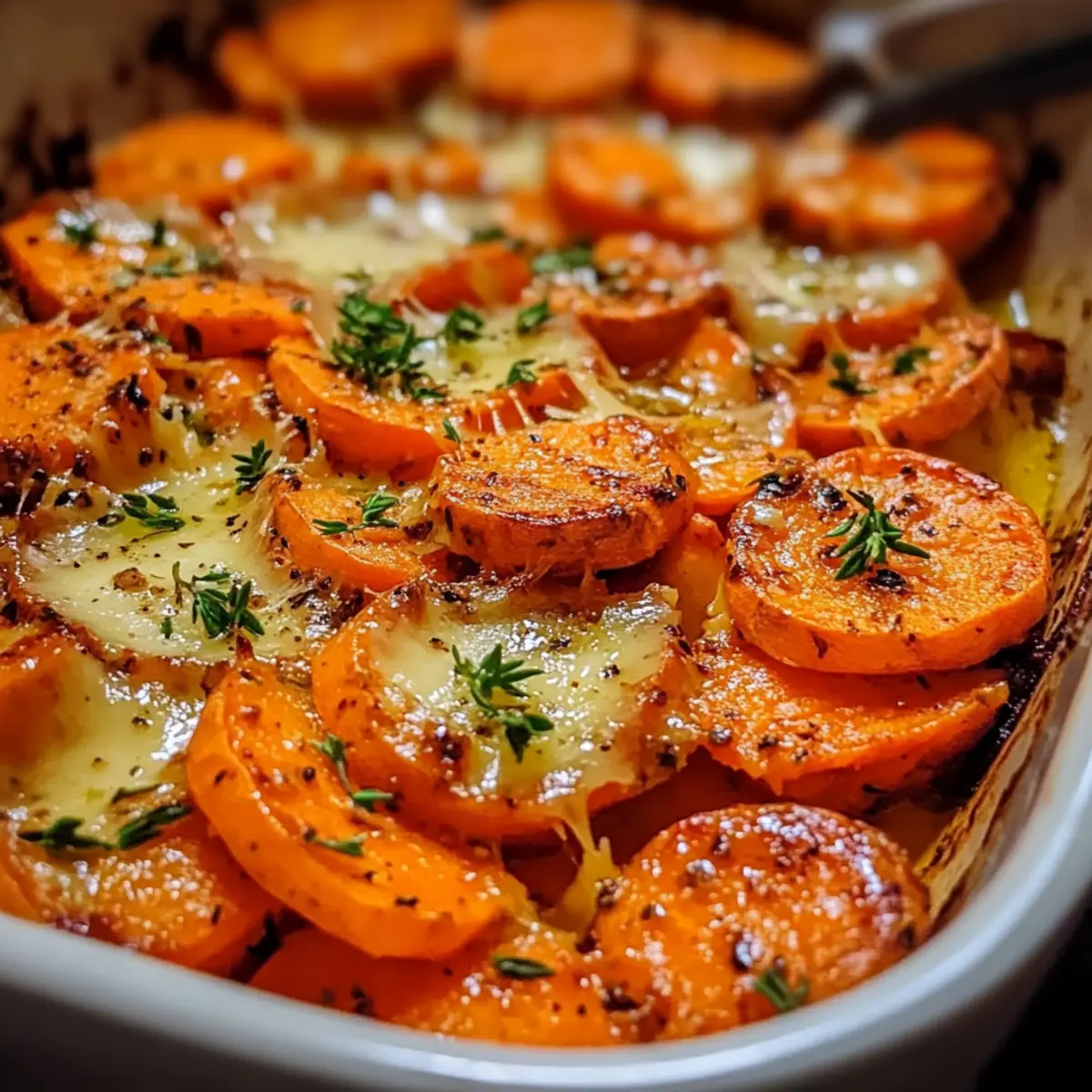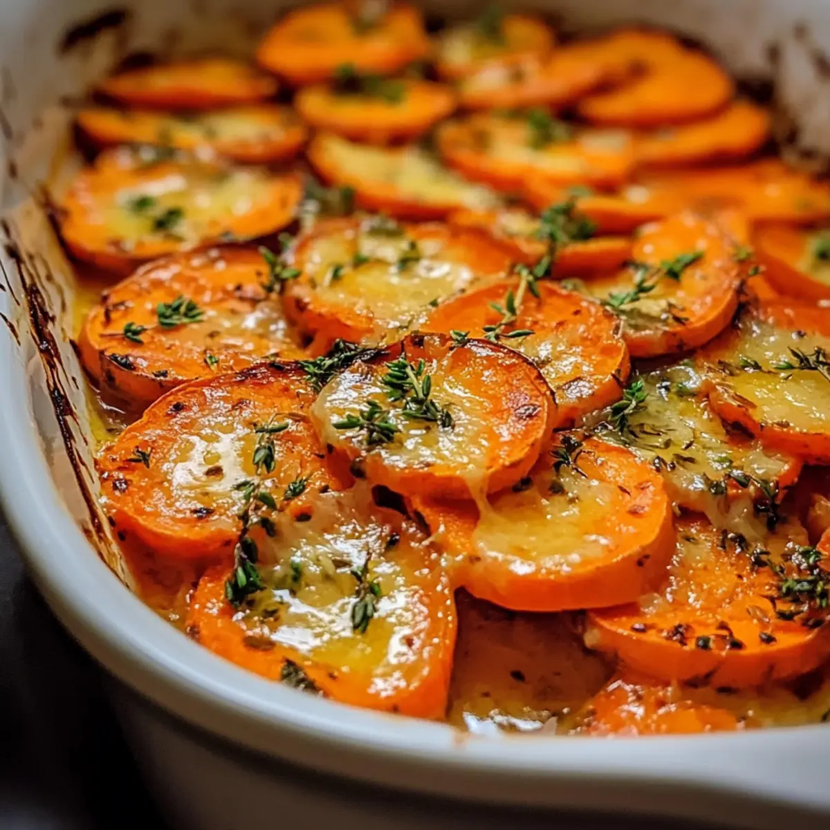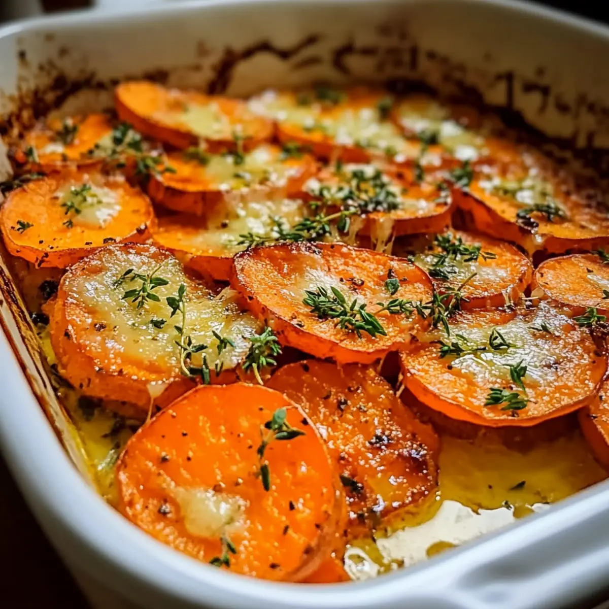 As the savory aroma of garlic wafts through the air, it’s almost impossible not to feel drawn to the kitchen. Today, I’m excited to share my go-to recipe for Garlic-Buttered Sweet Potato Bake. This comforting vegetarian delight is perfect for any occasion—whether you’re feeding a hungry family on a weeknight or impressing guests at a holiday gathering. With just a few simple ingredients, you can whip up a dish that’s not only budget-friendly but also a creamy indulgence everyone will love. Plus, this recipe can easily be modified for a lighter option by swapping out heavy cream for half-and-half, ensuring both flavor and healthiness. Are you ready to elevate your weeknight dinners with this delightful bake? Let’s dive into the details! Why is Garlic-Buttered Sweet Potato Bake a Must-Try? Comforting and Cozy: This dish embodies the warmth of home cooking, making it the ideal centerpiece for family gatherings and cozy dinners. Rich Flavor Balance: The savory garlic, creamy texture, and natural sweetness of sweet potatoes create an irresistible combination that appeals to all ages. Easy Preparation: With simple steps and minimal prep, it’s perfect for busy weeknights, allowing you to focus more on family time rather than fussing in the kitchen. Versatile Serving Options: Pair it effortlessly with roasted meats or enjoy it as a hearty side to a fresh green salad. For a lighter twist, consider checking out my Lightened Cauliflower Potato Mash for some healthy inspiration! Budget-Friendly: This recipe uses accessible, economical ingredients, making it a great choice for families looking to eat deliciously without breaking the bank. You won’t regret adding this flavorful bake to your culinary repertoire! Garlic-Buttered Sweet Potato Bake Ingredients For the Bake • Sweet Potatoes – Main ingredient; provides natural sweetness and texture; slice thinly for even cooking. • Butter – Adds richness and depth to the flavor; consider using olive oil for a lighter option. • Garlic – Provides essential flavor and aroma; fresh garlic is recommended for the best taste. • Heavy Cream – Creates a luscious, creamy texture; use half-and-half for a lighter version if desired. • Thyme – Adds freshness and enhances the dish’s savory elements; fresh thyme is preferable, but dried can be used. • Salt & Pepper – Enhances overall flavor balance; season to taste for the perfect finish. Your culinary journey with this Garlic-Buttered Sweet Potato Bake begins here! Step‑by‑Step Instructions for Garlic-Buttered Sweet Potato Bake Step 1: Prep Sweet Potatoes Begin by peeling the sweet potatoes, then slice them thinly into even rounds, about ¼ inch thick. This ensures they cook uniformly and become tender. Gather a sharp knife and a cutting board to make your prep easier. Allow about 15-20 minutes for this step to keep the process flowing smoothly. Step 2: Make Sauce In a mixing bowl, combine melted butter with minced fresh garlic, heavy cream, salt, pepper, and thyme. Whisk them together until fully combined and the mixture is smooth. This garlic-infused sauce will coat the sweet potatoes beautifully. Set the bowl aside once done, as you’ll pour this over the layered sweet potatoes later. Step 3: Layer Sweet Potatoes Grease a baking dish with a bit of butter, then start layering the thin sweet potato slices. Pour the garlic-butter sauce generously over each layer, ensuring even coverage to infuse the flavors. Aim for three or four layers for maximum flavor and a delightful texture in your Garlic-Buttered Sweet Potato Bake. Step 4: Bake Covered Cover the assembled dish tightly with aluminum foil and place it in an oven preheated to 350°F. Bake for approximately 50 minutes until the sweet potatoes are tender when pierced with a fork. The foil helps to steam the potatoes, making them soft and flavorful. Step 5: Finish Baking After 50 minutes, carefully remove the foil from the dish and return it to the oven. Bake uncovered for an additional 10 minutes or until the top is golden and bubbly. This final baking step enhances the dish’s appearance and adds a deliciously crusty finish to your Garlic-Buttered Sweet Potato Bake. What to Serve with Garlic-Buttered Sweet Potato Bake As you indulge in this creamy delight, consider pairing it with options that elevate your meal even further. Roasted Chicken: The savory notes of roasted chicken harmonize beautifully with the sweet and buttery flavors of the bake, creating a comforting combination. Green Salad: A fresh, crisp salad with mixed greens, avocado, and a light vinaigrette offers a refreshing contrast to the richness of the bake. Grilled Steak: The hearty, grilled meat cuts through the creamy layers, adding a robust flavor that balances the sweetness of the sweet potatoes. Balsamic Glazed Brussels Sprouts: The slightly tangy and earthy sprouts complement the bake’s sweetness while adding a delightful texture to the plate. Creamy Mac and Cheese: For those seeking indulgence, creamy mac and cheese offers a nostalgia-filled side that pairs wonderfully with the buttery sweet potatoes. Herbed Quinoa: Nutty quinoa tossed with fresh herbs not only adds a healthy component but also absorbs the flavorful juices from the bake, creating a satisfying bite. White Wine Spritzer: A chilled white wine spritzer refreshes the palate, making it the perfect drink to enjoy alongside the comforting Bake. Chocolate Mousse: End your meal on a sweet note with a rich chocolate mousse, creating a decadent finish that leaves everyone wanting more. Garlic-Buttered Sweet Potato Bake Variations There are so many delicious ways to personalize the Garlic-Buttered Sweet Potato Bake to suit your taste buds and needs. Half-and-Half: Swap heavy cream for half-and-half to give the dish a lighter touch without sacrificing creaminess. Herb Swap: Replace thyme with rosemary or oregano for a fresh twist that will invigorate the flavors. Balsamic Drizzle: Add elegance b