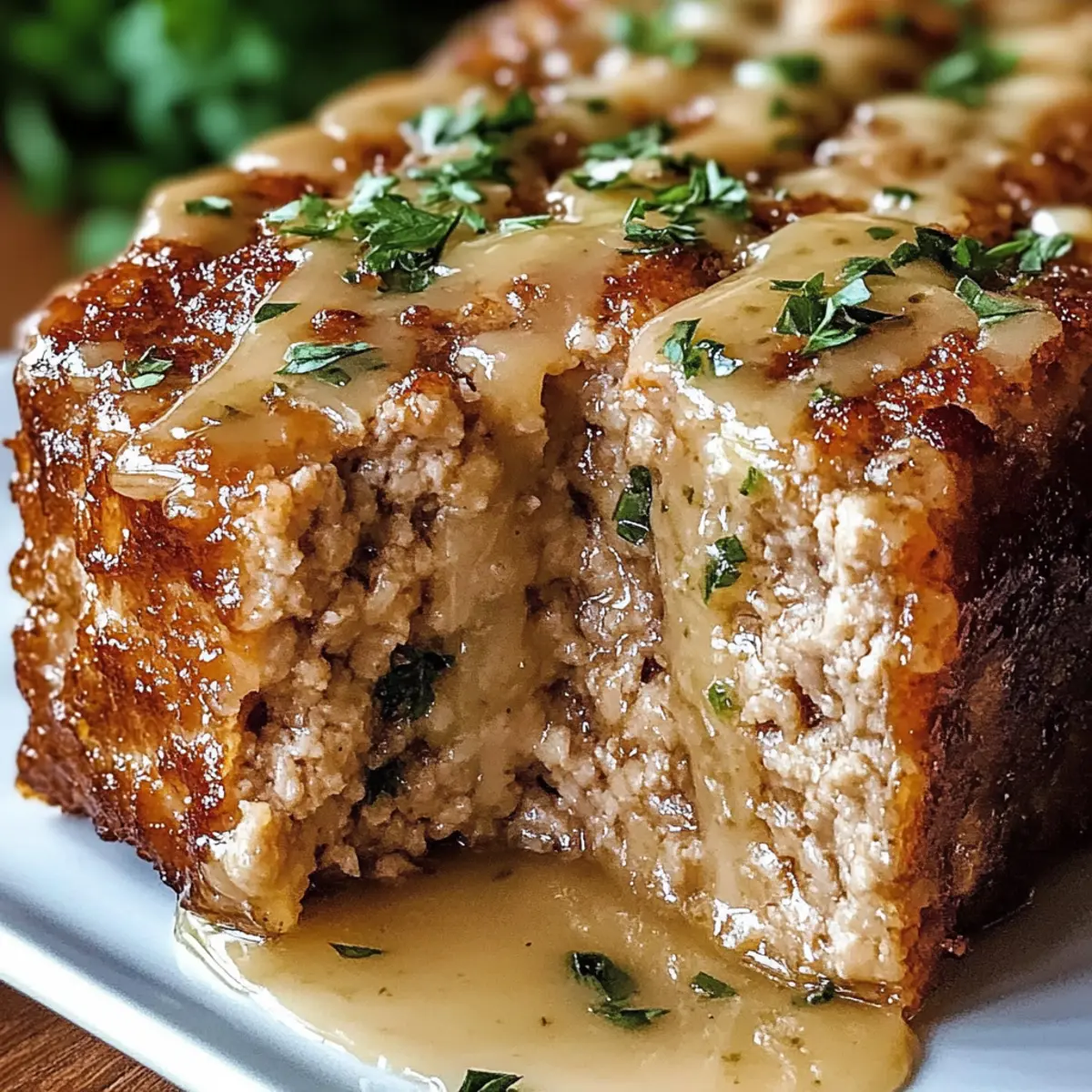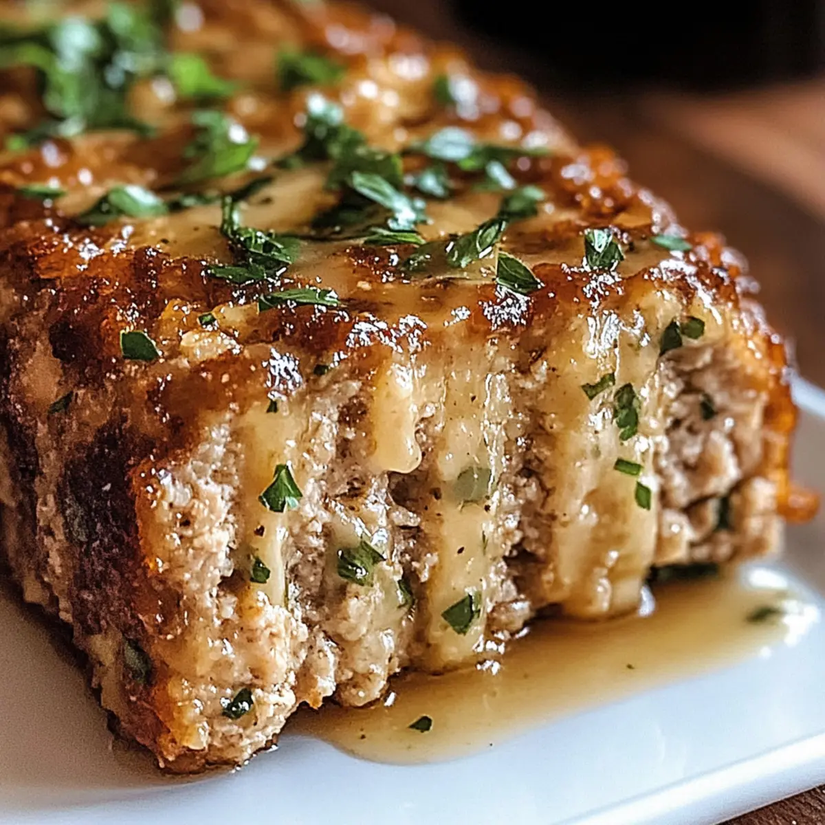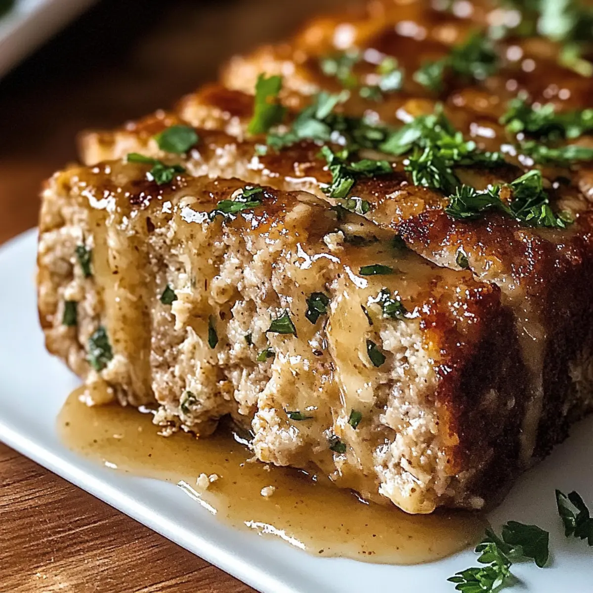 Amidst the hustle and bustle of daily life, one taste can transport us to a cozy kitchen filled with love and warmth. My Juicy Garlic Parmesan Chicken Meatloaf is just that—a comforting dish that effortlessly combines flavor with ease. As a go-to meal prep option, it’s perfect for busy weeknights or those family gatherings that call for something truly special. With its tender texture and the inviting aroma of garlic and Parmesan wafting through your home, you might just find it becoming a new favorite. Plus, it’s highly customizable; swap in ground turkey or lean pork if you prefer! Ready to indulge in this heartwarming classic? Let’s dive into the recipe. Why Choose Garlic Parmesan Chicken Meatloaf? Comforting and Delicious: This meatloaf is a hug in food form, bringing warmth and nostalgia to your dinner table. Crowd-Pleasing: Full of robust flavors, it’s perfect for family gatherings or inviting friends over for dinner. Versatile Ingredients: Swap ground chicken for ground turkey or lean pork for a twist. You can even indulge in a dairy-free version by using plant-based milk! Effortless Meal Prep: Spend less time in the kitchen and more time with loved ones; this dish freezes beautifully and reheats well—ideal for busy weeknights. Irresistible Aroma: The smell of garlic and Parmesan wafting through your home is enough to make anyone’s mouth water! Try pairing it with some delicious sides like a fresh salad or mashed potatoes for the complete comfort food experience. With just a few simple ingredients and steps, you’ll be on your way to creating this delightful dish that appeals to all palates! Garlic Parmesan Chicken Meatloaf Ingredients For the Meatloaf Ground Chicken – This is the main protein source, ensuring a juicy meatloaf; feel free to swap it with ground turkey or lean pork if desired. Parmesan Cheese – Adds a sharp, rich flavor while helping bind the loaf; consider Romano cheese as a tasty alternative. Panko Breadcrumbs – These provide light structure and texture; regular breadcrumbs work too if you don’t have panko on hand. Eggs – Essential for binding the mixture together, creating a cohesive loaf. Minced Garlic – Infuses a delicious garlic flavor throughout; adjust the amount to suit your preference. Garlic Powder – Enhances the overall garlic flavor, giving you even more depth. Onion Powder, Dried Basil, Dried Parsley – These herbs contribute lovely flavor notes that complement the meatloaf beautifully. Salt and Black Pepper – Key seasonings for adjusting flavor; don’t forget to taste! Whole Milk – Adds necessary moisture; use a plant-based milk for a dairy-free option. For the Glaze Unsalted Butter – Used to make a luscious glaze, creating a rich finish on your meatloaf. Embrace the inviting flavors of this Garlic Parmesan Chicken Meatloaf as it graces your dinner table, bringing joy to your family and friends! Step‑by‑Step Instructions for Garlic Parmesan Chicken Meatloaf Step 1: Preheat the Oven Begin by preheating your oven to 190°C (375°F). While the oven warms up, prepare a baking sheet lined with parchment paper or lightly grease a loaf pan. This ensures an easy release after baking. You’ll want your oven to be hot and ready to create that lovely golden crust on your Garlic Parmesan Chicken Meatloaf. Step 2: Mix the Ingredients In a large mixing bowl, combine ground chicken, Parmesan cheese, panko breadcrumbs, eggs, minced garlic, garlic powder, onion powder, dried basil, dried parsley, salt, black pepper, and whole milk. Use your hands or a sturdy spoon to gently mix until just combined, taking care not to overwork the mixture. This step is crucial for ensuring a tender meatloaf. Step 3: Shape the Loaf Transfer the mixture to your prepared baking sheet or loaf pan, shaping it into a loaf form. If using a baking sheet, gently pat it into a uniform mound about 2 inches high. This will ensure even cooking and help maintain moisture while baking. You’re aiming for that perfect Garlic Parmesan Chicken Meatloaf shape, ready for the oven! Step 4: Bake the Meatloaf Place your shaped meatloaf into the preheated oven and bake for 40 to 45 minutes. Keep an eye on it, and use a meat thermometer to check that the internal temperature has reached 74°C (165°F). The outside should turn a beautiful golden brown while the inside remains juicy and succulent. Step 5: Prepare the Glaze While the meatloaf is baking, melt unsalted butter in a small saucepan over medium heat. Add minced garlic, sautéing it until fragrant and just starting to brown, about 2-3 minutes. Stir in additional Parmesan cheese and chopped parsley, cooking until the mixture thickens slightly. This delicious glaze will add a rich finish to your Garlic Parmesan Chicken Meatloaf. Step 6: Glaze and Finish After the initial baking time, remove the meatloaf from the oven and generously brush the prepared glaze over the top. Return it to the oven and bake for another 5 to 7 minutes, allowing the glaze to bubble and turn golden. Watch closely during this final stage to achieve that irresistible glossy finish. Step 7: Rest and Serve Once done, take your meatloaf out of the oven and let it rest for about 5 minutes. This allows the juices to redistribute, ensuring every slice is moist. Slice carefully and garnish with additional parsley if desired. Now, it’s ready to serve your warm and inviting Garlic Parmesan Chicken Meatloaf to family and friends! Make Ahead Options These Garlic Parmesan Chicken Meatloaf options are perfect for meal prep enthusiasts looking to save time! You can prepare the meat mixture up to 24 hours in advance by assembling all the ingredients, shaping it into a loaf, and then wrapping it tightly in plastic wrap to refrigerate. Alternatively, consider baking the meatloaf ahead of time, allowing it to cool completely, and then storing it in an airtight container in the fridge for up to 3 days. When ready to serve, simply reheat the meatloaf in the o