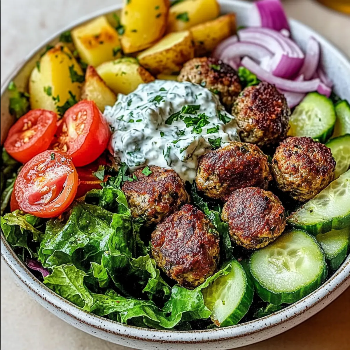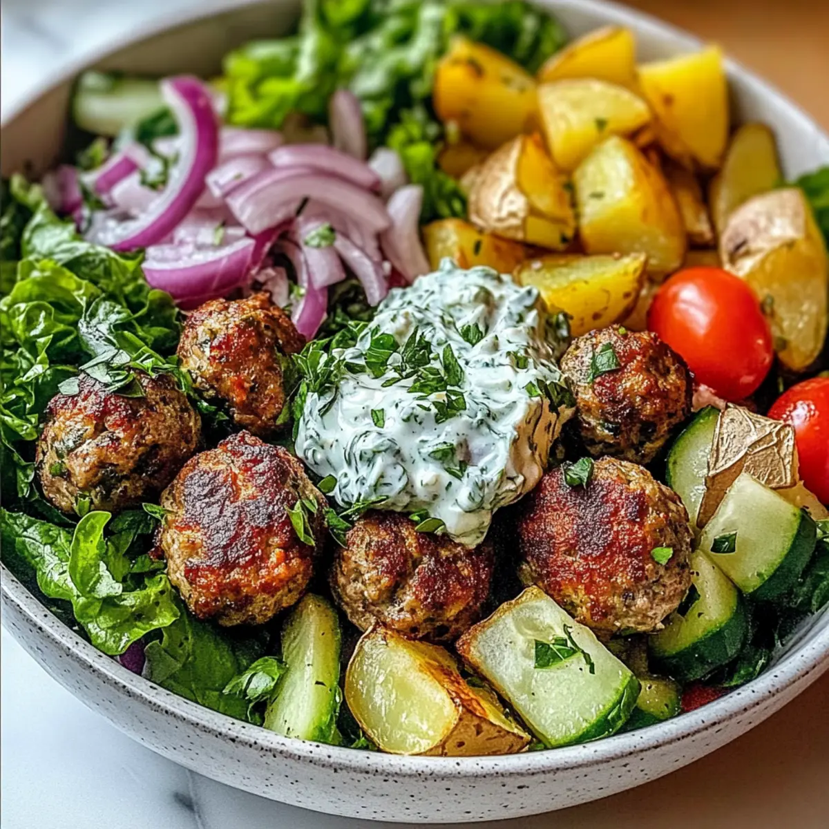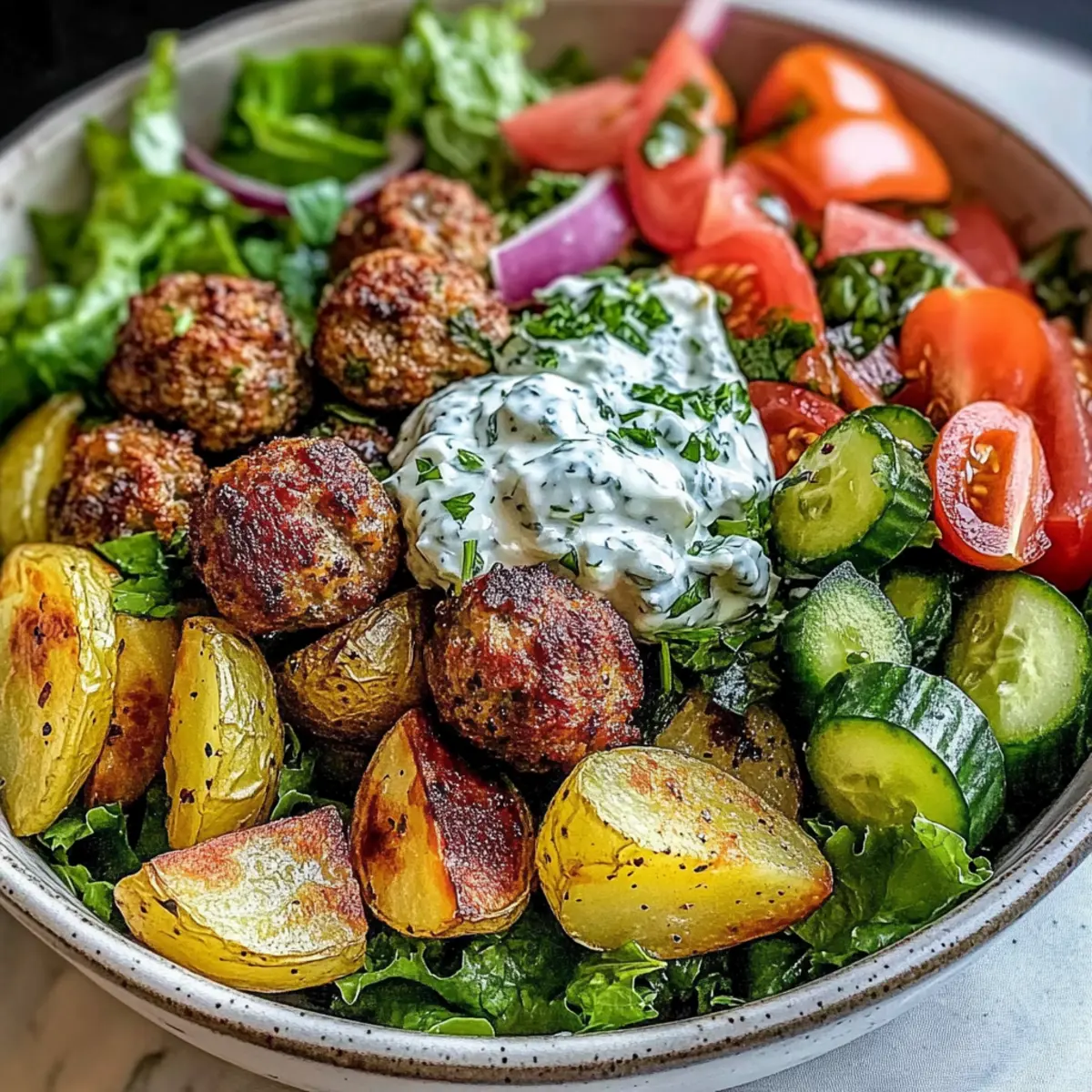 Begin assembling your Greek Meatball Bowl by placing a generous layer of crisp lettuce on the bottom of each bowl. Add in the Greek salad mix of tomatoes, cucumbers, and onions, followed by the roasted potatoes and meatballs. Finish off with a generous dollop of chilled tzatziki sauce and garnish with extra fresh herbs for a delightfully vibrant presentation.